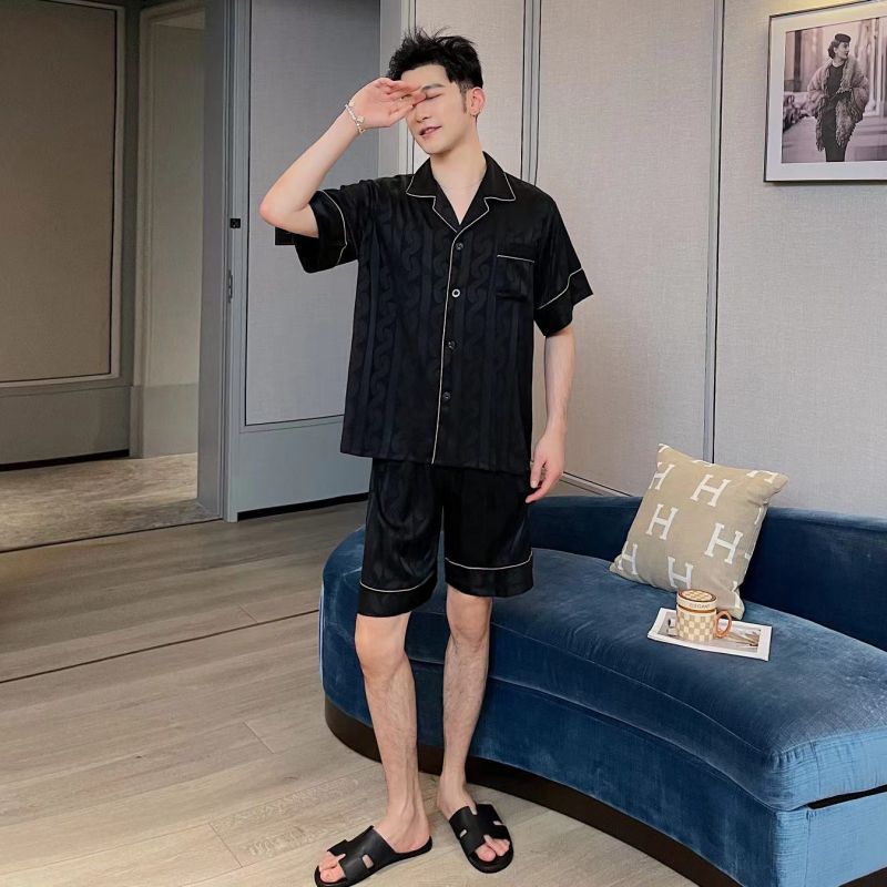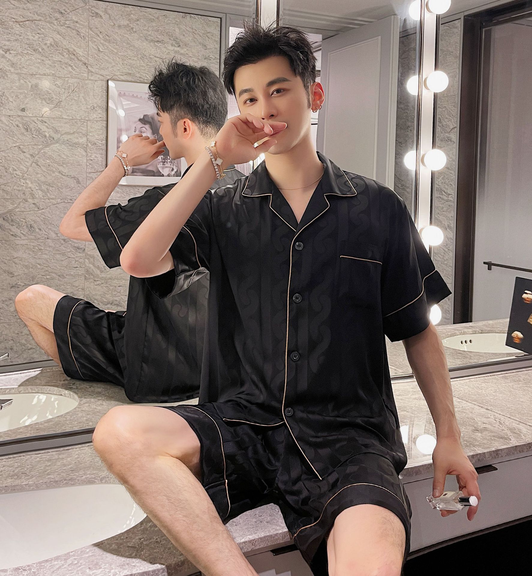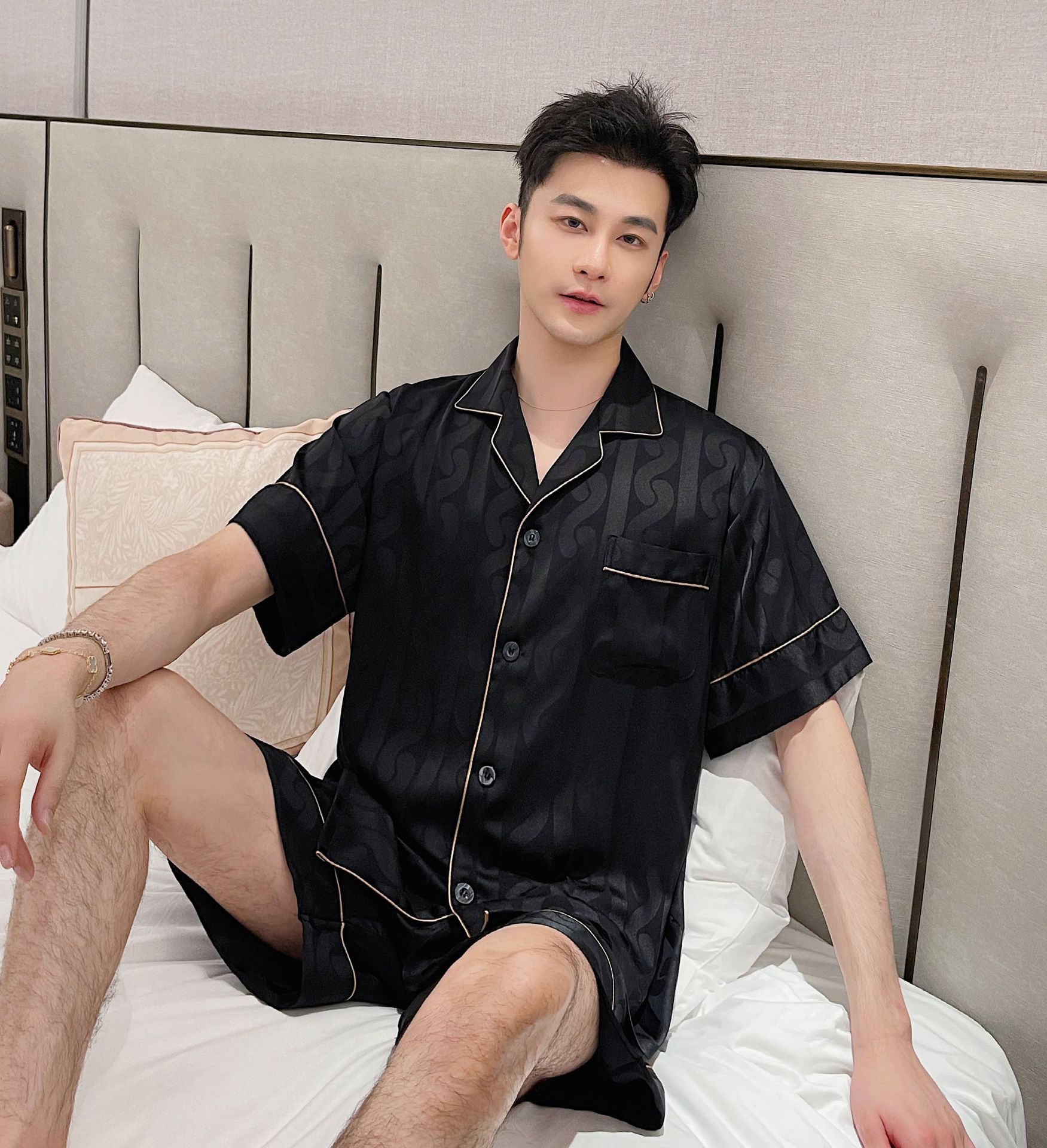 남자 잠옷 아이스 실크 2024 새 홈 착용 고급 인공 실크 여름 얇은 짧은 소매 커플 세트