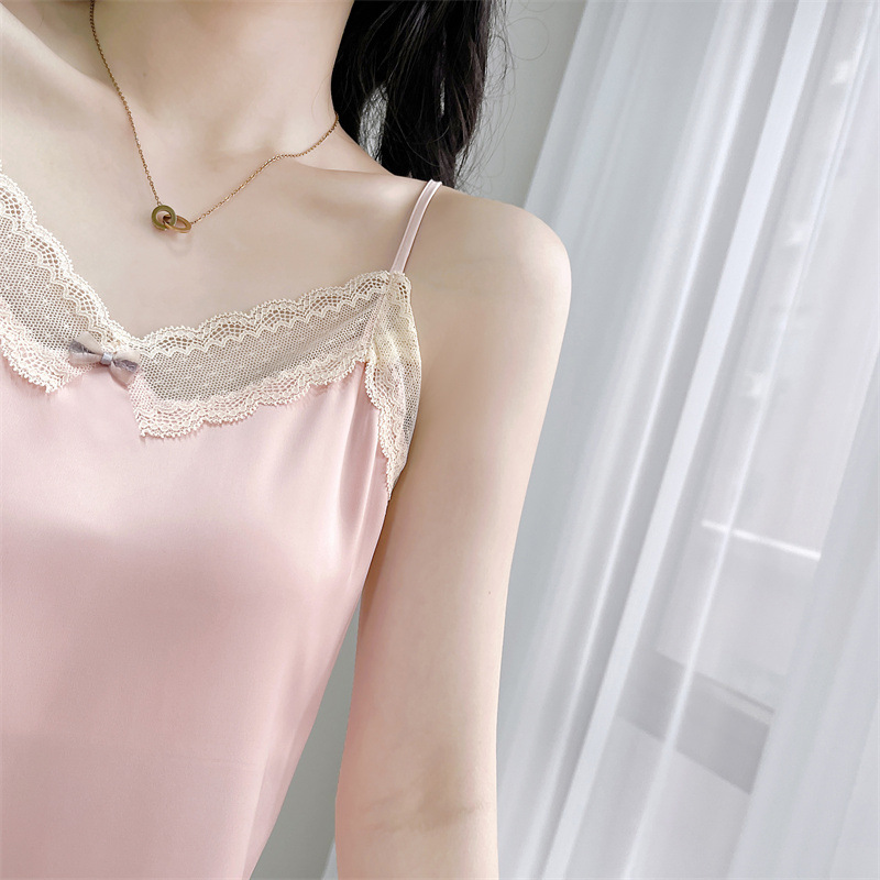 2024 새로운 아이스 실크 잠옷 여성의 섹시한 여름 얇은 레이스 가슴 패드 순수한 욕망 윈드 스트랩 반바지 홈웨어