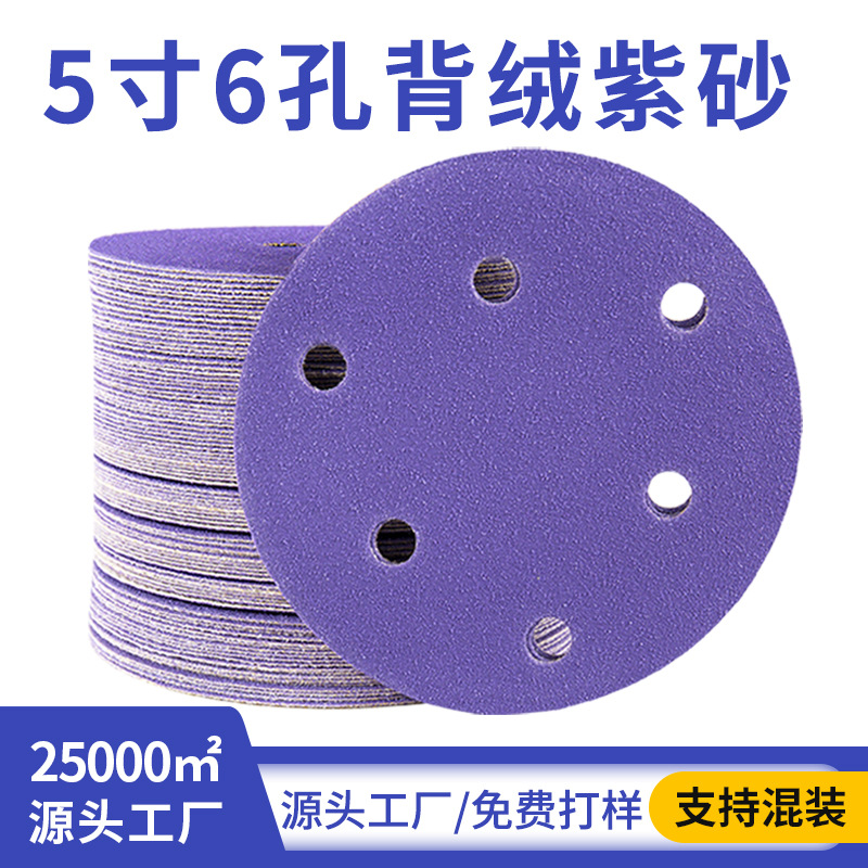 제조 업체 도매 5 인치 6 홀 건식 샌딩 종이 세라믹 보라색 샌딩 시트 자체 접착 플로킹 디스크 자동차 페인트 연마
