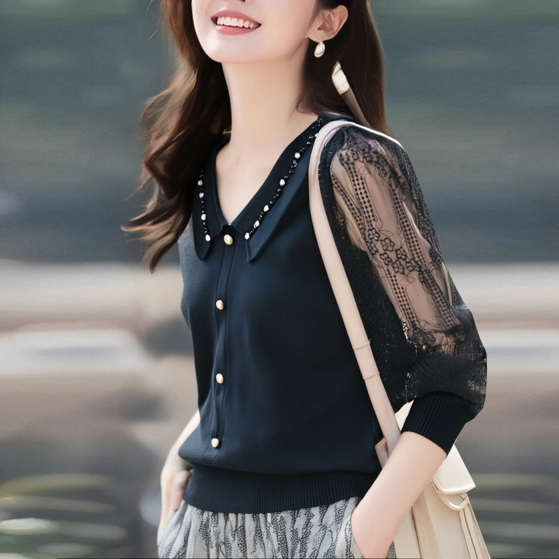 实拍!实拍!有大图!2025秋冬新V领针织上衣蕾丝纱袖娃娃领