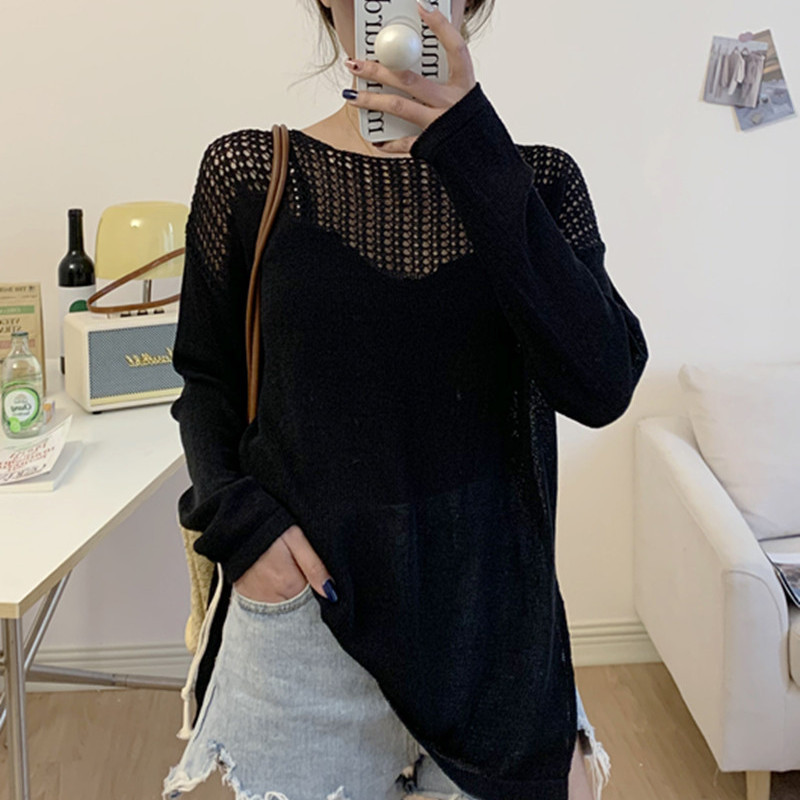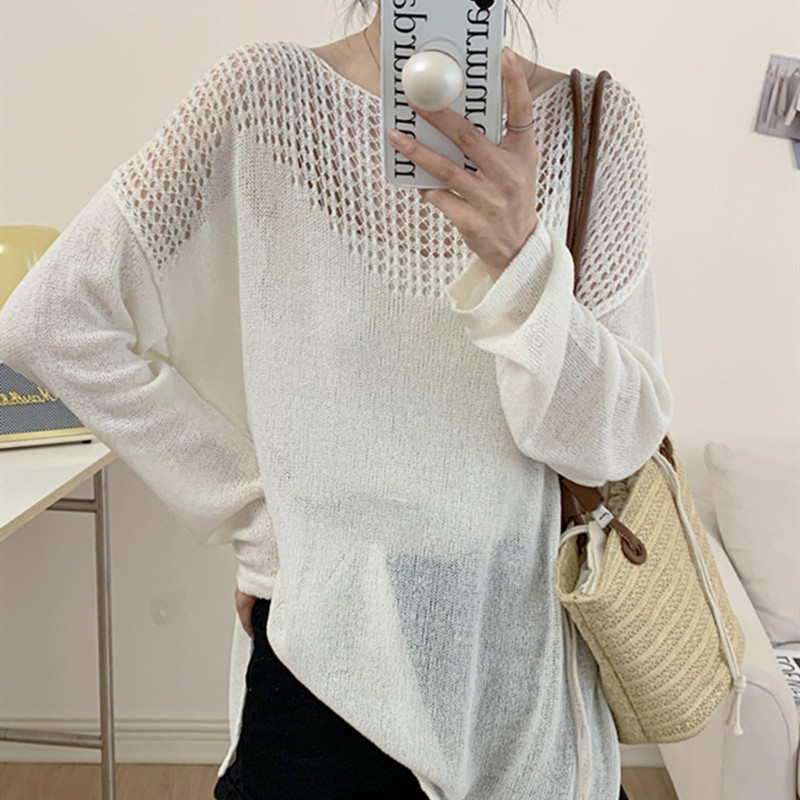 2025 한국 스타일 얇은 아이스 실크 니트 레이지 아티스틱 루즈핏 에어컨 커버업 루즈핏 퓨어 컬러 긴팔 상의 여성용스토어 가기