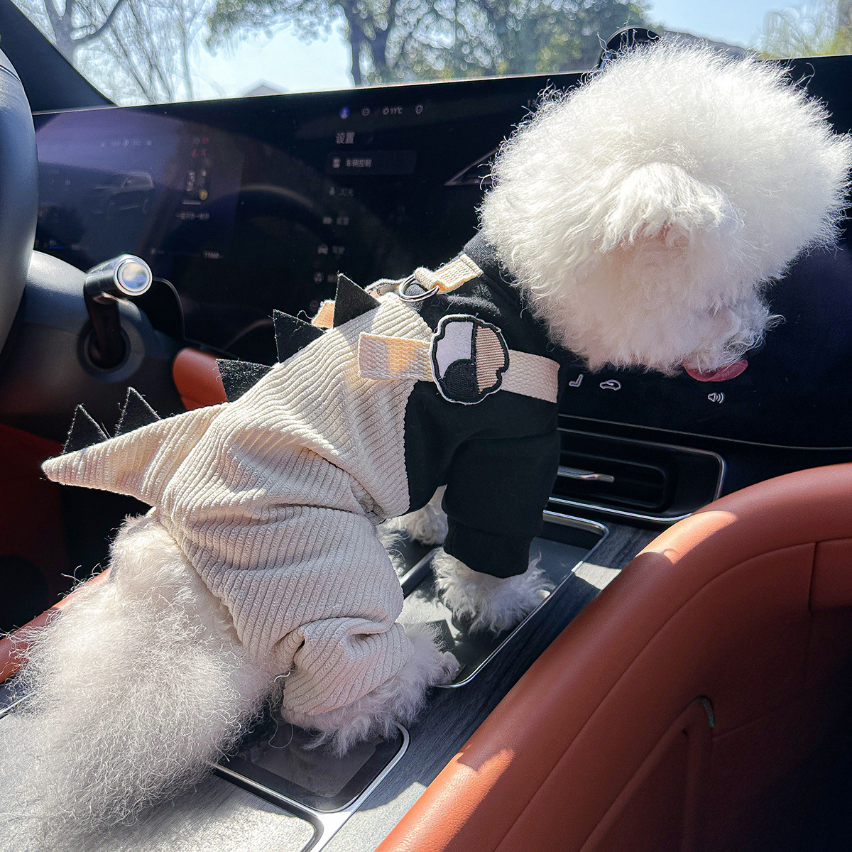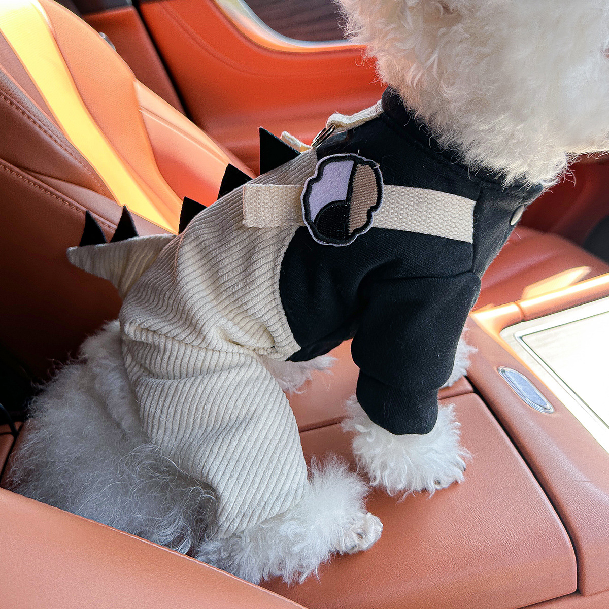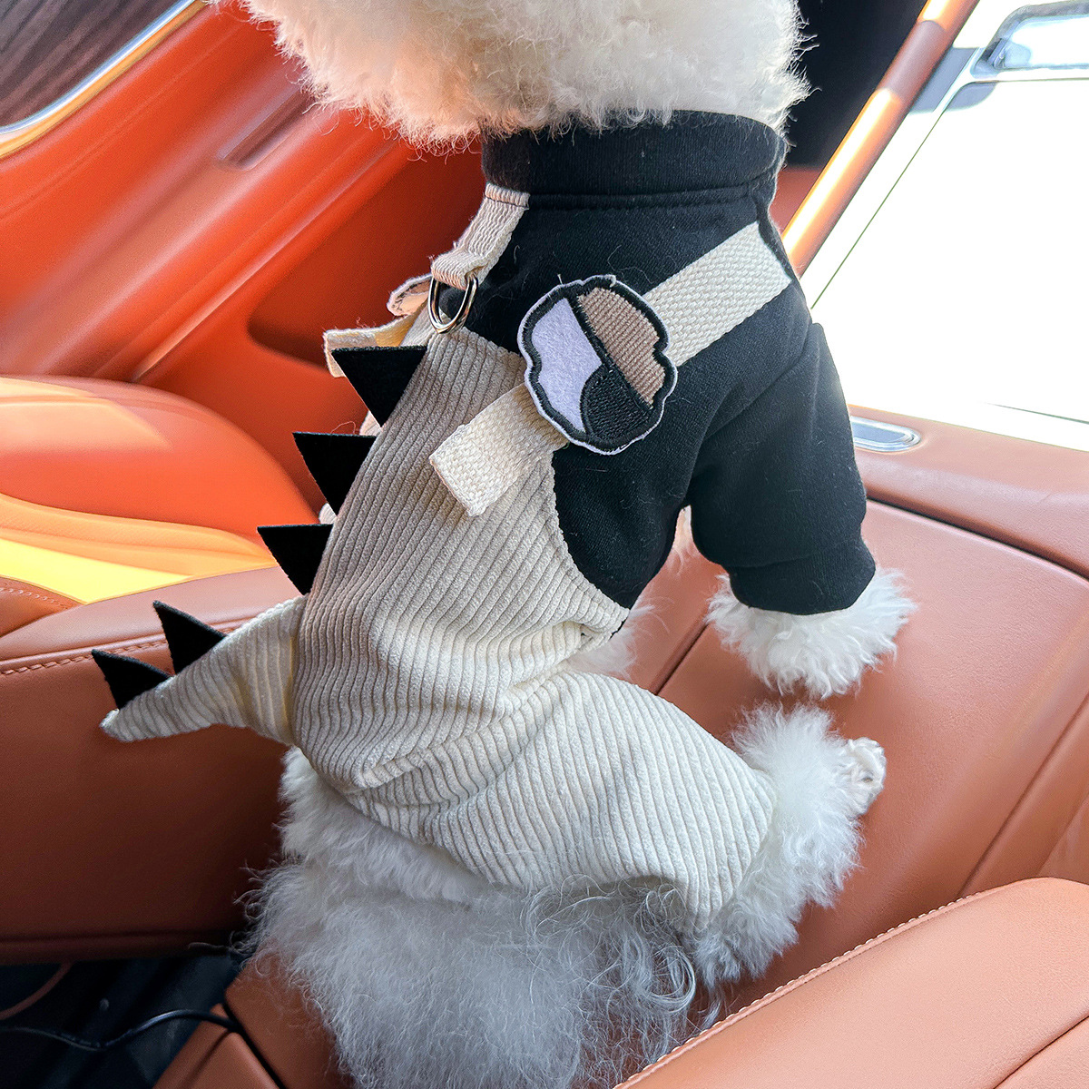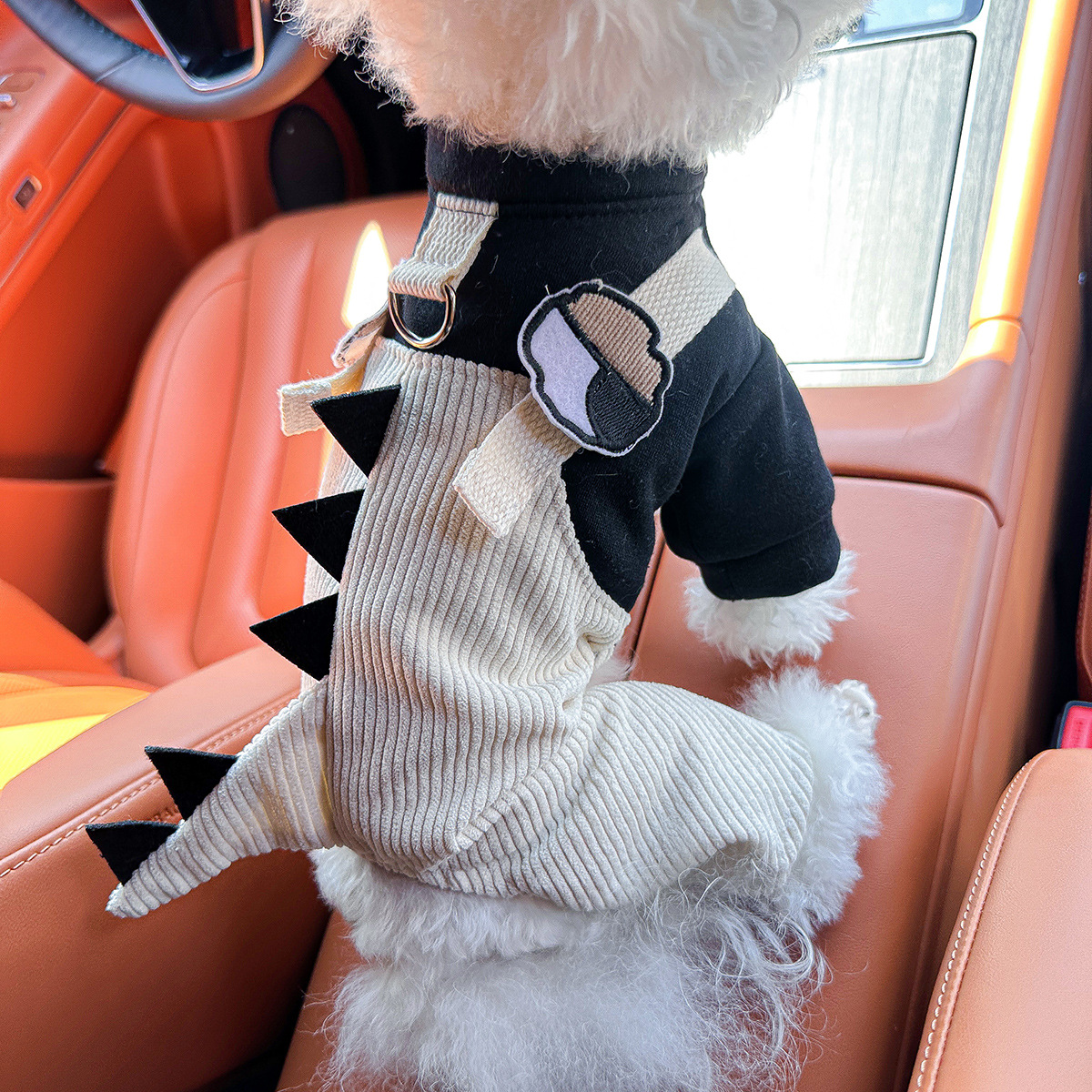 즉시 출고 가능한 애완동물 의류, 강아지 옷, 귀여운 공장제작 봄 가을 신상 공룡 네발옷, 멜빵바지 컬렉션