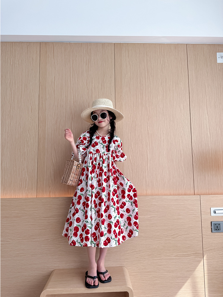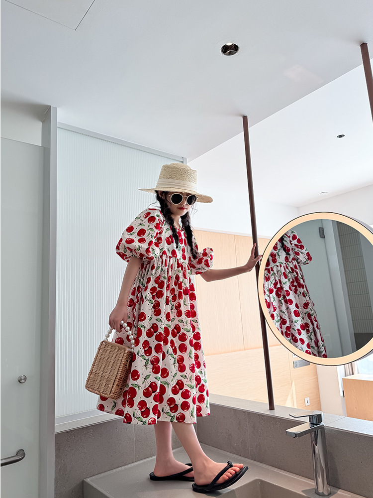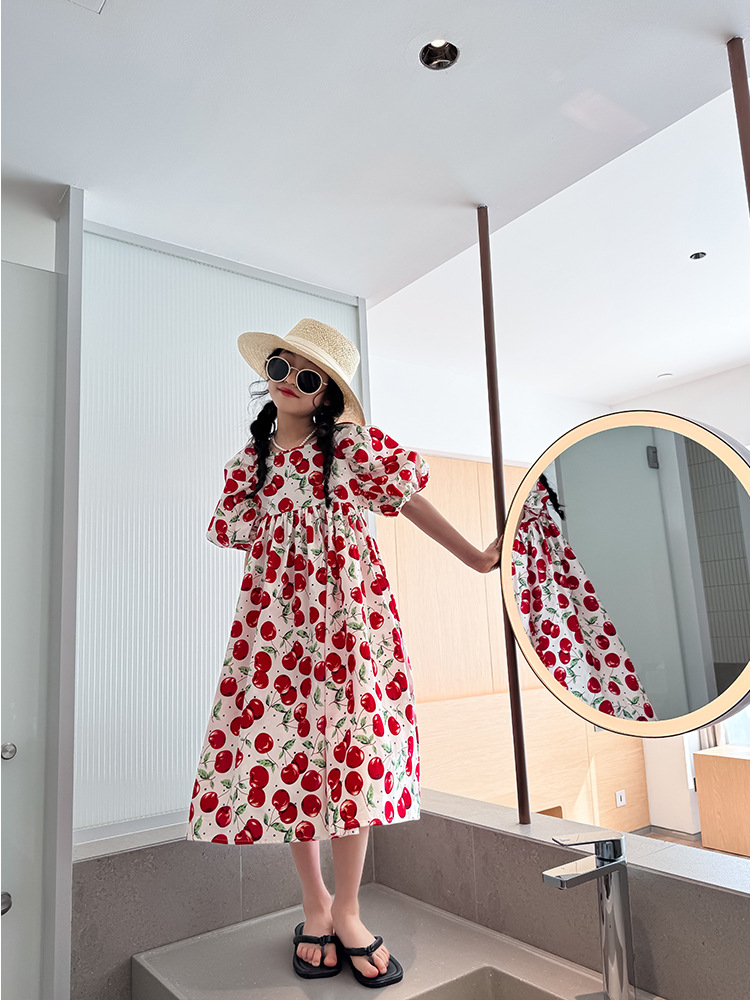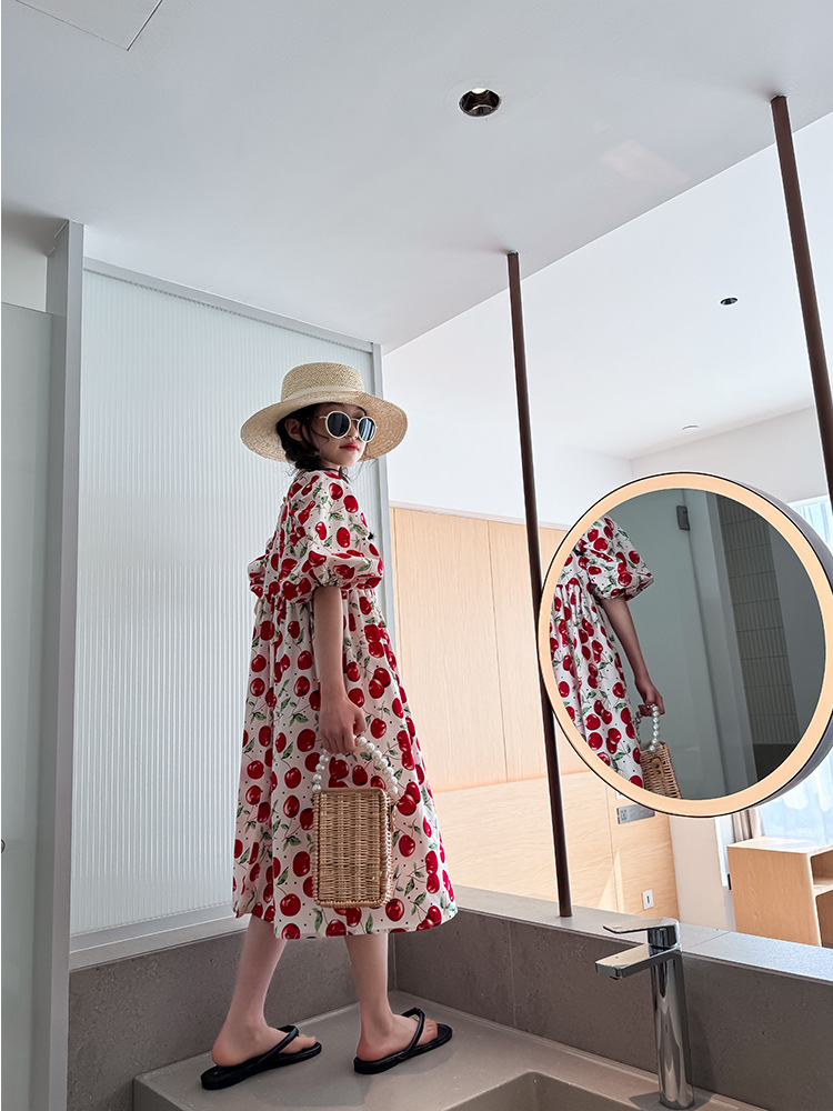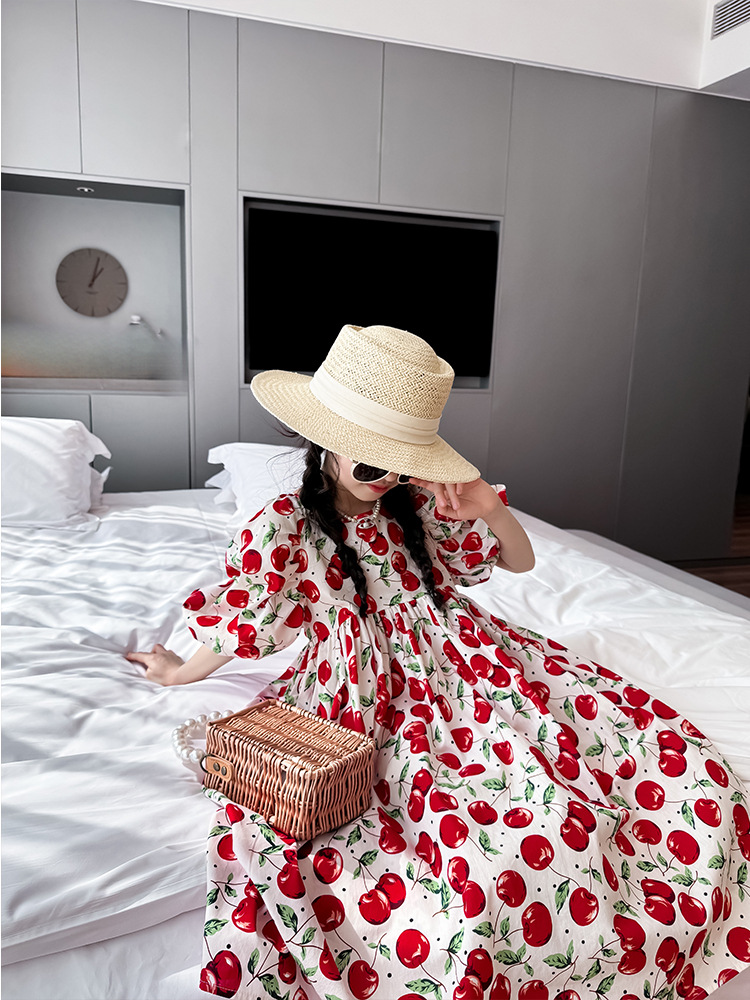 QZ8104 여름 새로운 한국식 여자 치마 부모-자식 원피스 여자 원피스 랜턴 소매 체리 A-라인 원피스