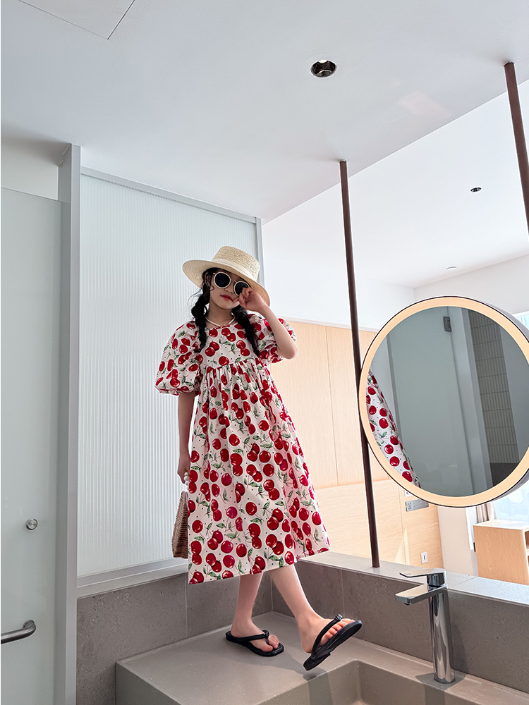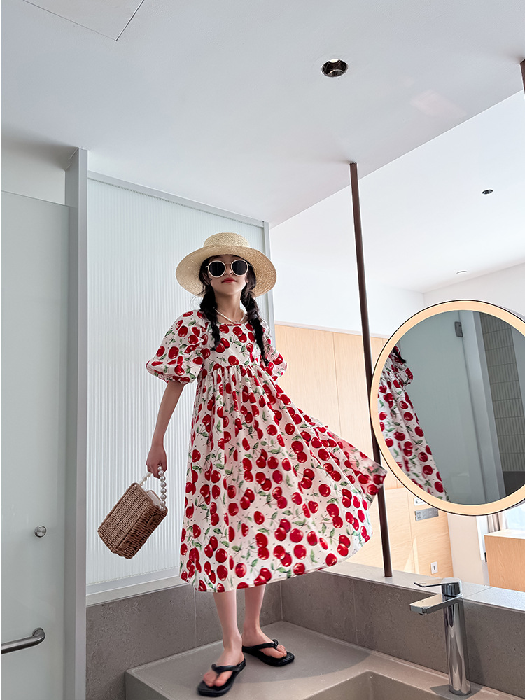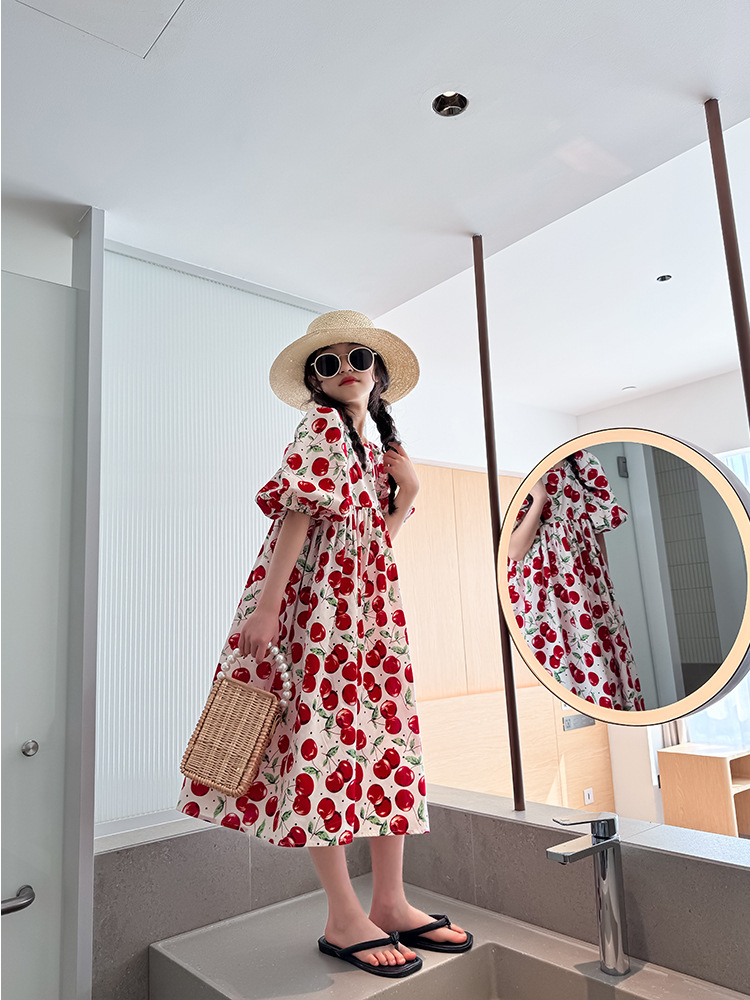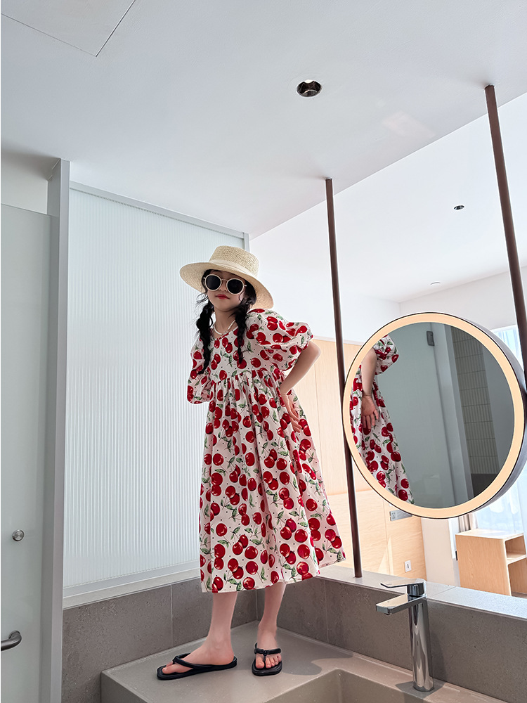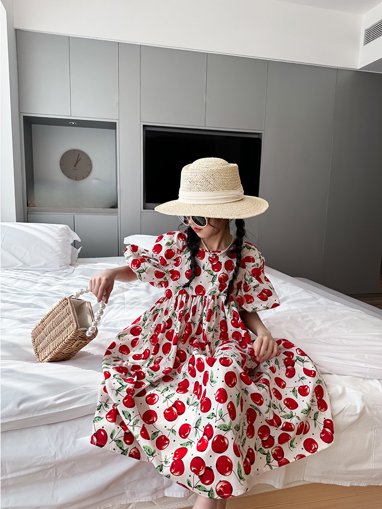 QZ8104 여름 새로운 한국식 여자 치마 부모-자식 원피스 여자 원피스 랜턴 소매 체리 A-라인 원피스스토어 가기