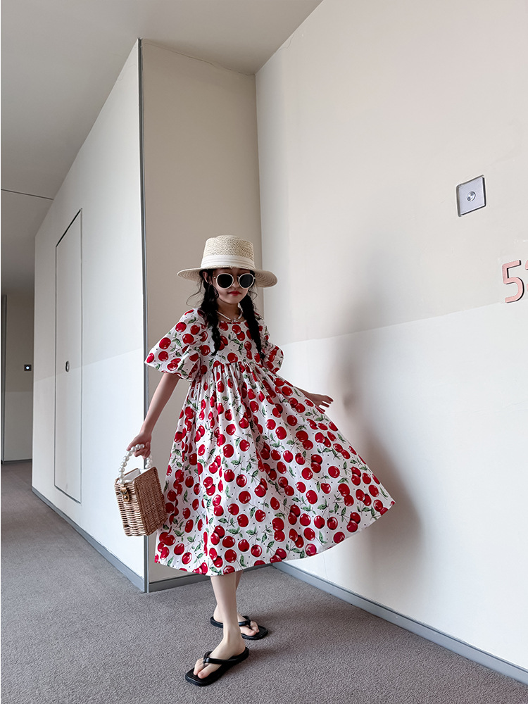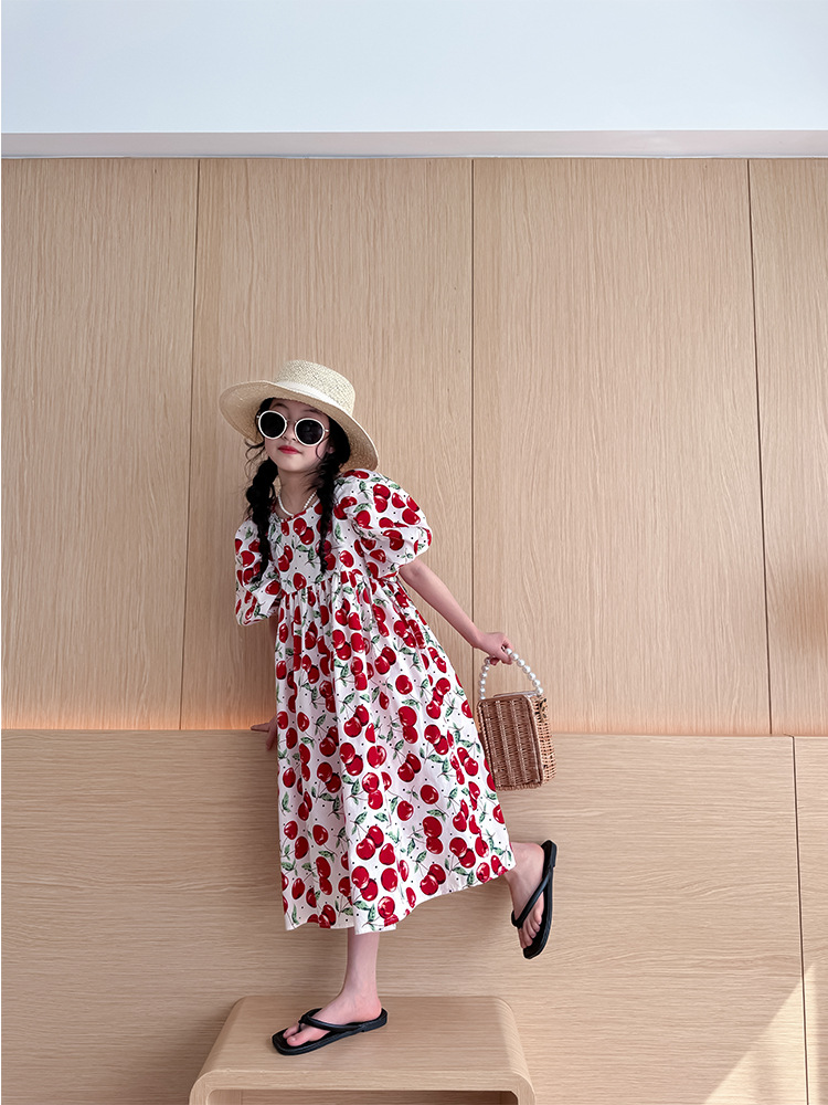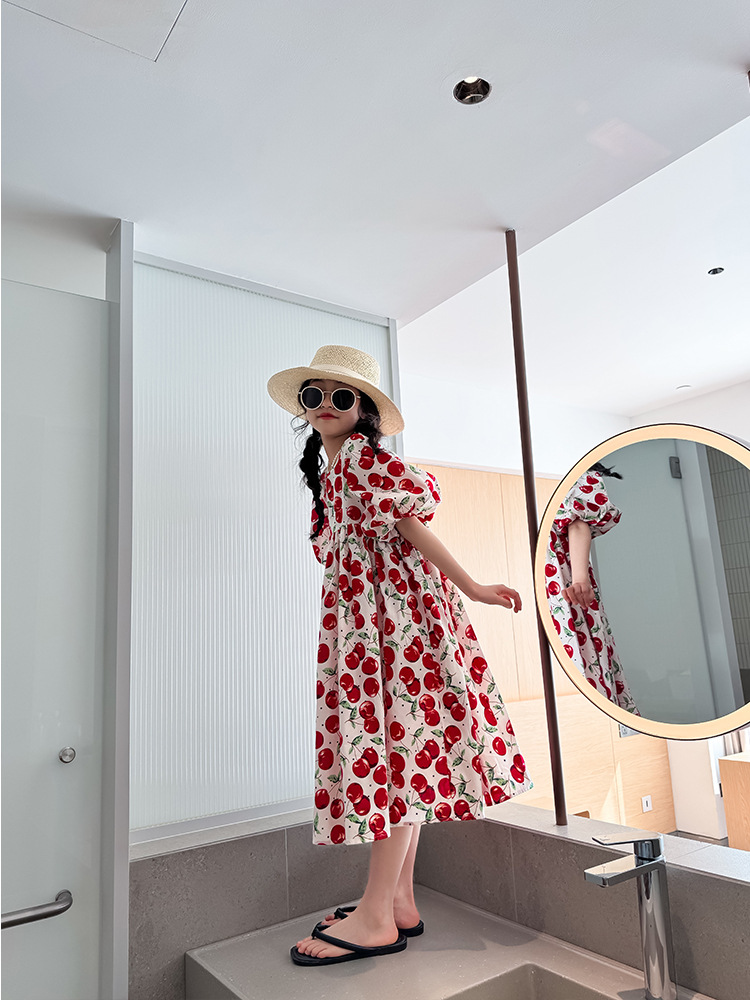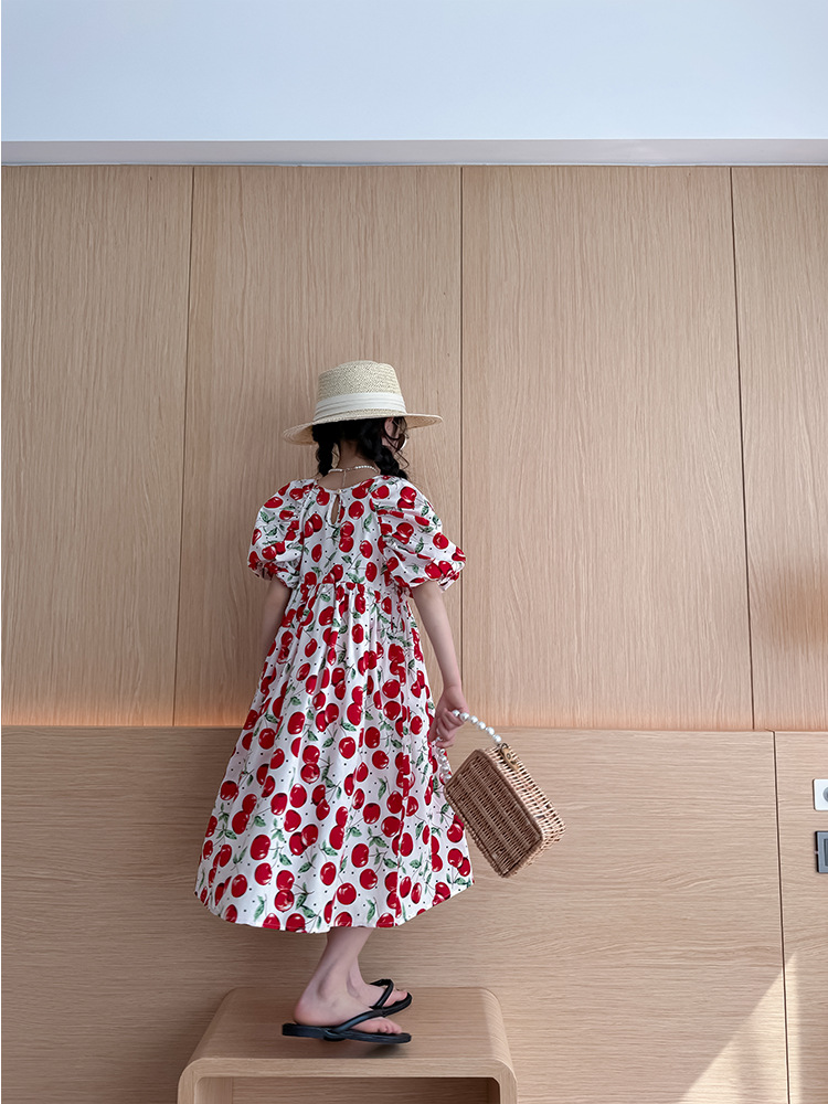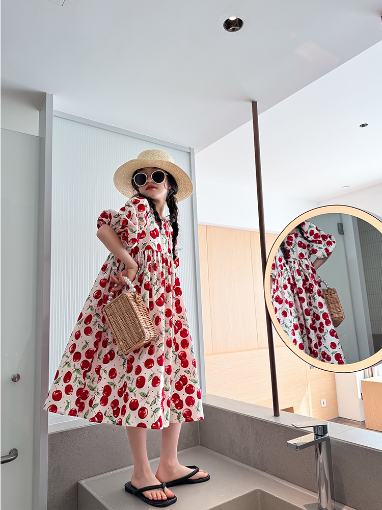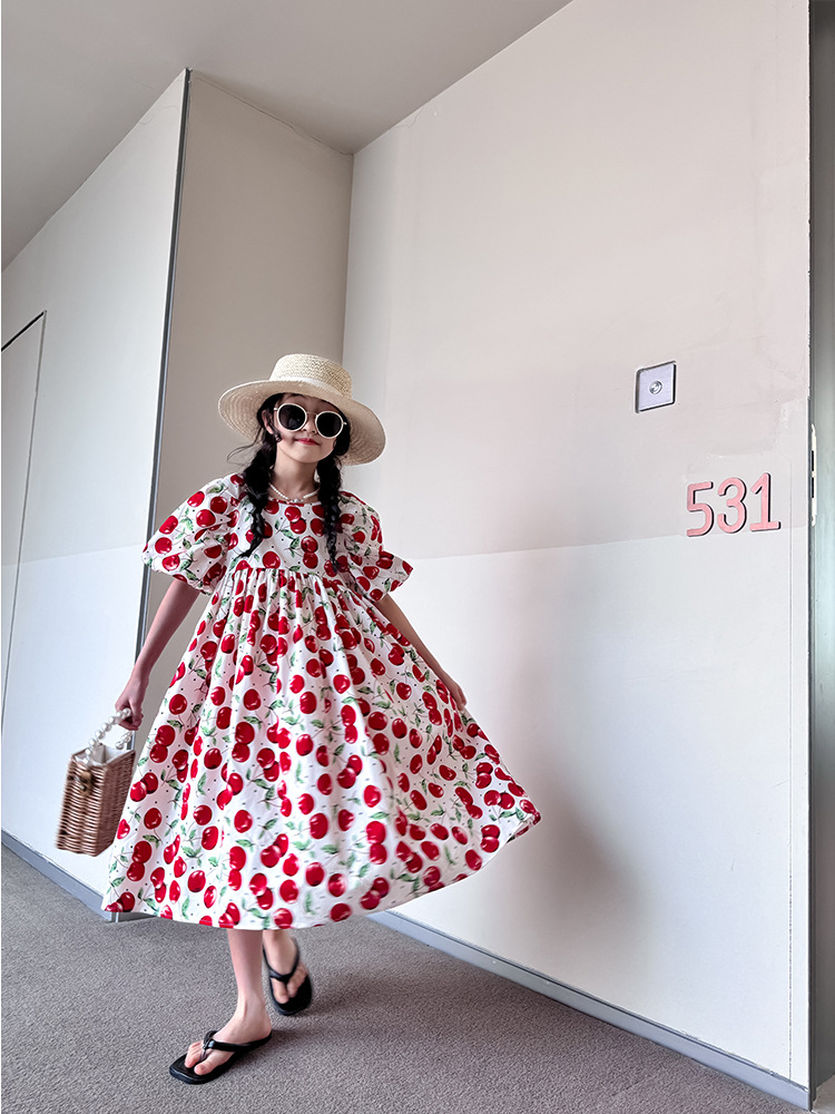 QZ8104 여름 새로운 한국식 여자 치마 부모-자식 원피스 여자 원피스 랜턴 소매 체리 A-라인 원피스스토어 가기