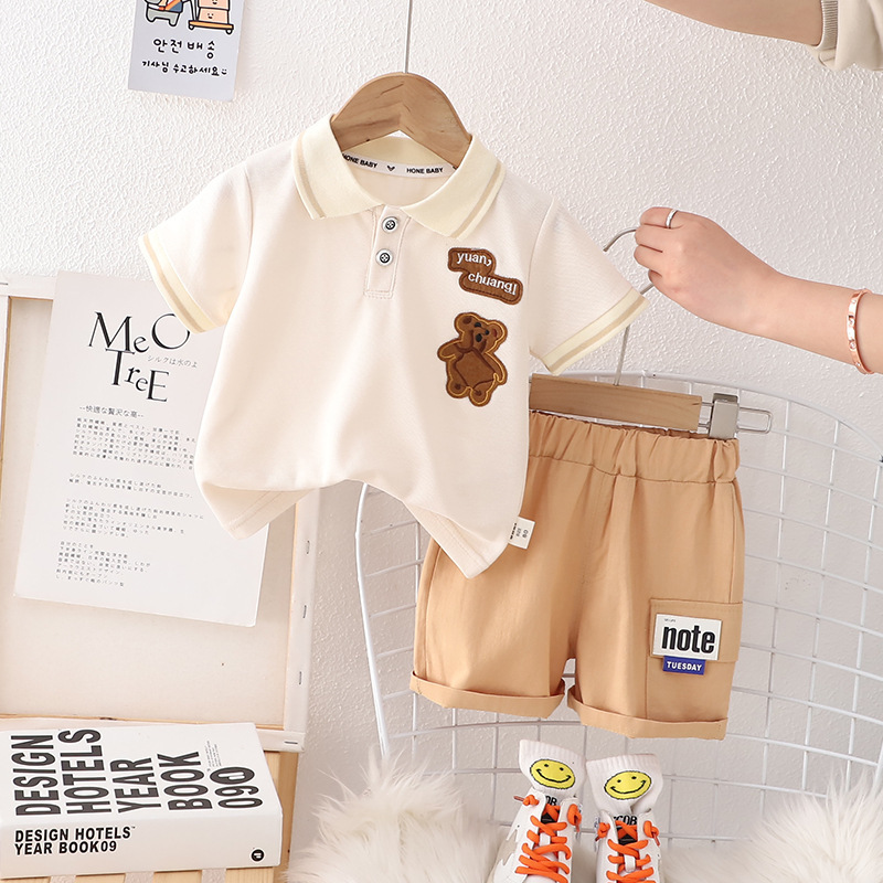 2024 소년 옷깃 만화 곰 폴로 셔츠 투피스 세트 유아 멋진 잘 생긴 새 옷 공장 도매스토어 가기
