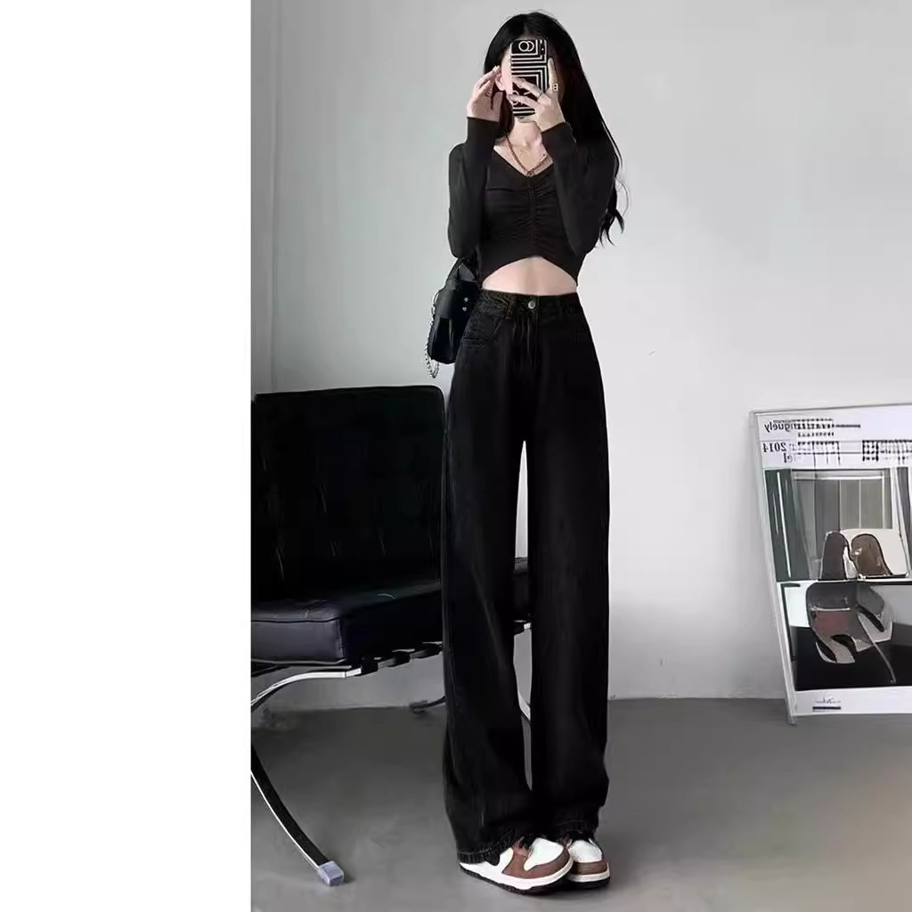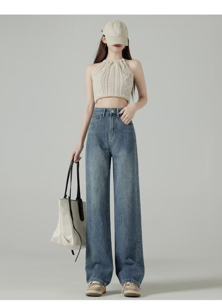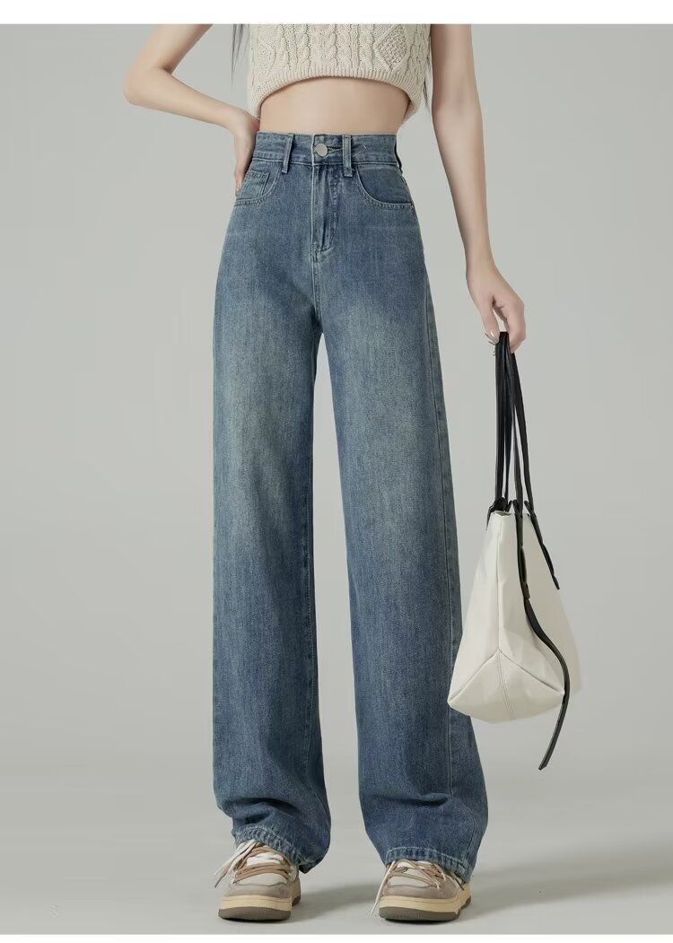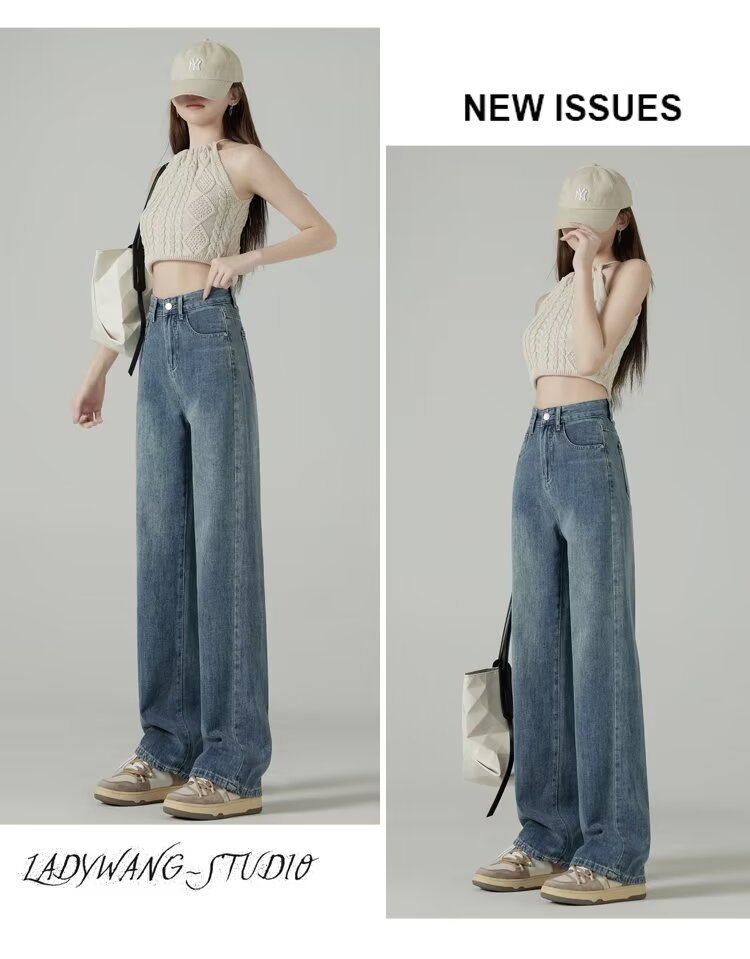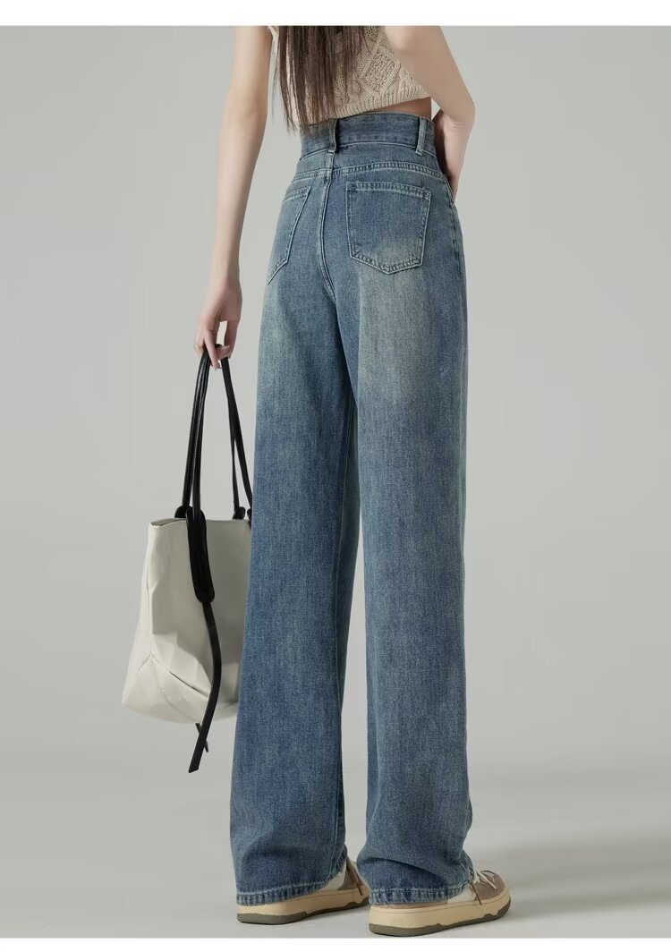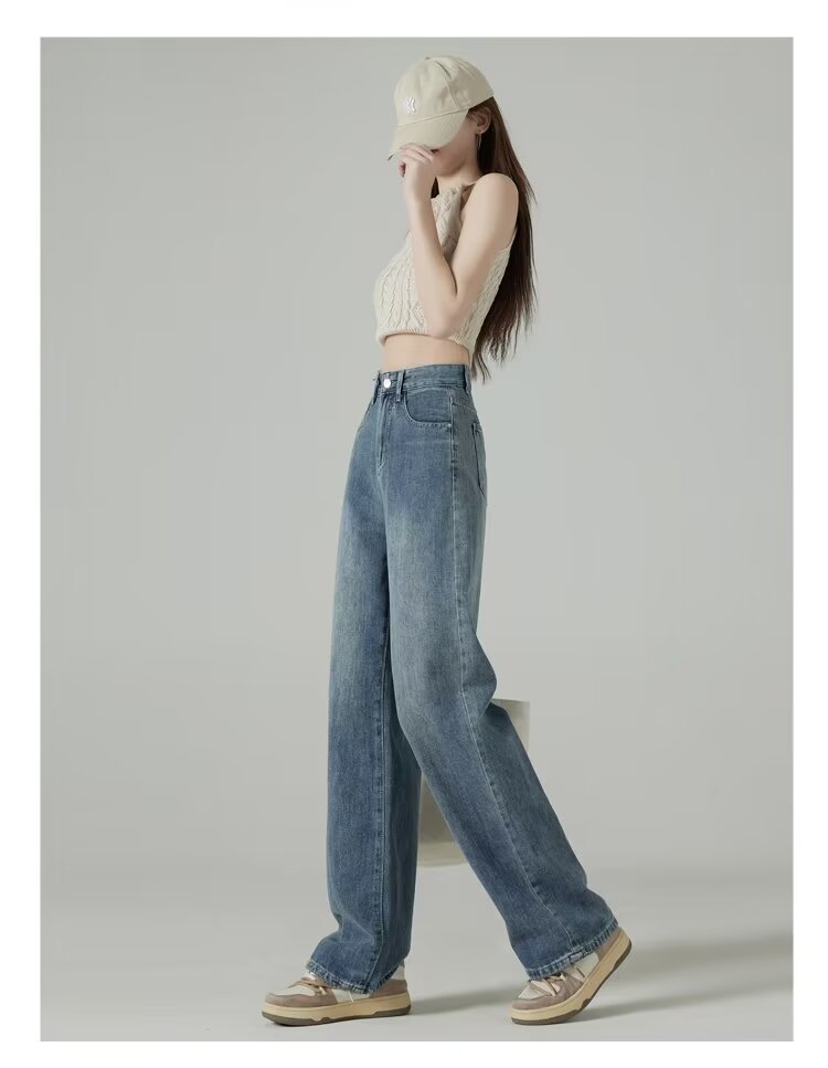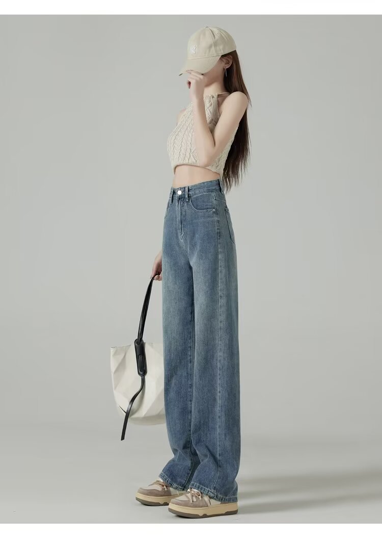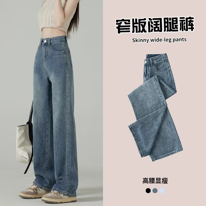 레트로 블루 와이드 레그 청바지 여성의 봄과 가을 얇은 2024 새로운 느슨한 슬리밍 작은 스트레이트 걸레 바지스토어 가기