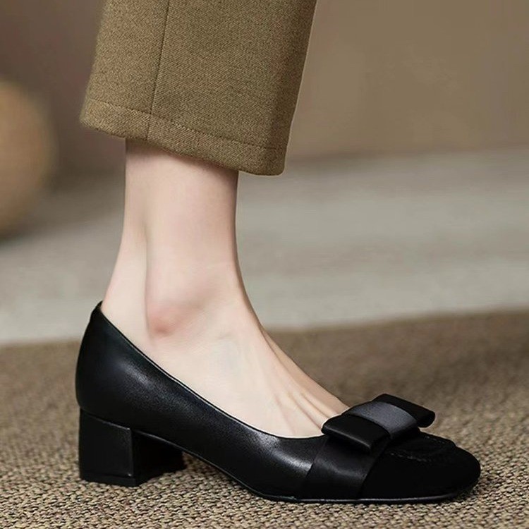 프랑스 빈티지 활 신발 여성 로우 힐 2024 봄과 가을 새로운 소프트 가죽 두꺼운 힐 얕은 입 작은 신발 슬립 온스토어 가기