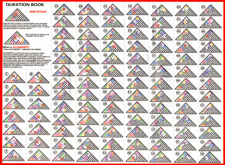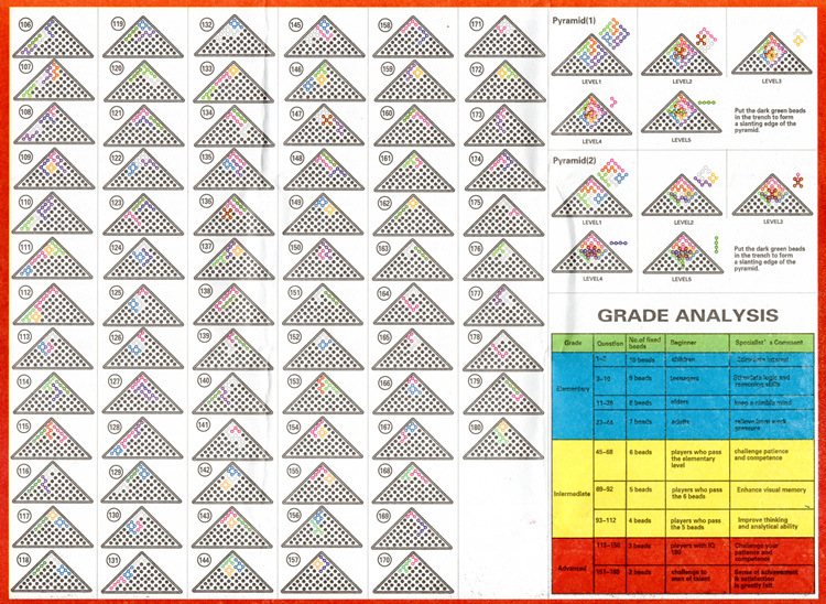 说明书中有180道题目,按难度分基础、中等、三个难度等级,通过图案就可以看懂每道题目需要做什么,可以勿略掉英文说明。游戏由12组不同形状的珠体组成的游戏,分初、中、三个阶段,每级各有60条题目,共180条题目,2582种立体组合方式+19887种平面变化,促进亲子间的互动及感情,即可增长智慧,又可为您带来乐趣。