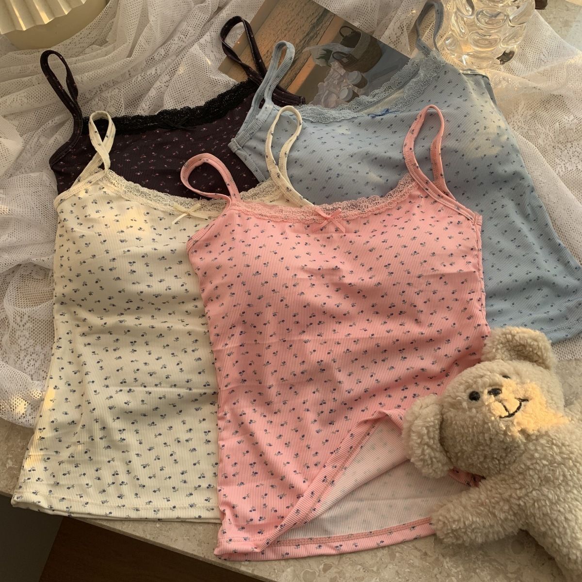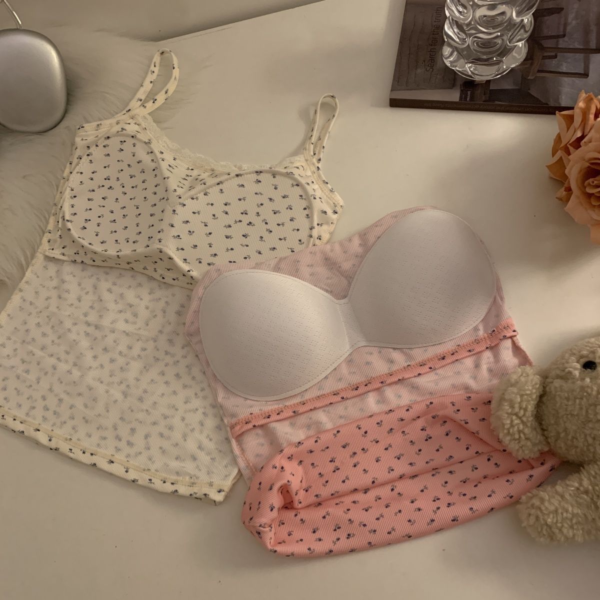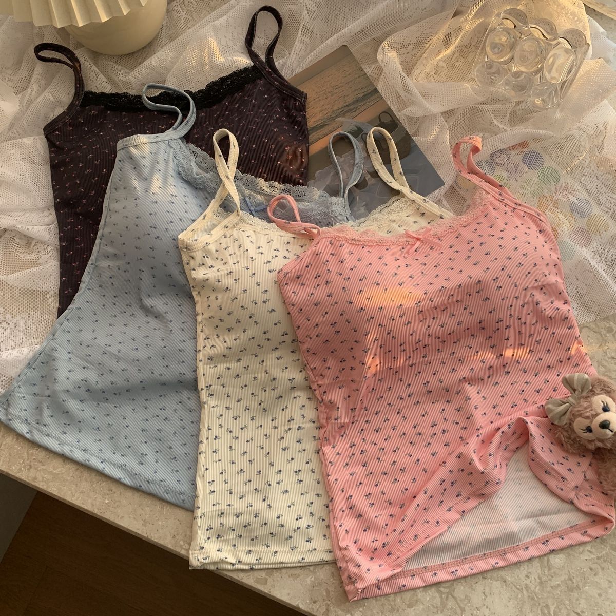 가슴 패드가있는 여성용 한국식 꽃 달콤한 캐미솔 순수한 섹시한 슬림 스티칭 슬리밍 바닥 탑