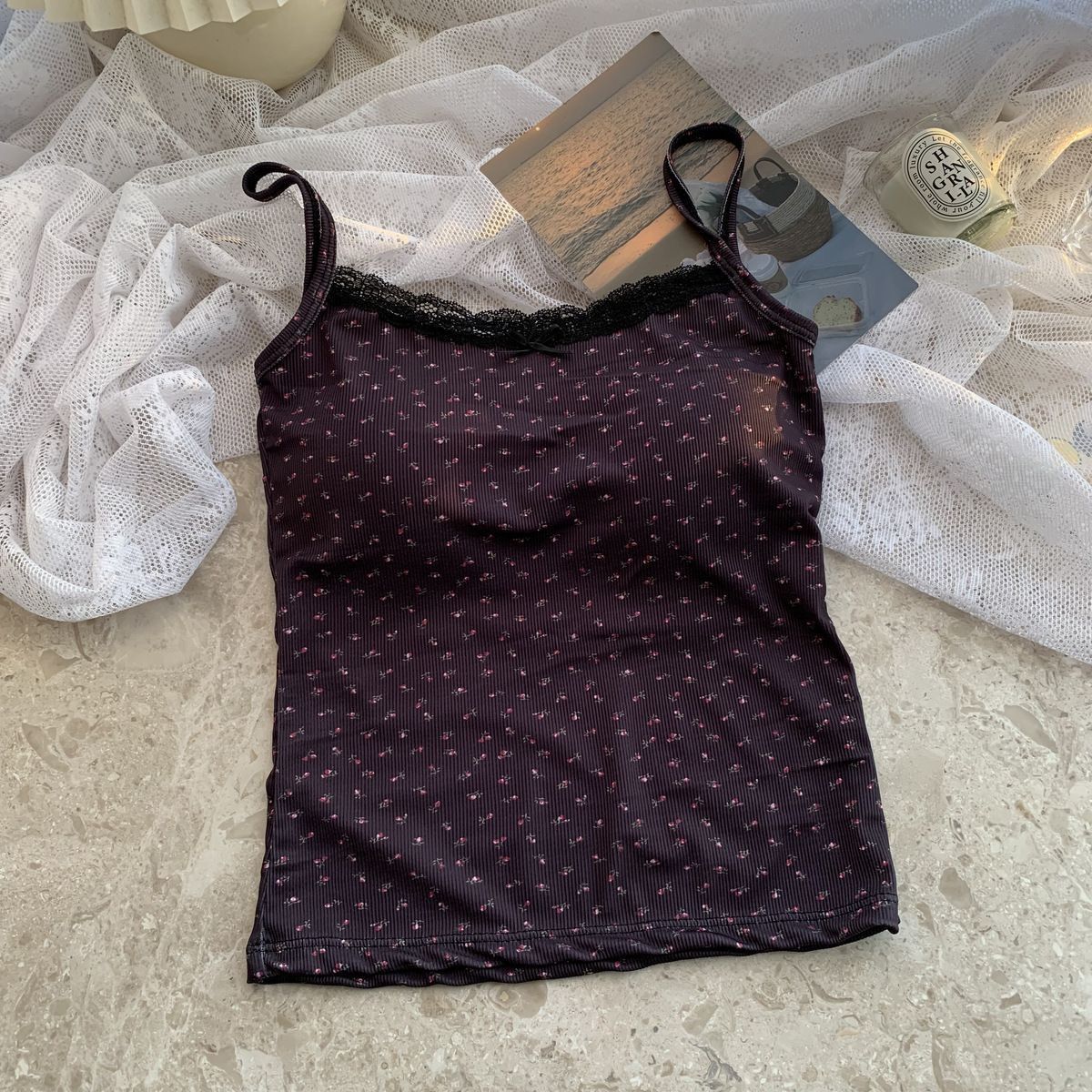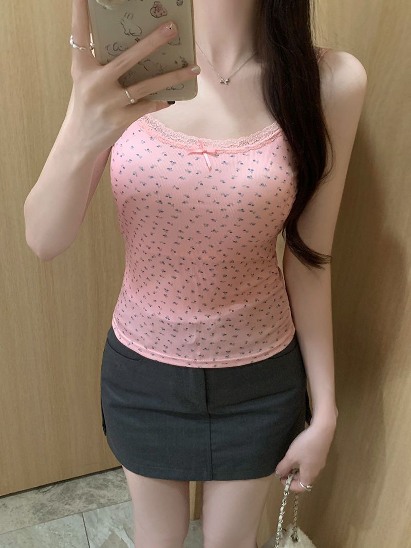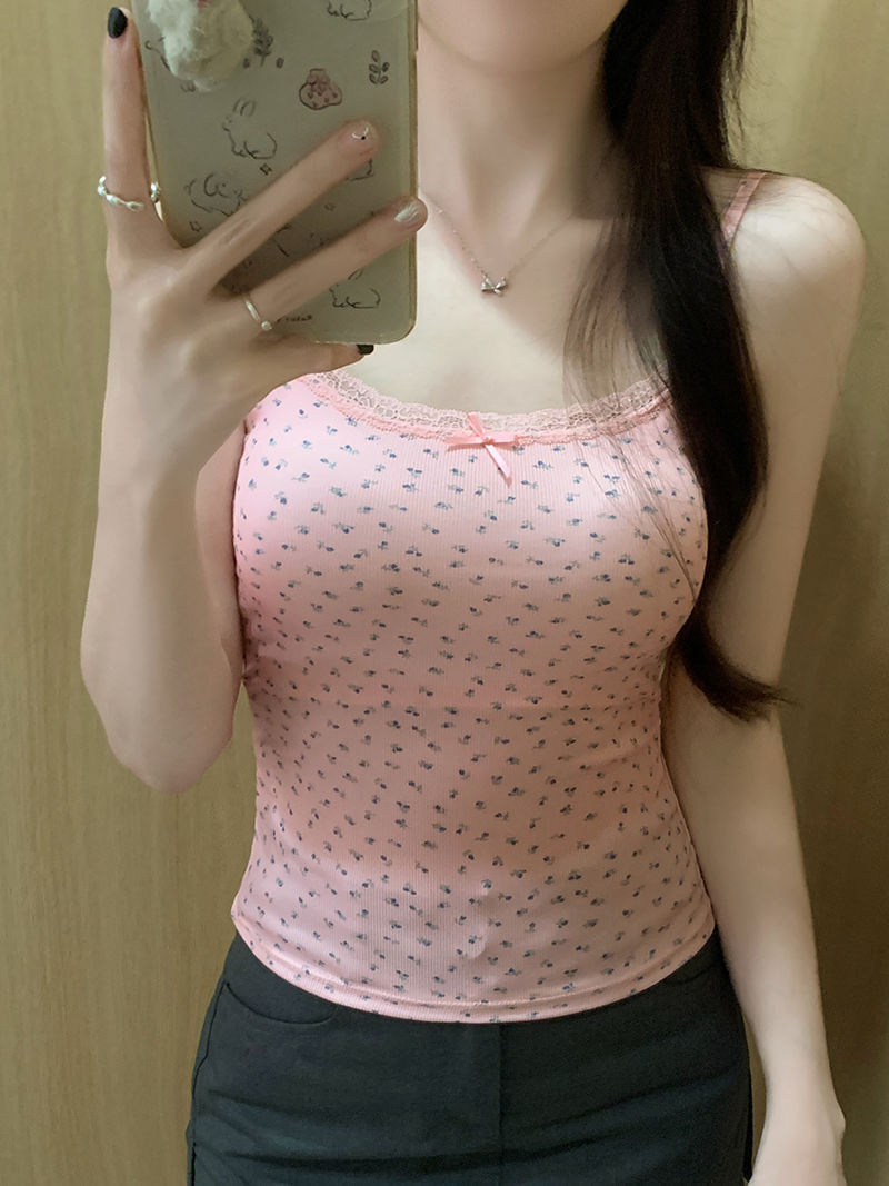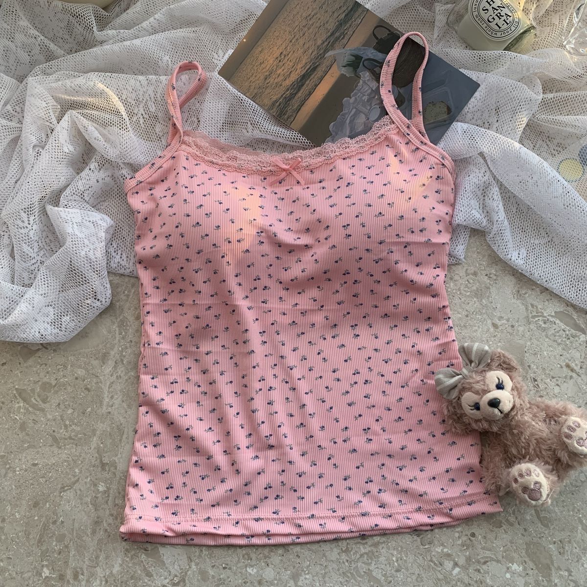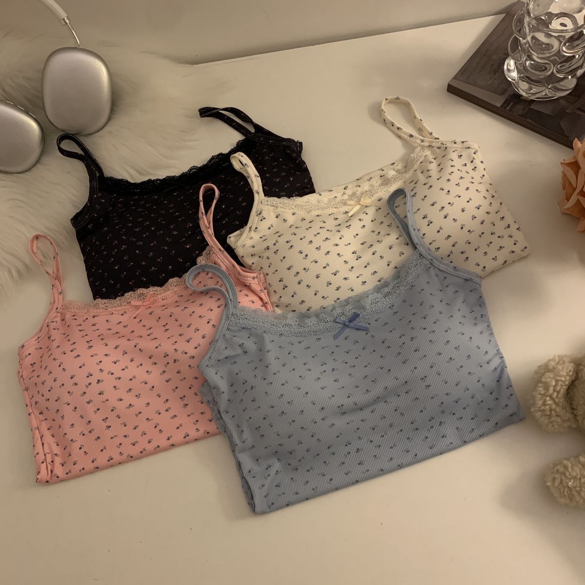 가슴 패드가있는 여성용 한국식 꽃 달콤한 캐미솔 순수한 섹시한 슬림 스티칭 슬리밍 바닥 탑