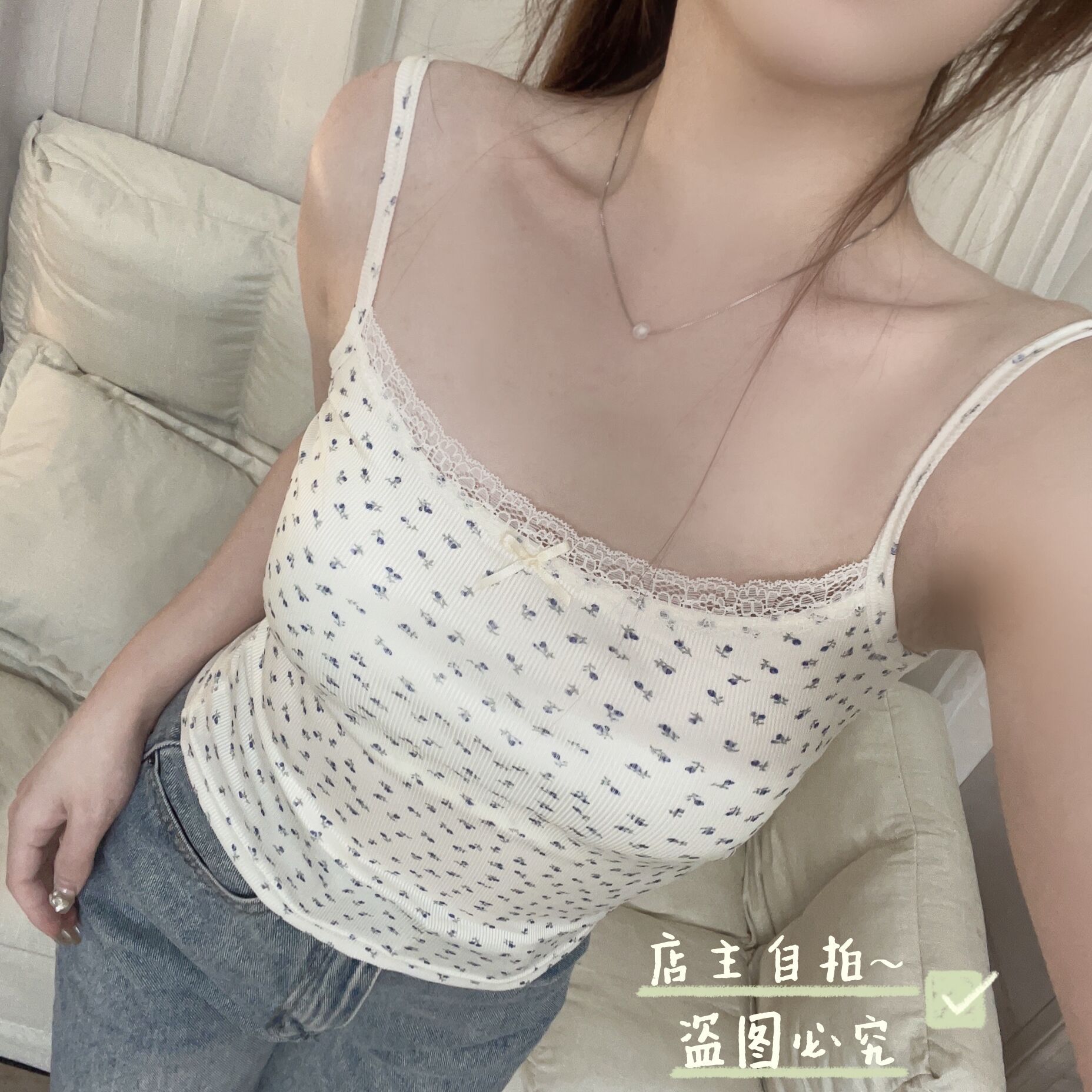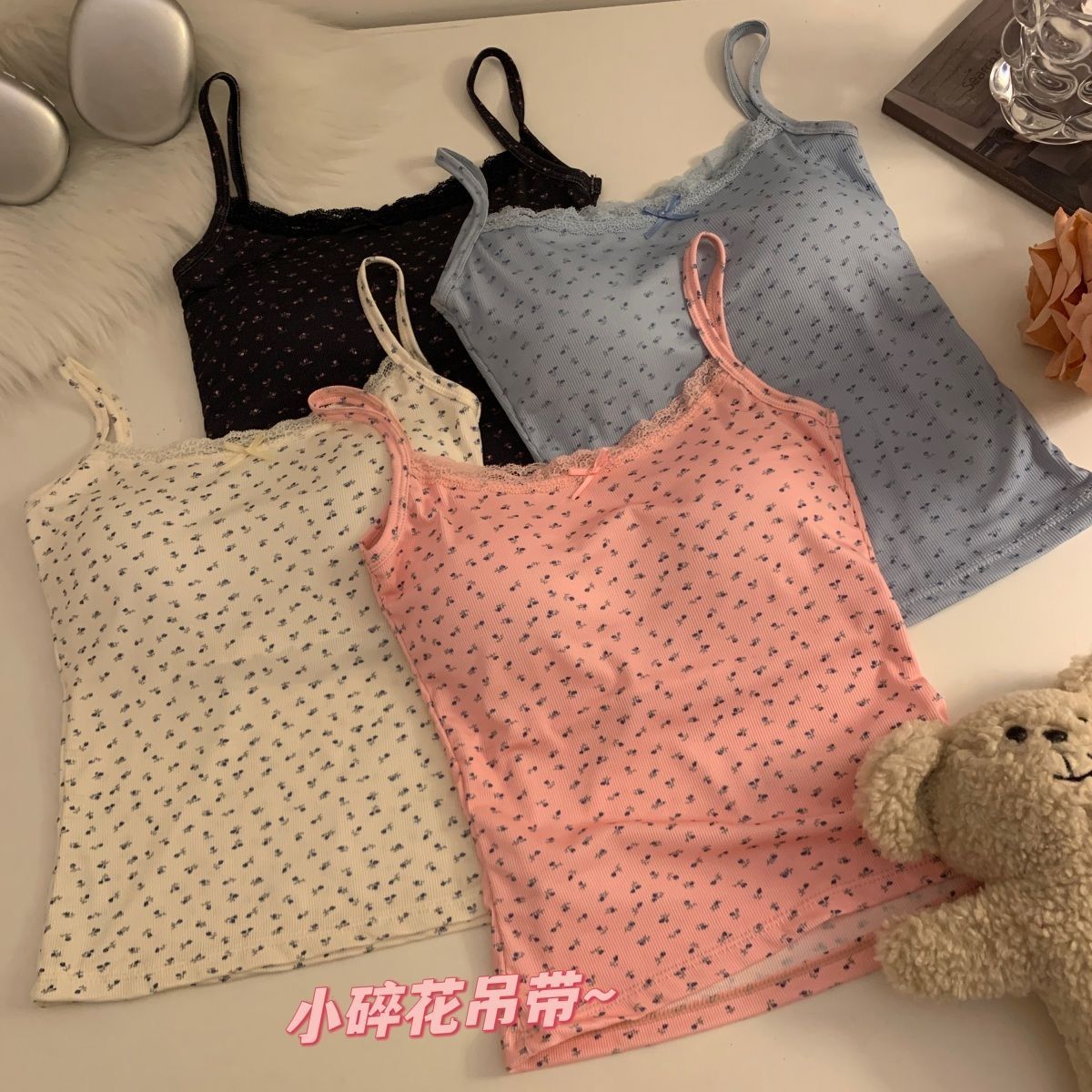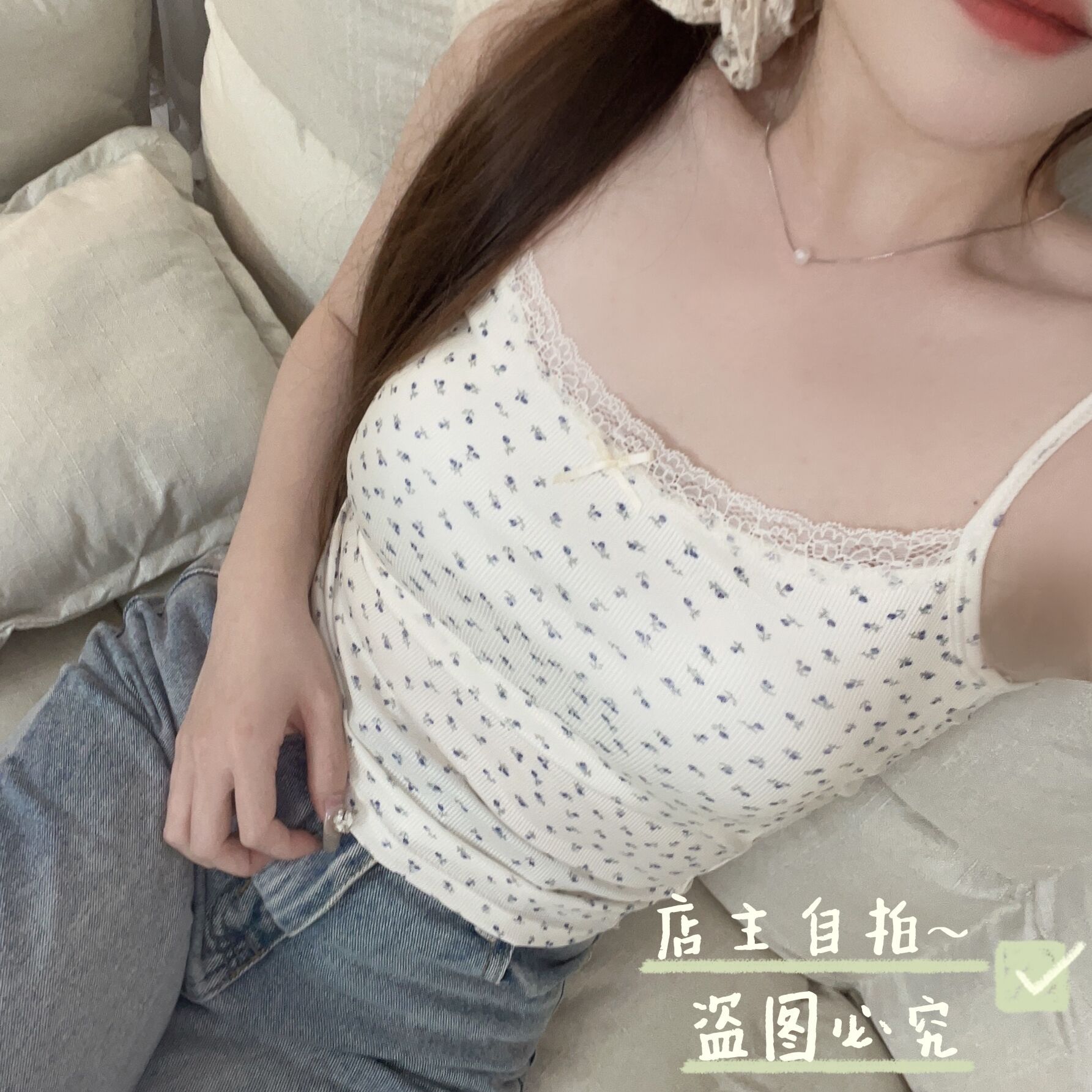 가슴 패드가있는 여성용 한국식 꽃 달콤한 캐미솔 순수한 섹시한 슬림 스티칭 슬리밍 바닥 탑스토어 가기