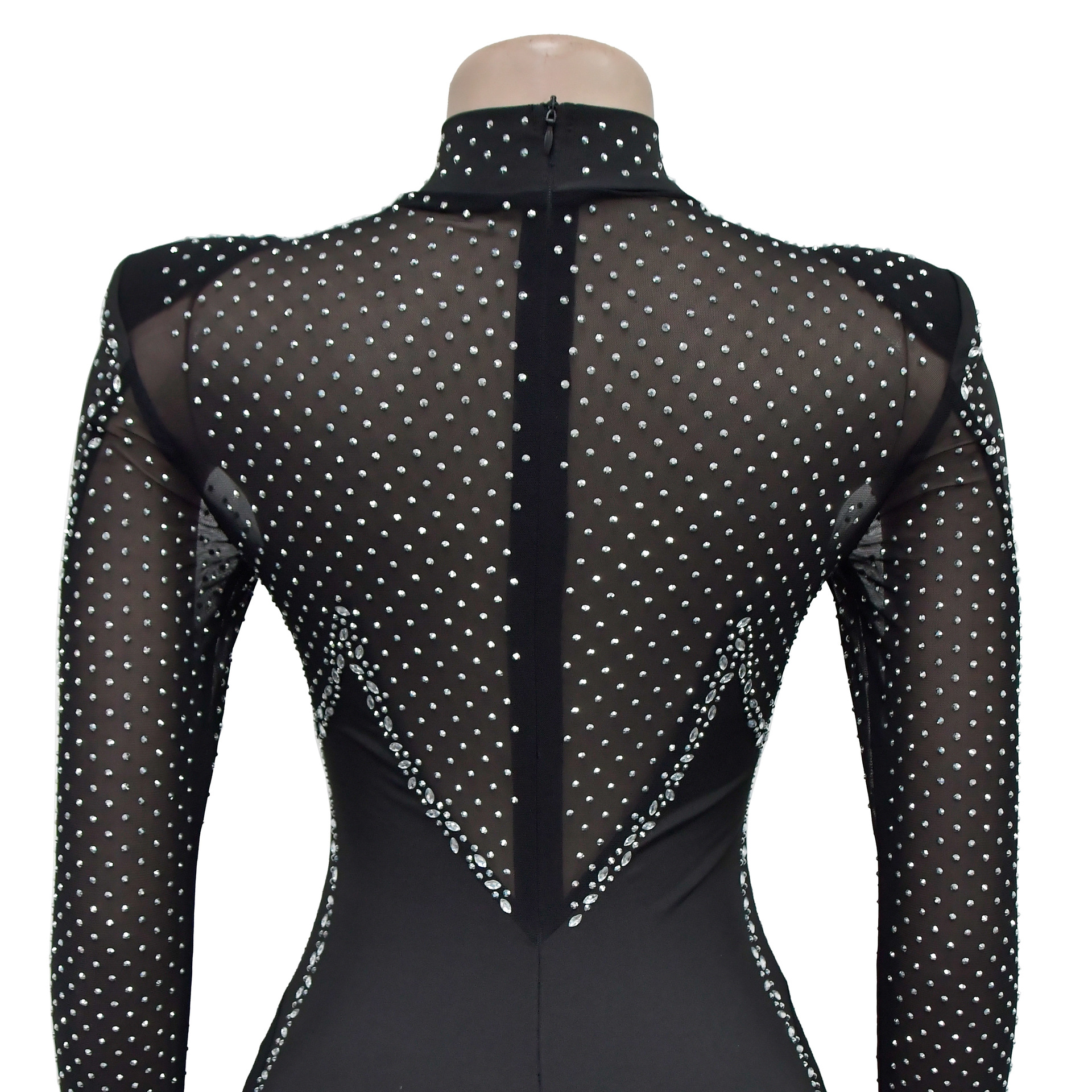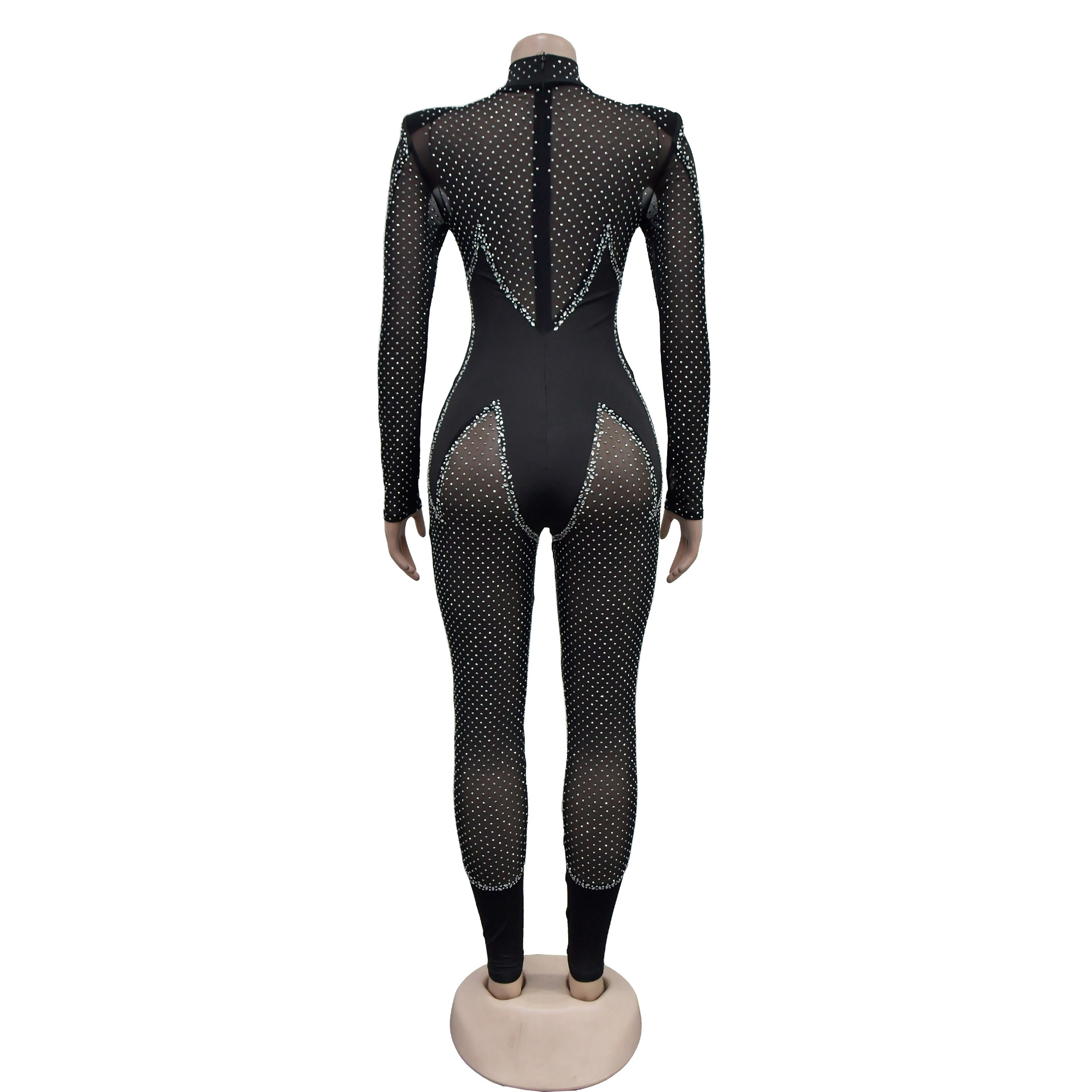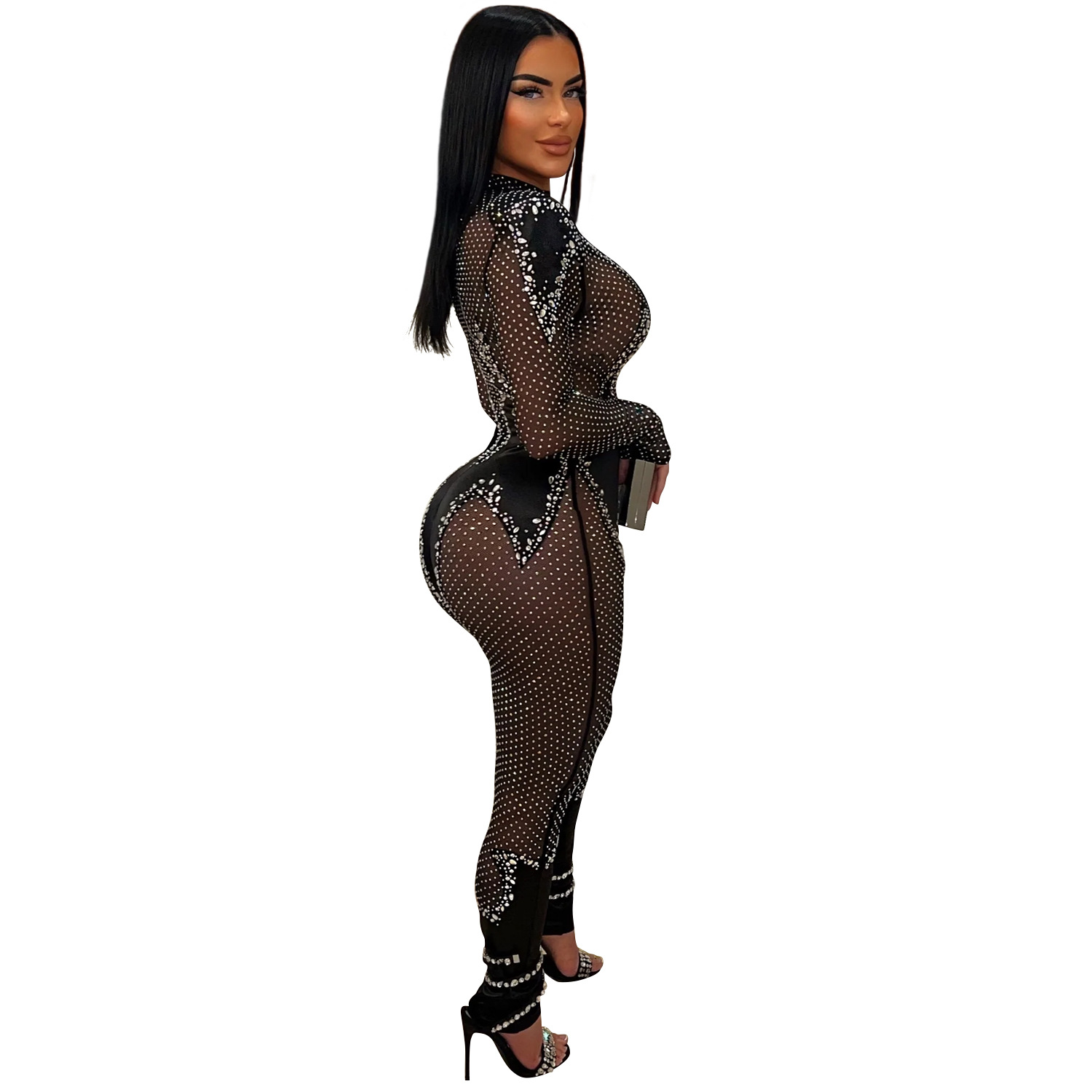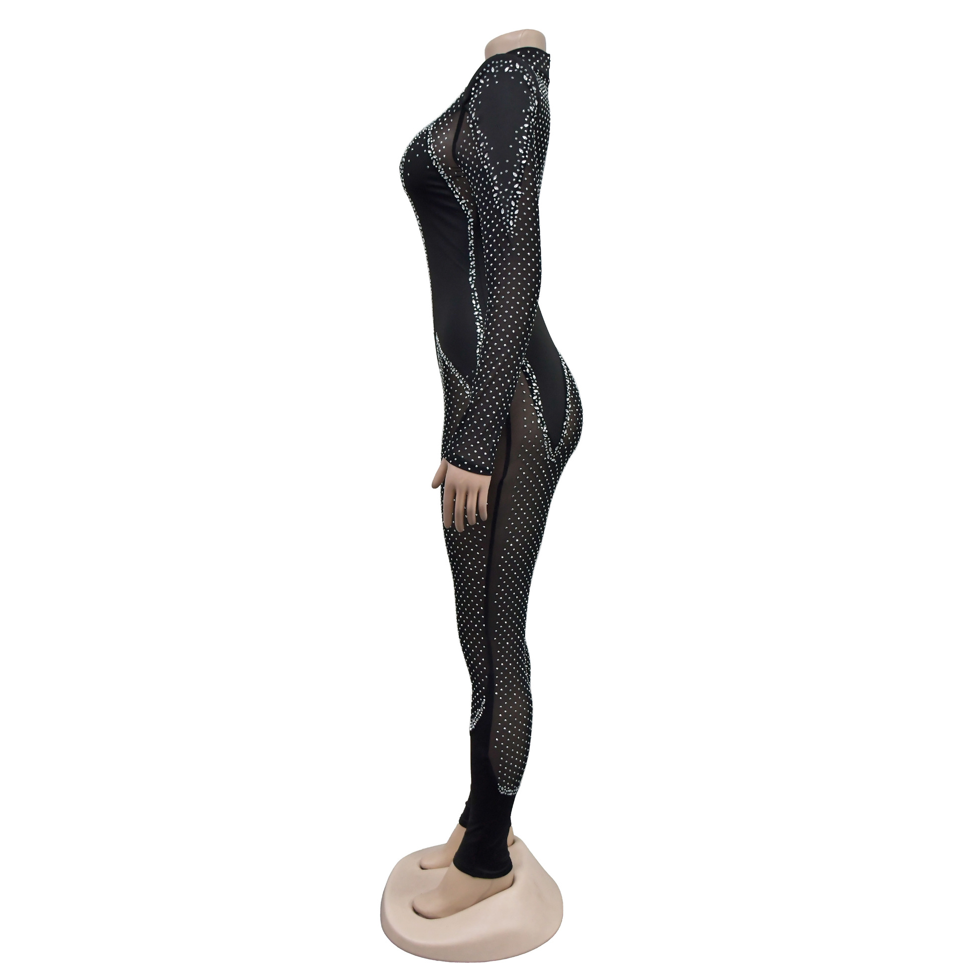 C6886 국경 간 AliExpress 아마존 유럽과 미국 패션 여성의 단색 메쉬 라인석 긴팔 바지 점프 수트스토어 가기