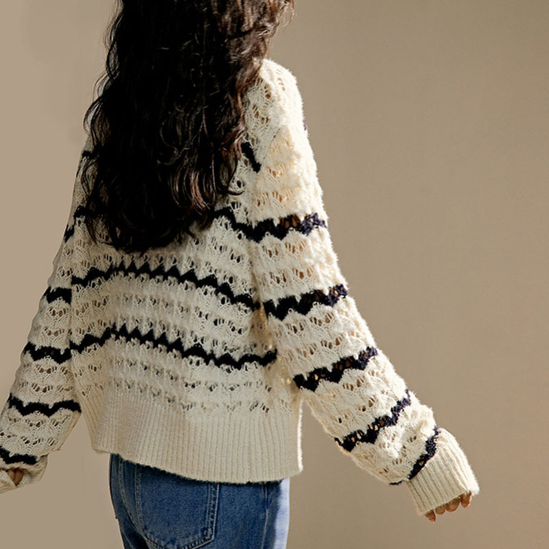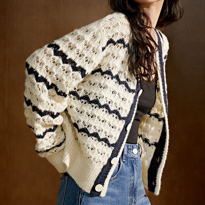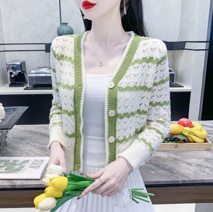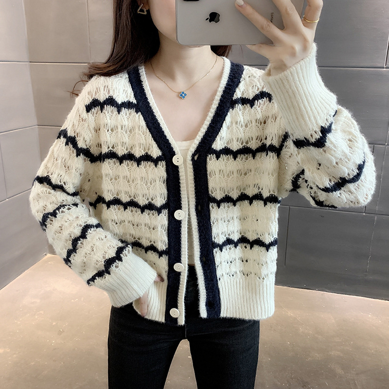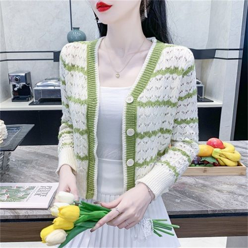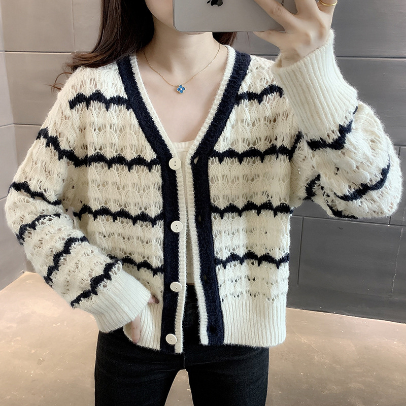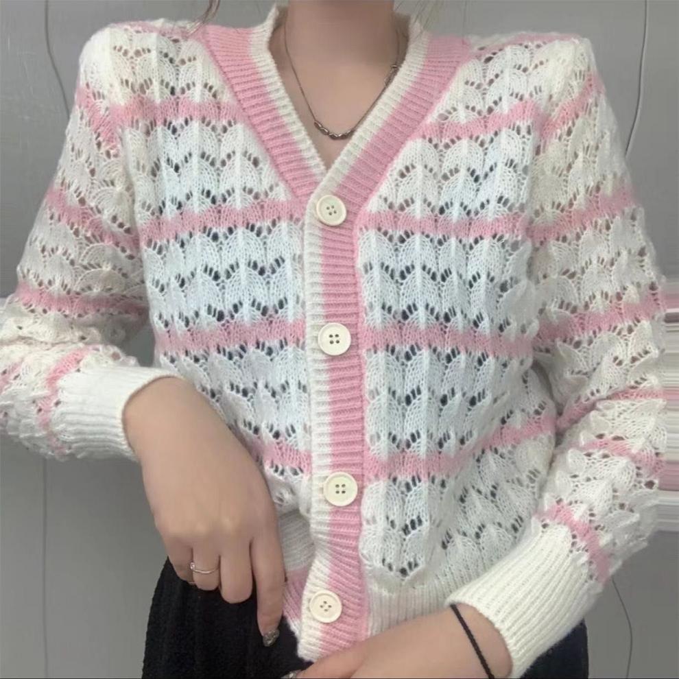 샤오샹풍 V넥 레이스 니트 가디건 여성용 2025 봄 신상 한국 스타일 루즈핏 스트라이프 스웨터 아우터