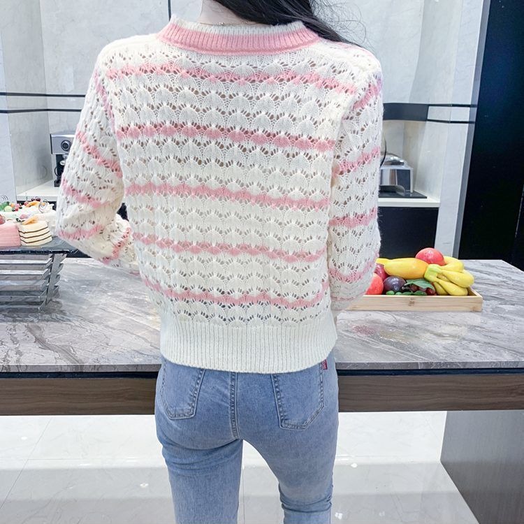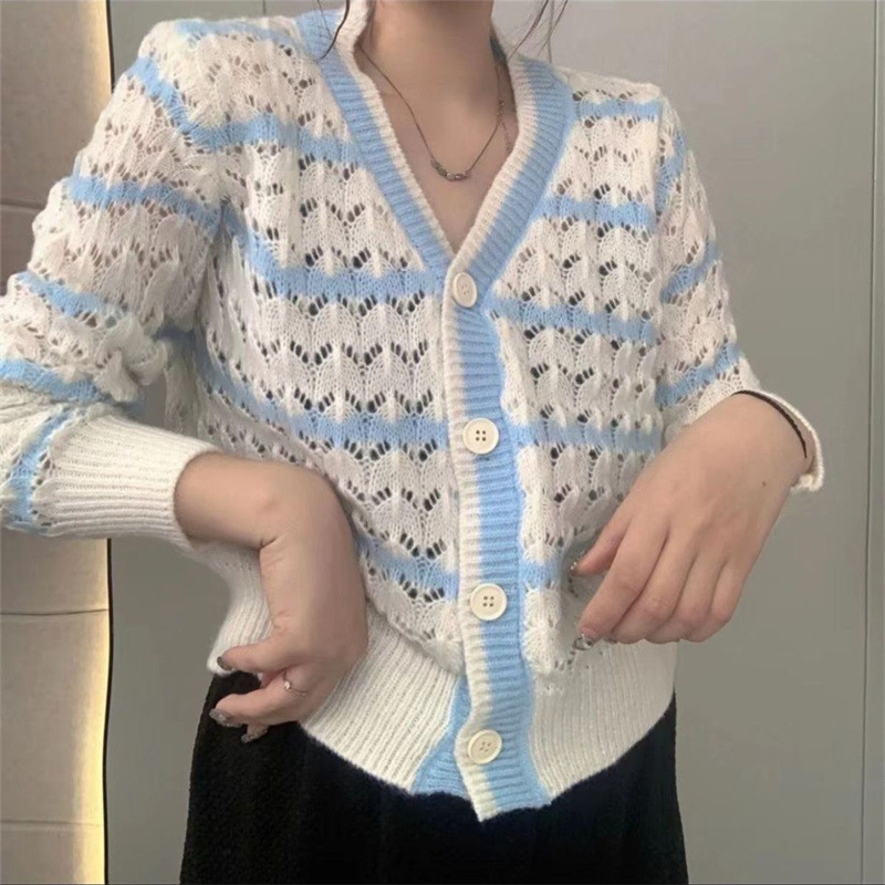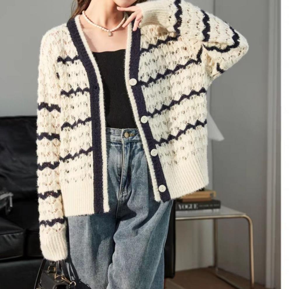 샤오샹풍 V넥 레이스 니트 가디건 여성용 2025 봄 신상 한국 스타일 루즈핏 스트라이프 스웨터 아우터스토어 가기