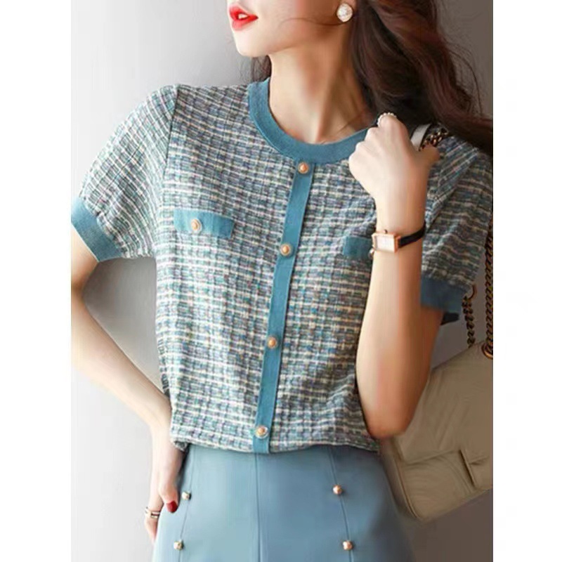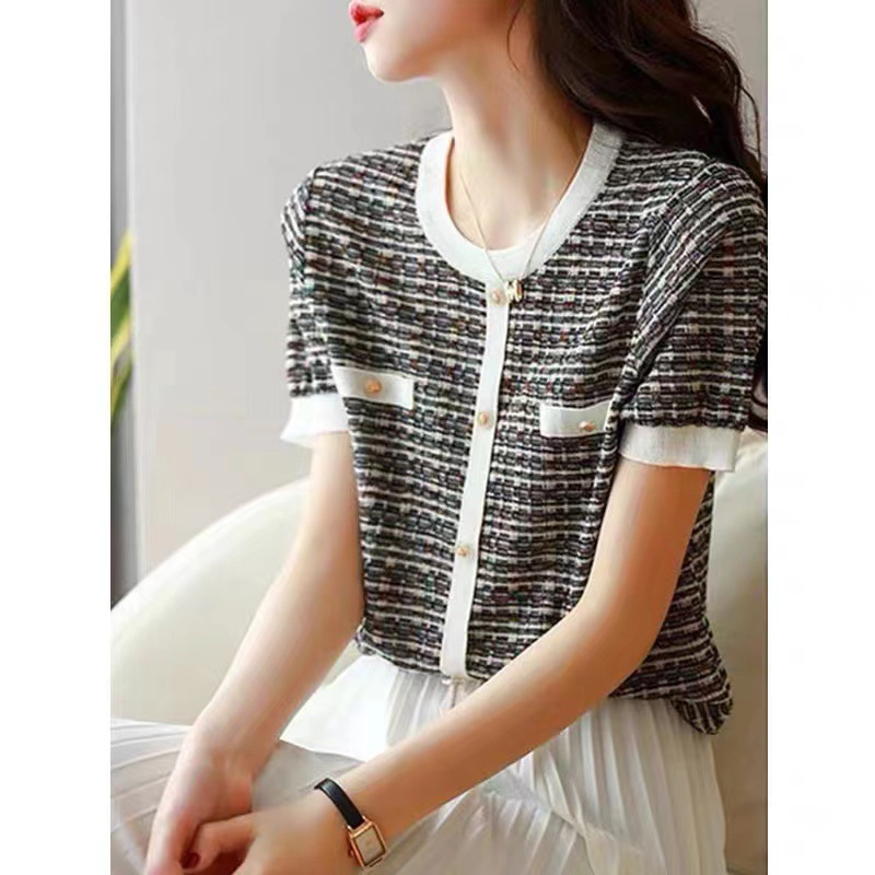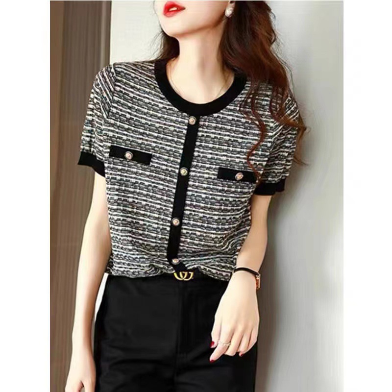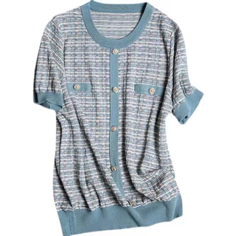 아이스 실크 니트 탑 반팔 티셔츠 여성 여름 얇은 라운드 넥 패션 기질 느슨한 스트라이프 셔츠