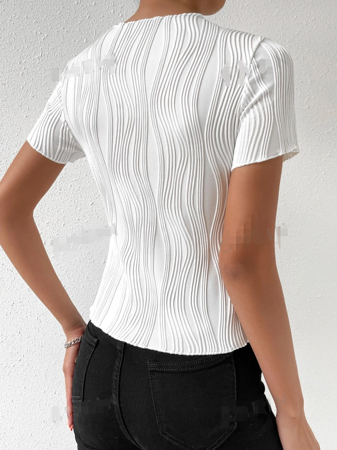 아마존 유럽과 미국의 봄과 여름 새로운 둥근 목 짧은 소매 단색 슬림 불규칙한 세로 줄무늬 여성용 티셔츠