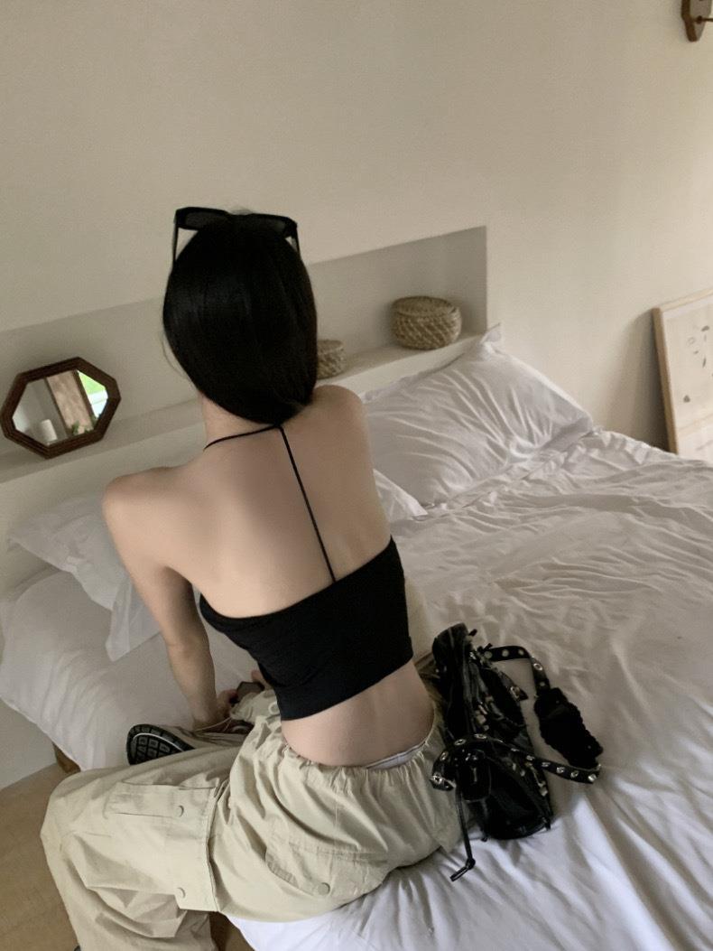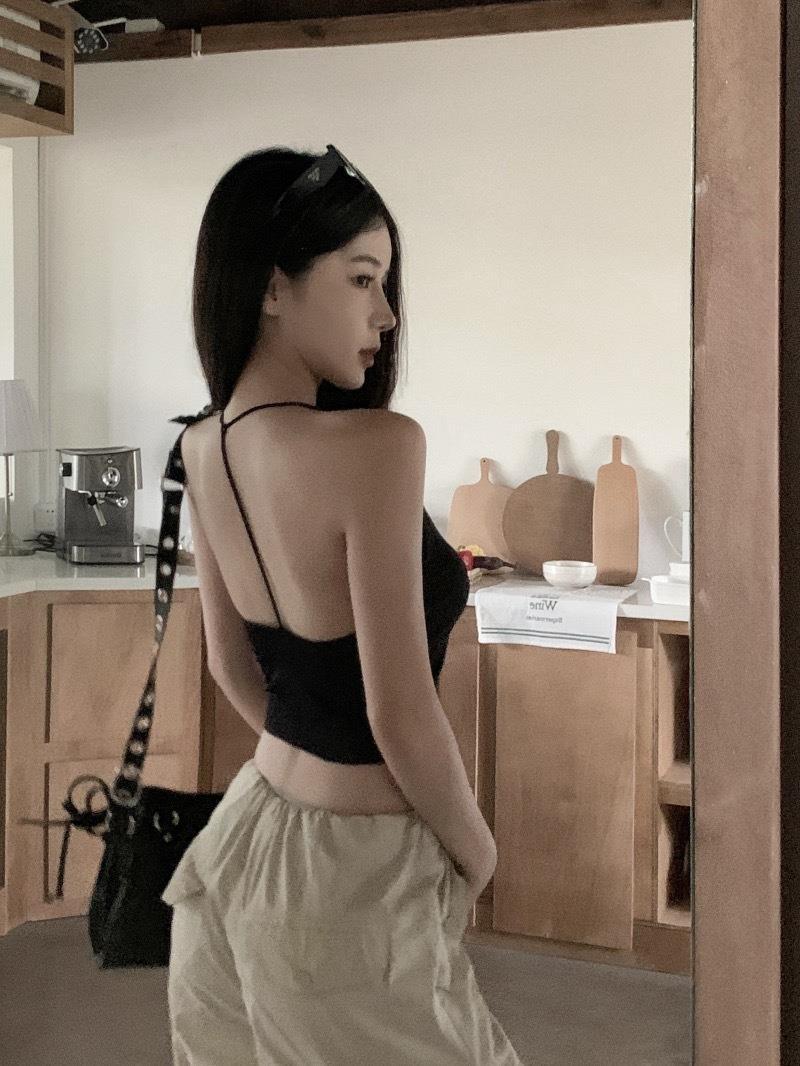 한국 스타일 순수한 소원 목에 매달린 얇은 카미 솔 조끼 여자 섹시한 뜨거운 여자 가슴 패드와 백리스 내부 입고 아름다운 뒤로 싸인 가슴 여자