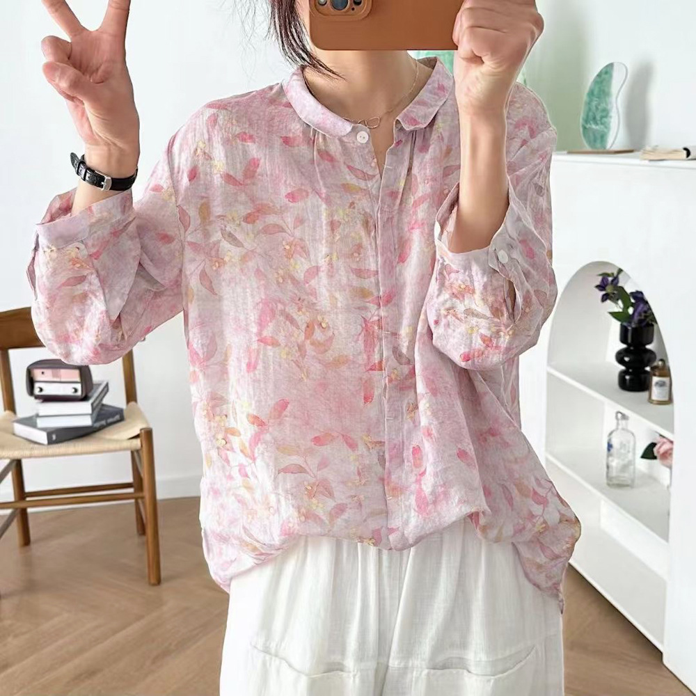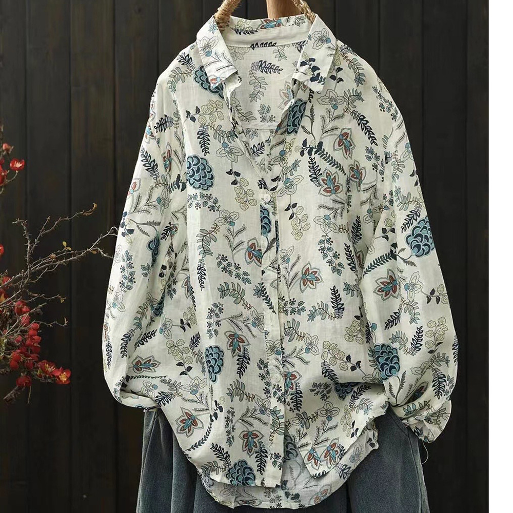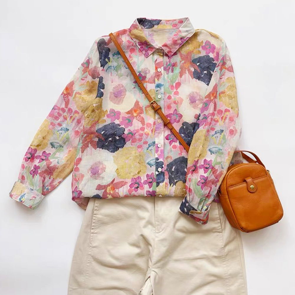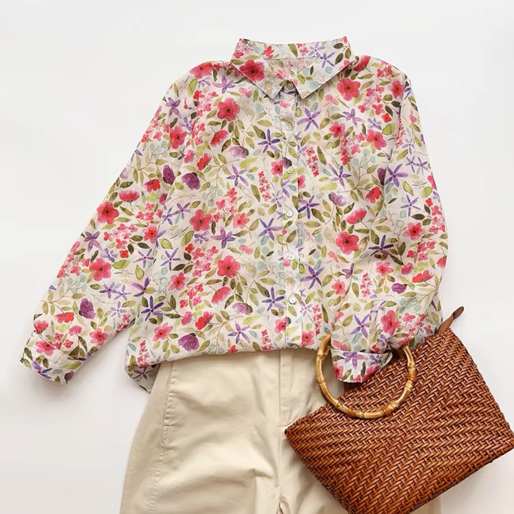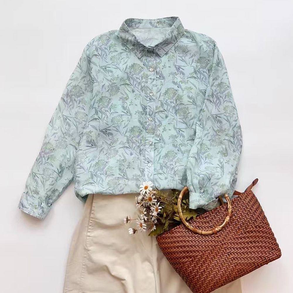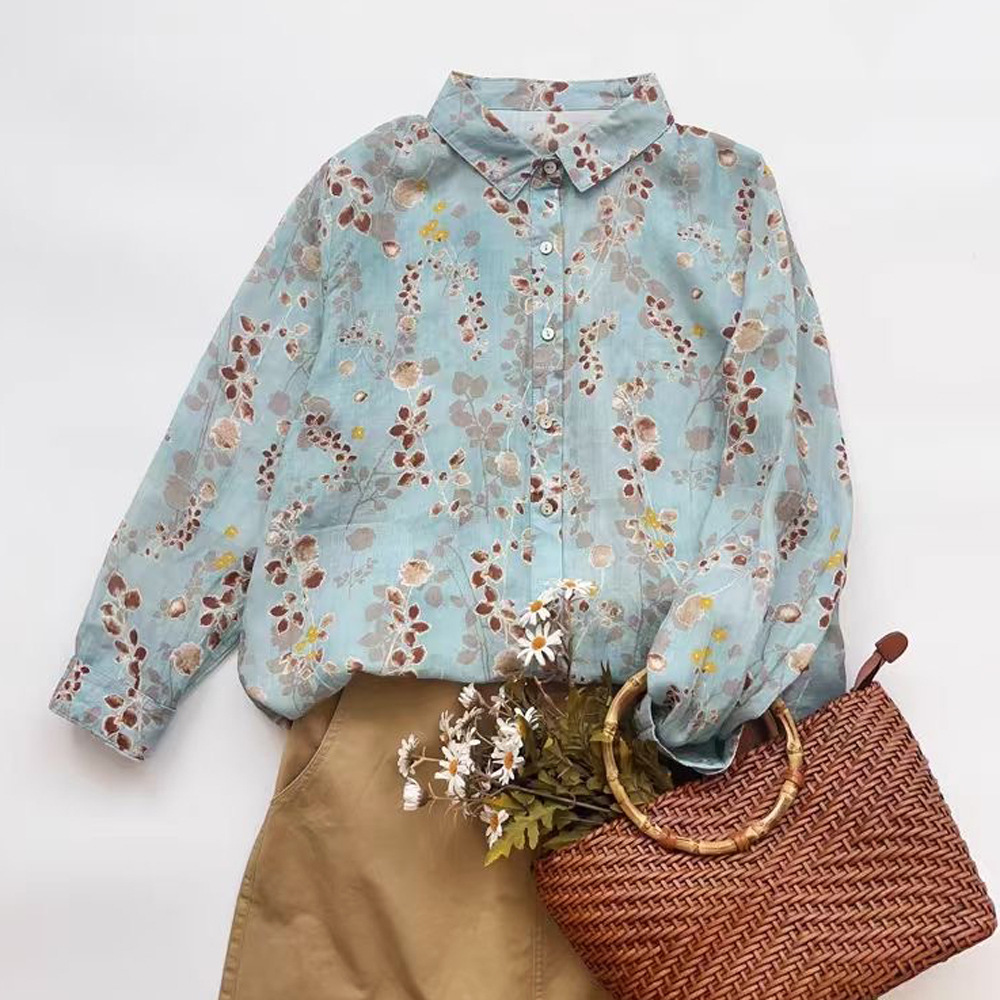 모리 소녀 예술적 라미 인쇄 셔츠 긴팔 여성용 옷깃 꽃 탑베이스 셔츠 라미 셔츠 탑 여성 의류스토어 가기