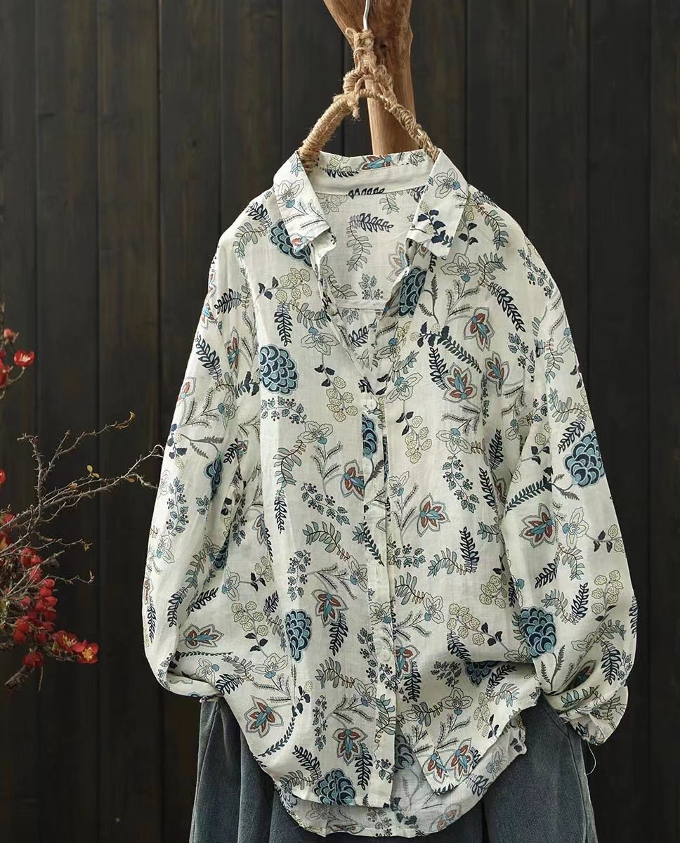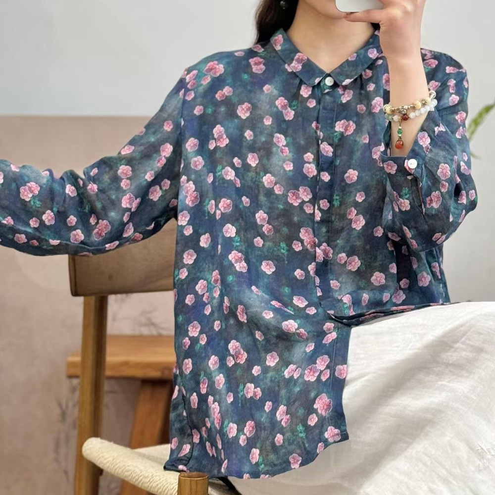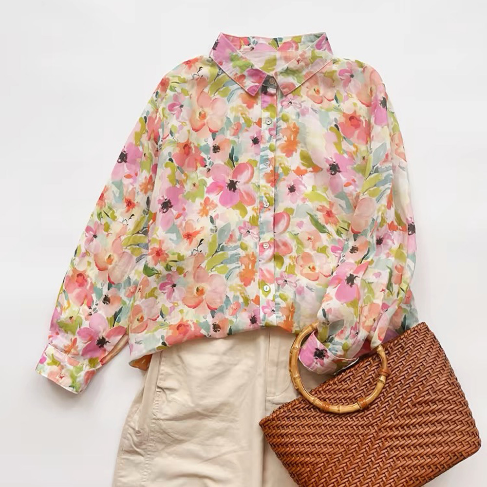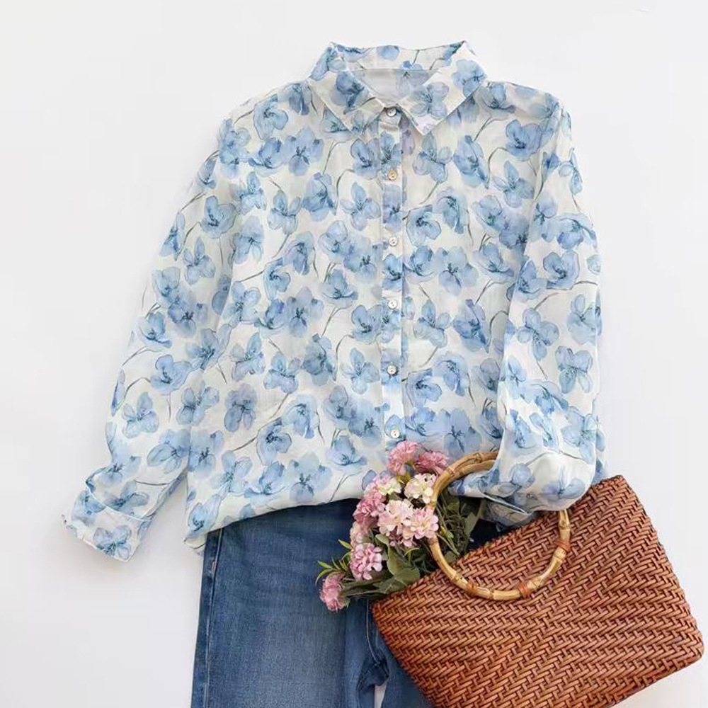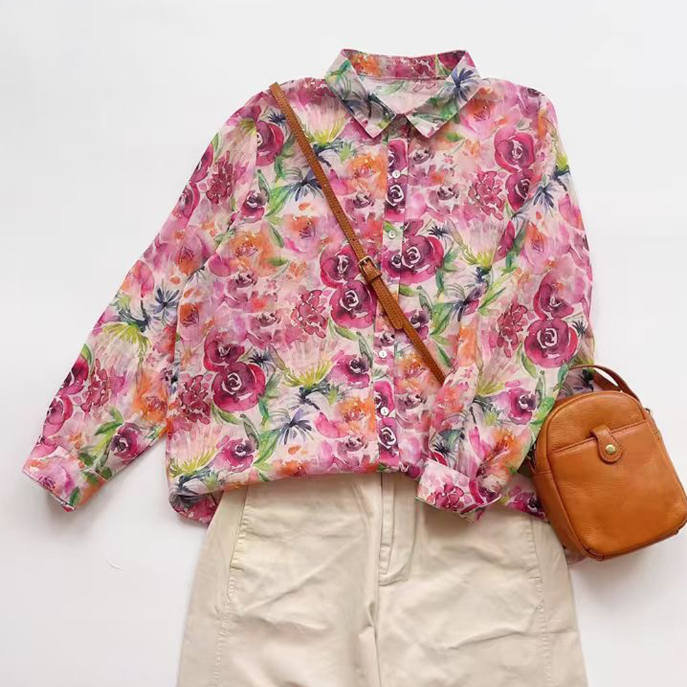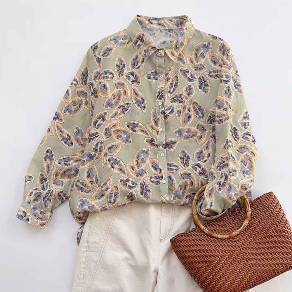 모리 소녀 예술적 라미 인쇄 셔츠 긴팔 여성용 옷깃 꽃 탑베이스 셔츠 라미 셔츠 탑 여성 의류스토어 가기
