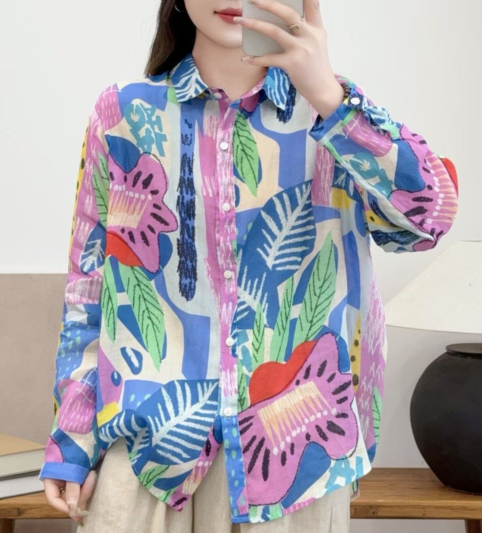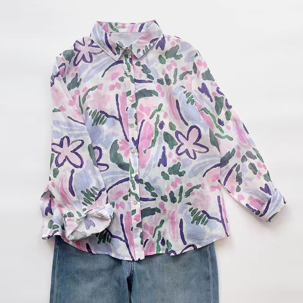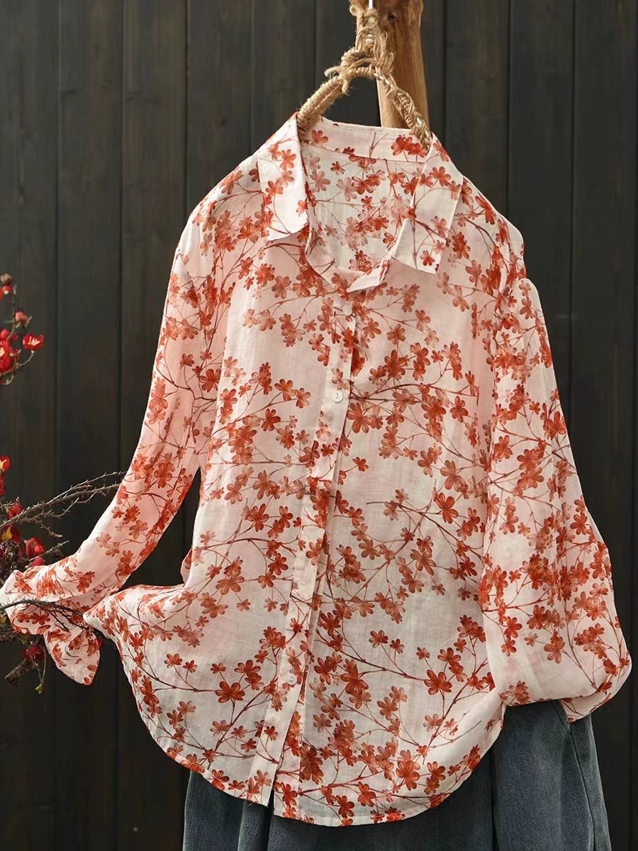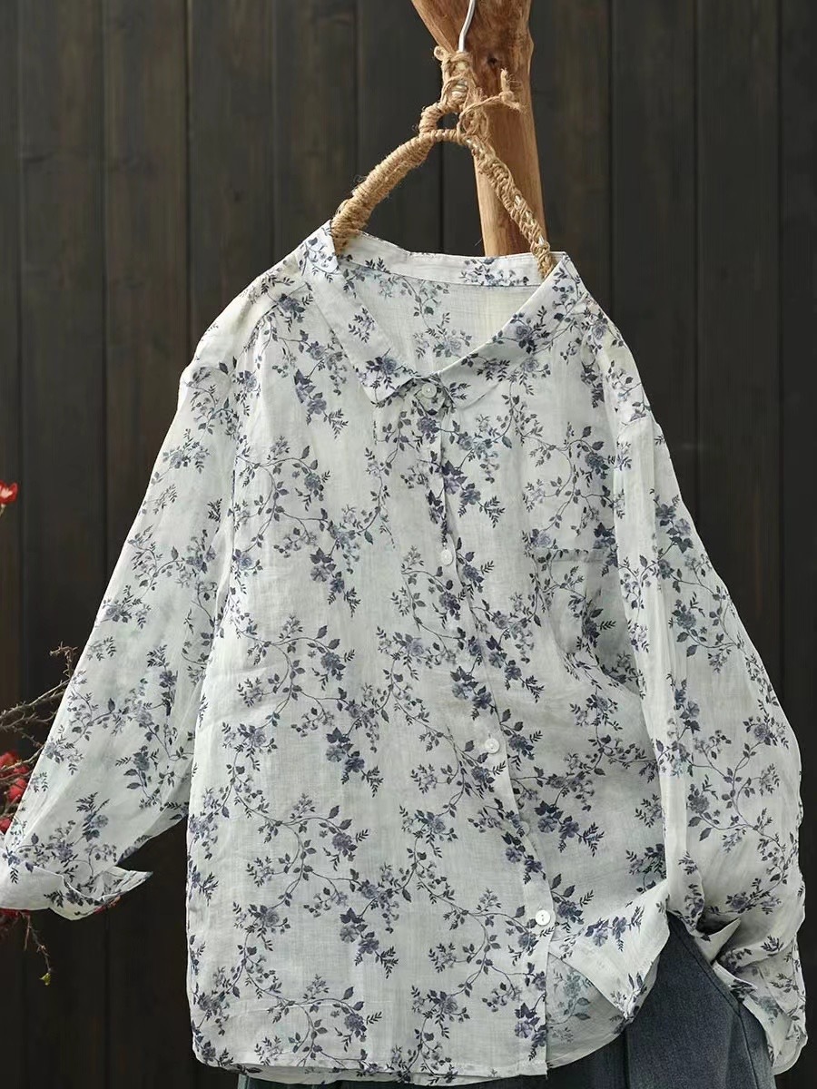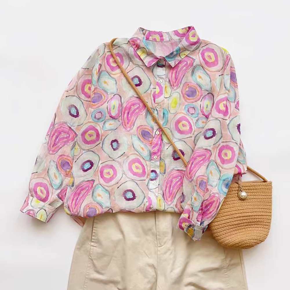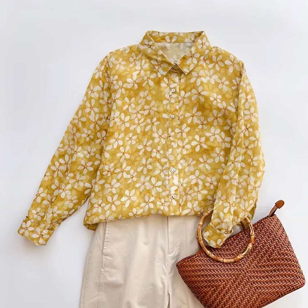모리 소녀 예술적 라미 인쇄 셔츠 긴팔 여성용 옷깃 꽃 탑베이스 셔츠 라미 셔츠 탑 여성 의류스토어 가기