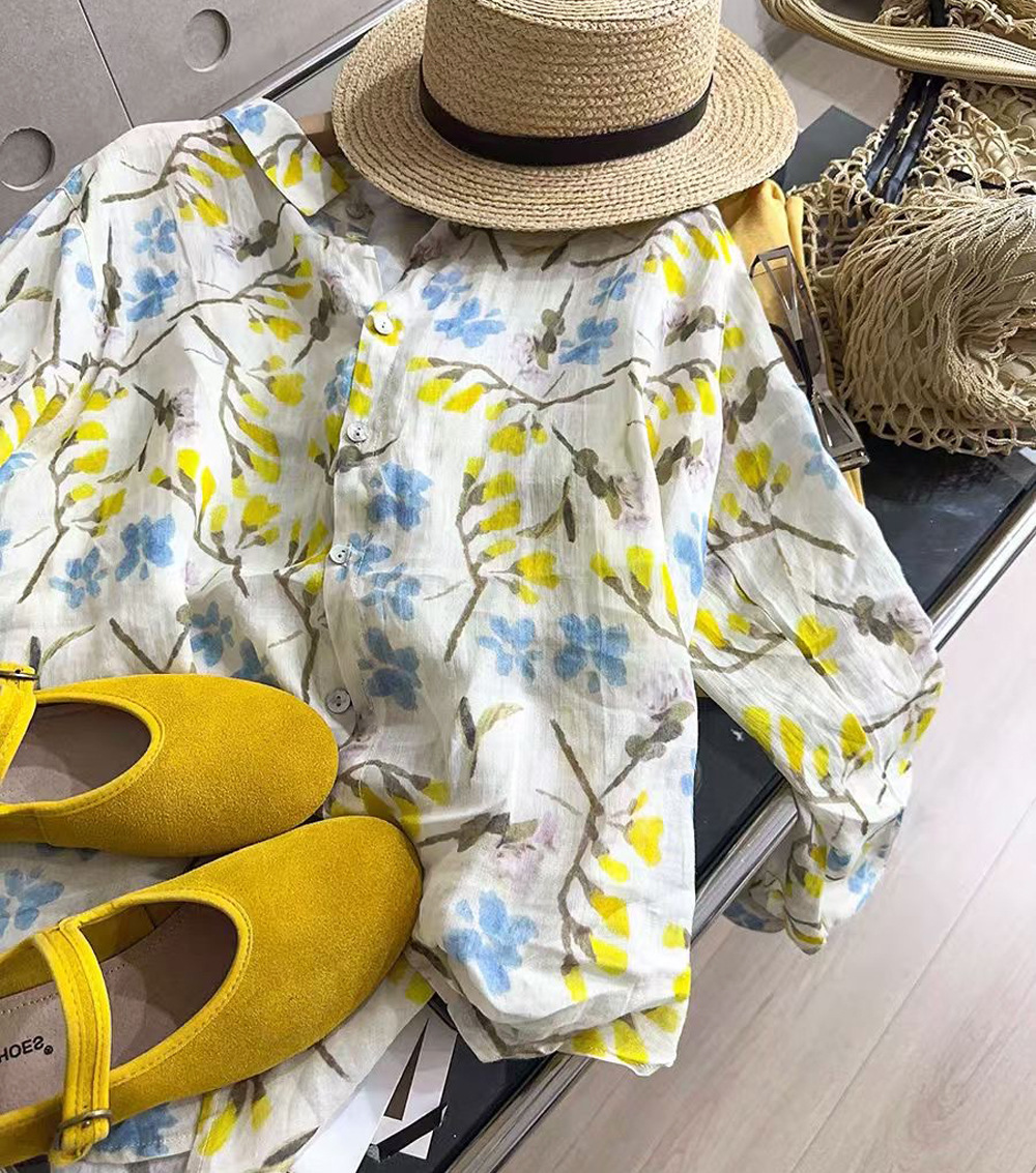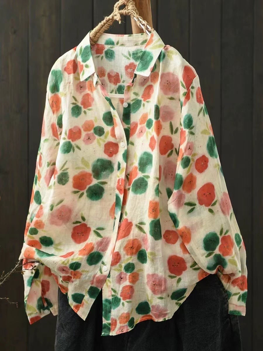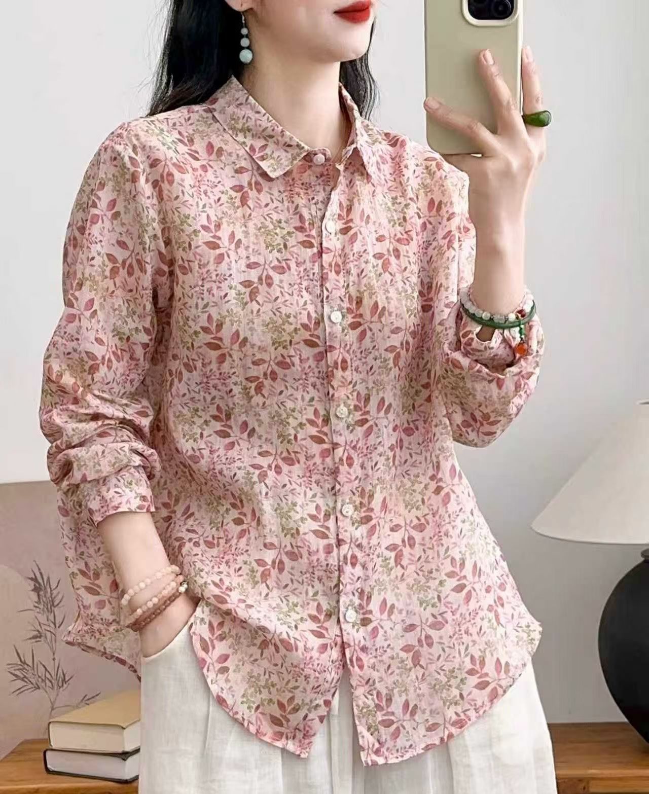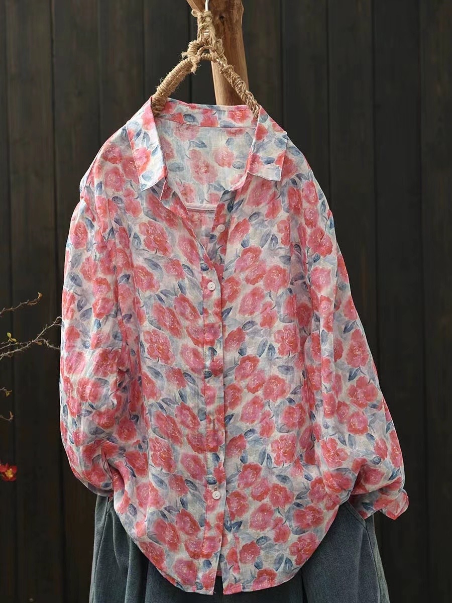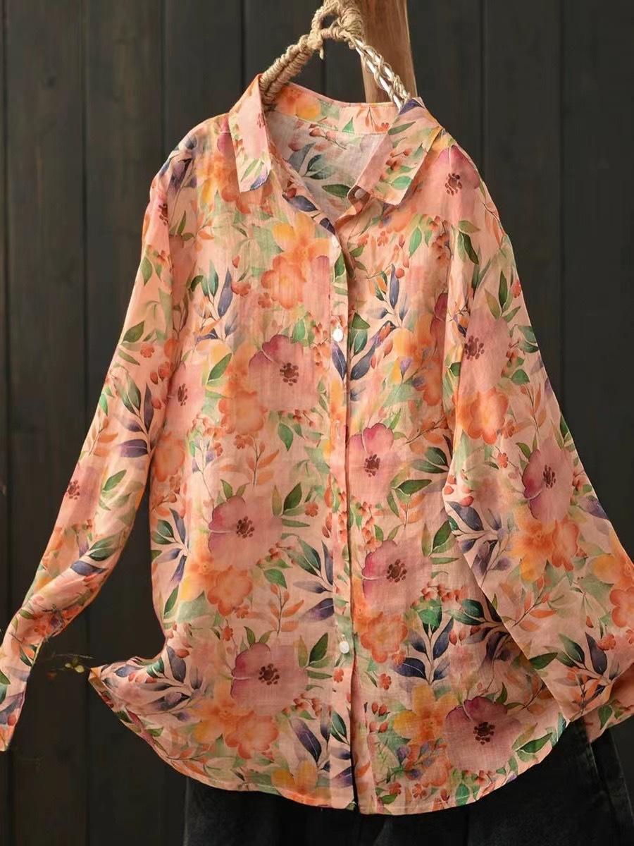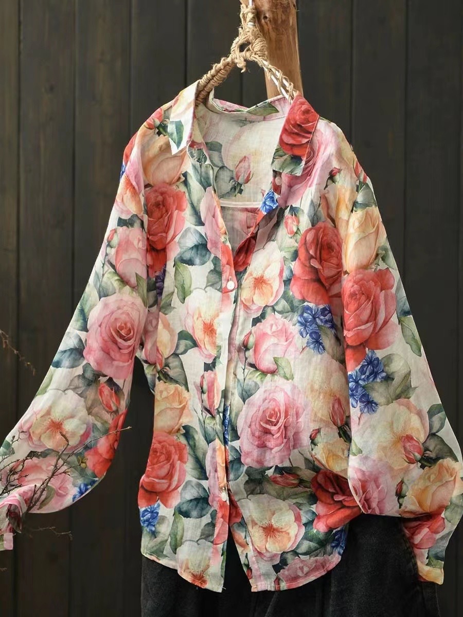 모리 소녀 예술적 라미 인쇄 셔츠 긴팔 여성용 옷깃 꽃 탑베이스 셔츠 라미 셔츠 탑 여성 의류스토어 가기
