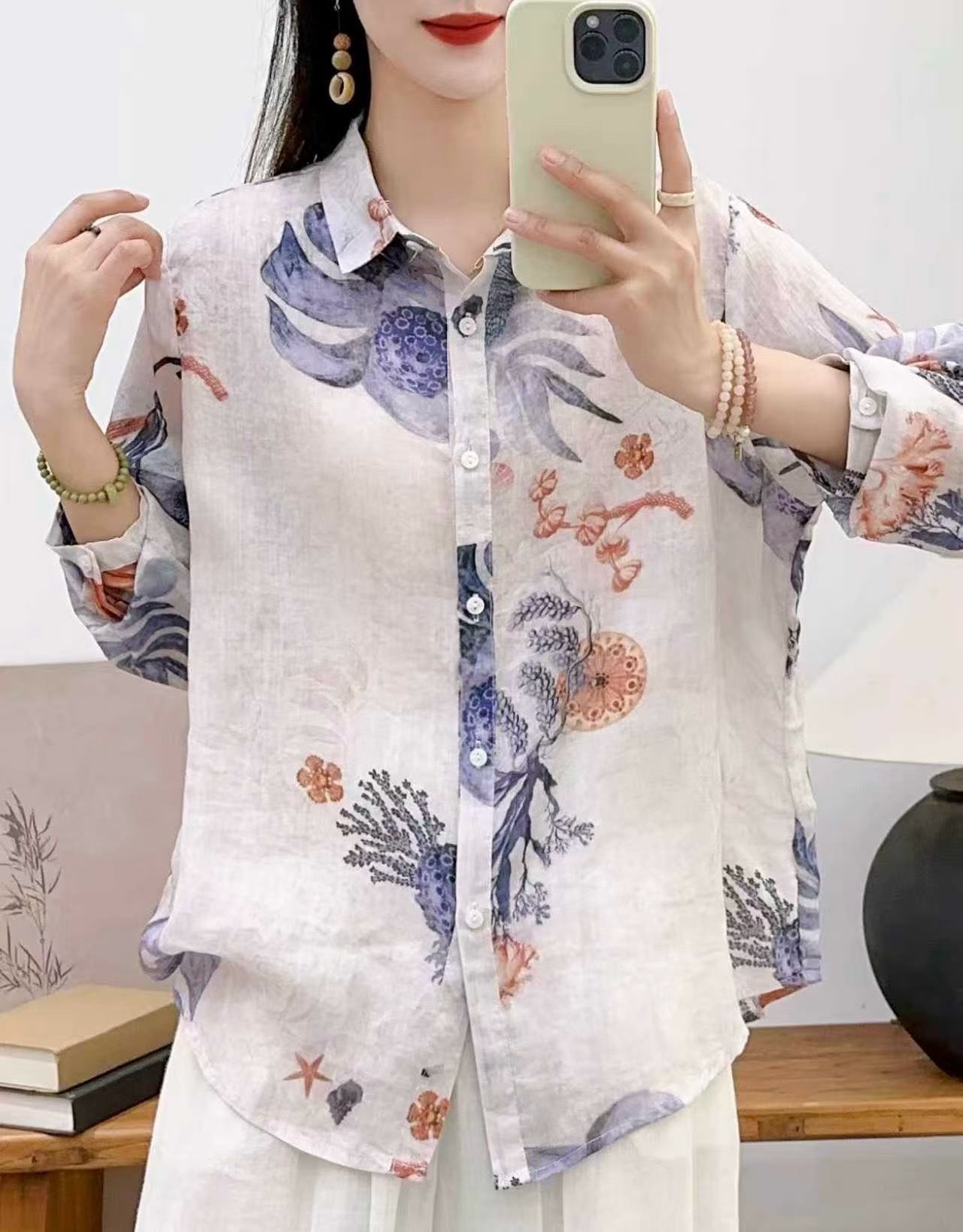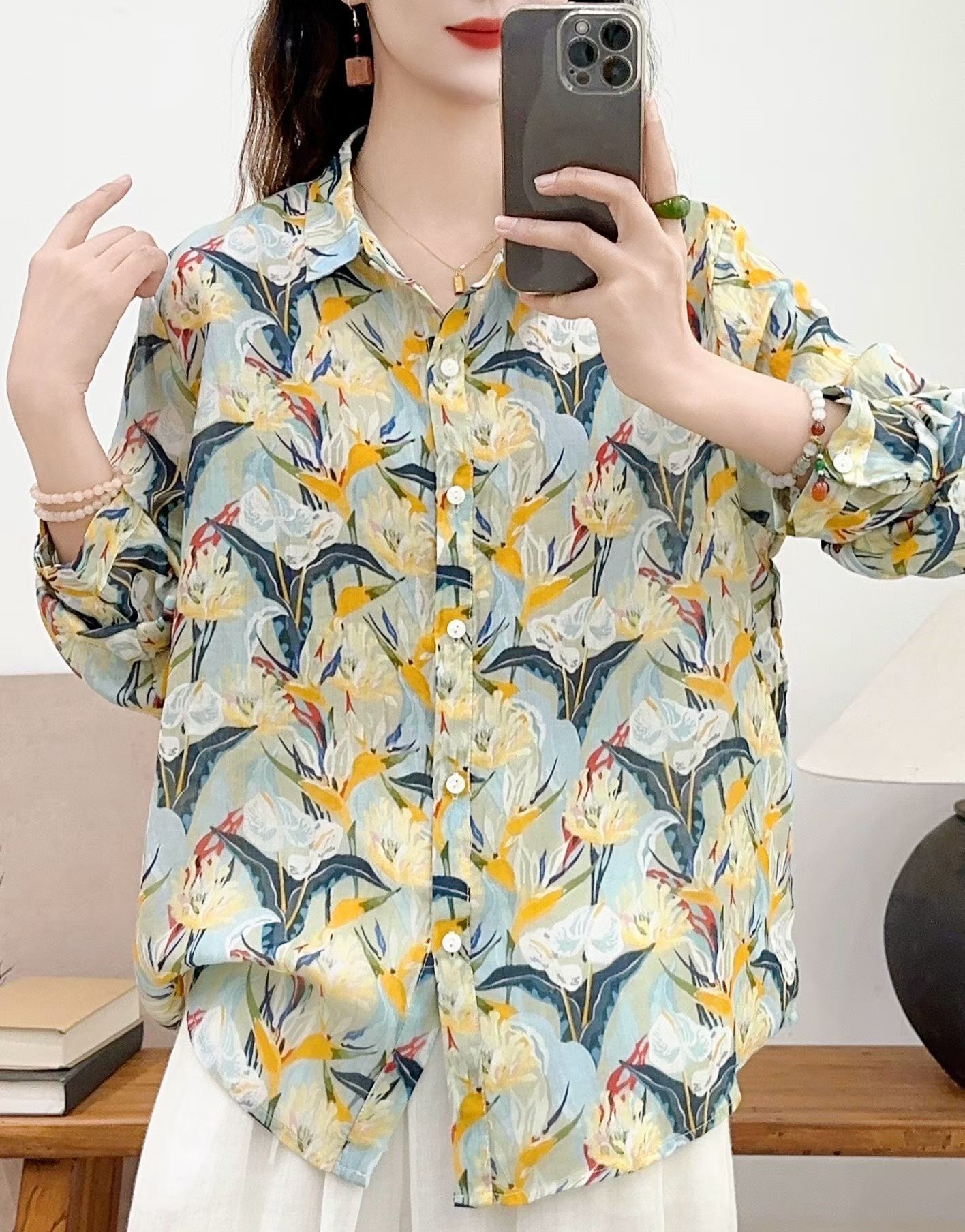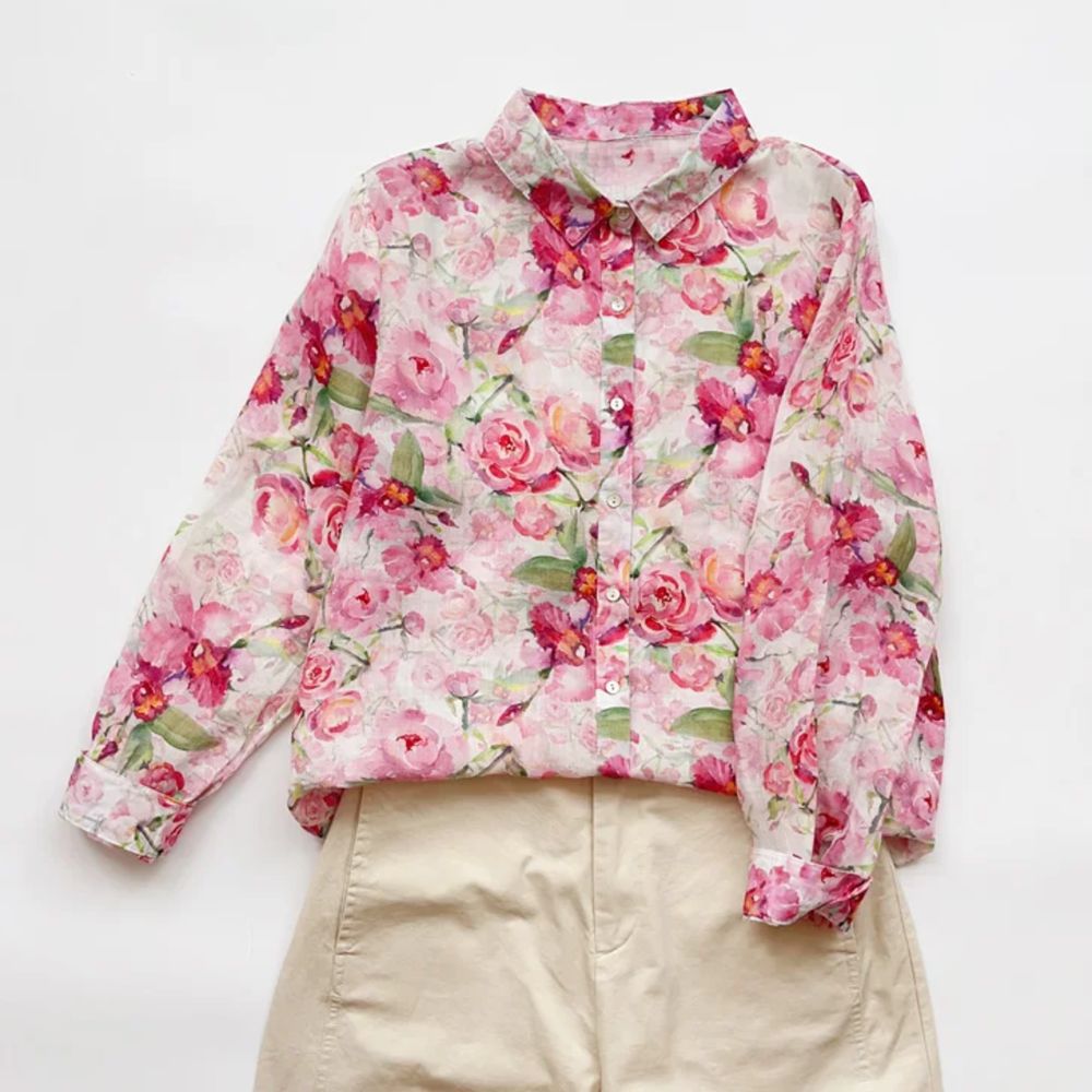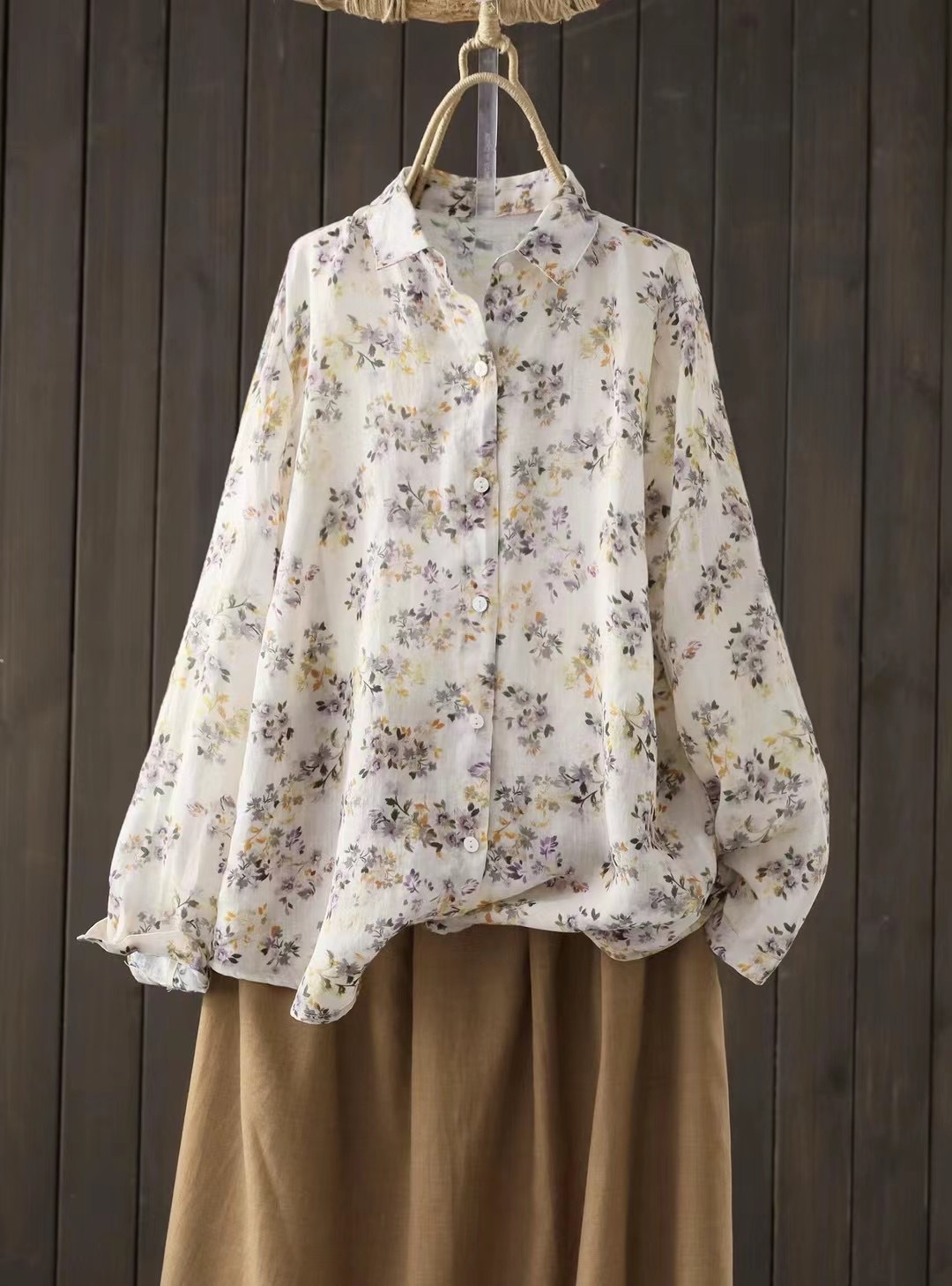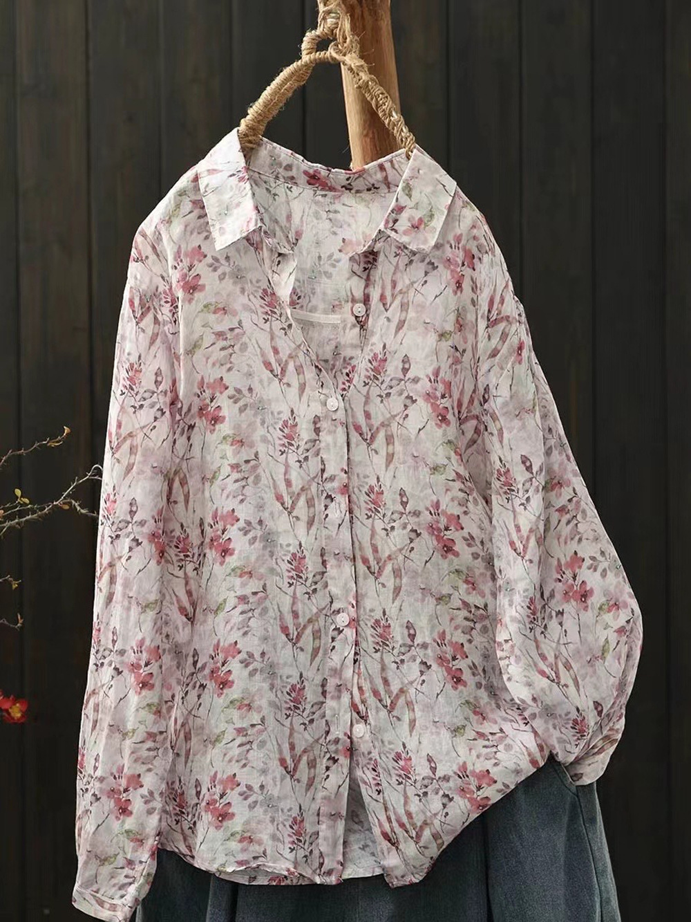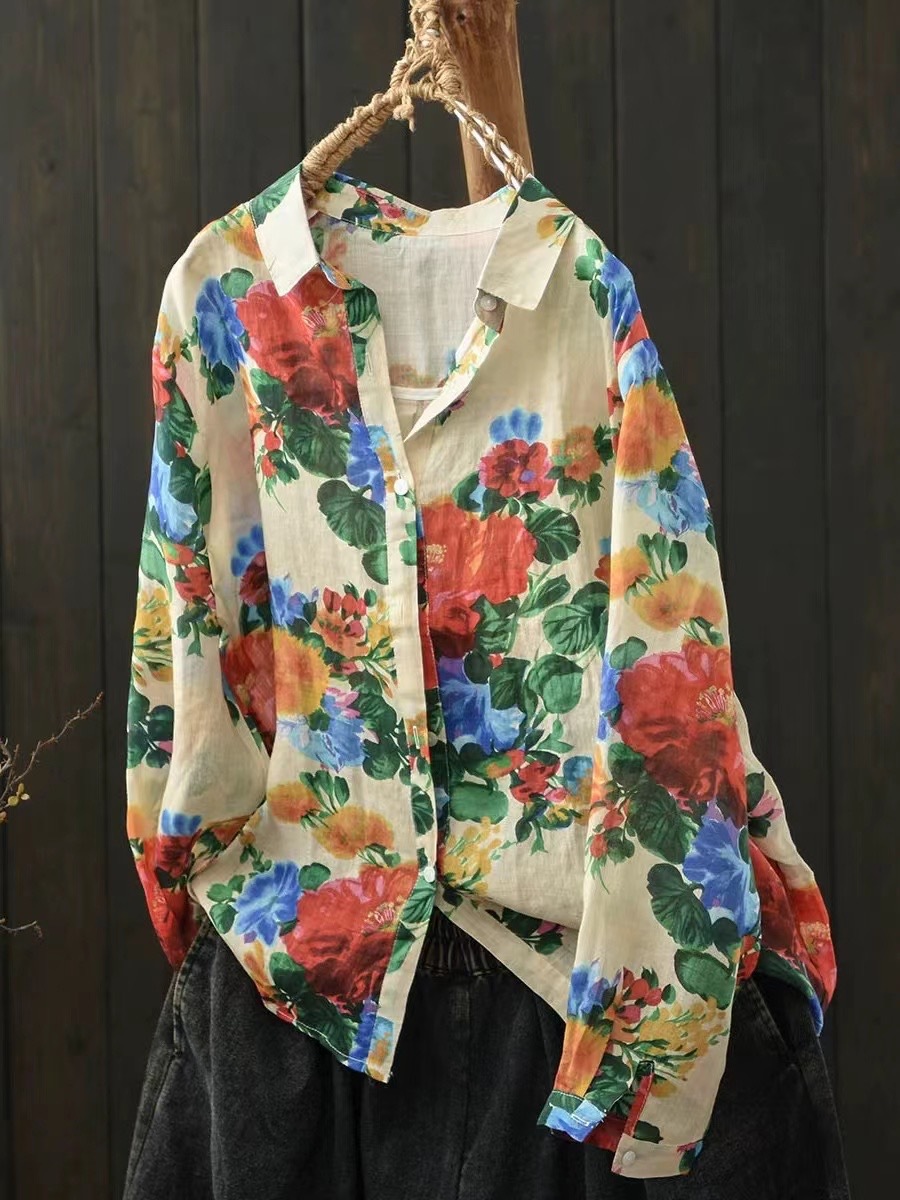 모리 소녀 예술적 라미 인쇄 셔츠 긴팔 여성용 옷깃 꽃 탑베이스 셔츠 라미 셔츠 탑 여성 의류스토어 가기
