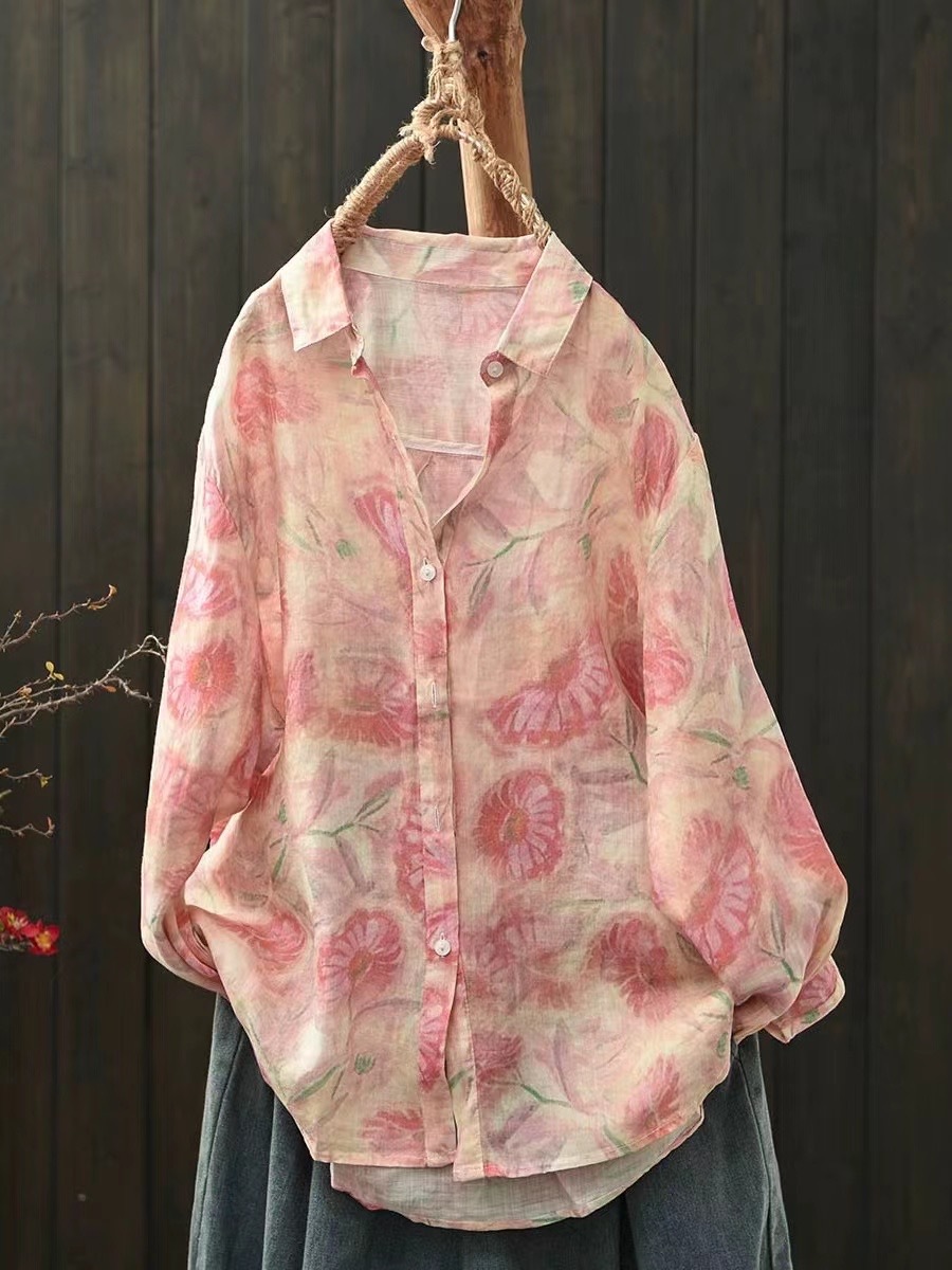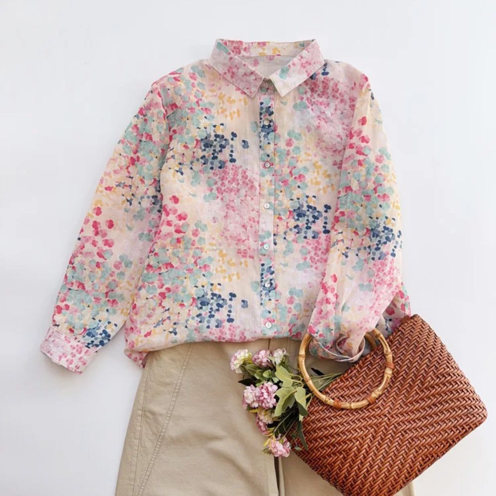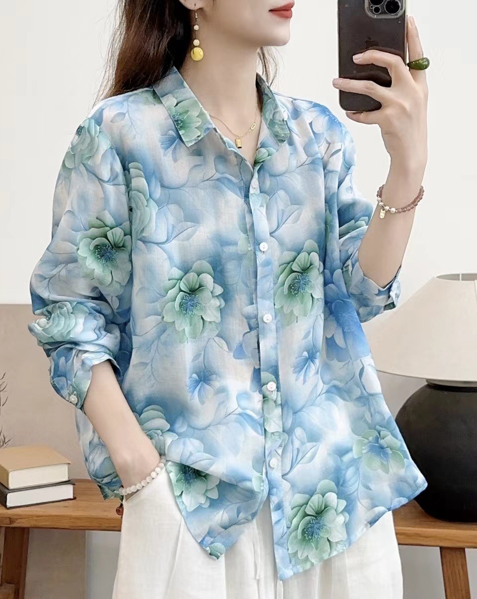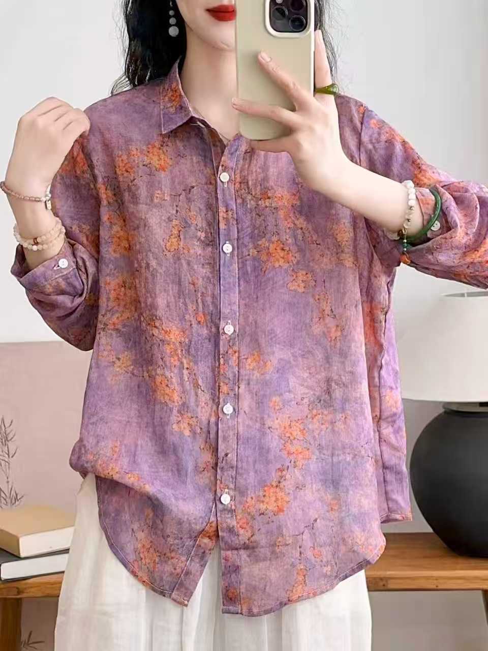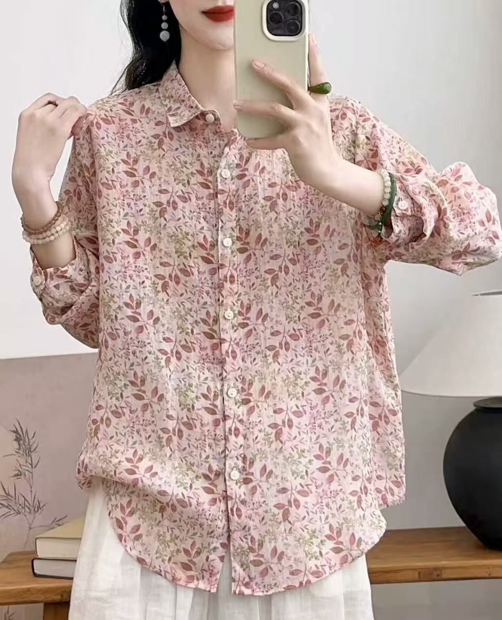 모리 소녀 예술적 라미 인쇄 셔츠 긴팔 여성용 옷깃 꽃 탑베이스 셔츠 라미 셔츠 탑 여성 의류스토어 가기