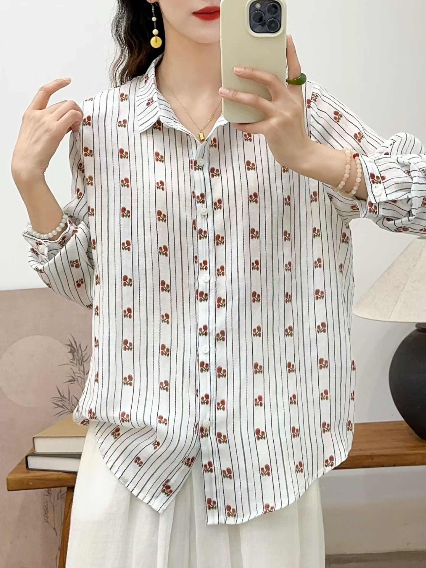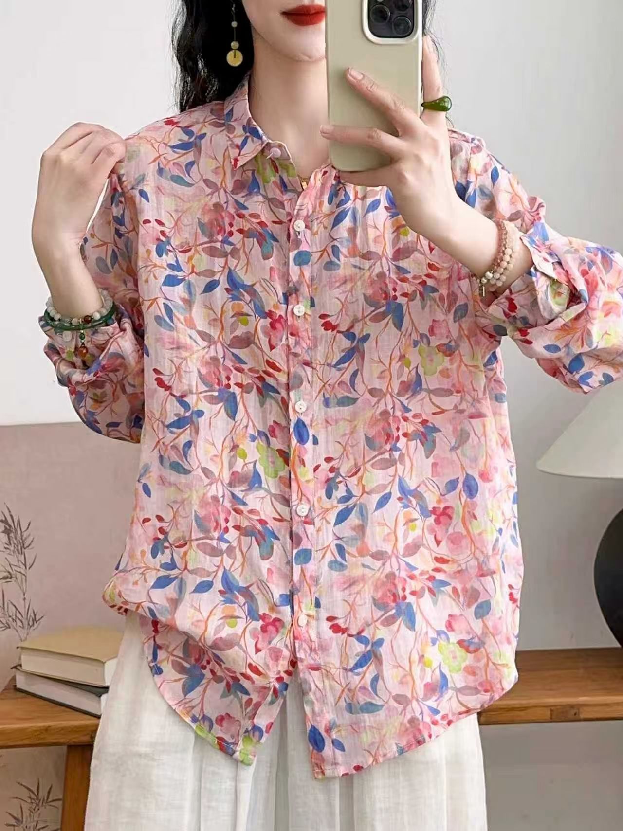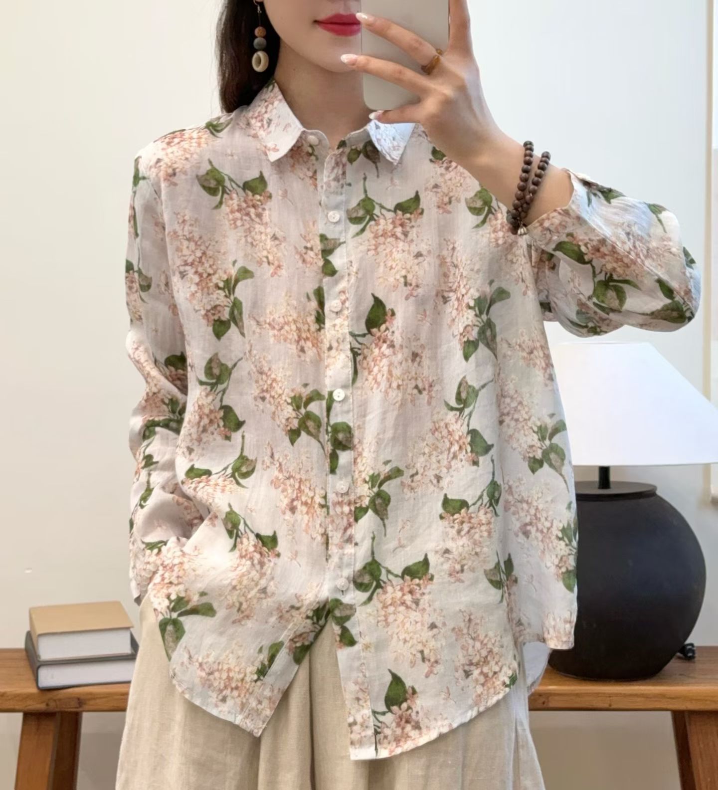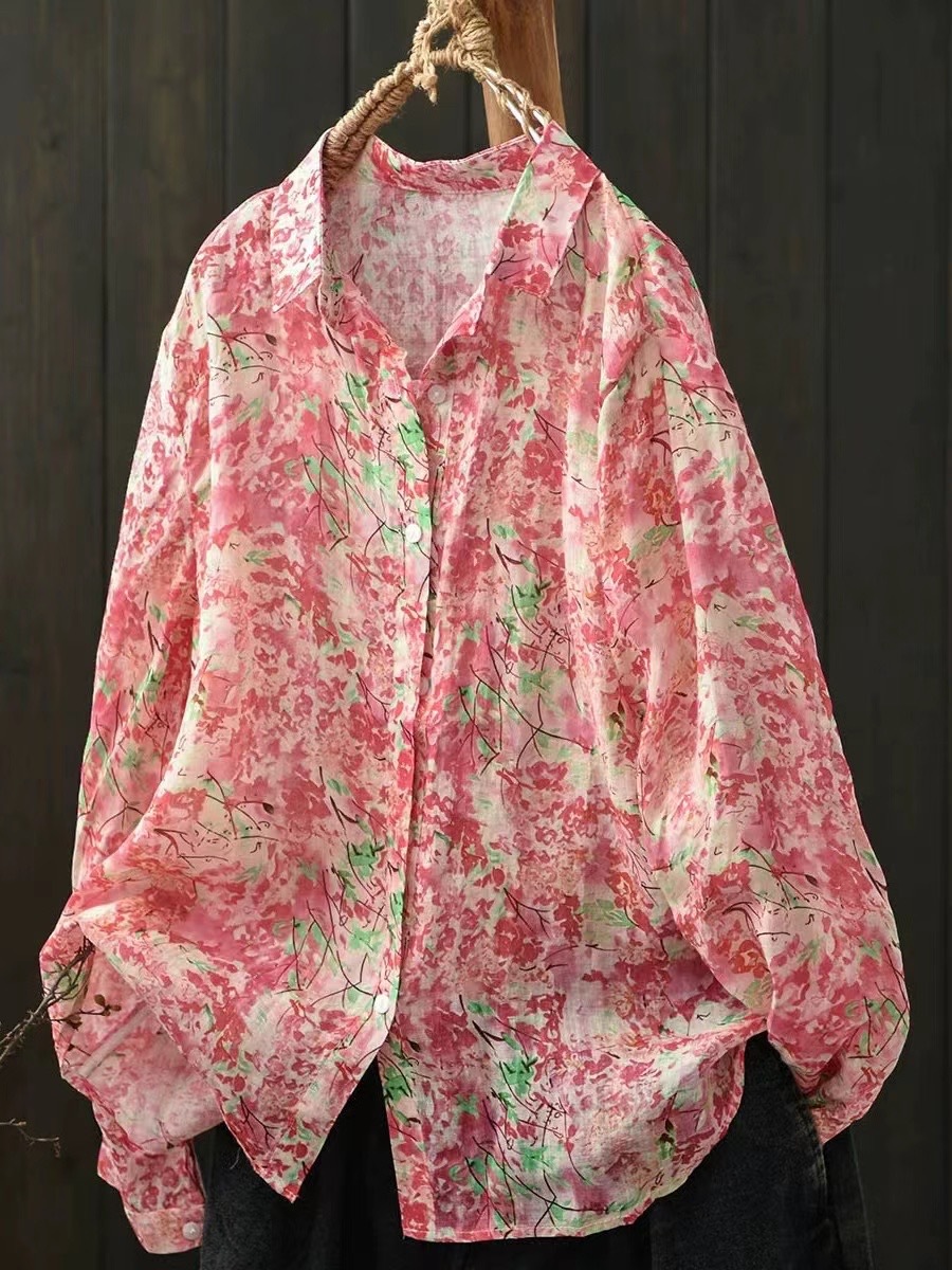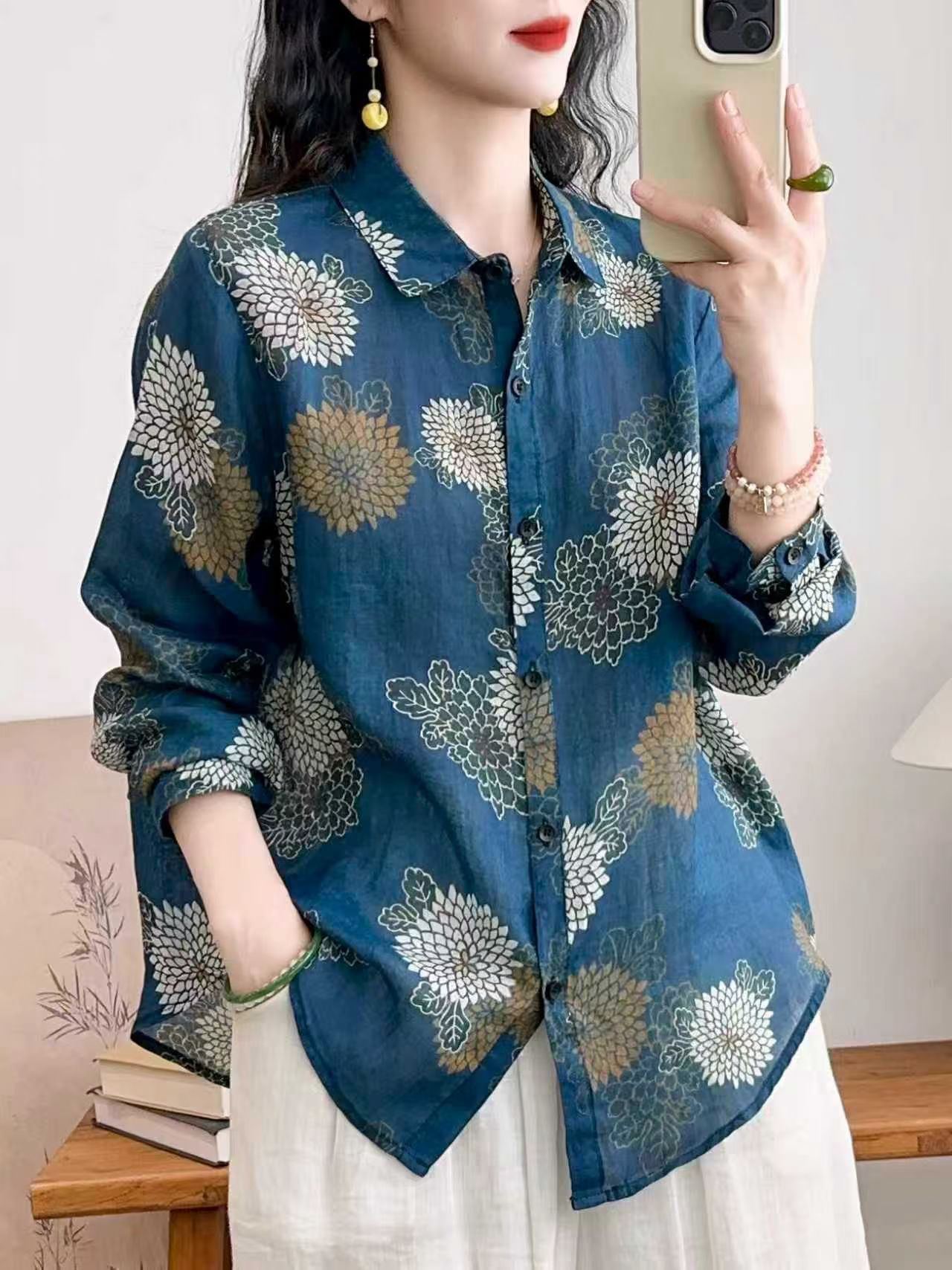 모리 소녀 예술적 라미 인쇄 셔츠 긴팔 여성용 옷깃 꽃 탑베이스 셔츠 라미 셔츠 탑 여성 의류스토어 가기