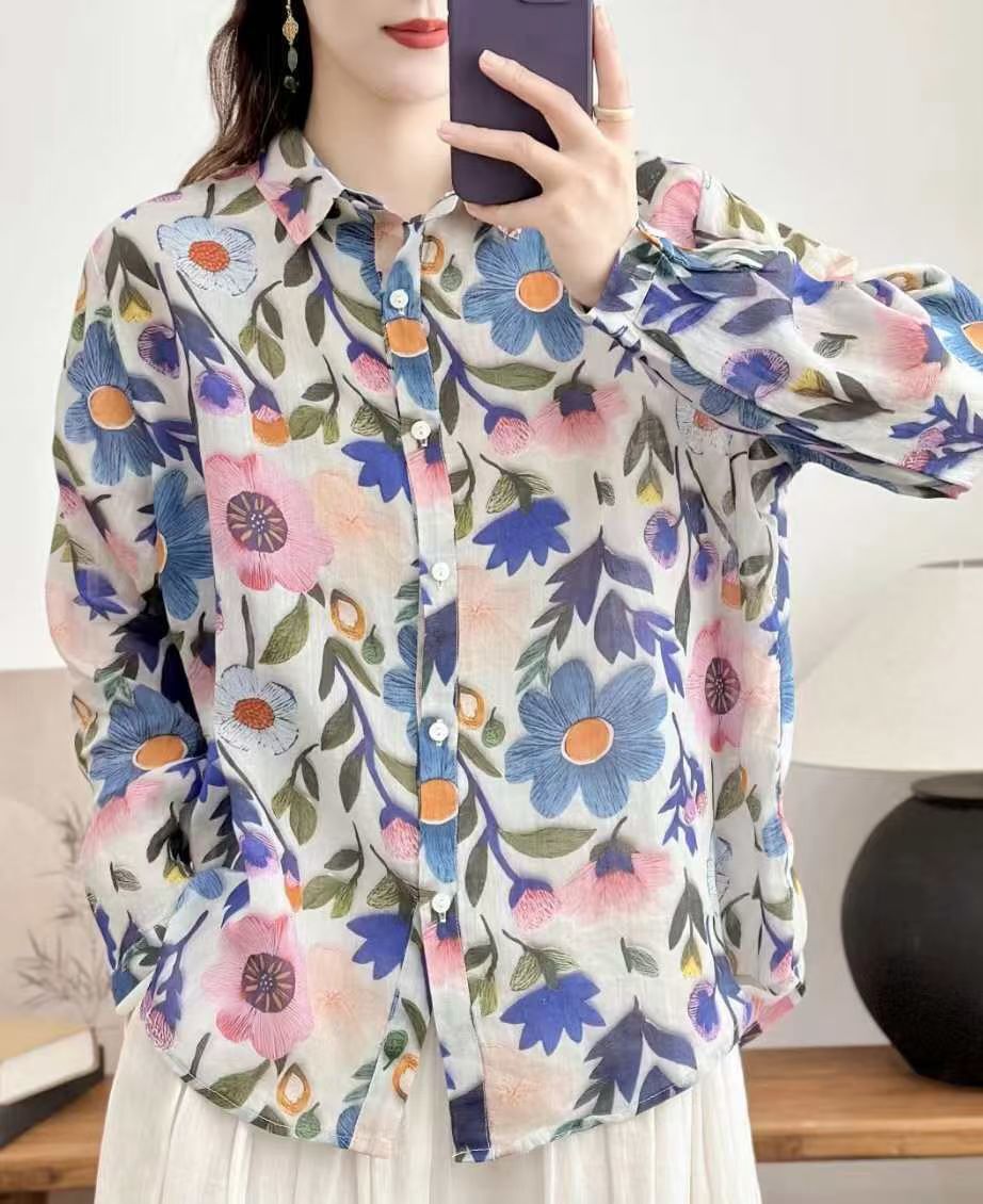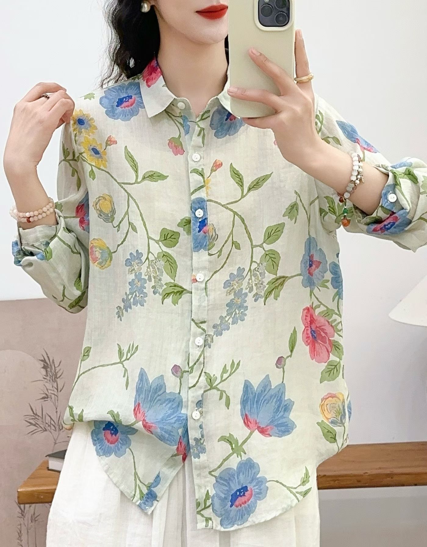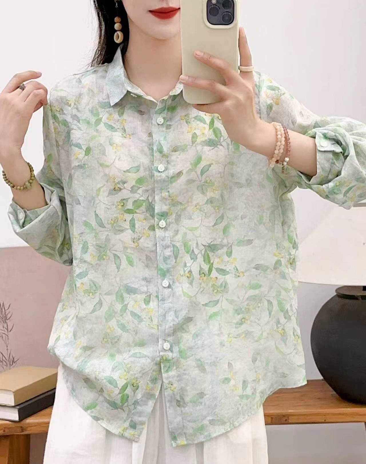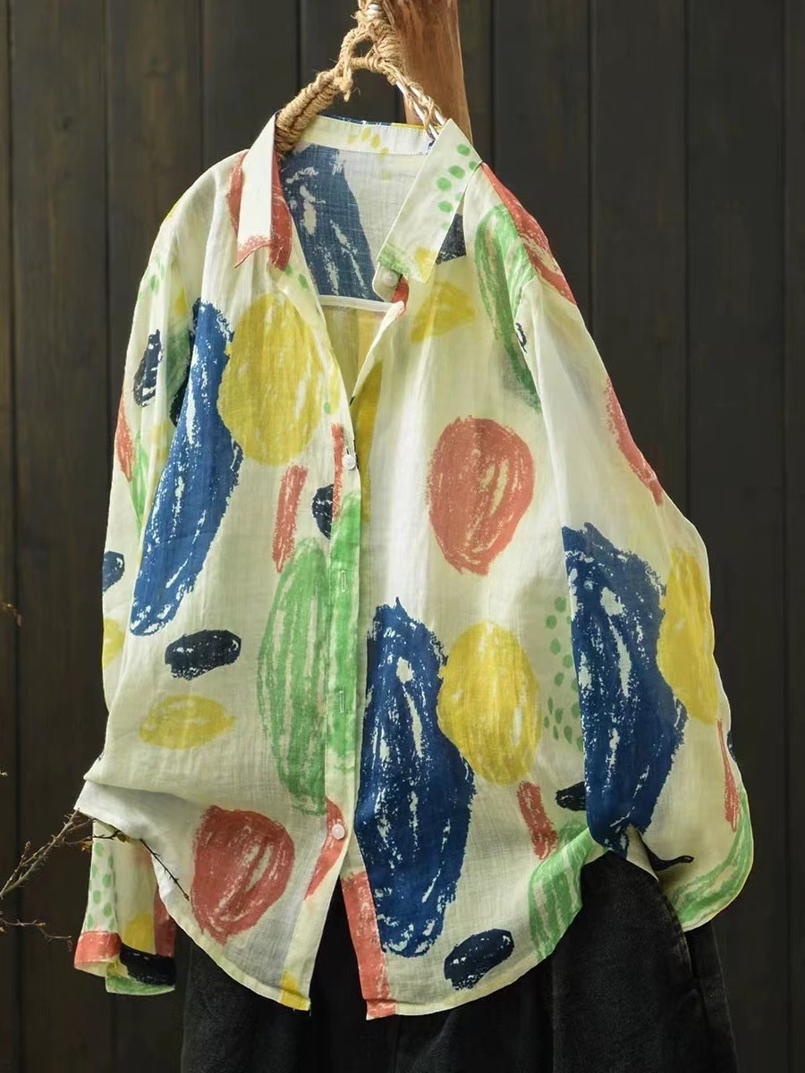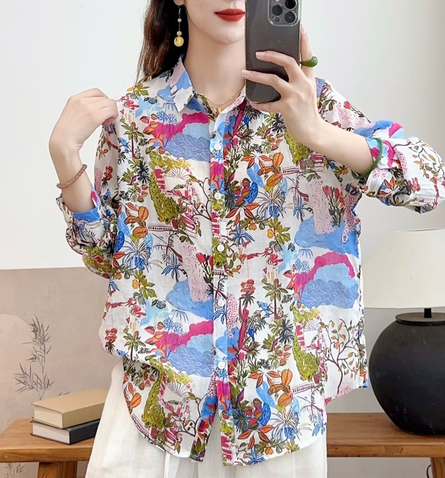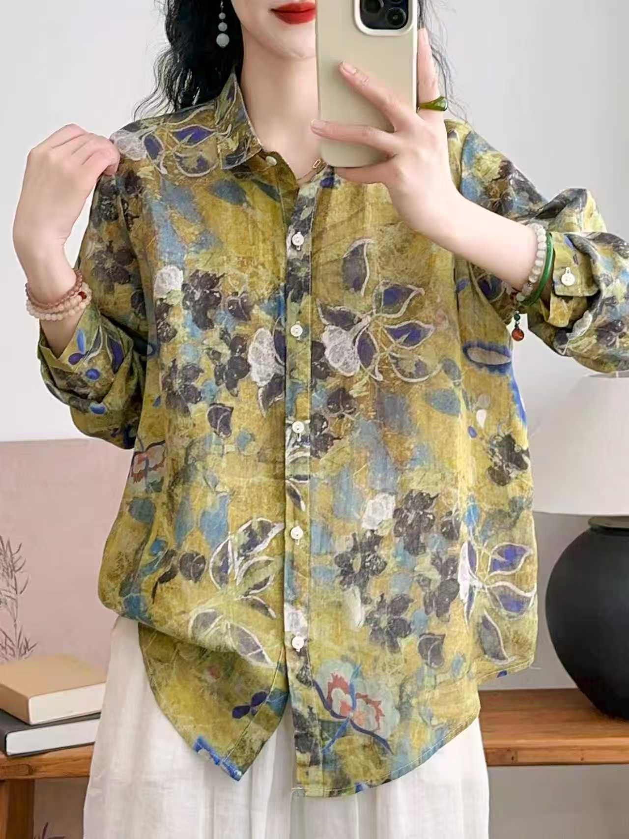 모리 소녀 예술적 라미 인쇄 셔츠 긴팔 여성용 옷깃 꽃 탑베이스 셔츠 라미 셔츠 탑 여성 의류스토어 가기