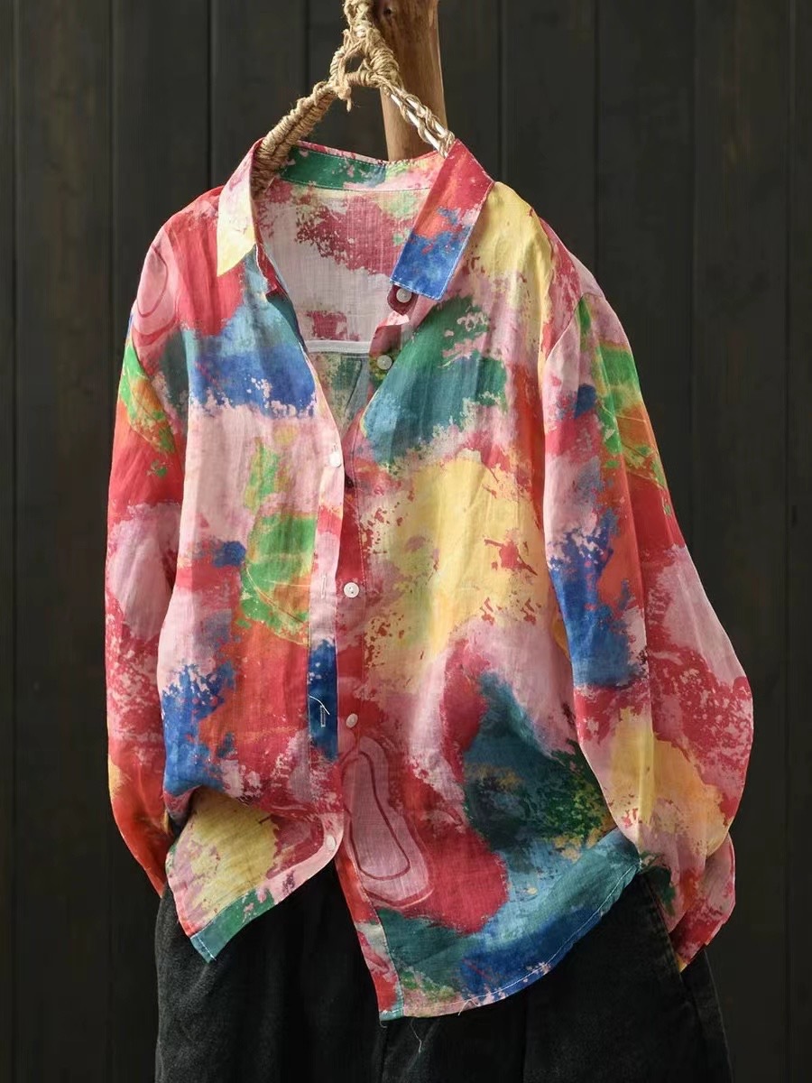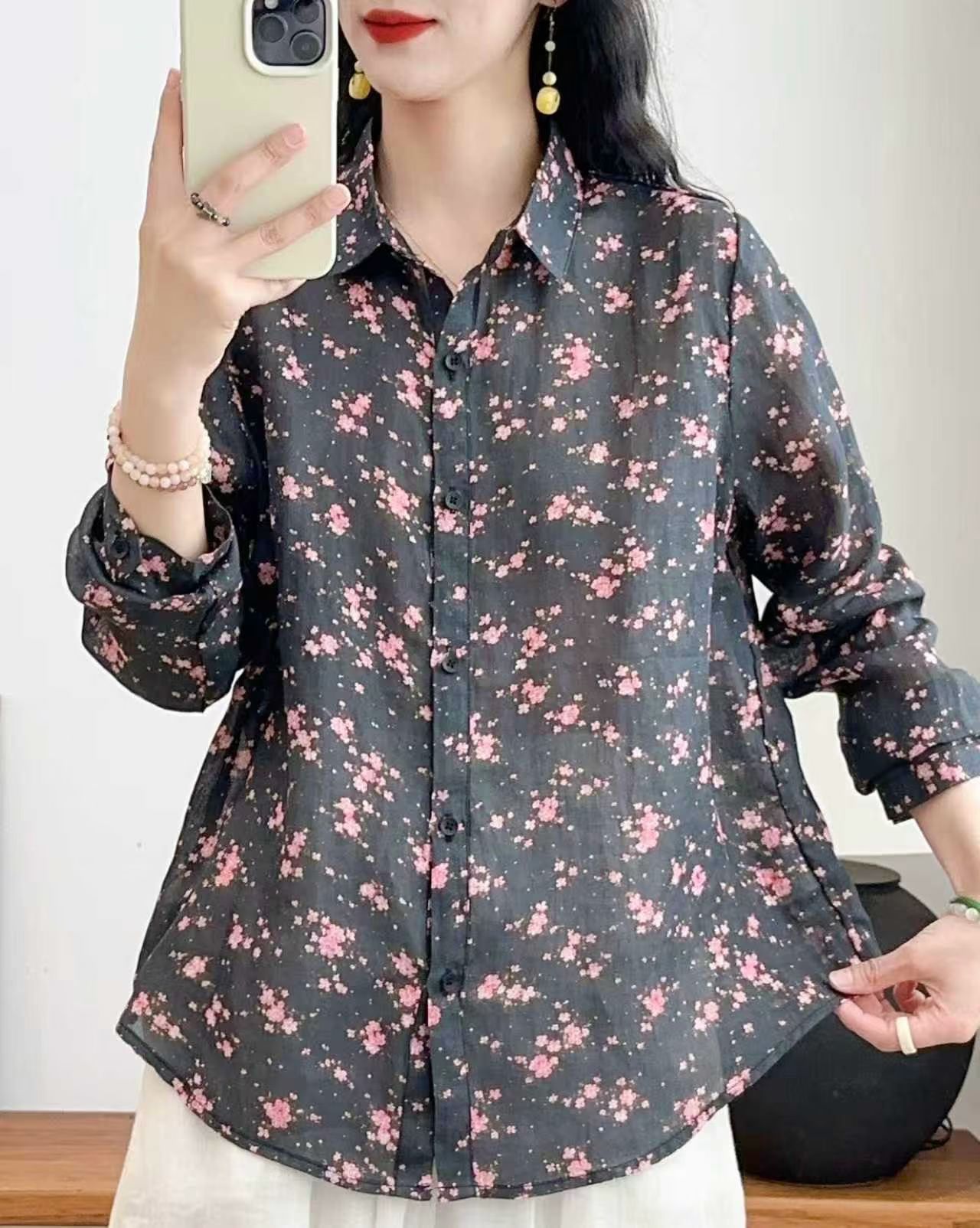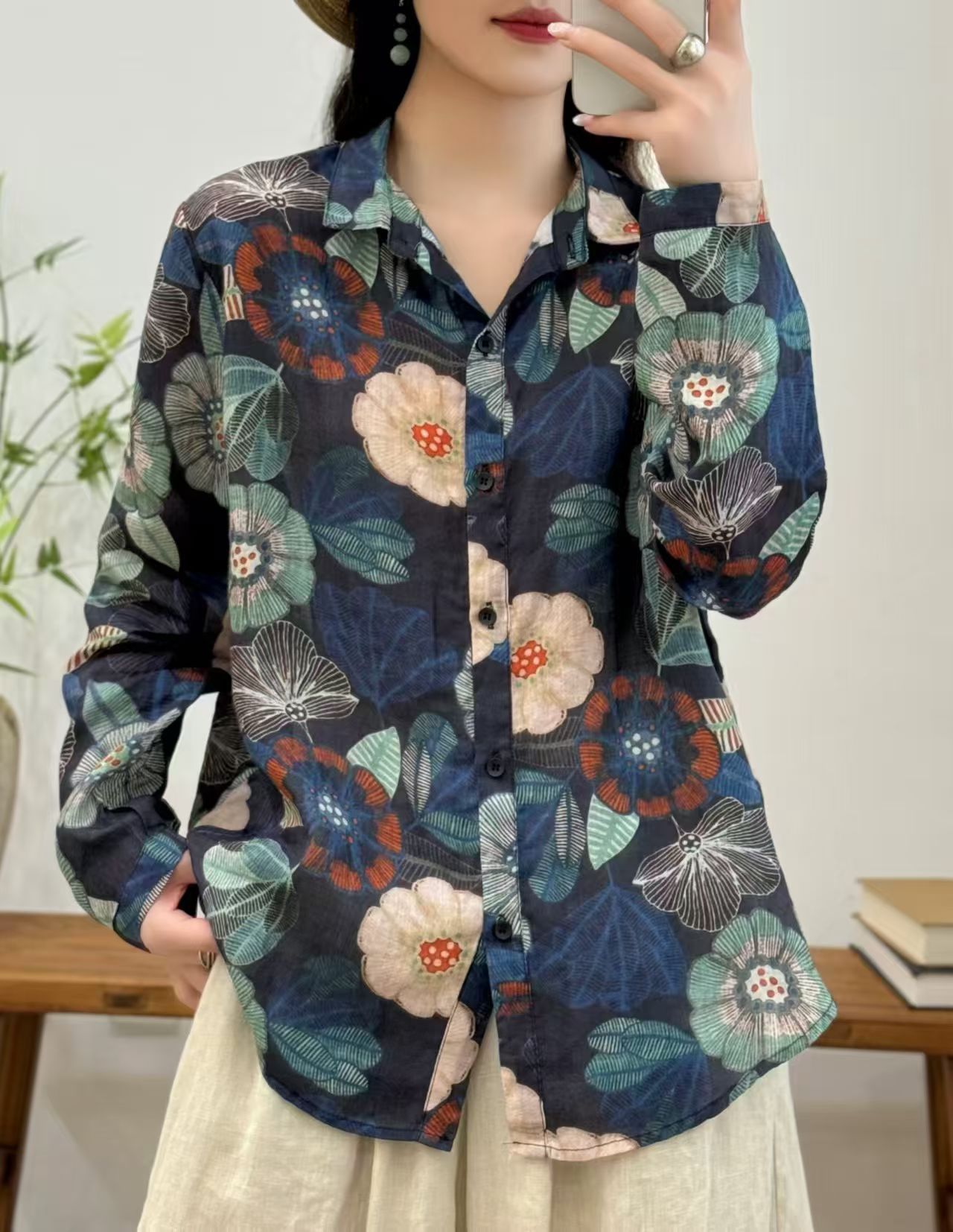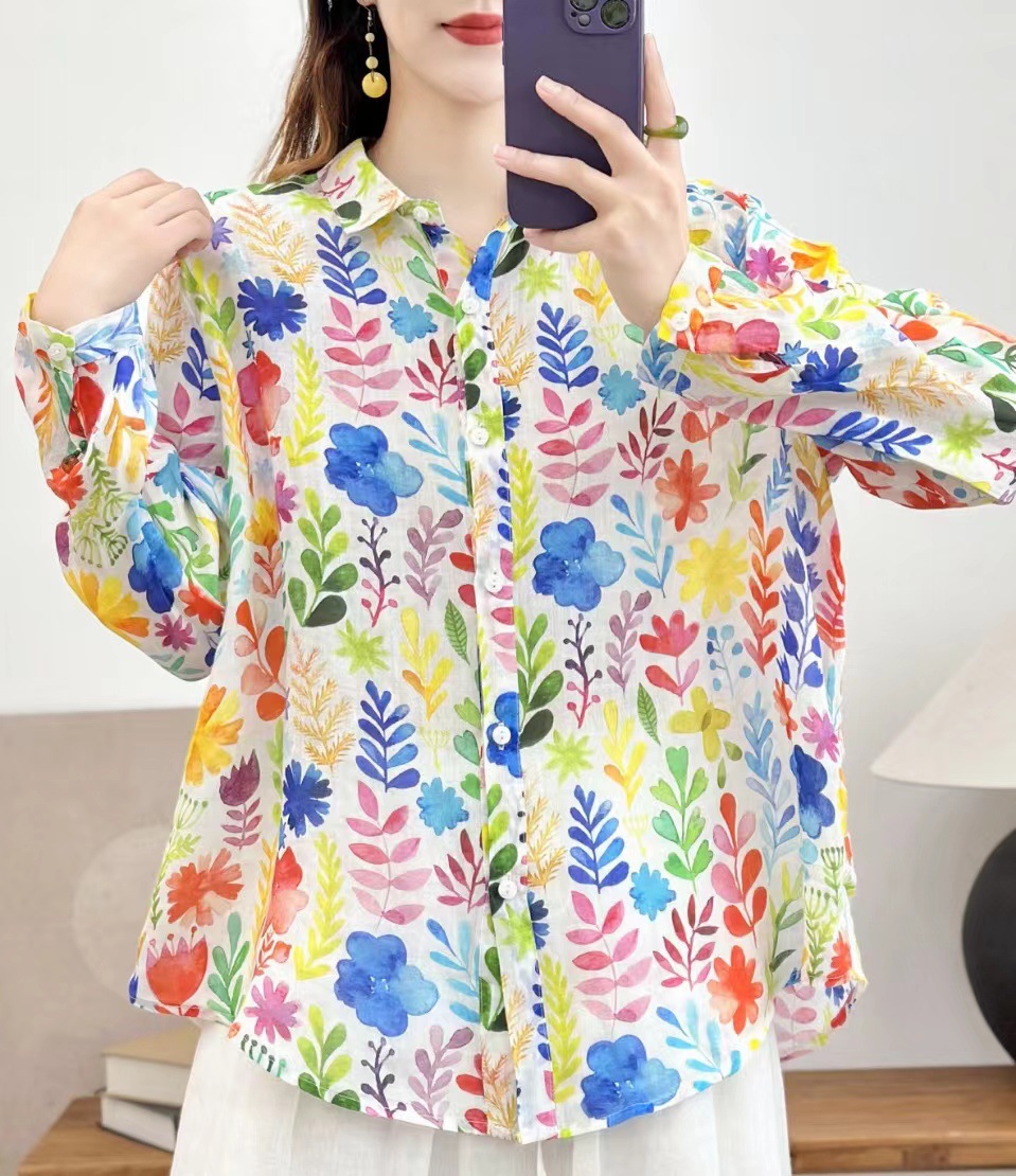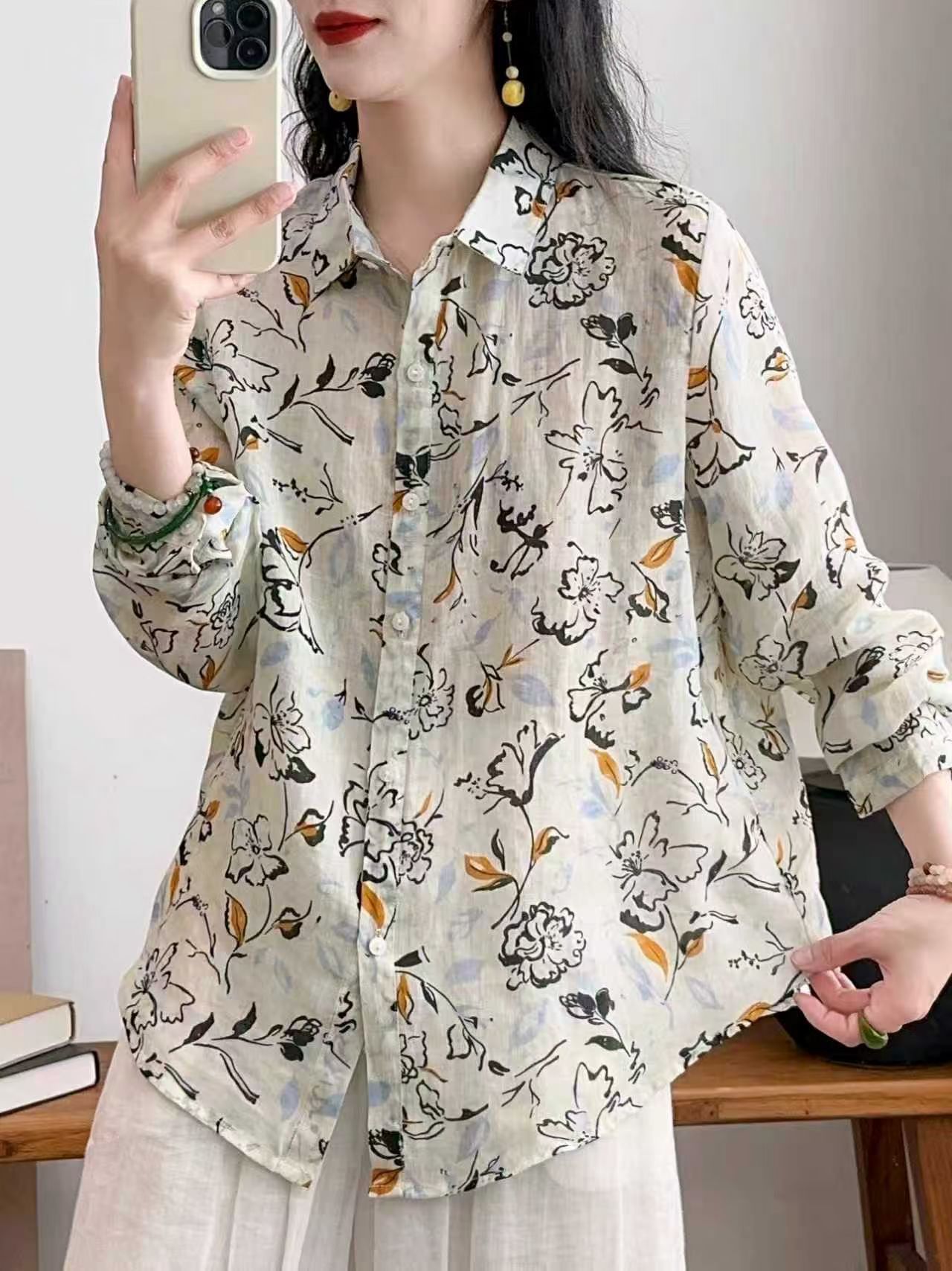 모리 소녀 예술적 라미 인쇄 셔츠 긴팔 여성용 옷깃 꽃 탑베이스 셔츠 라미 셔츠 탑 여성 의류스토어 가기