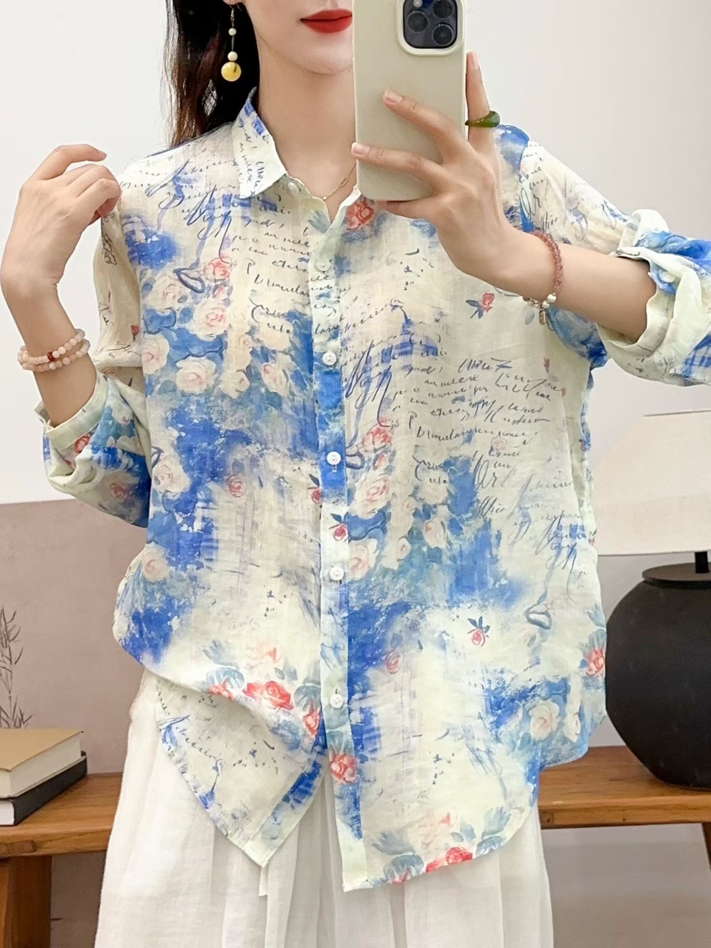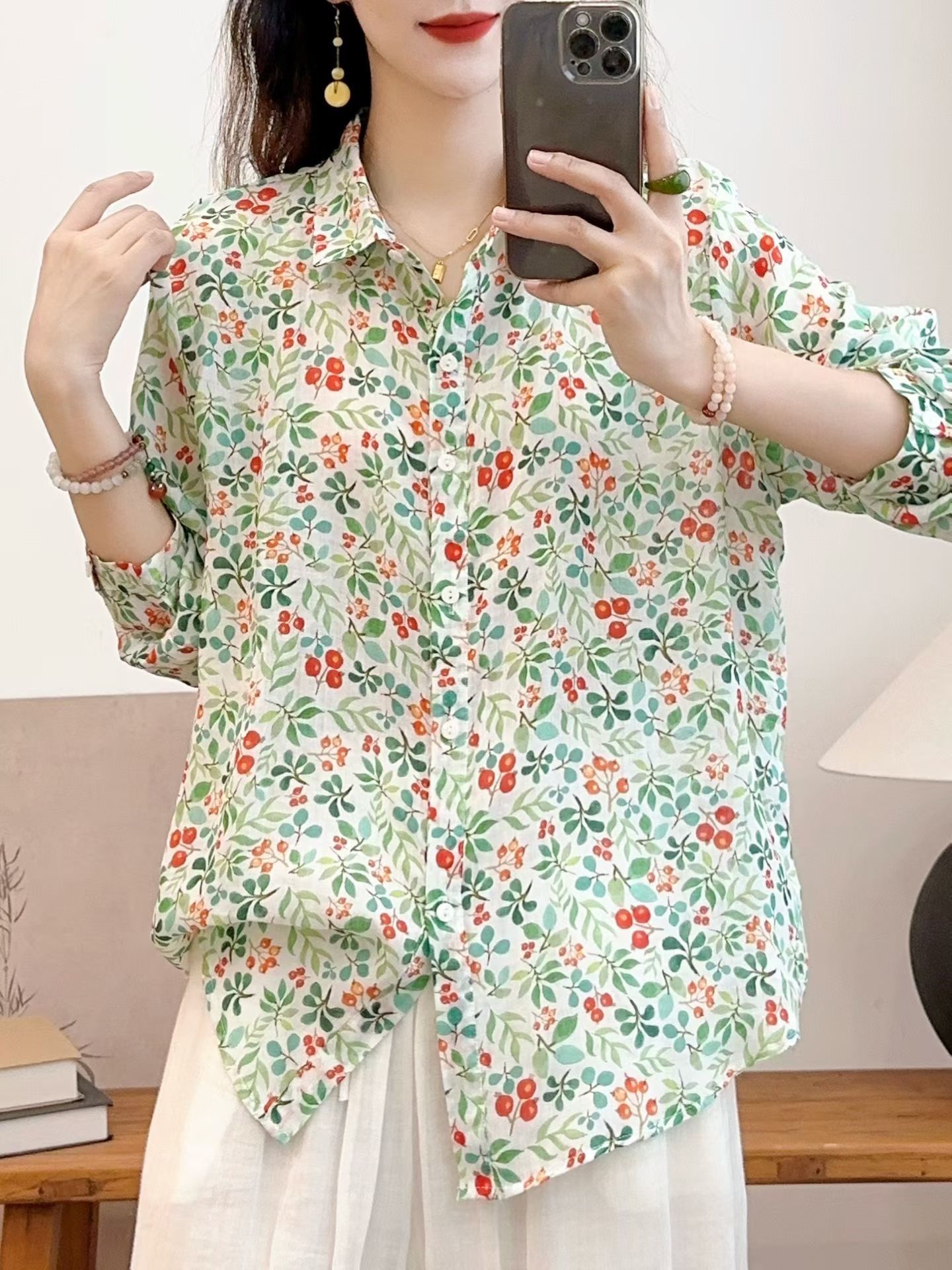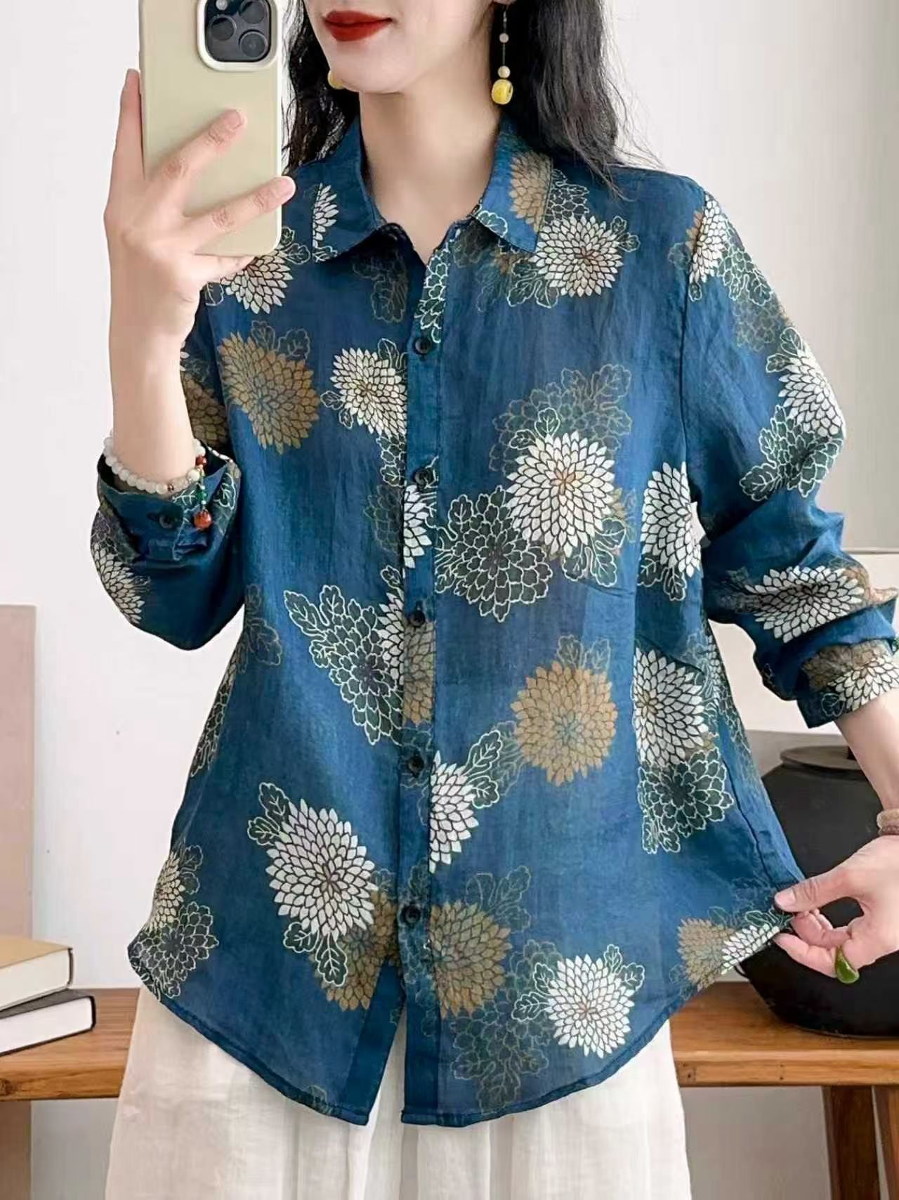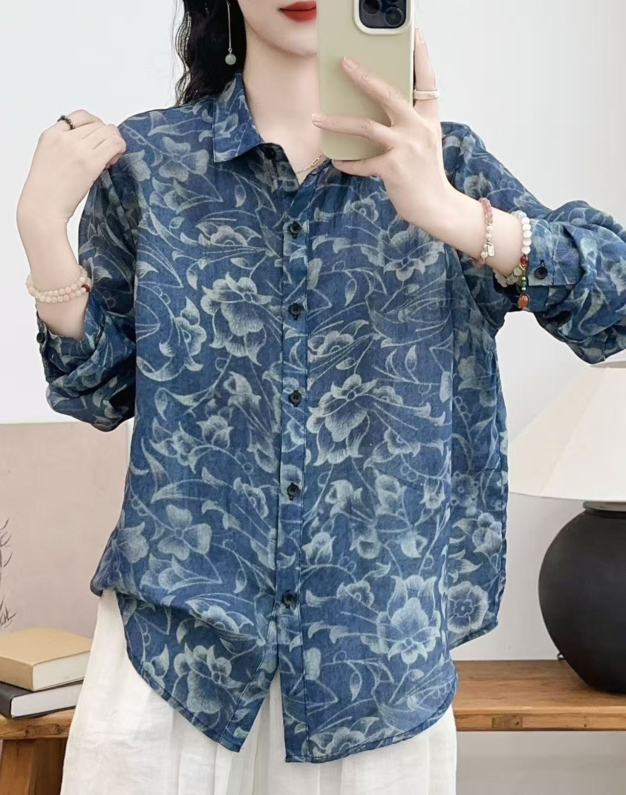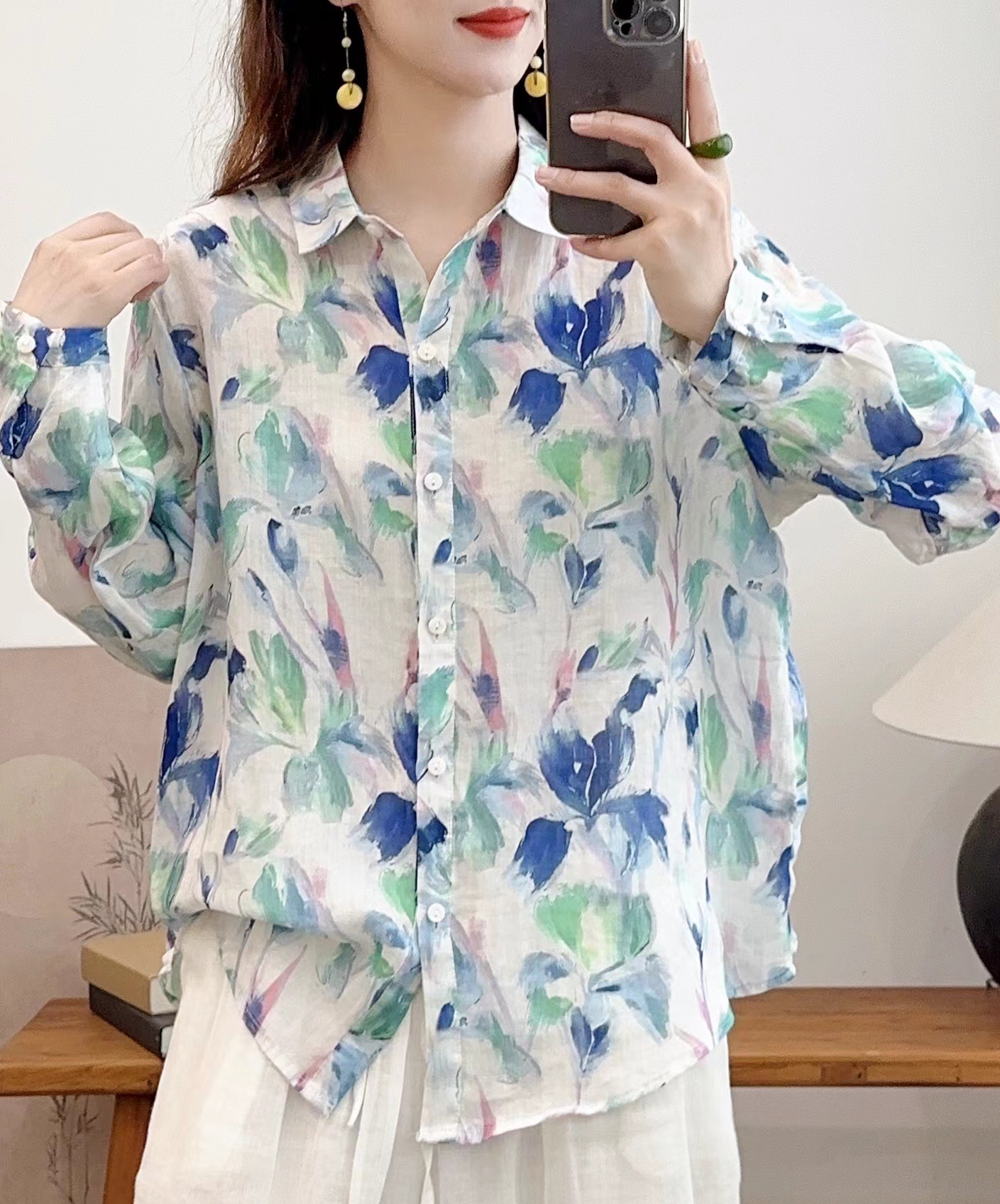 모리 소녀 예술적 라미 인쇄 셔츠 긴팔 여성용 옷깃 꽃 탑베이스 셔츠 라미 셔츠 탑 여성 의류스토어 가기