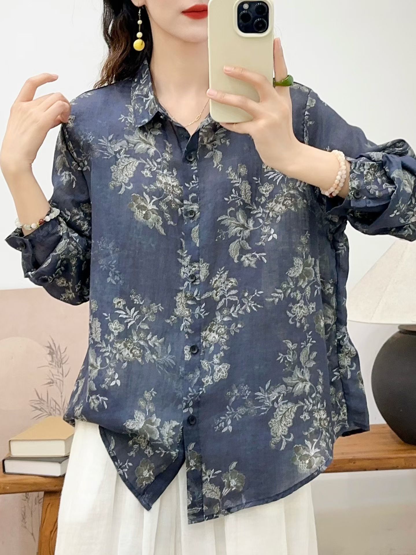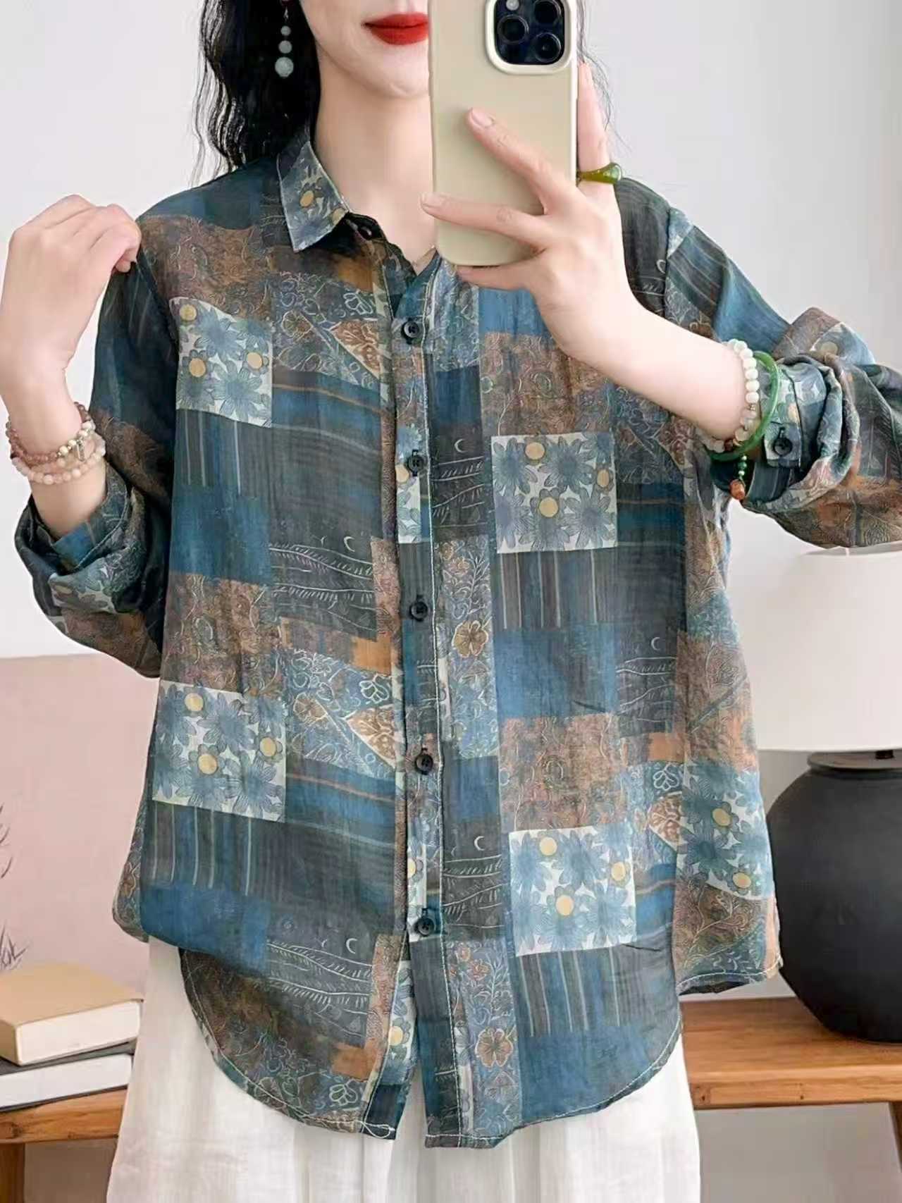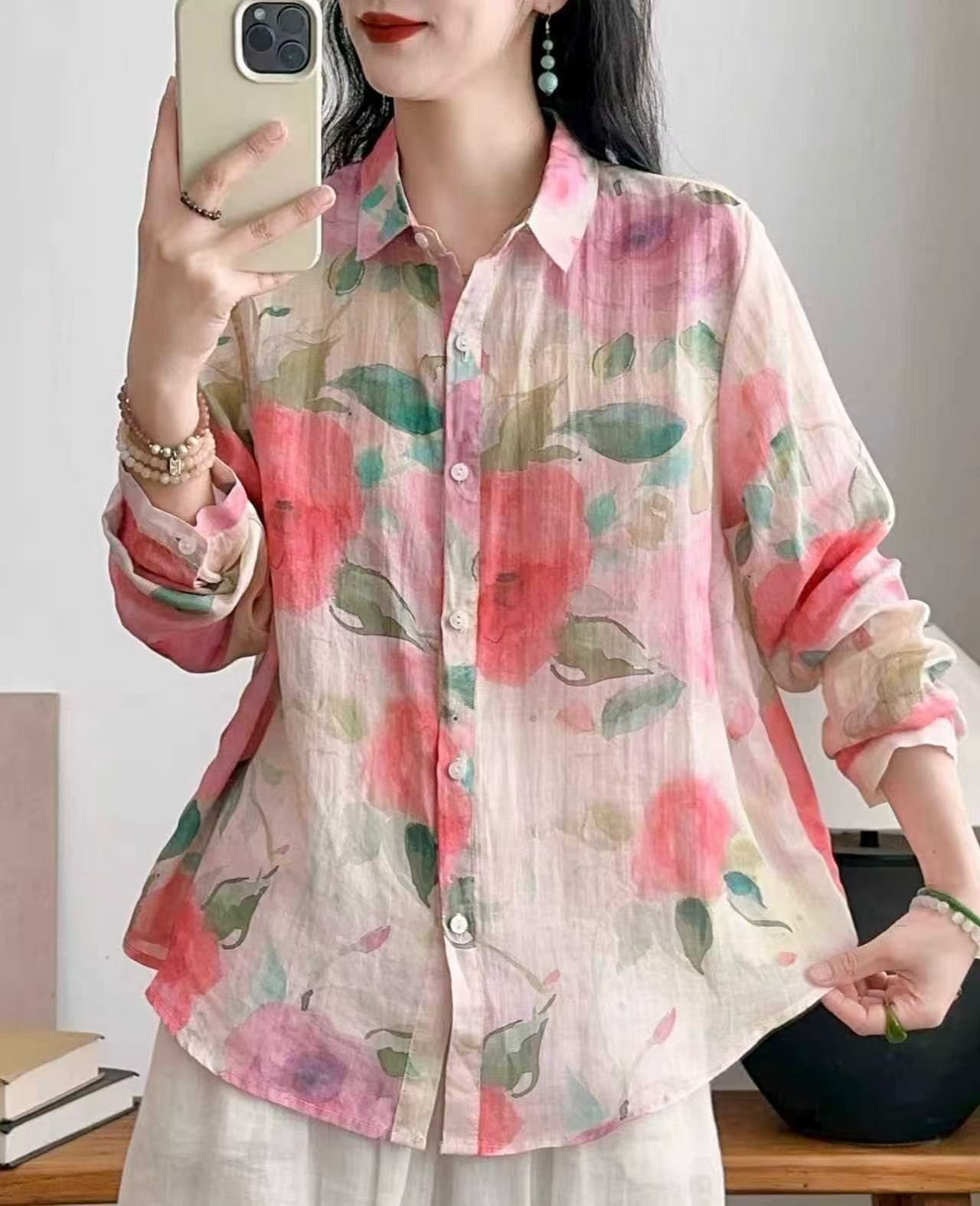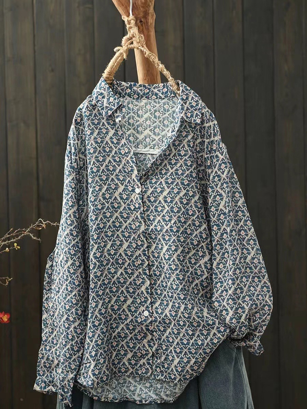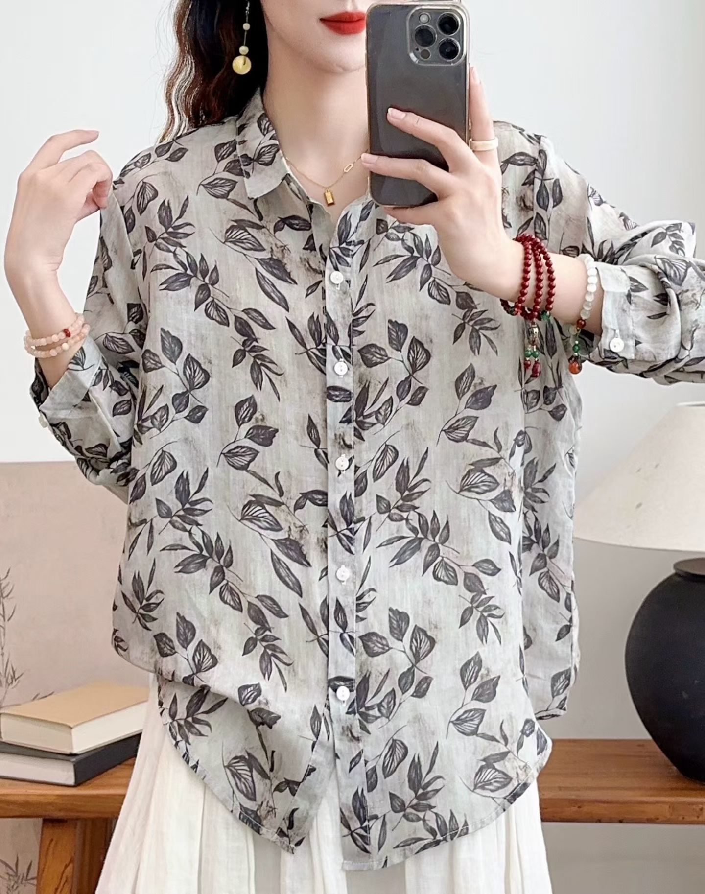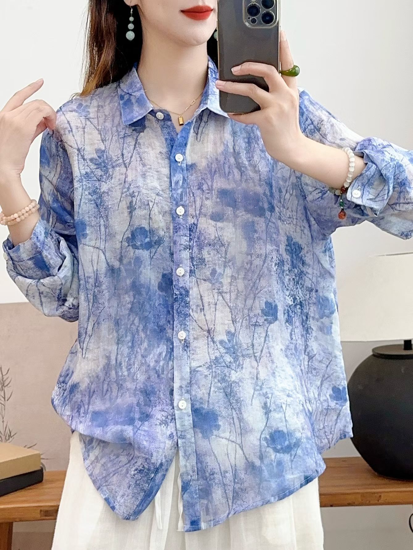 모리 소녀 예술적 라미 인쇄 셔츠 긴팔 여성용 옷깃 꽃 탑베이스 셔츠 라미 셔츠 탑 여성 의류스토어 가기