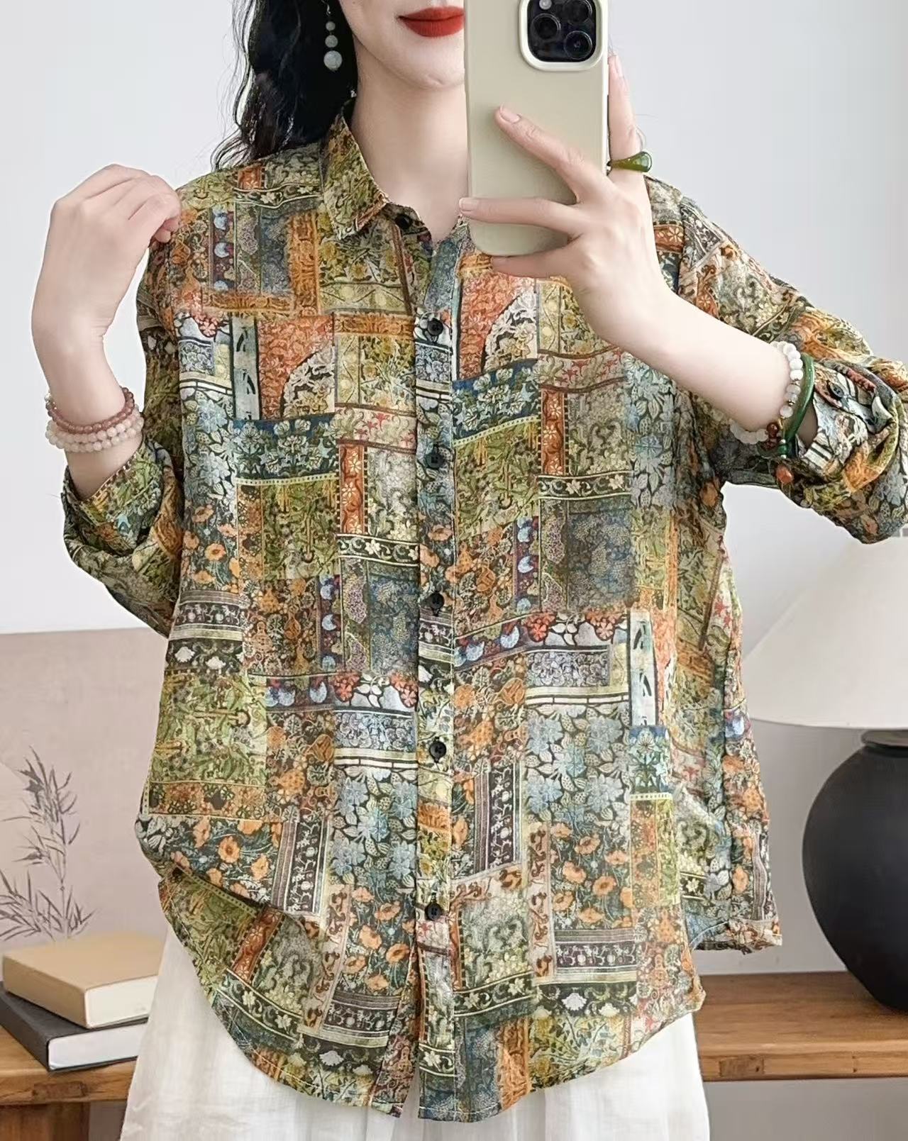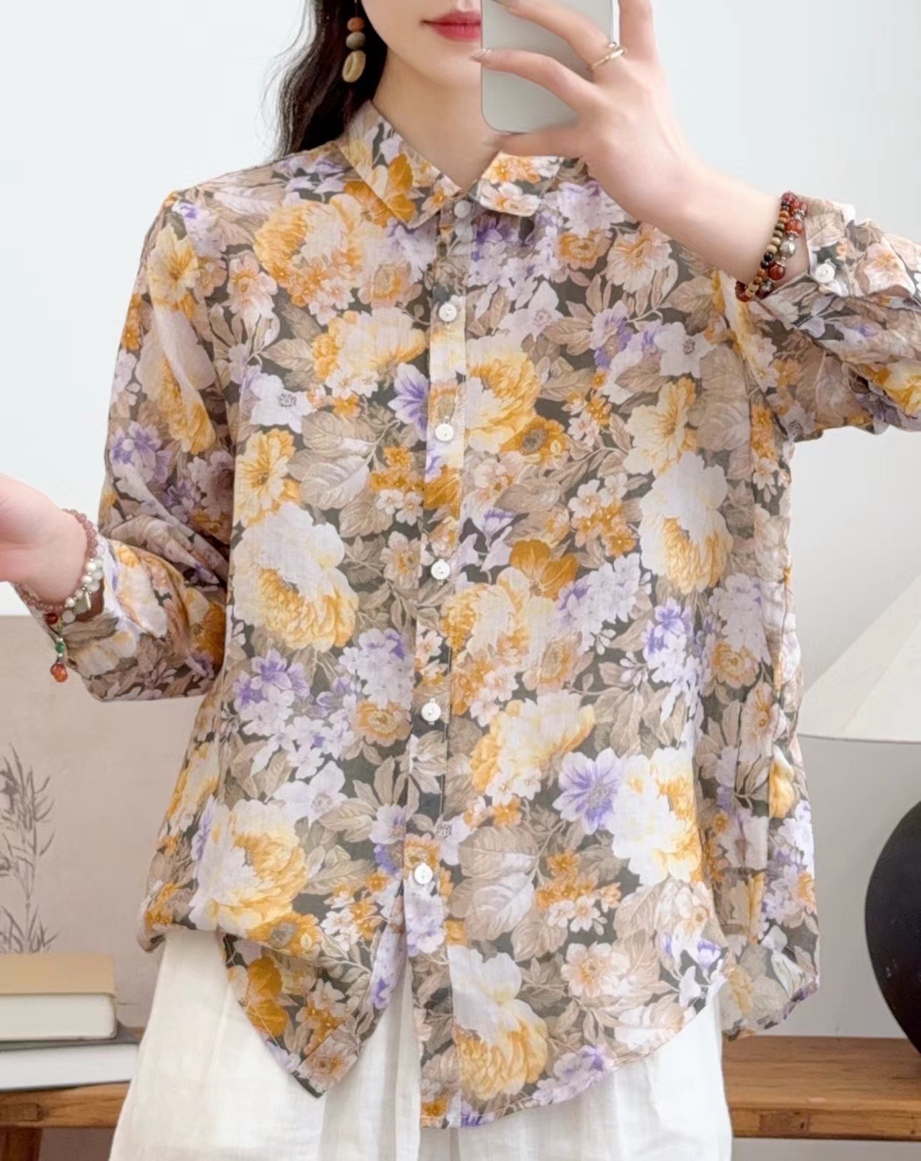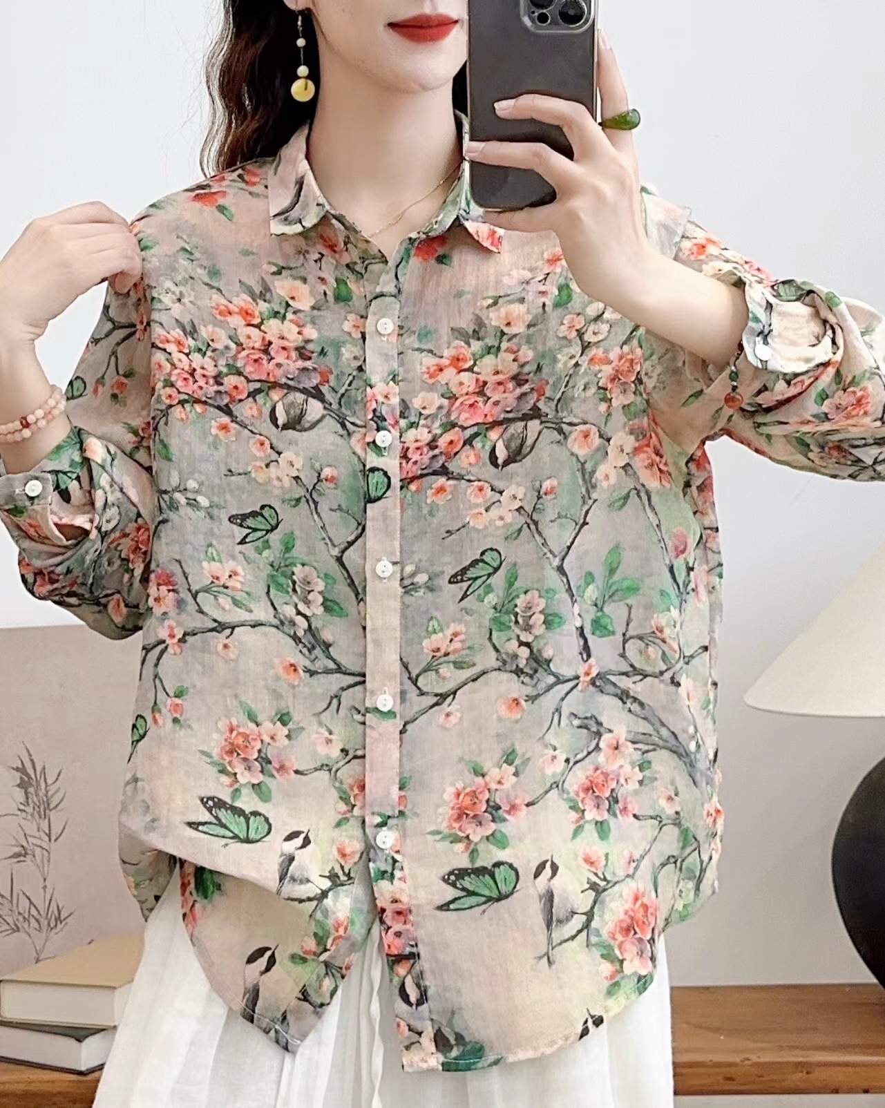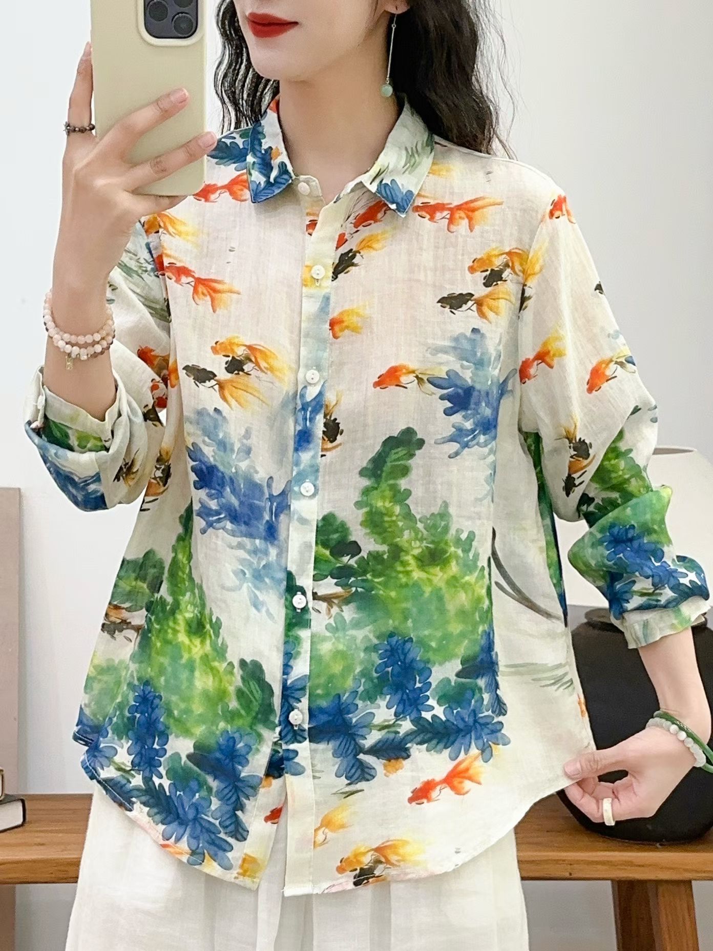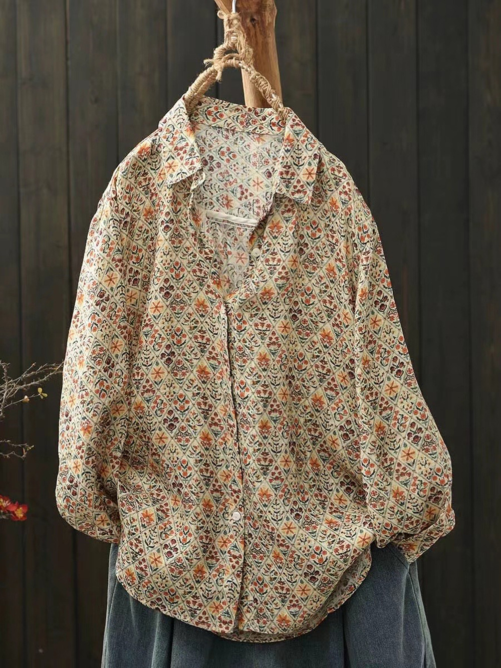 모리 소녀 예술적 라미 인쇄 셔츠 긴팔 여성용 옷깃 꽃 탑베이스 셔츠 라미 셔츠 탑 여성 의류스토어 가기