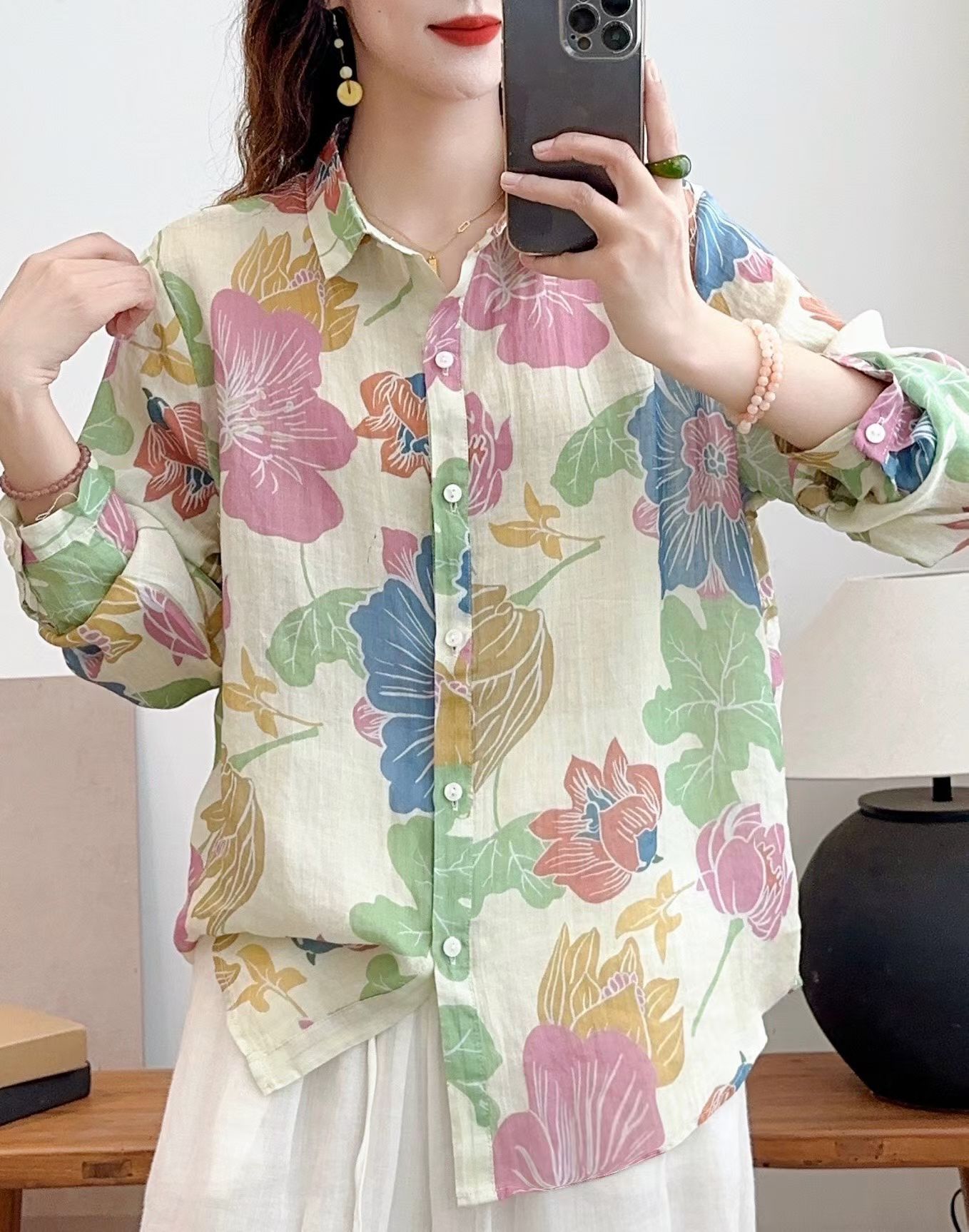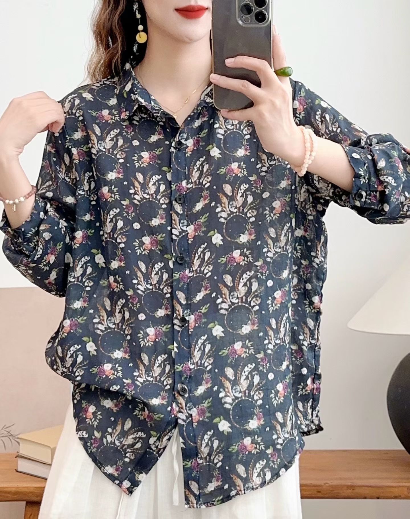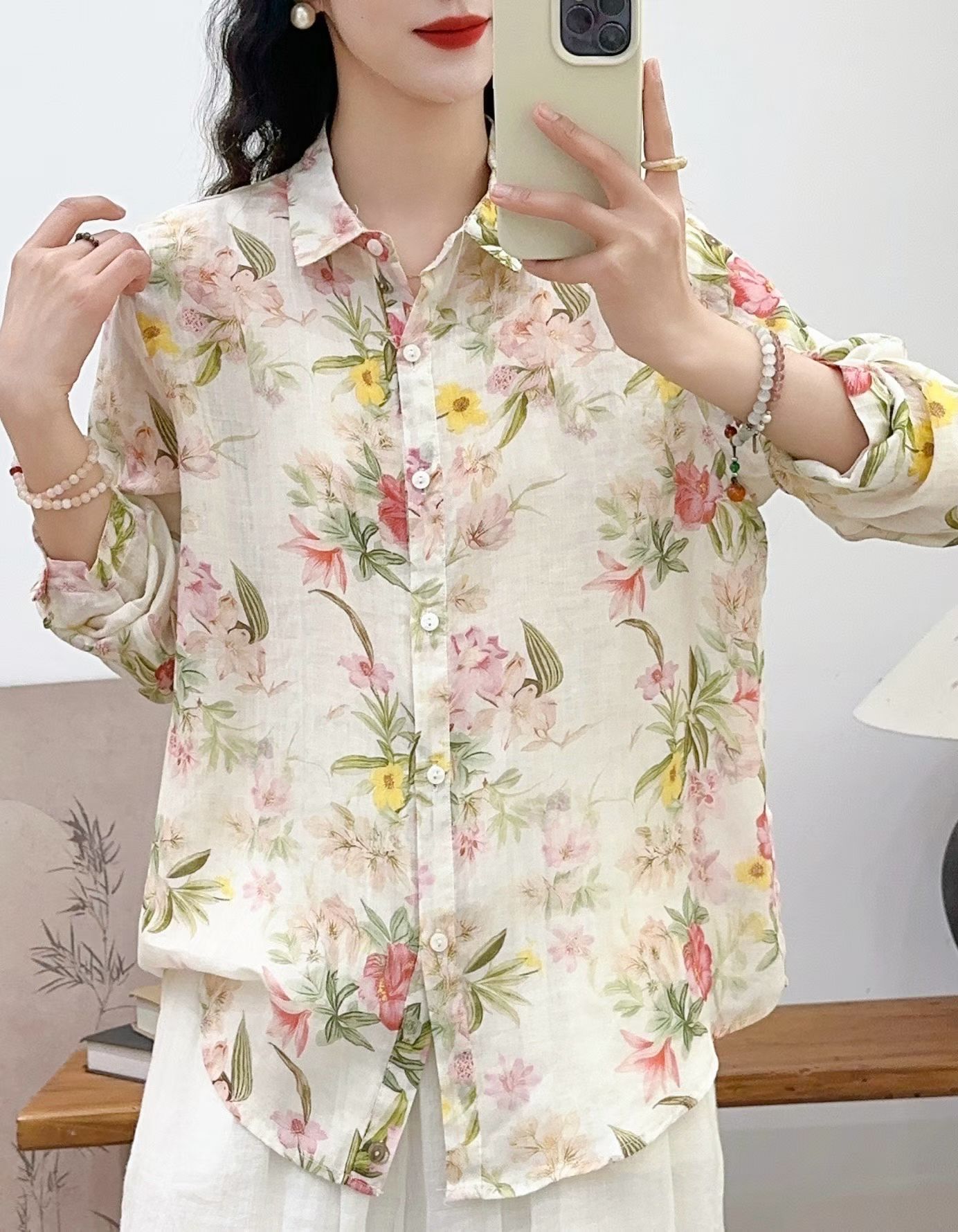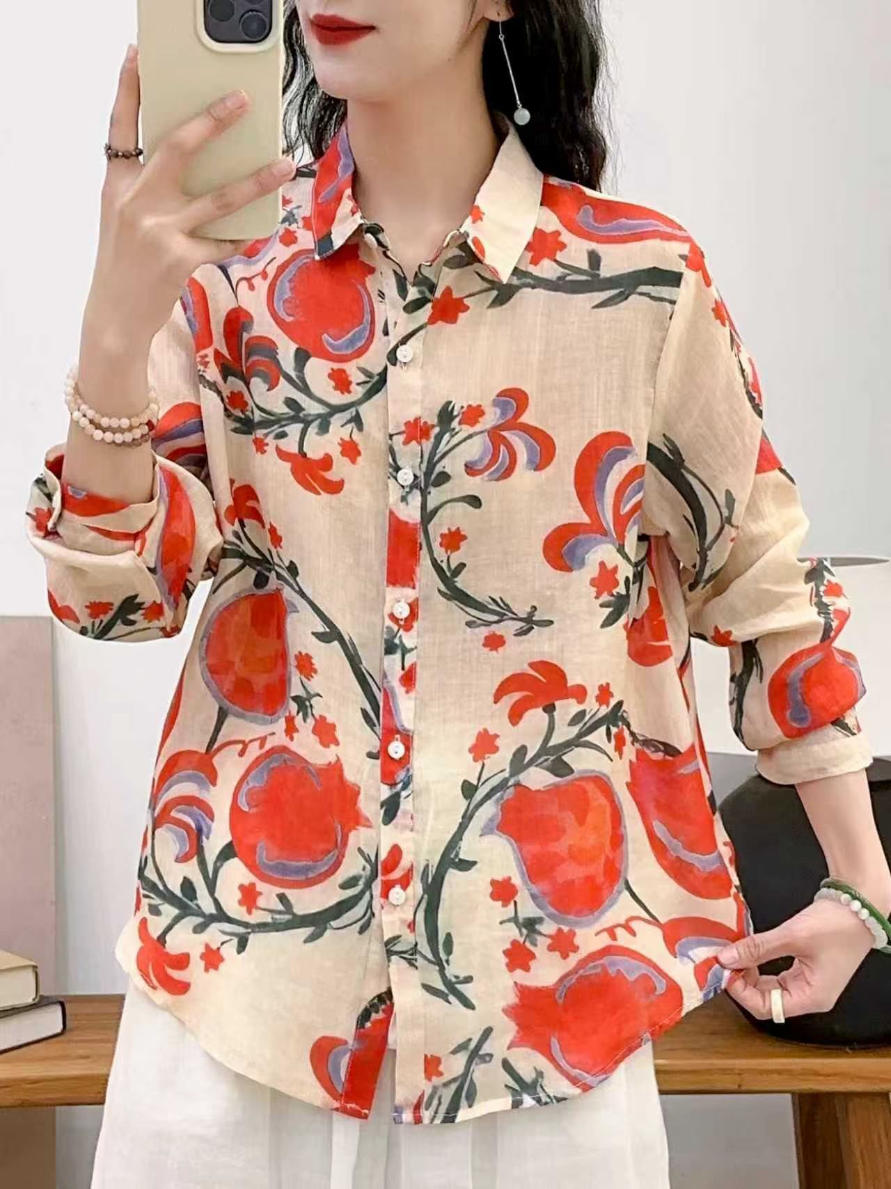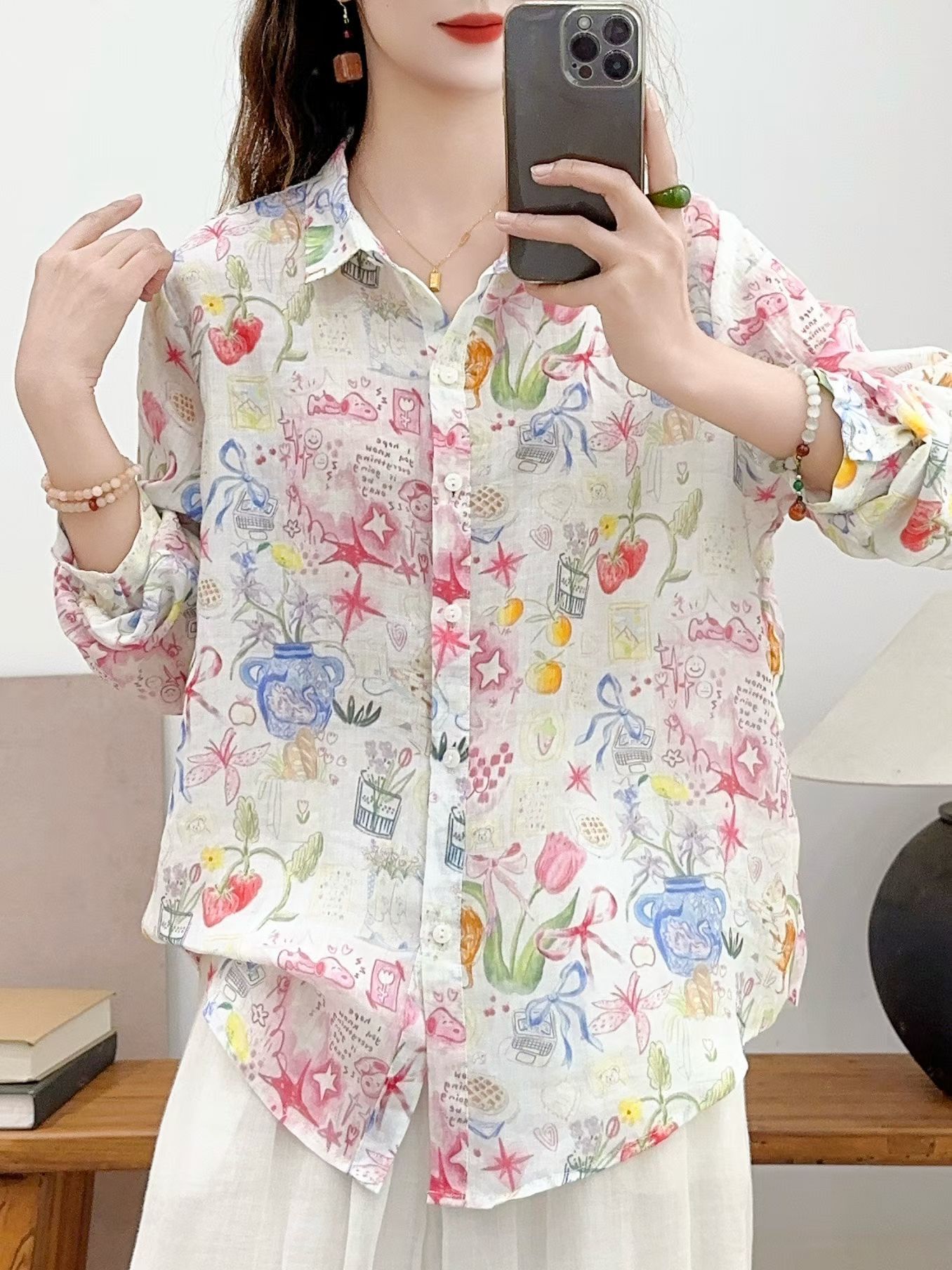 모리 소녀 예술적 라미 인쇄 셔츠 긴팔 여성용 옷깃 꽃 탑베이스 셔츠 라미 셔츠 탑 여성 의류스토어 가기
