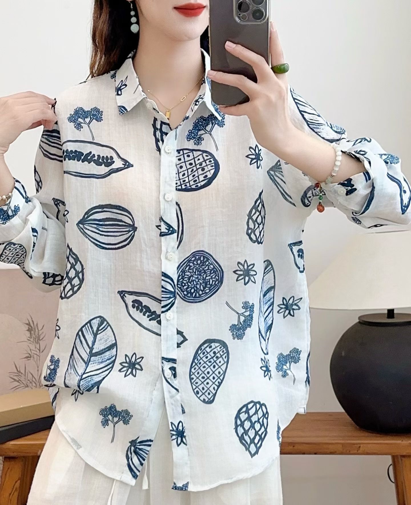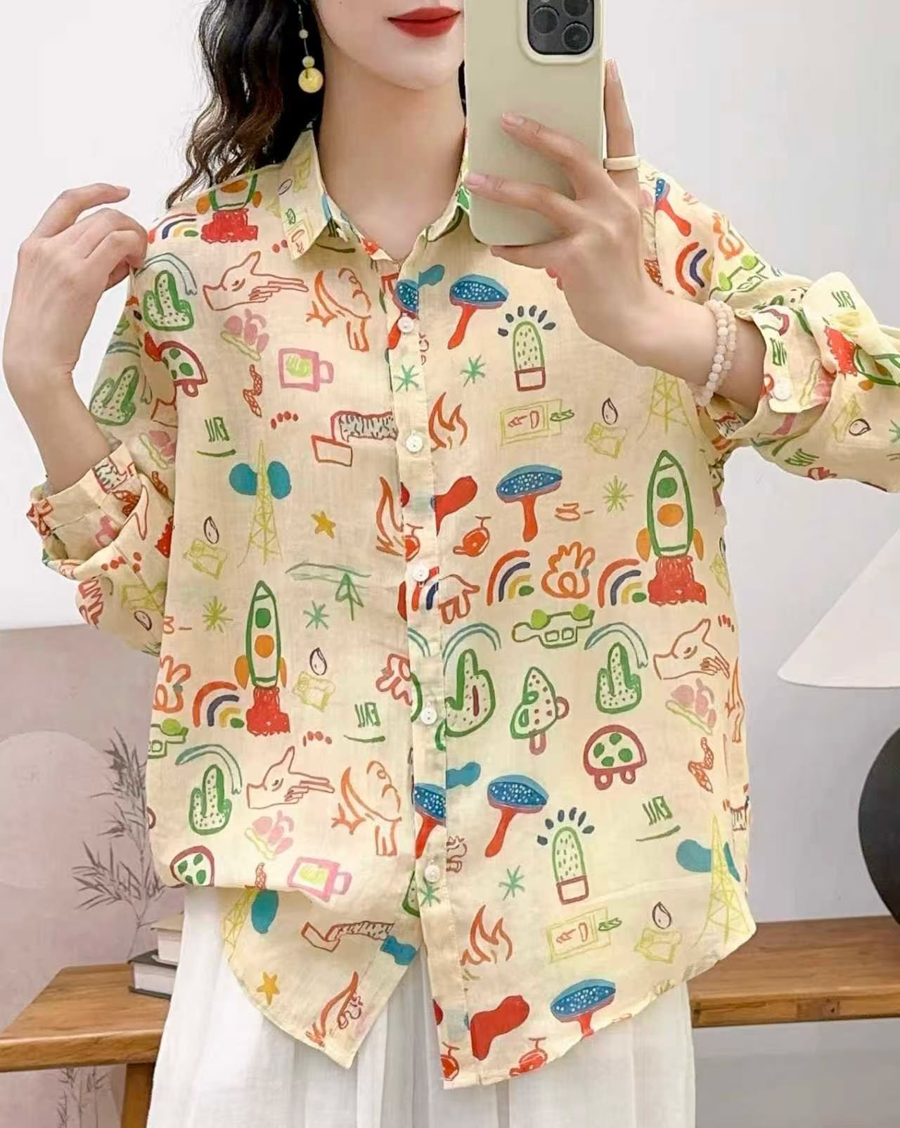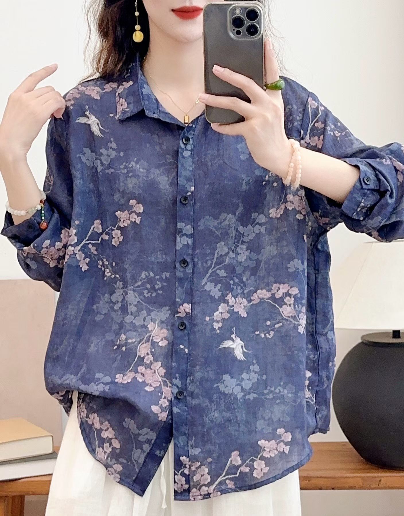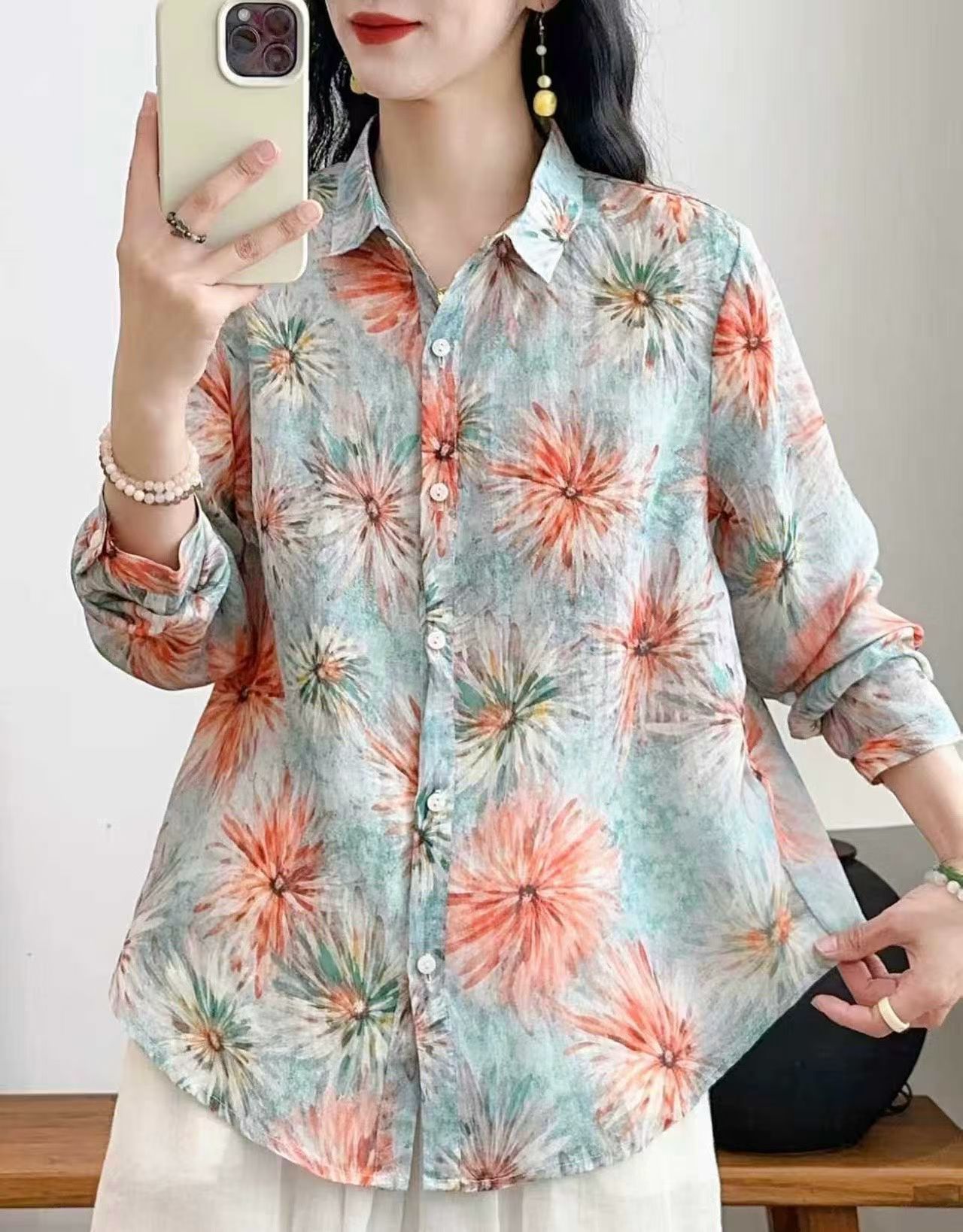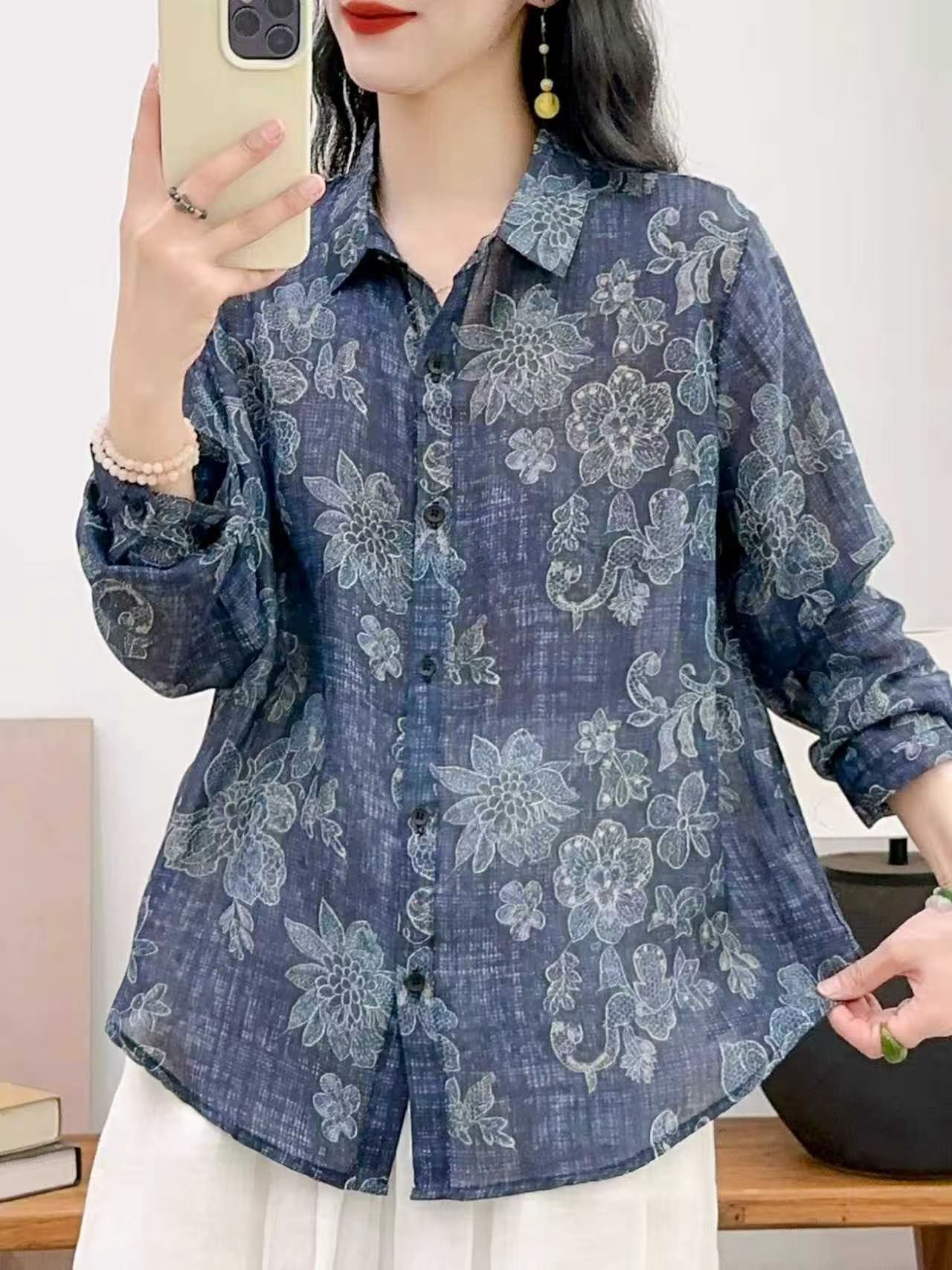모리 소녀 예술적 라미 인쇄 셔츠 긴팔 여성용 옷깃 꽃 탑베이스 셔츠 라미 셔츠 탑 여성 의류스토어 가기