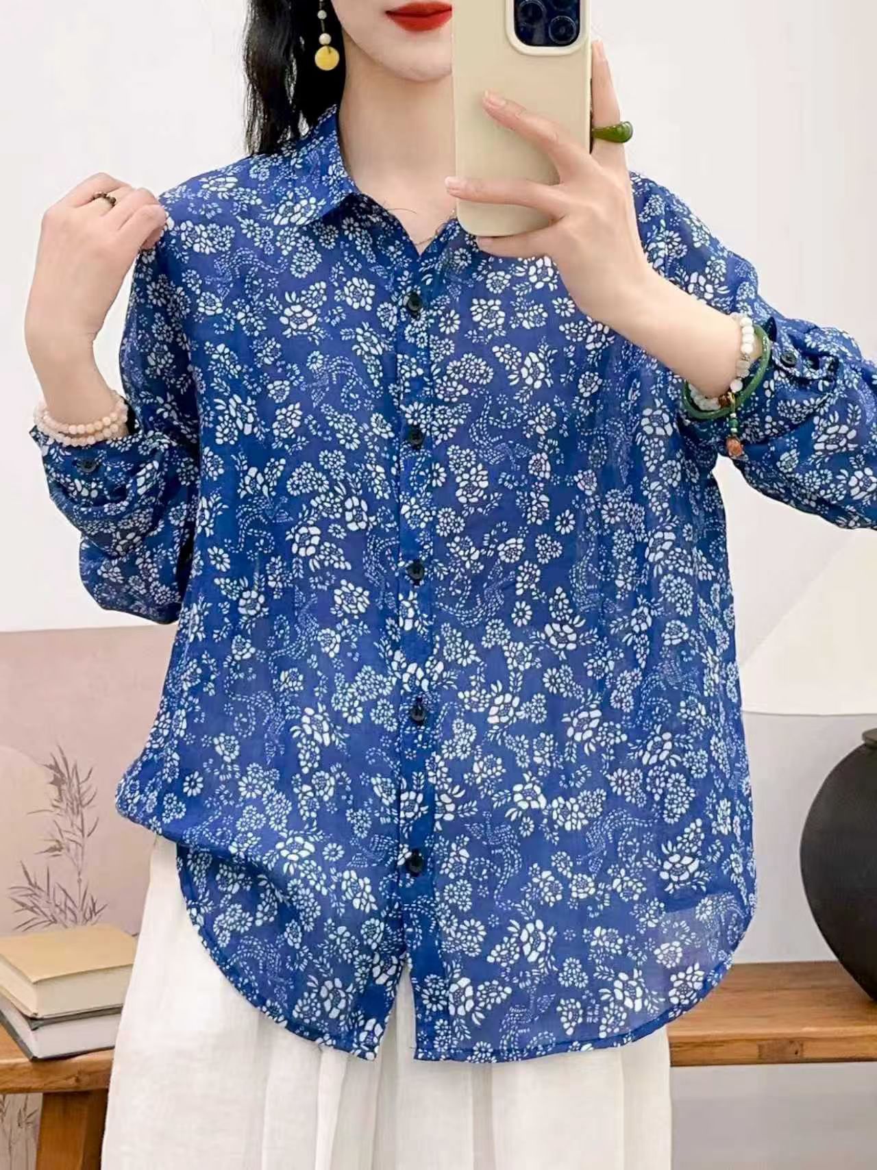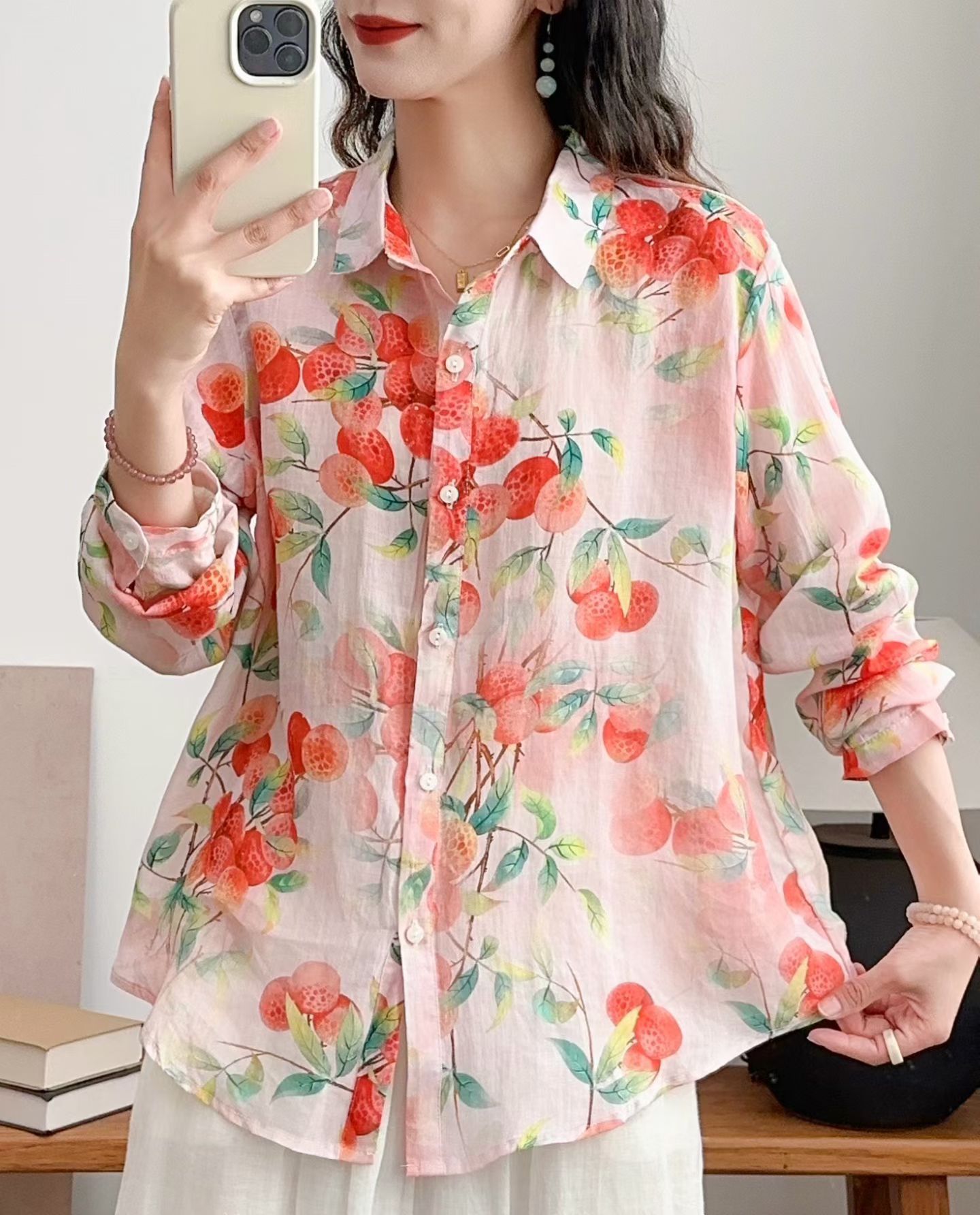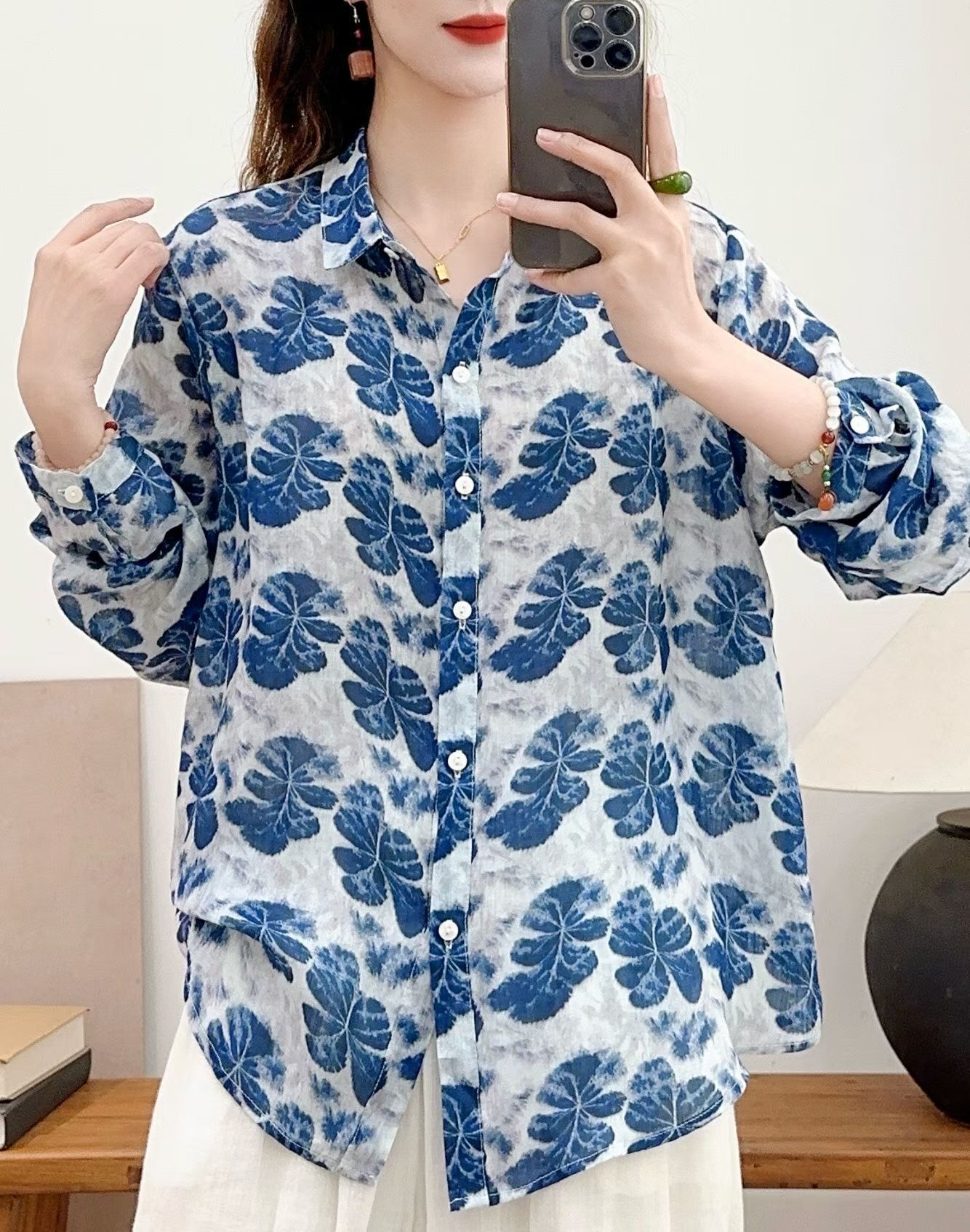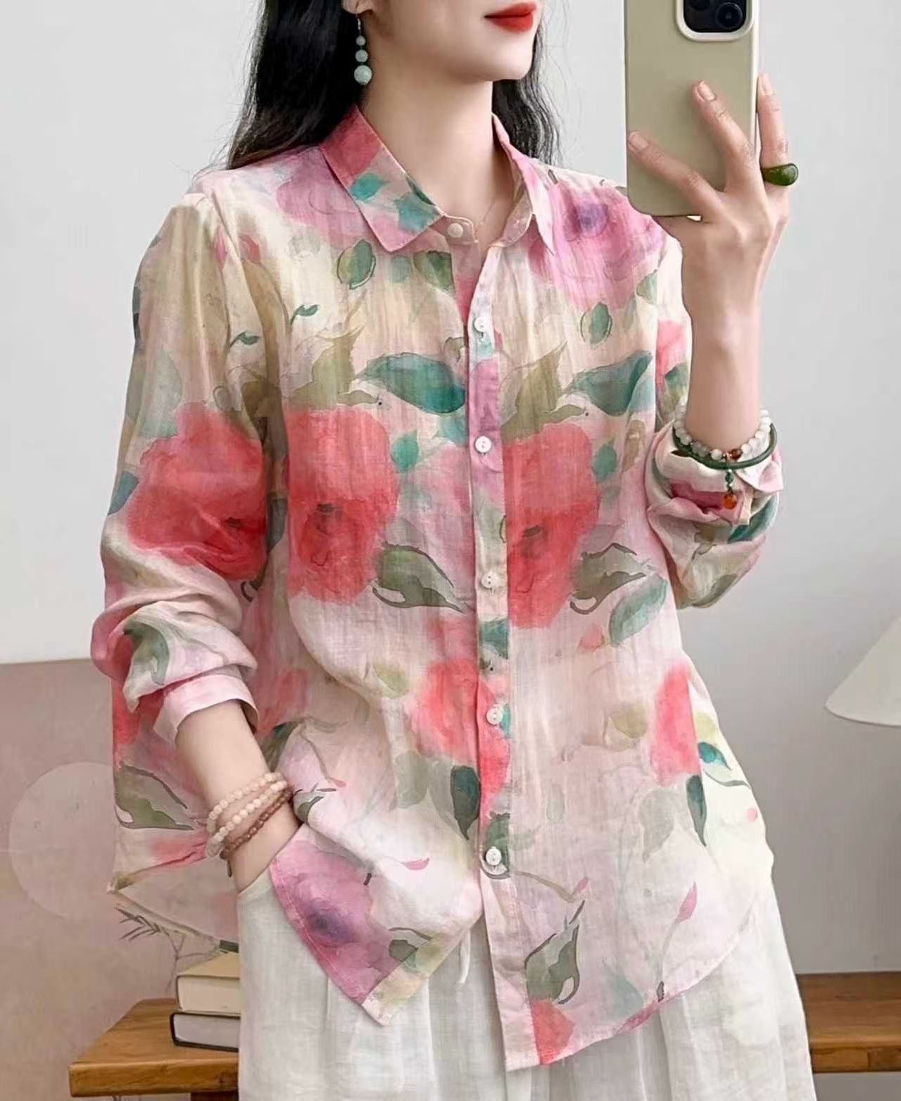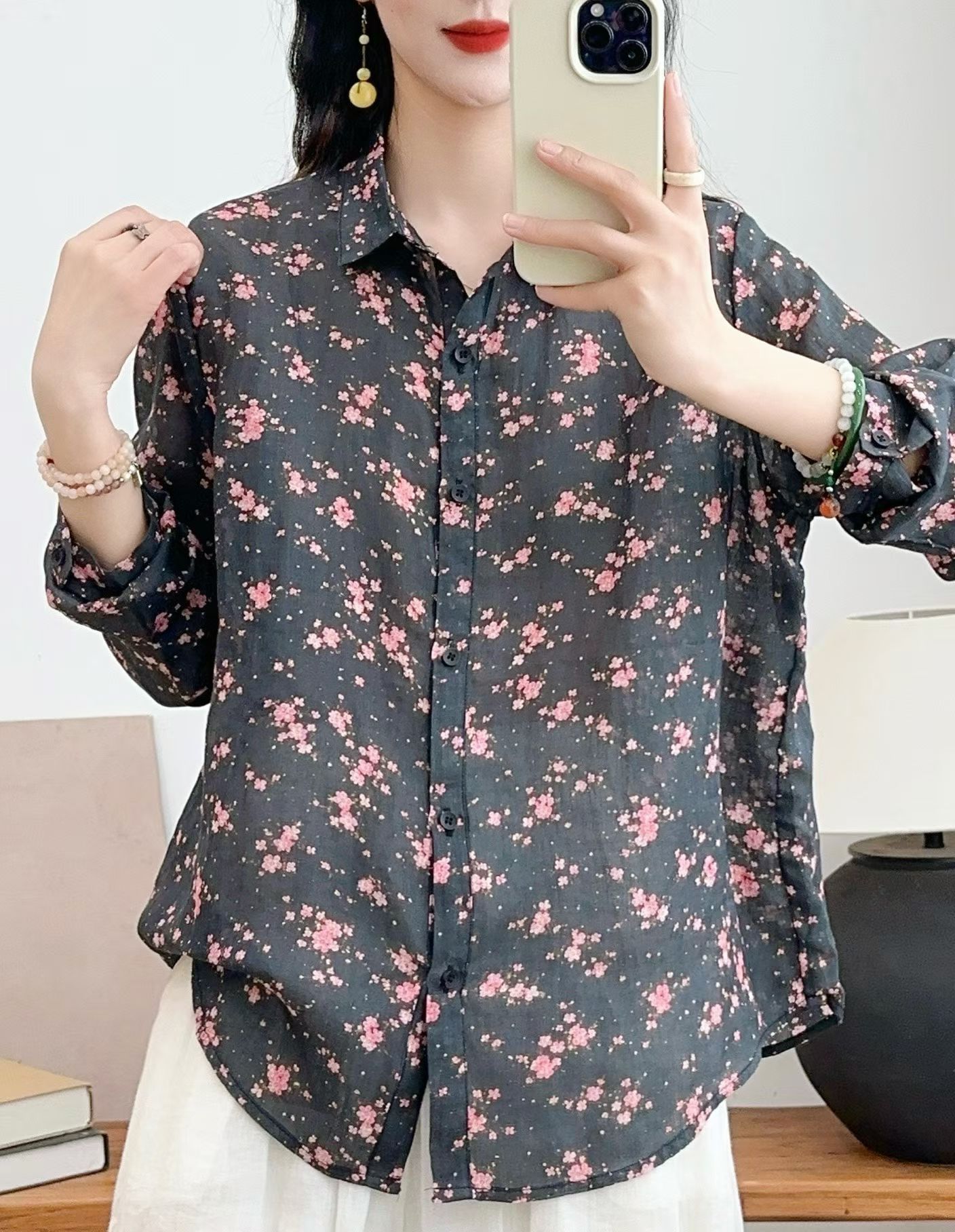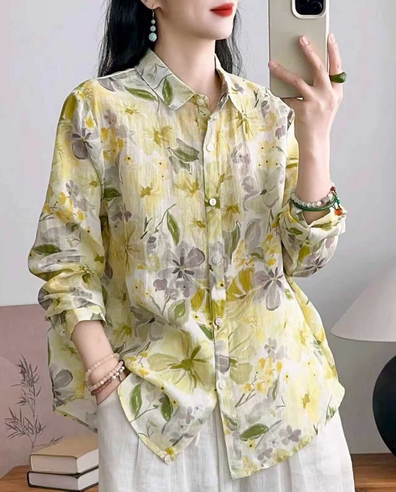 모리 소녀 예술적 라미 인쇄 셔츠 긴팔 여성용 옷깃 꽃 탑베이스 셔츠 라미 셔츠 탑 여성 의류스토어 가기