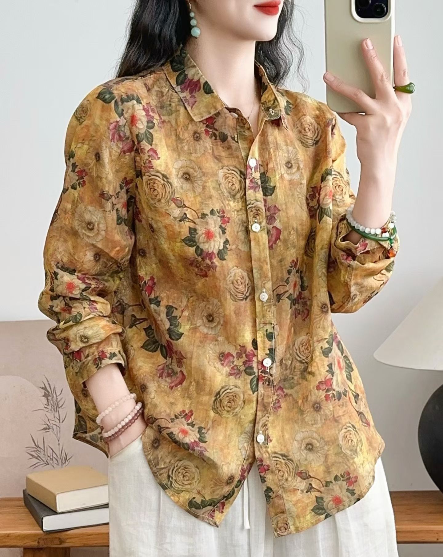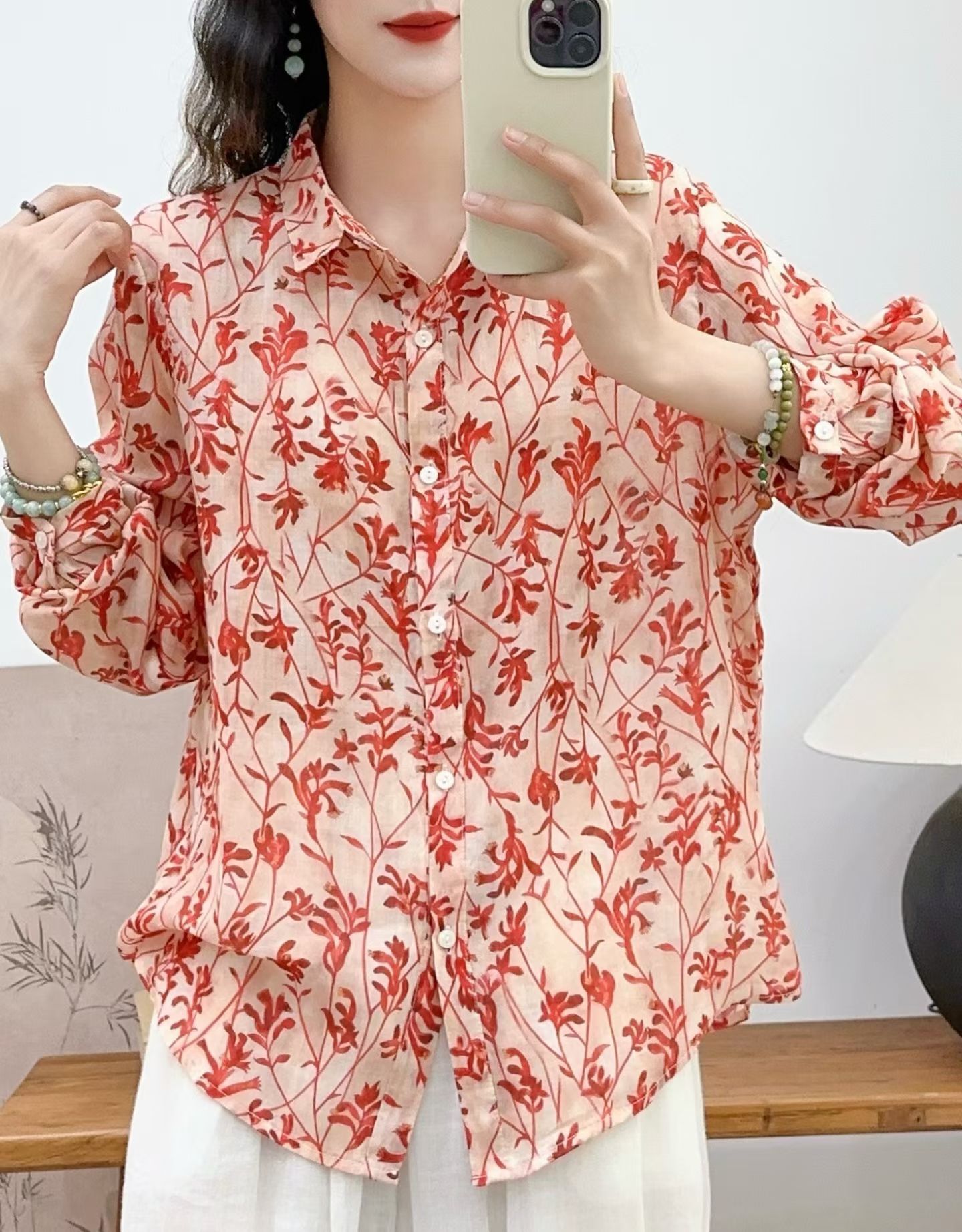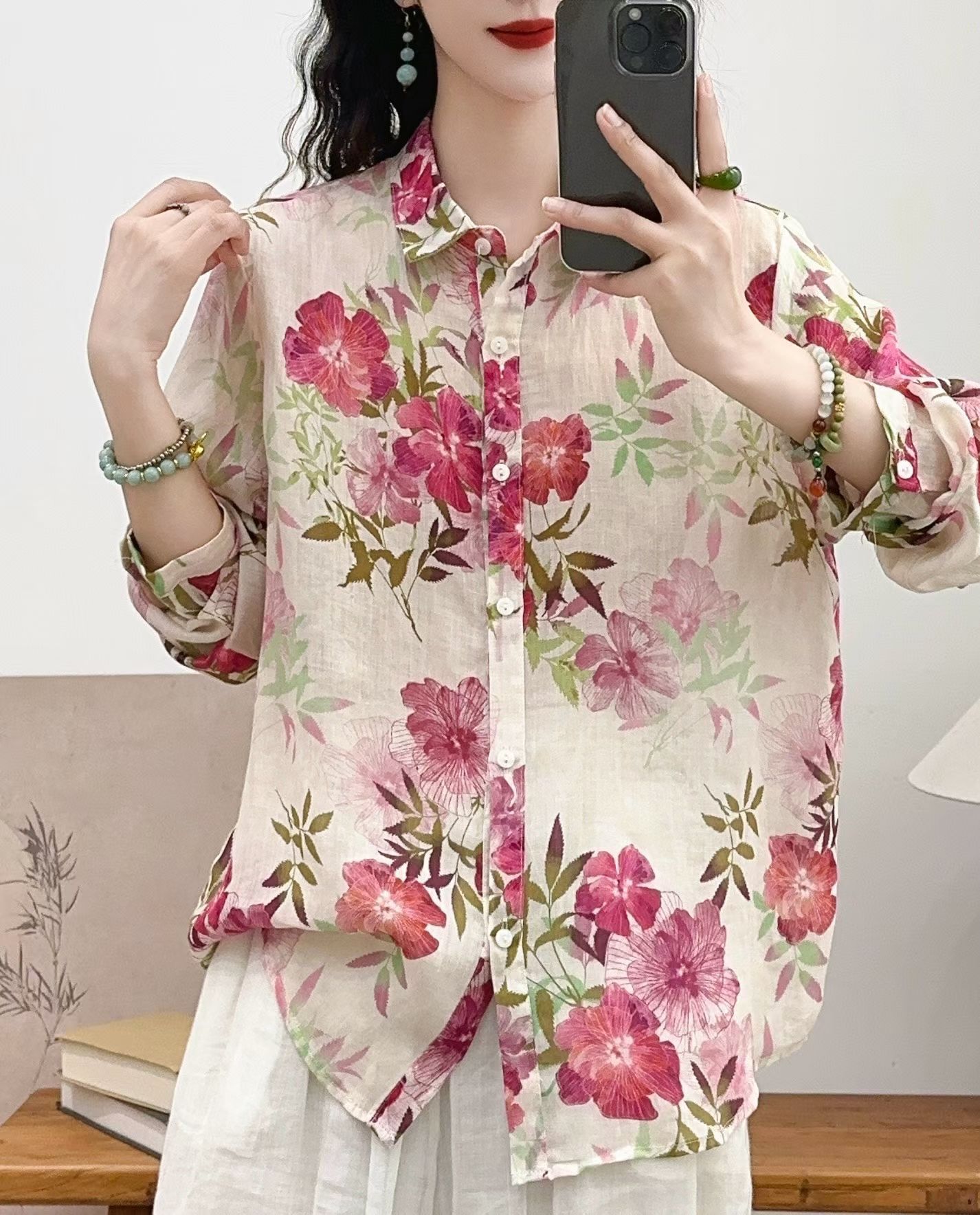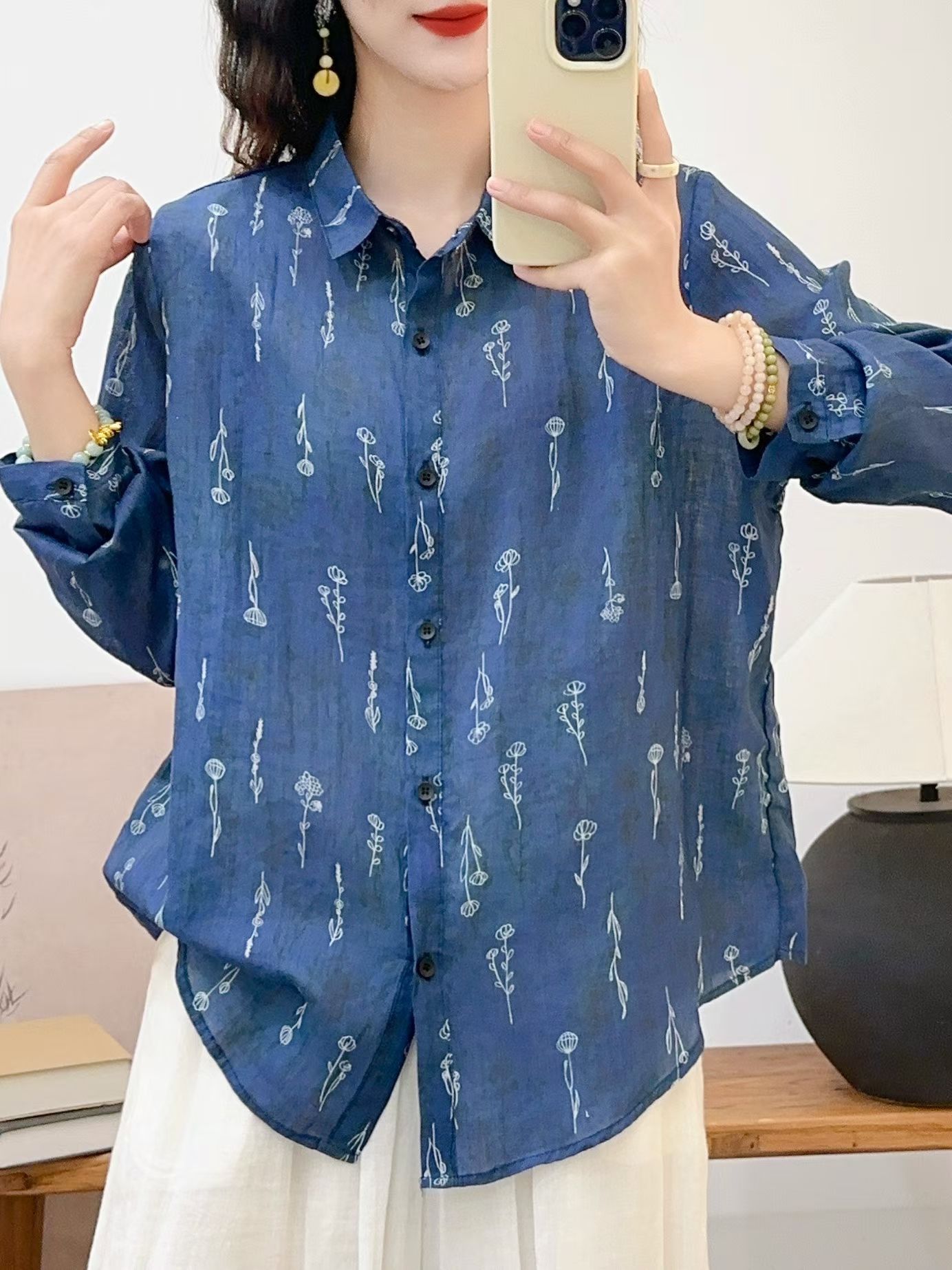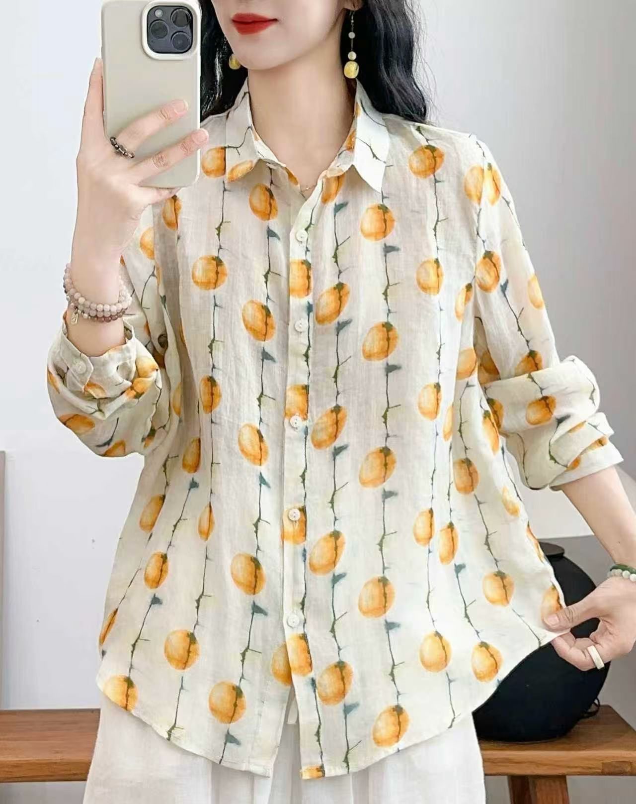 모리 소녀 예술적 라미 인쇄 셔츠 긴팔 여성용 옷깃 꽃 탑베이스 셔츠 라미 셔츠 탑 여성 의류스토어 가기