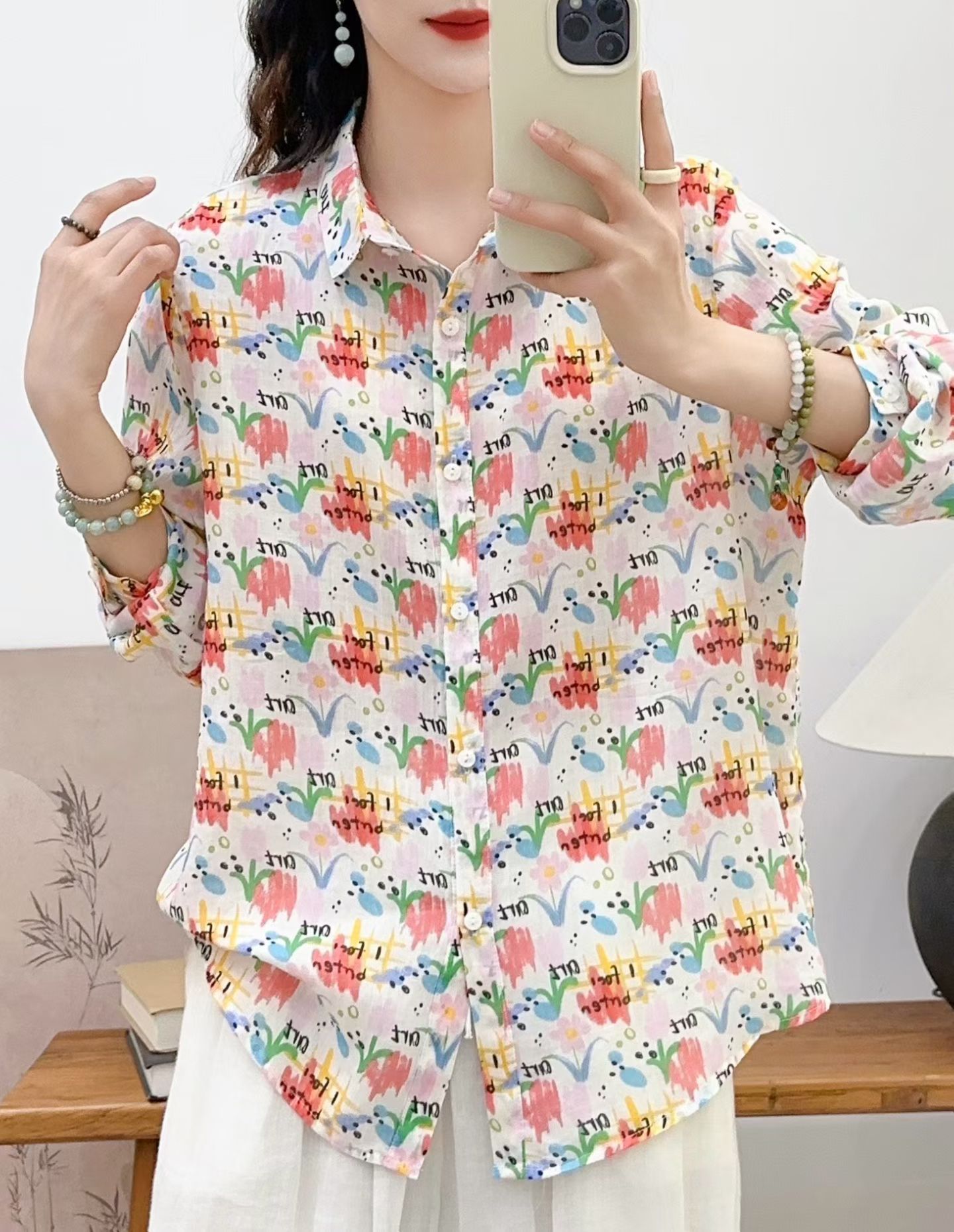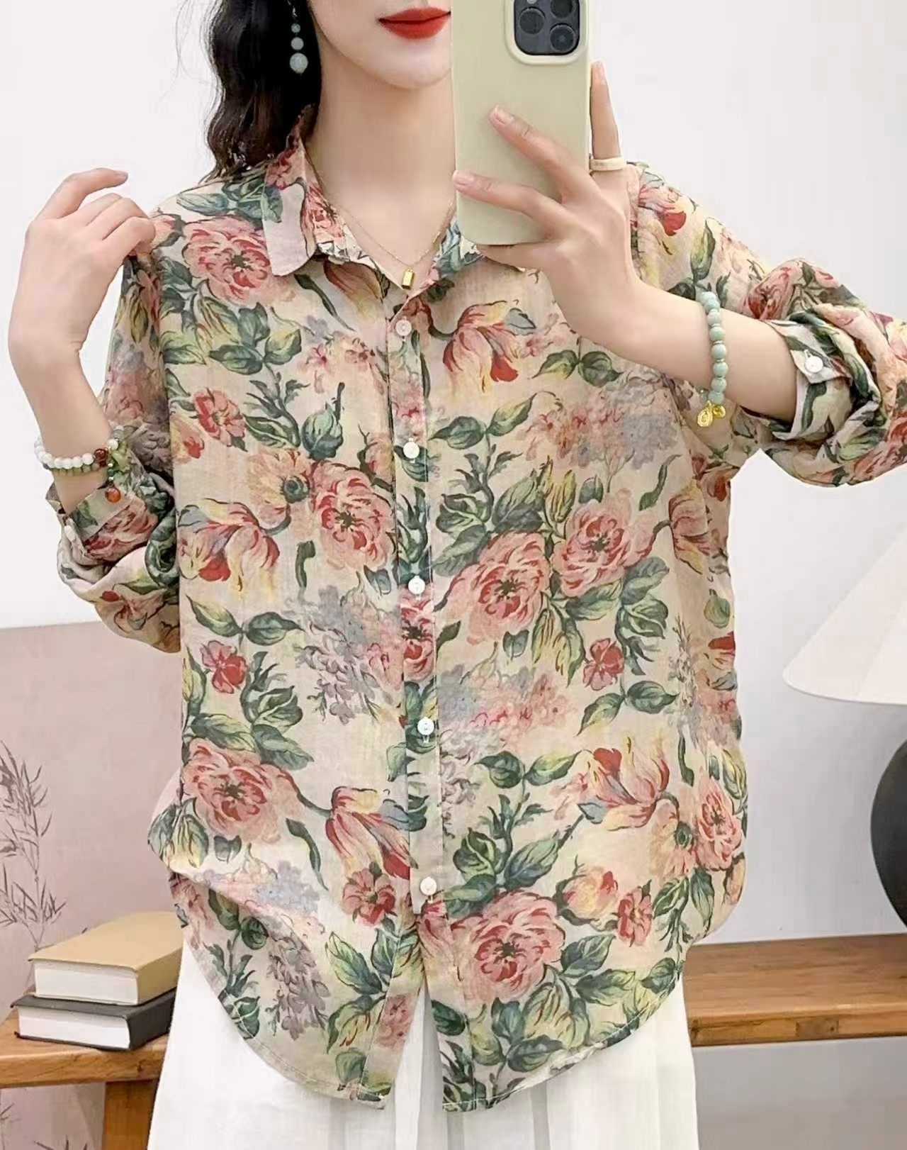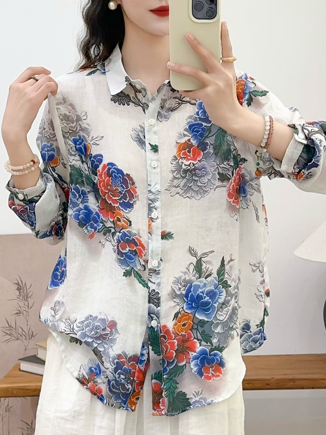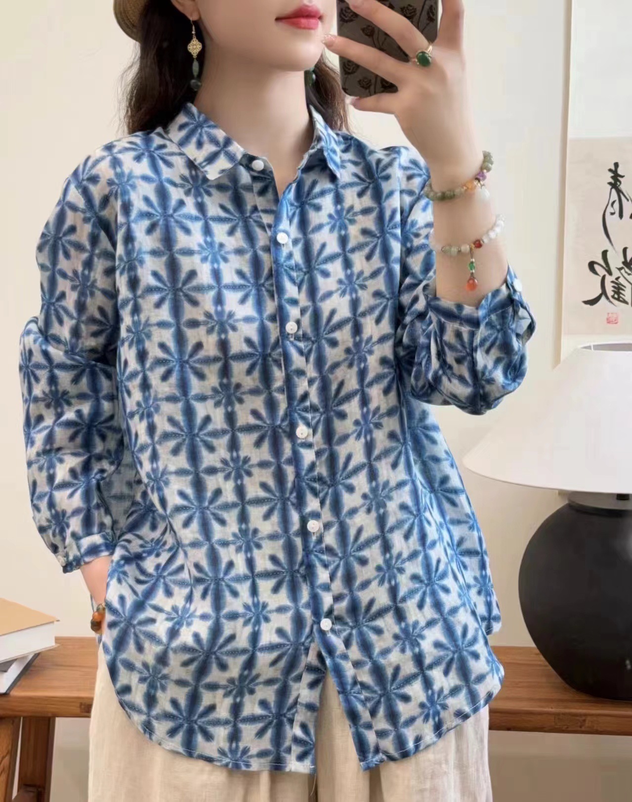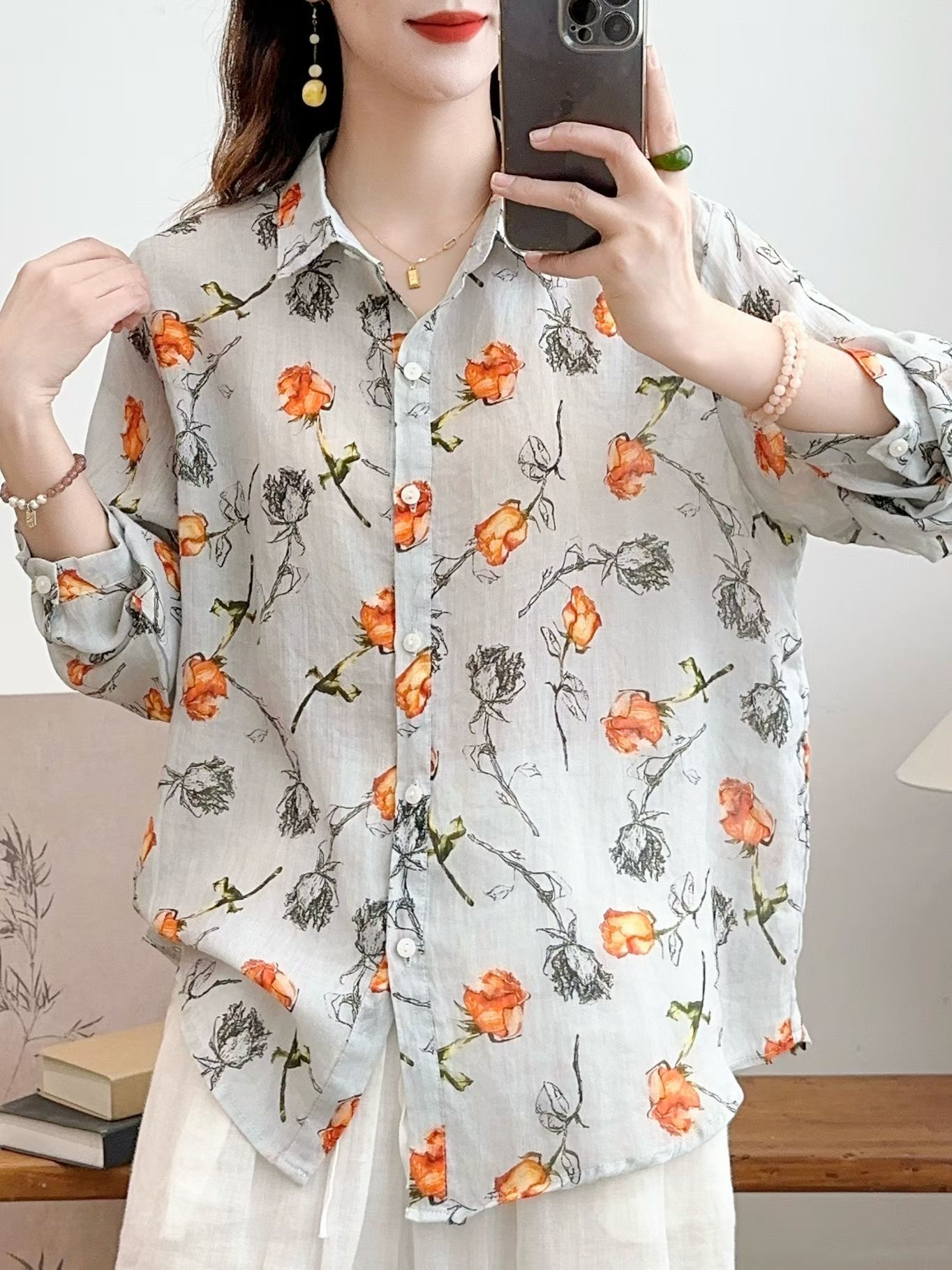 모리 소녀 예술적 라미 인쇄 셔츠 긴팔 여성용 옷깃 꽃 탑베이스 셔츠 라미 셔츠 탑 여성 의류스토어 가기
