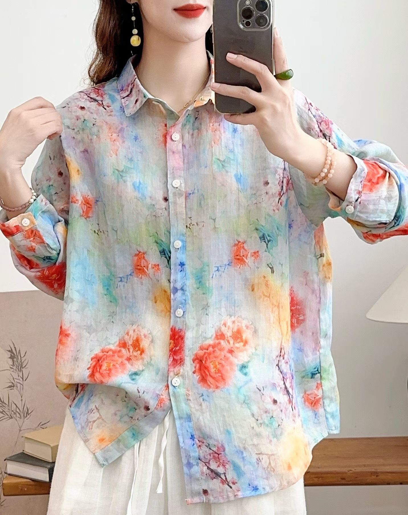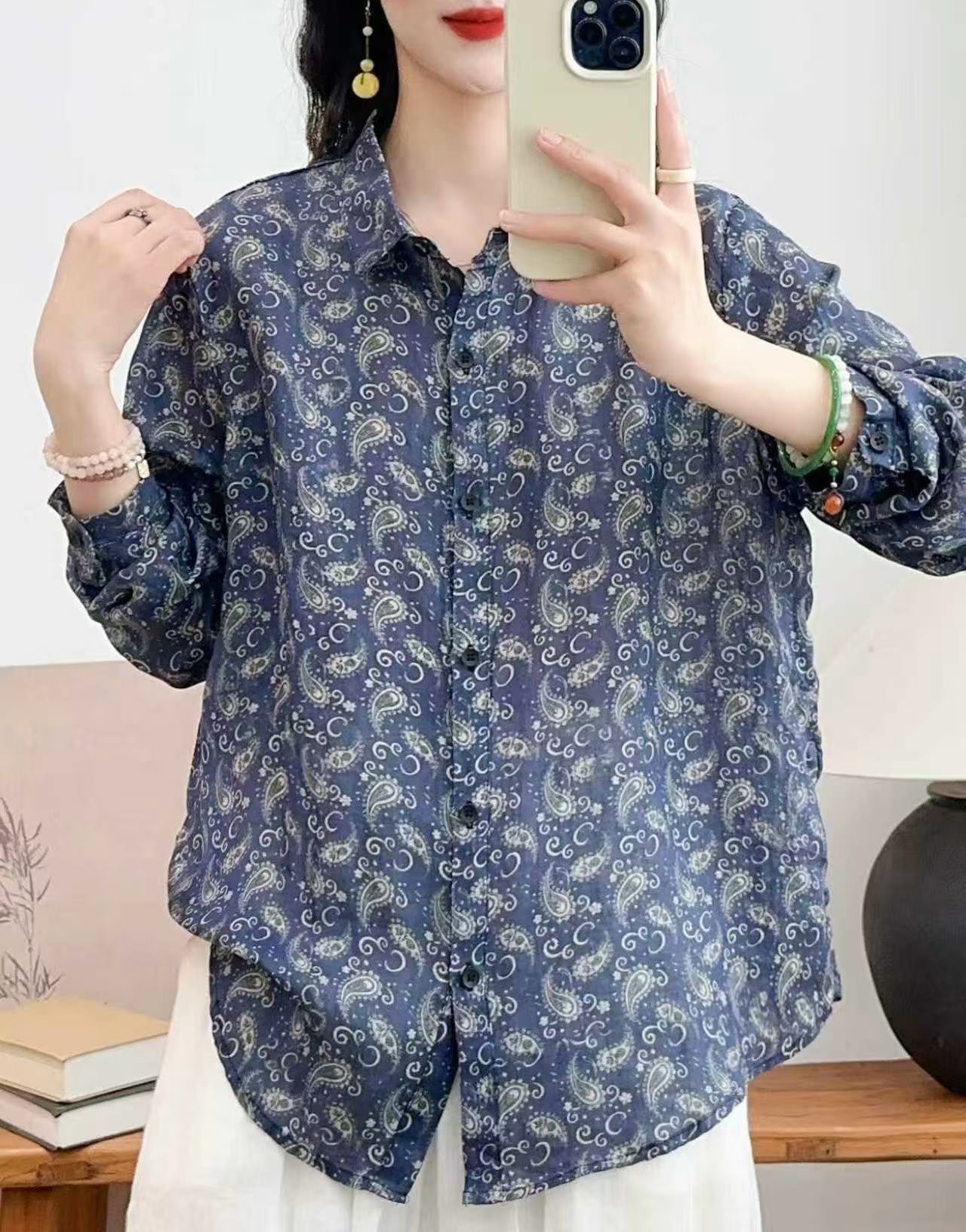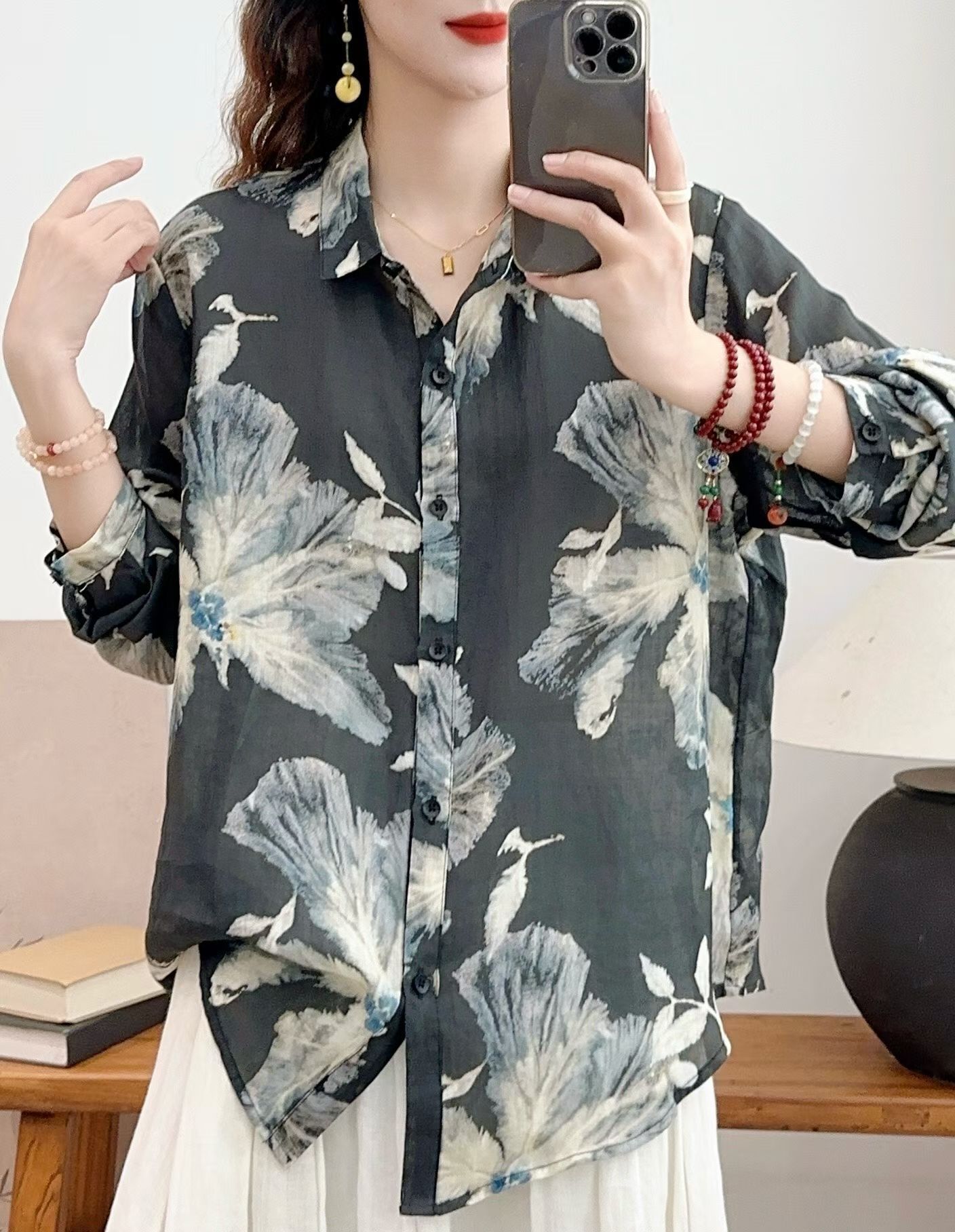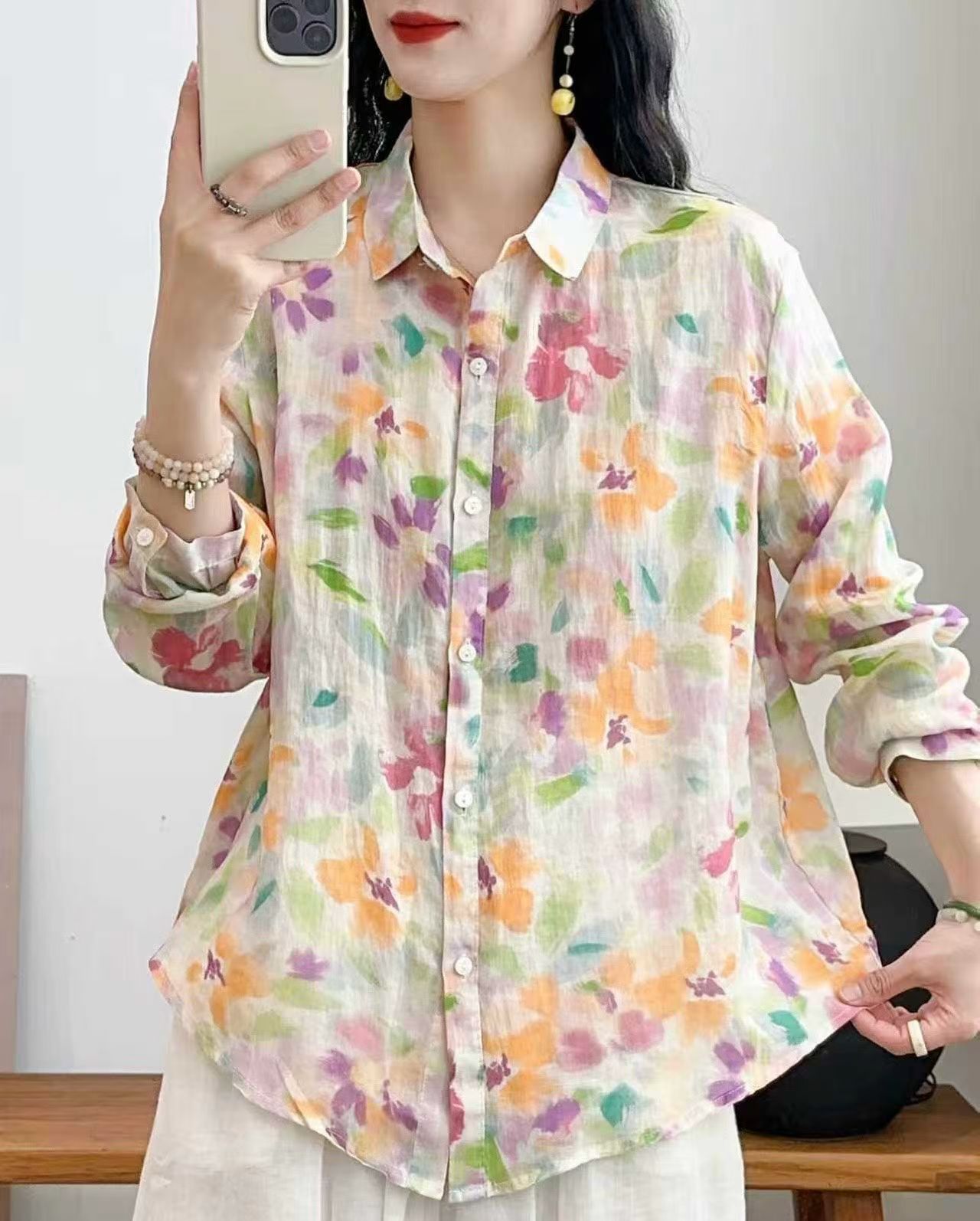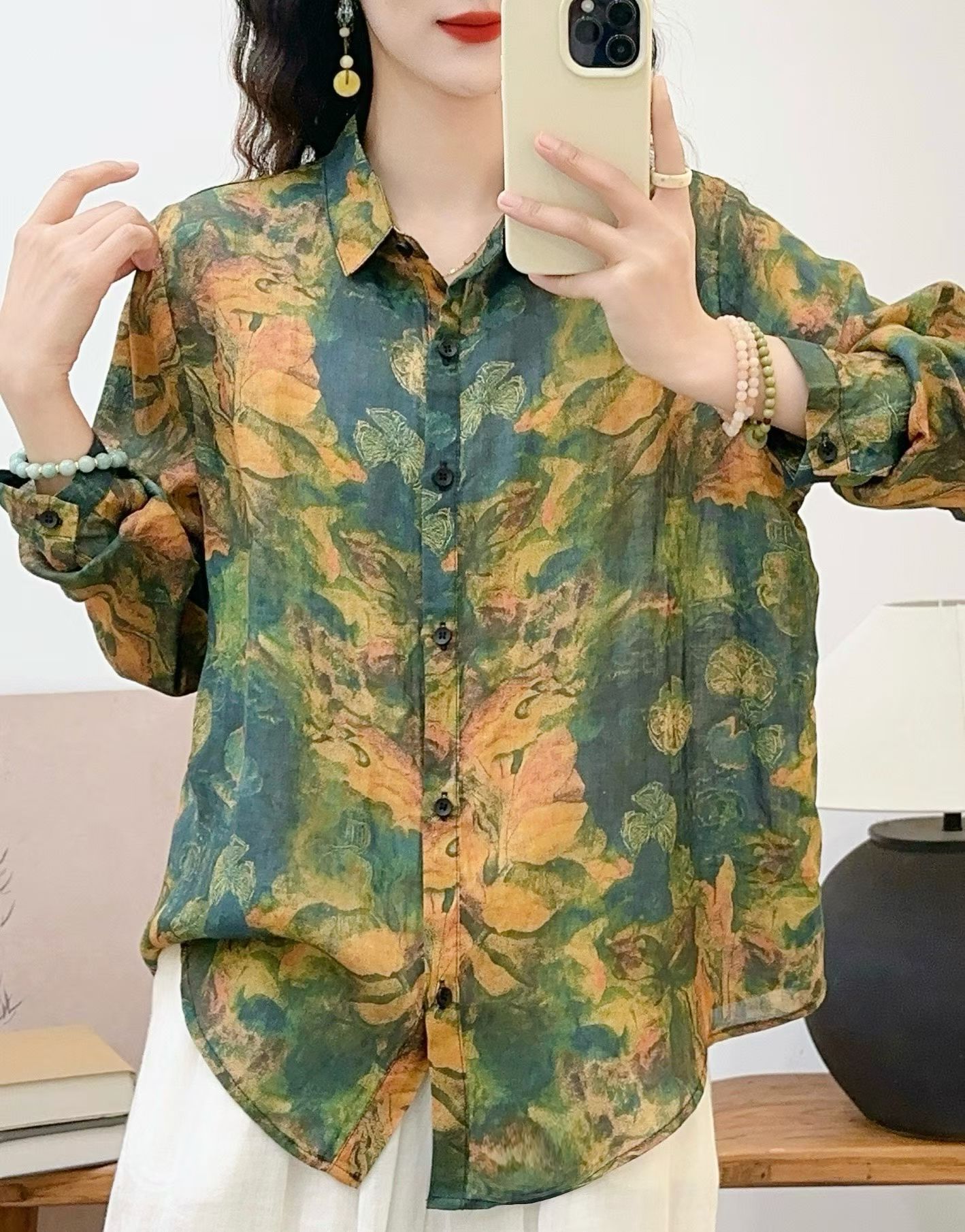 모리 소녀 예술적 라미 인쇄 셔츠 긴팔 여성용 옷깃 꽃 탑베이스 셔츠 라미 셔츠 탑 여성 의류스토어 가기