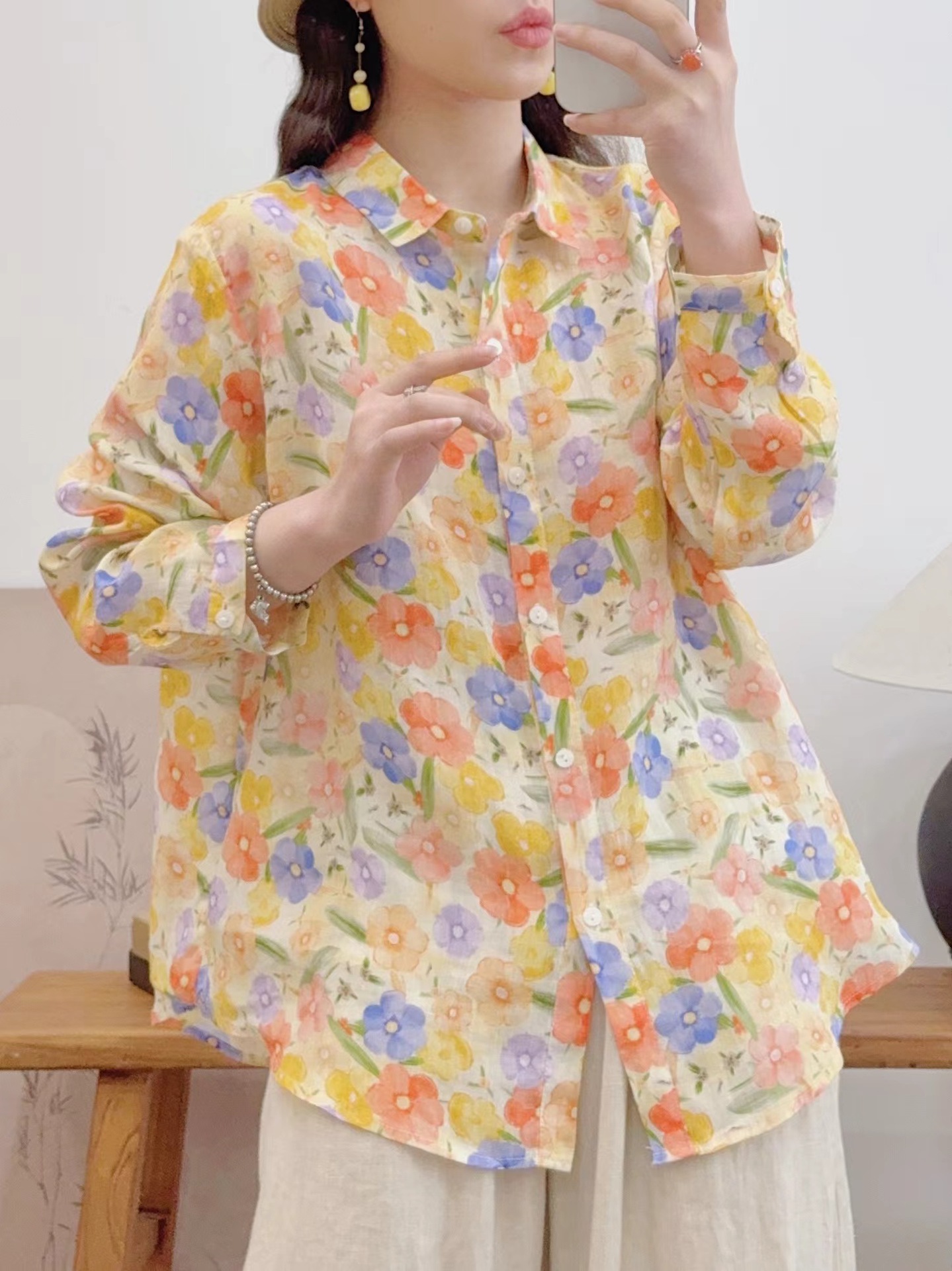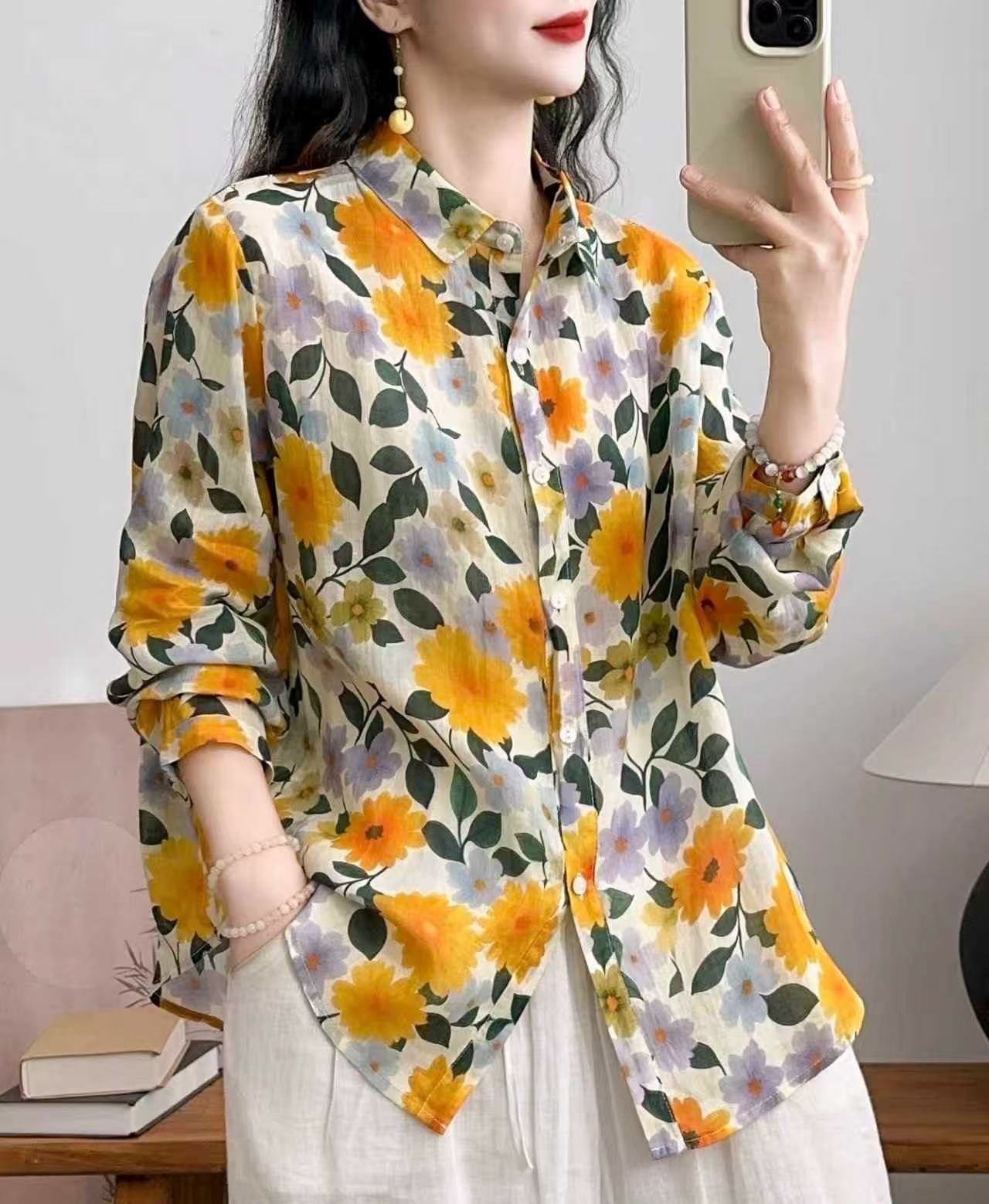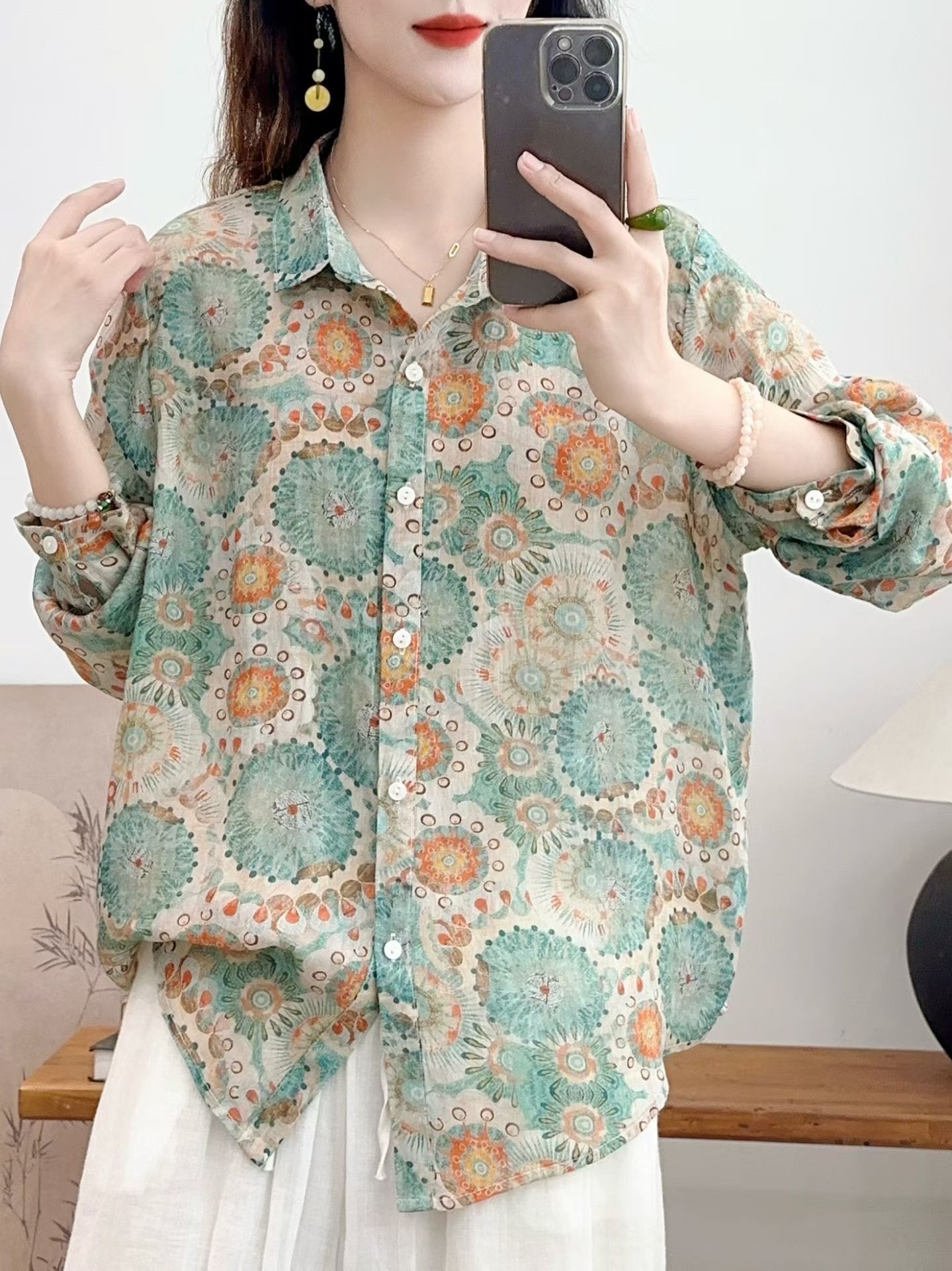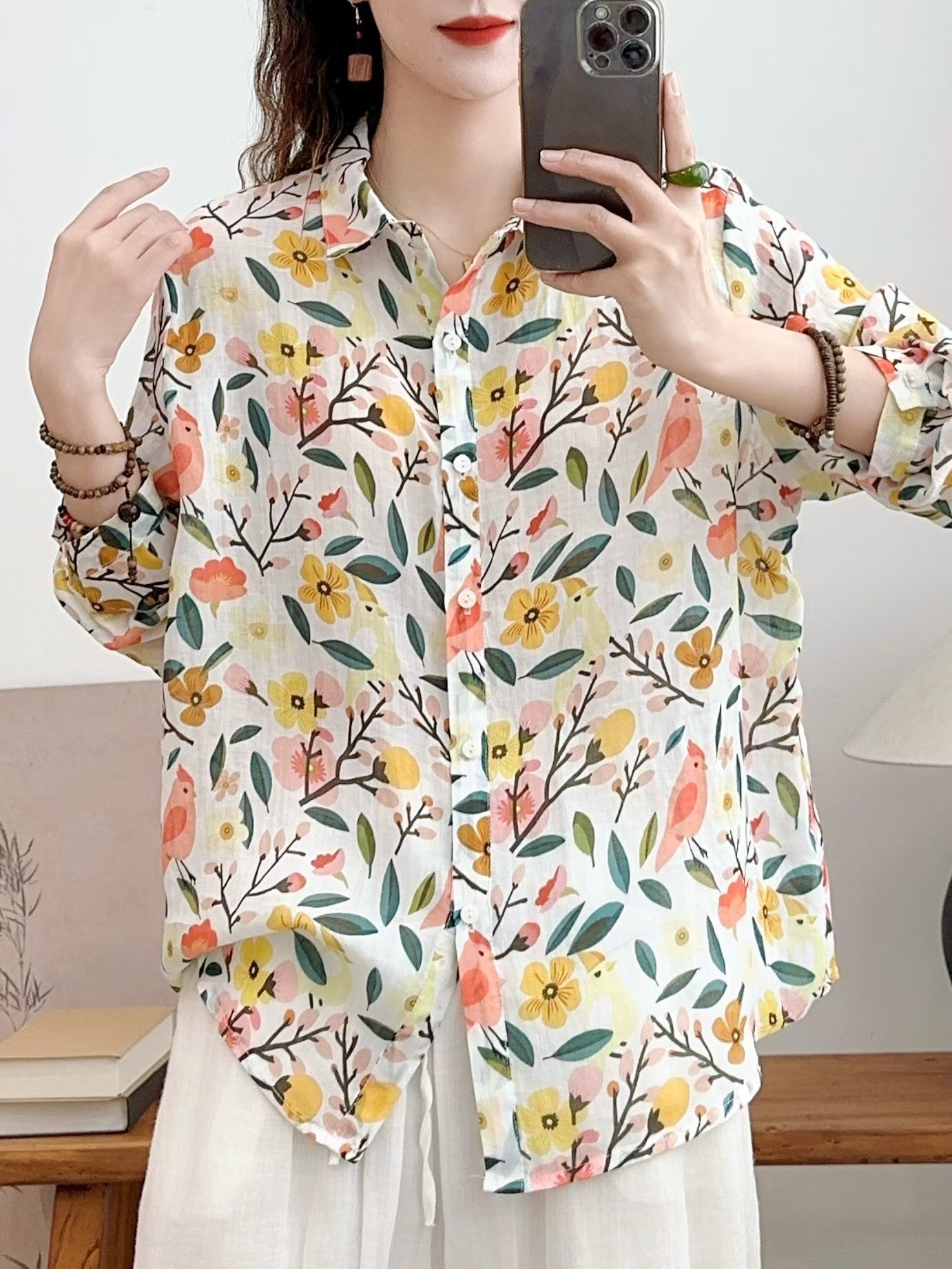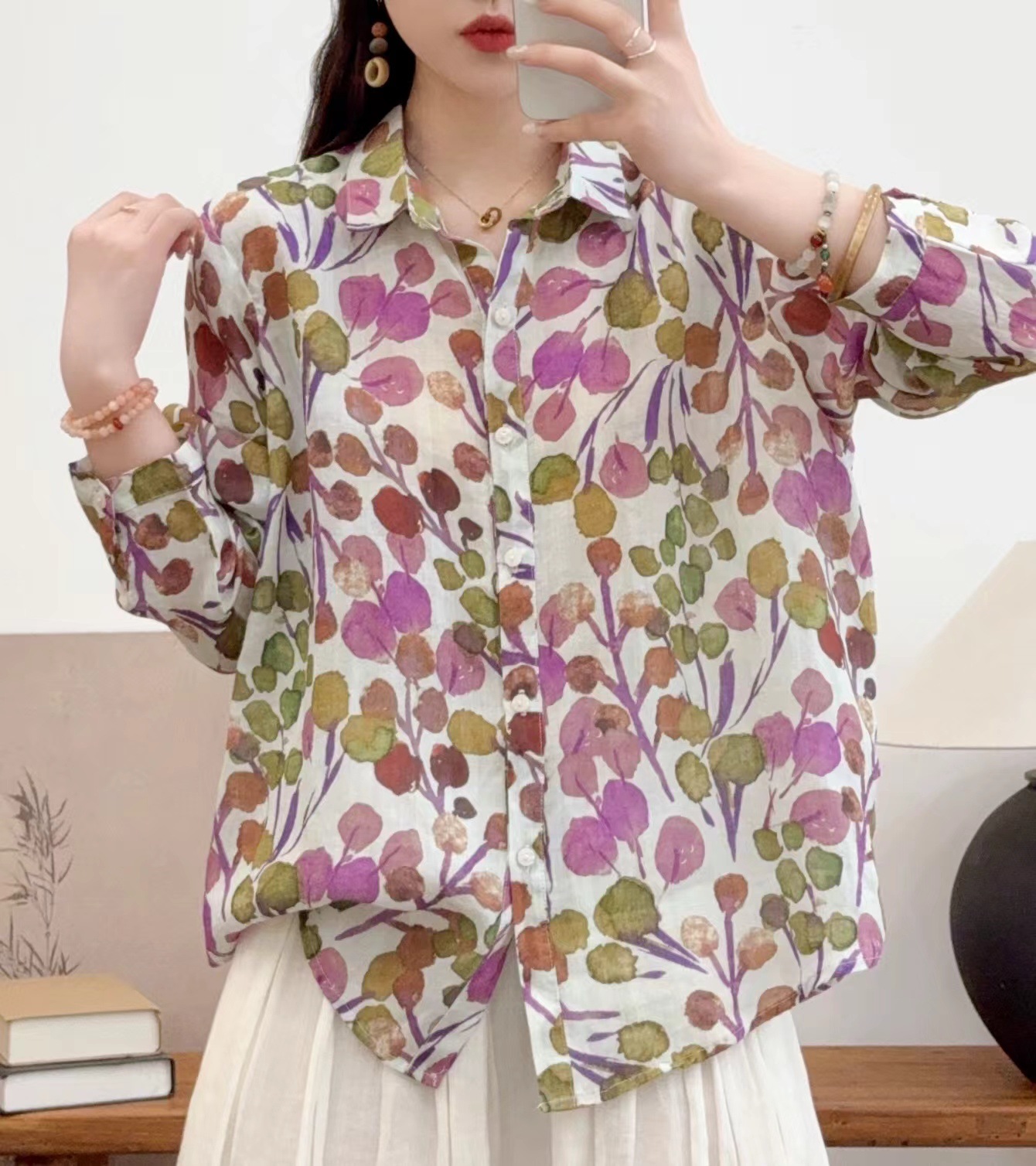 모리 소녀 예술적 라미 인쇄 셔츠 긴팔 여성용 옷깃 꽃 탑베이스 셔츠 라미 셔츠 탑 여성 의류스토어 가기