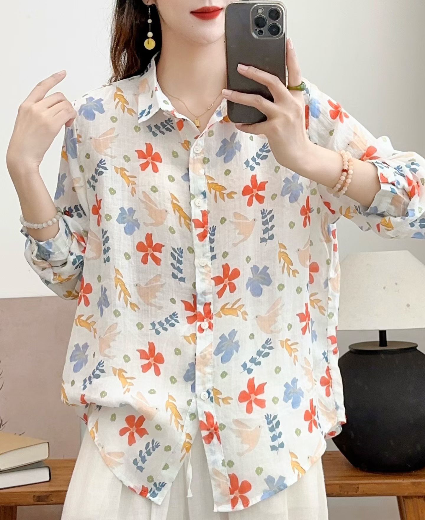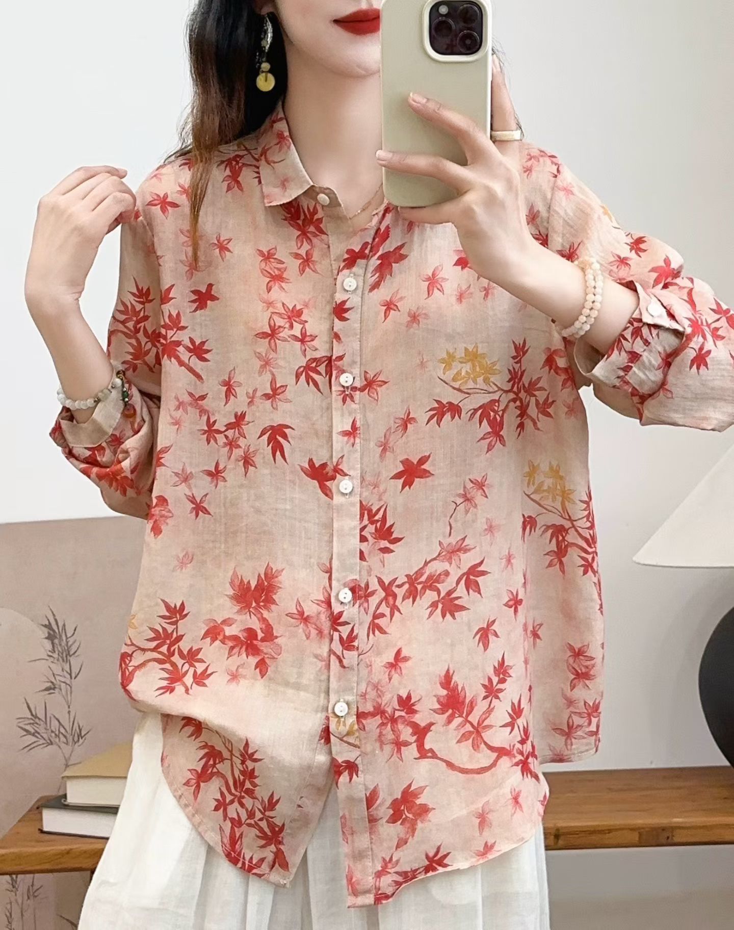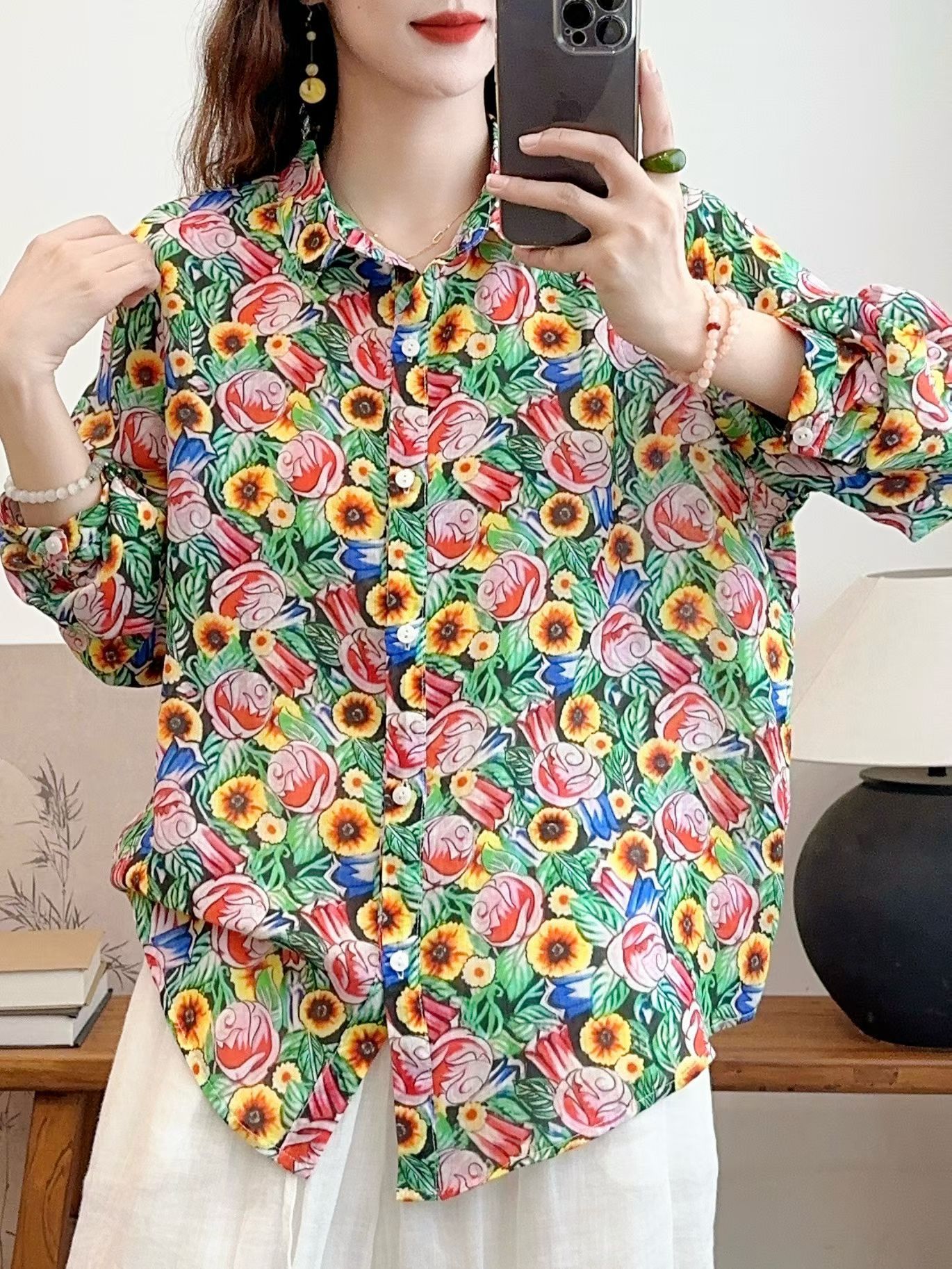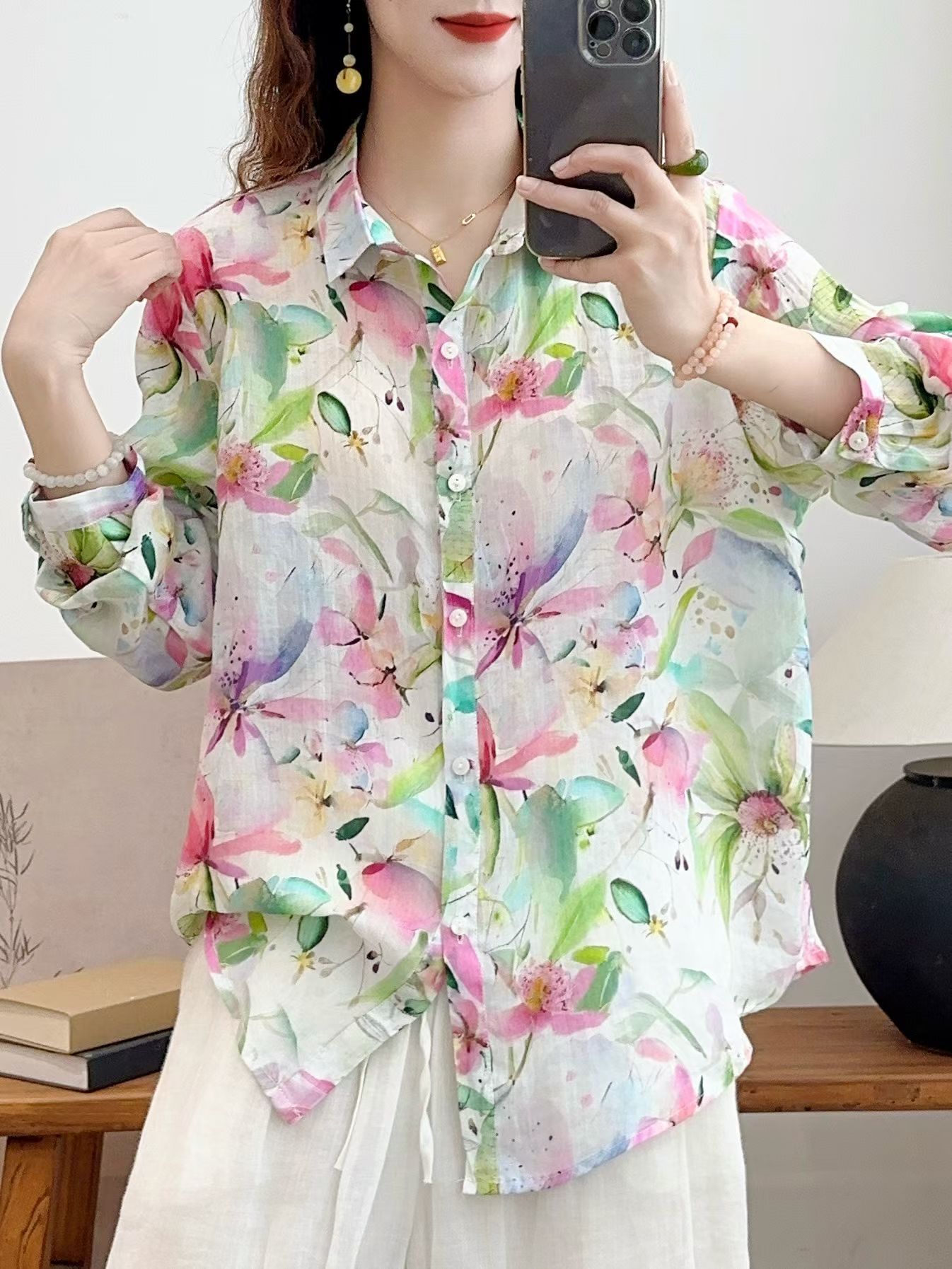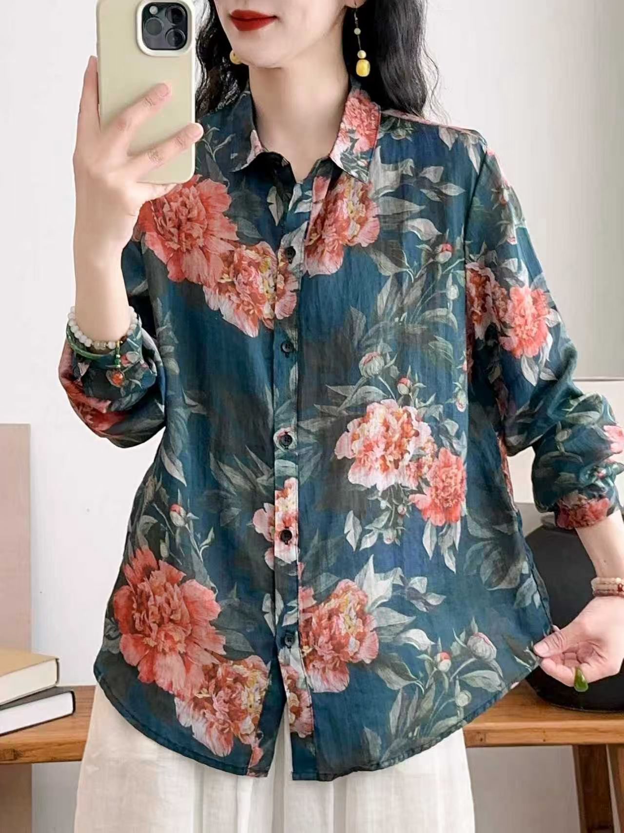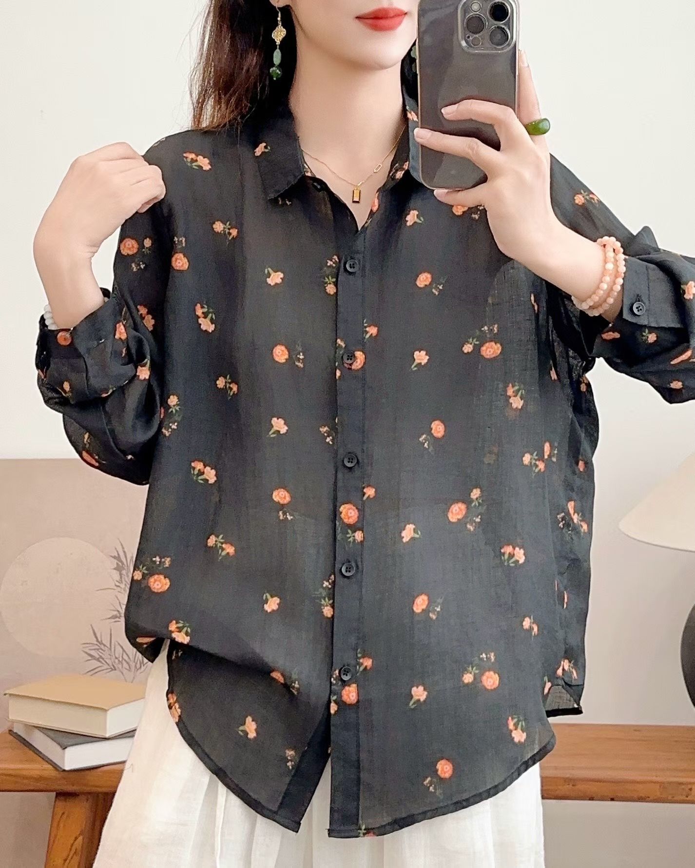 모리 소녀 예술적 라미 인쇄 셔츠 긴팔 여성용 옷깃 꽃 탑베이스 셔츠 라미 셔츠 탑 여성 의류스토어 가기