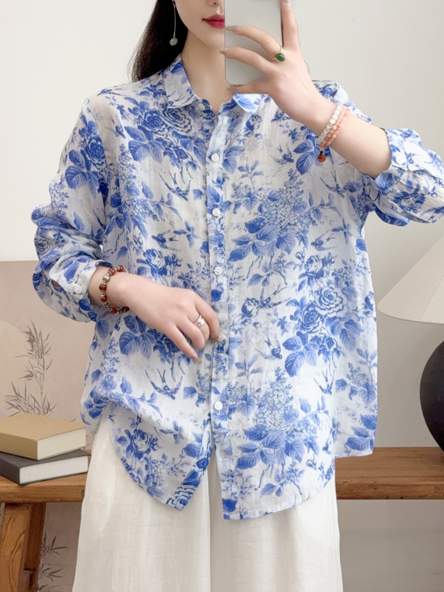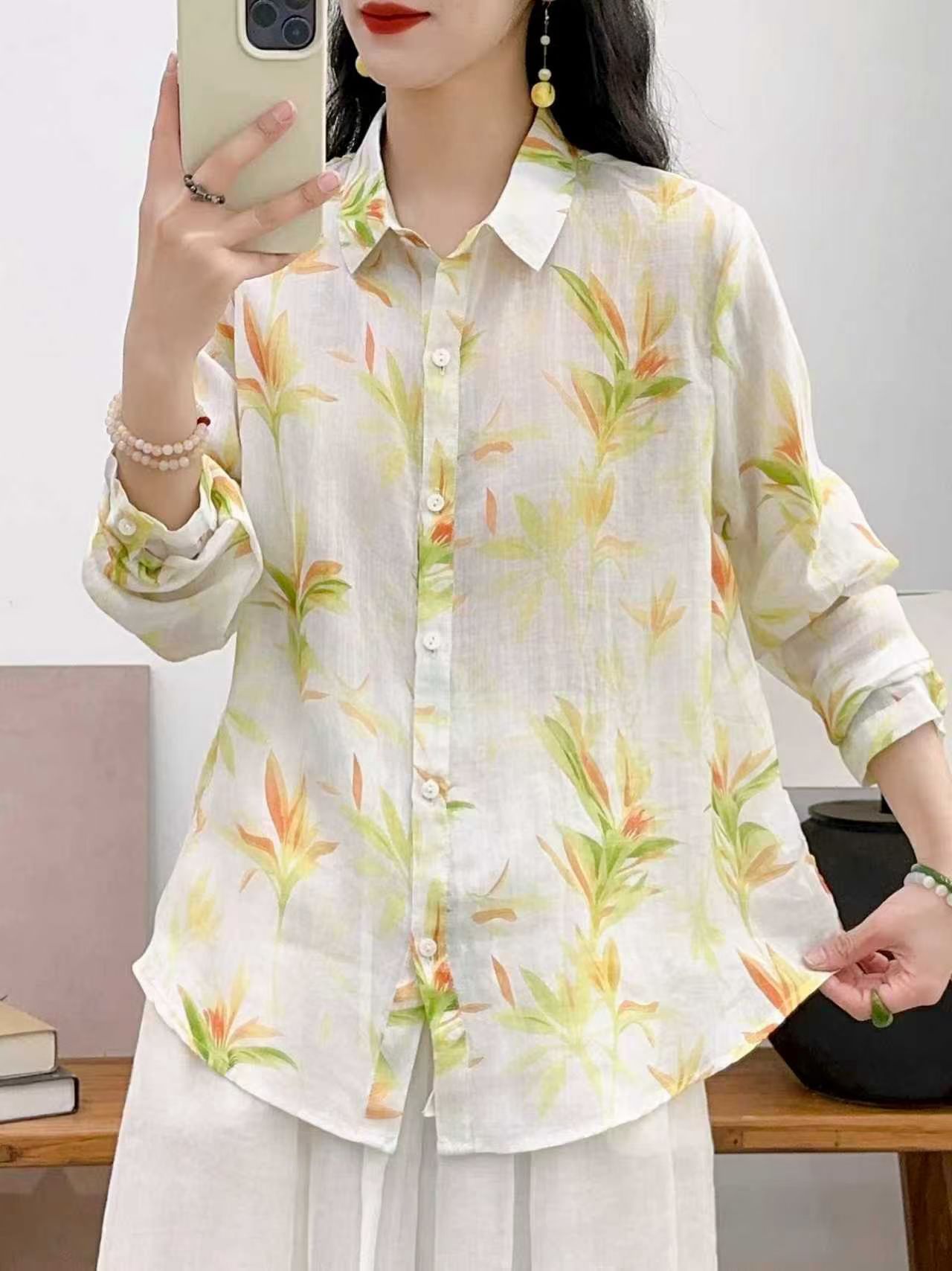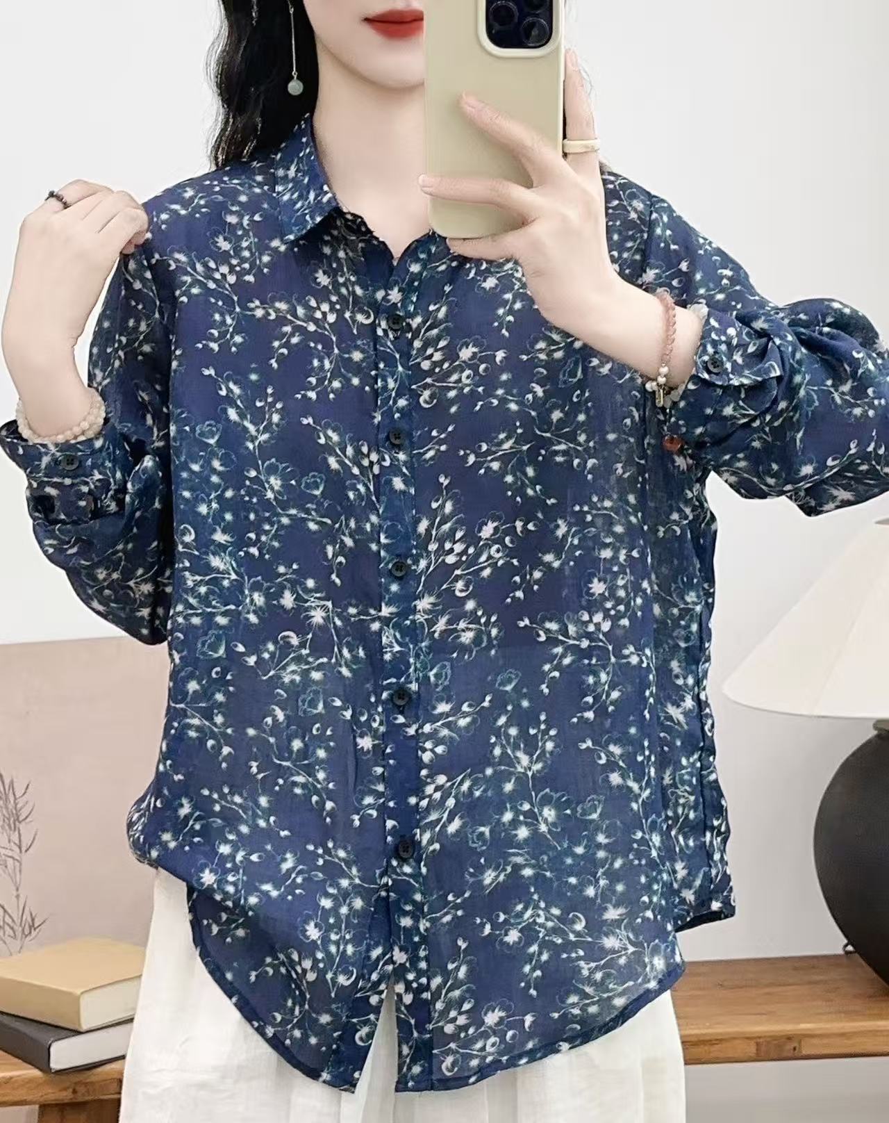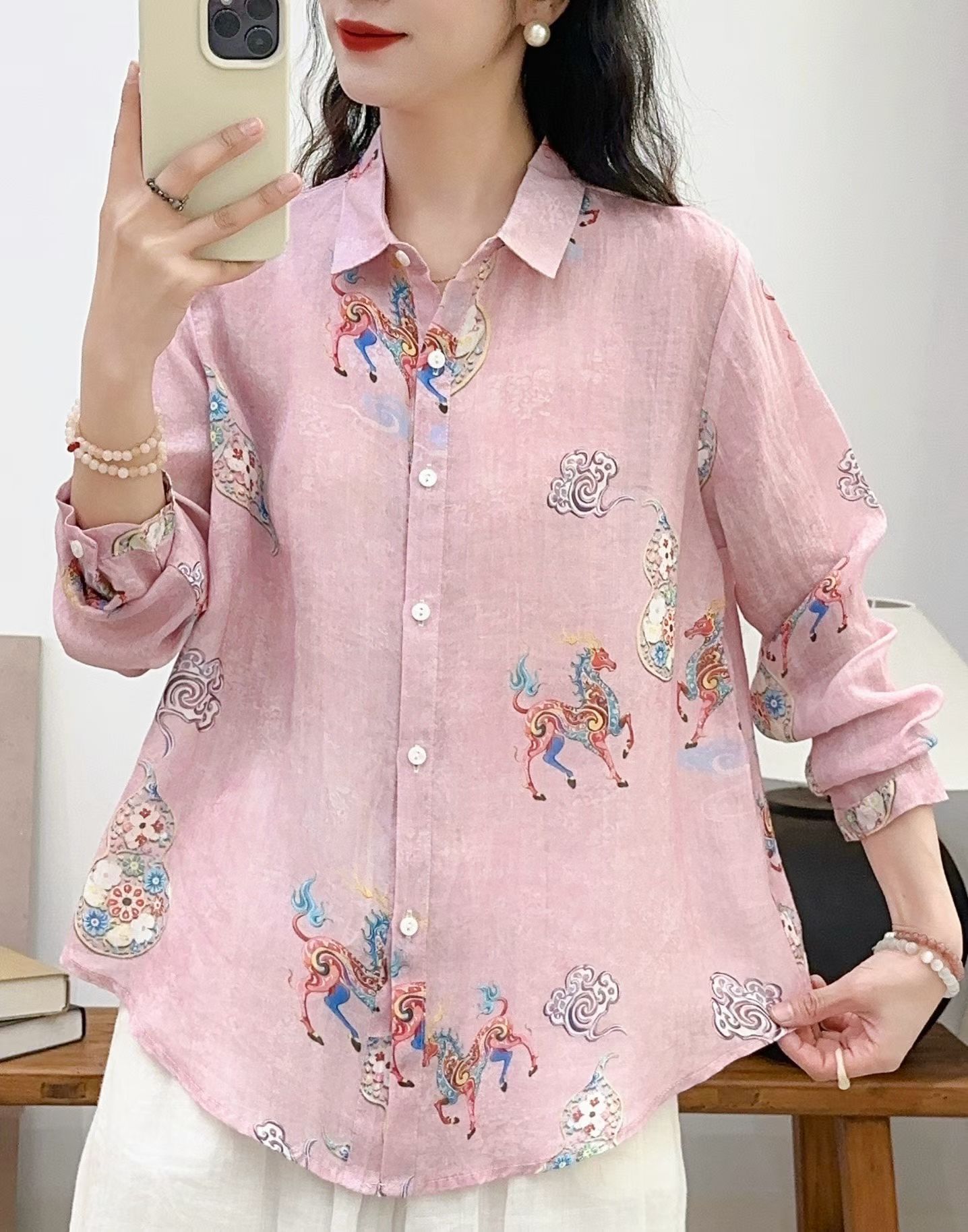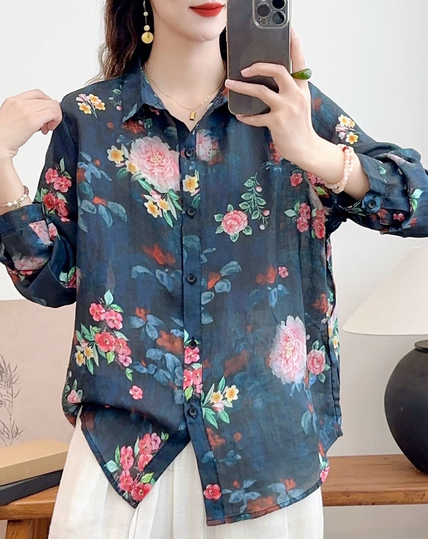 모리 소녀 예술적 라미 인쇄 셔츠 긴팔 여성용 옷깃 꽃 탑베이스 셔츠 라미 셔츠 탑 여성 의류스토어 가기