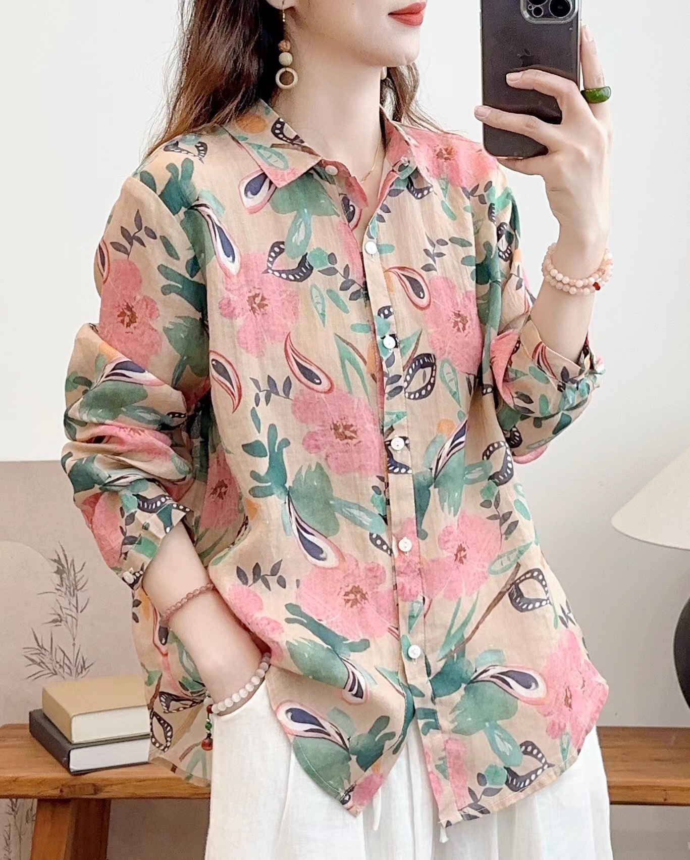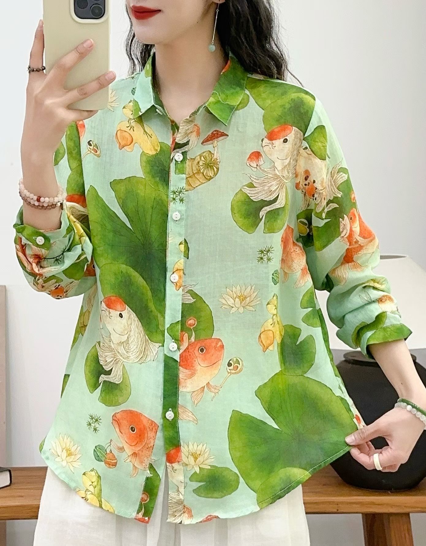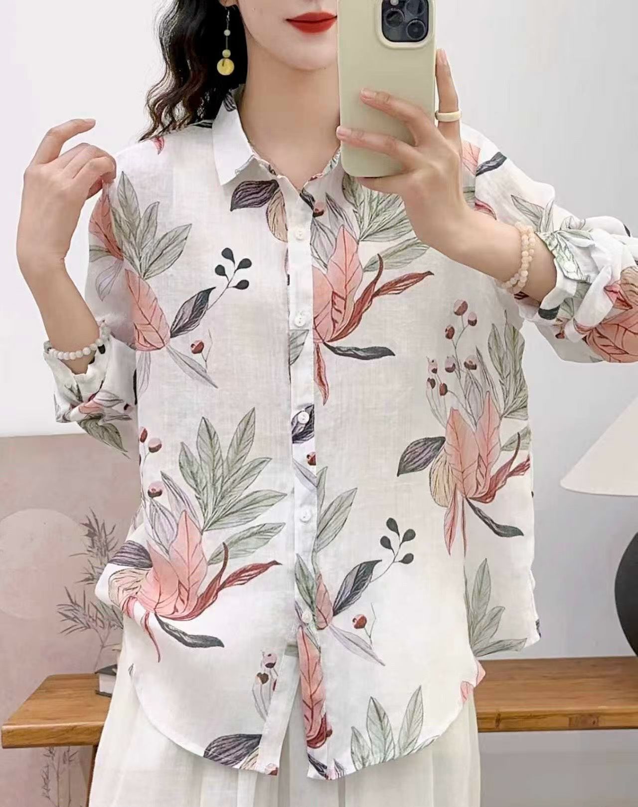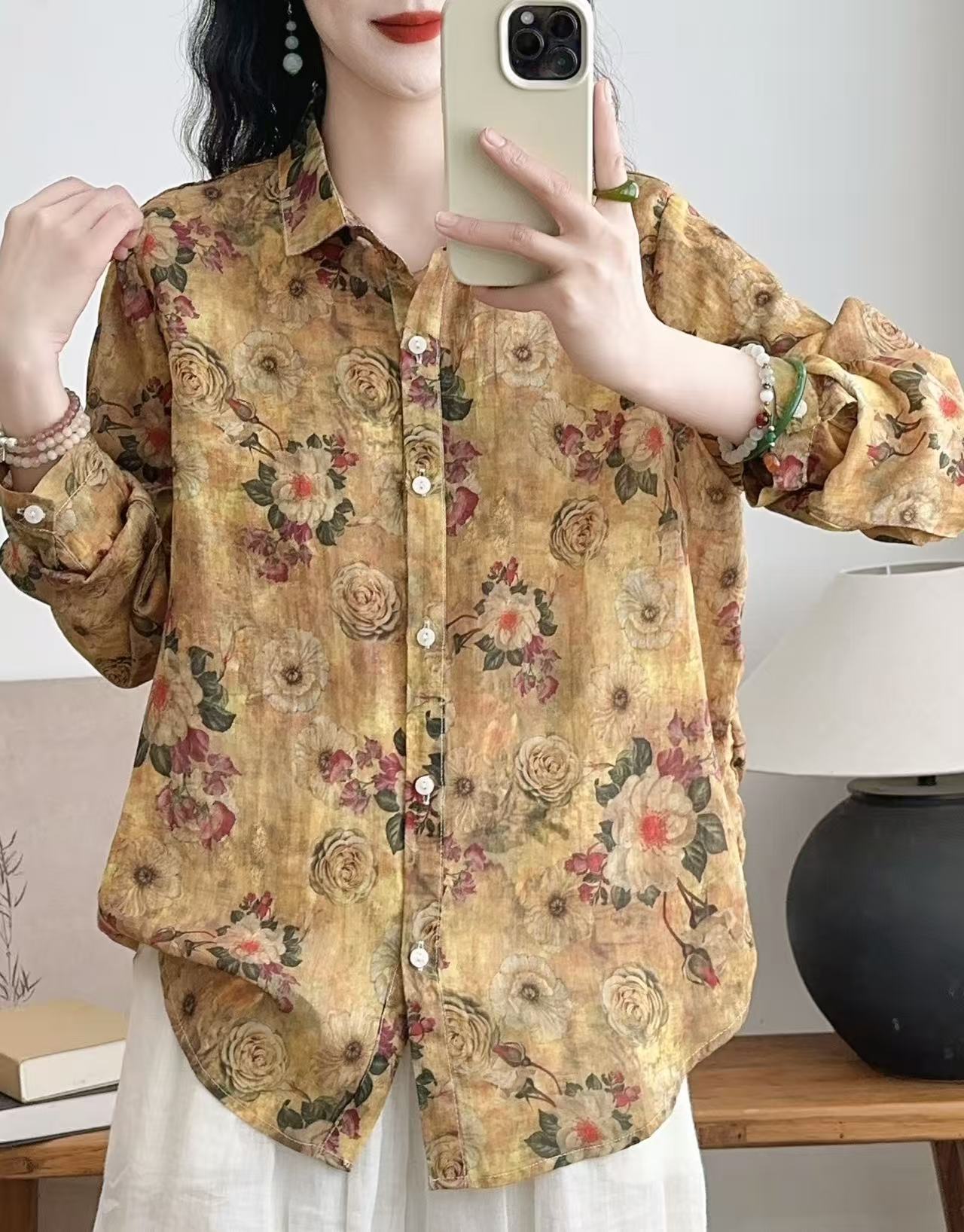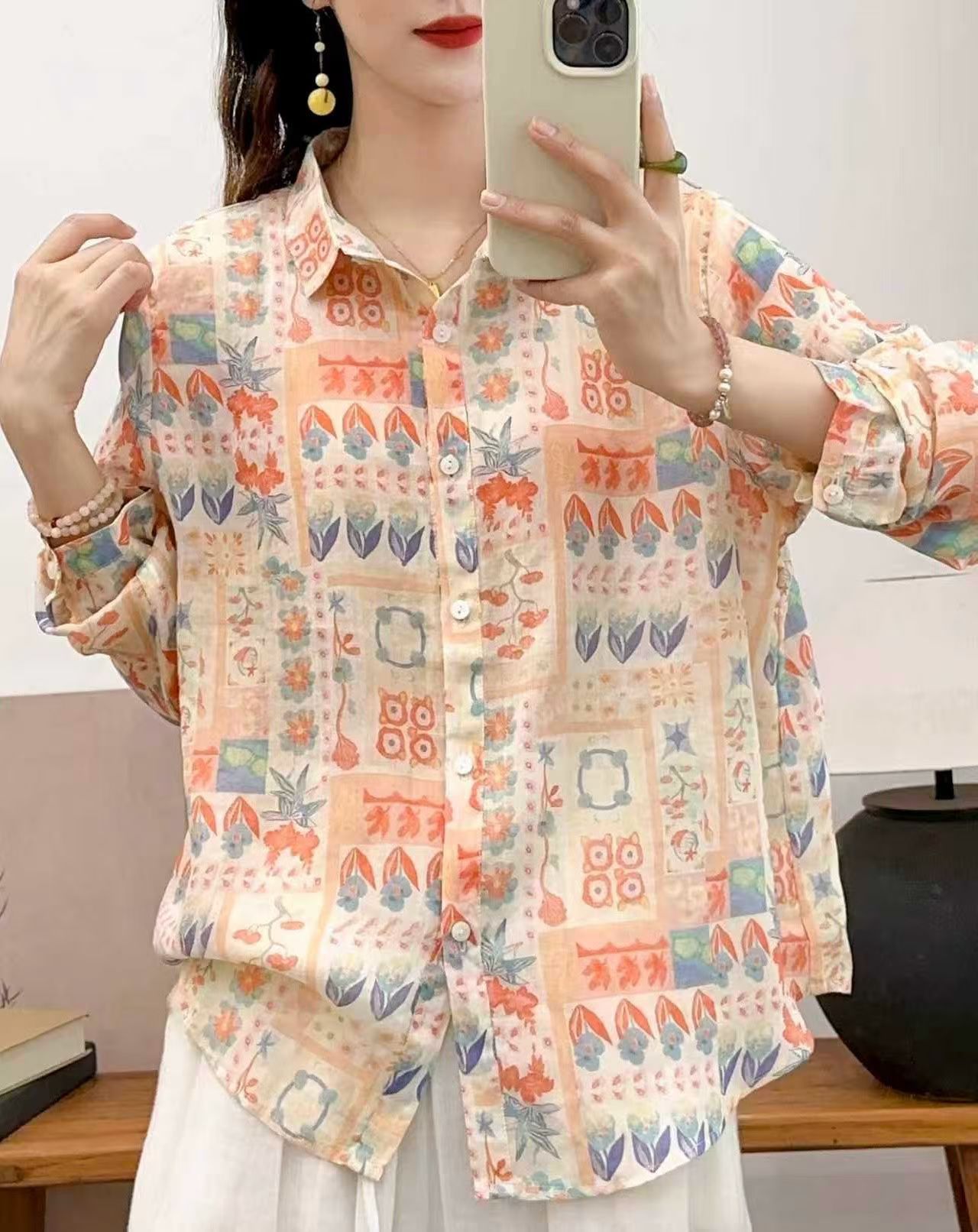 모리 소녀 예술적 라미 인쇄 셔츠 긴팔 여성용 옷깃 꽃 탑베이스 셔츠 라미 셔츠 탑 여성 의류스토어 가기