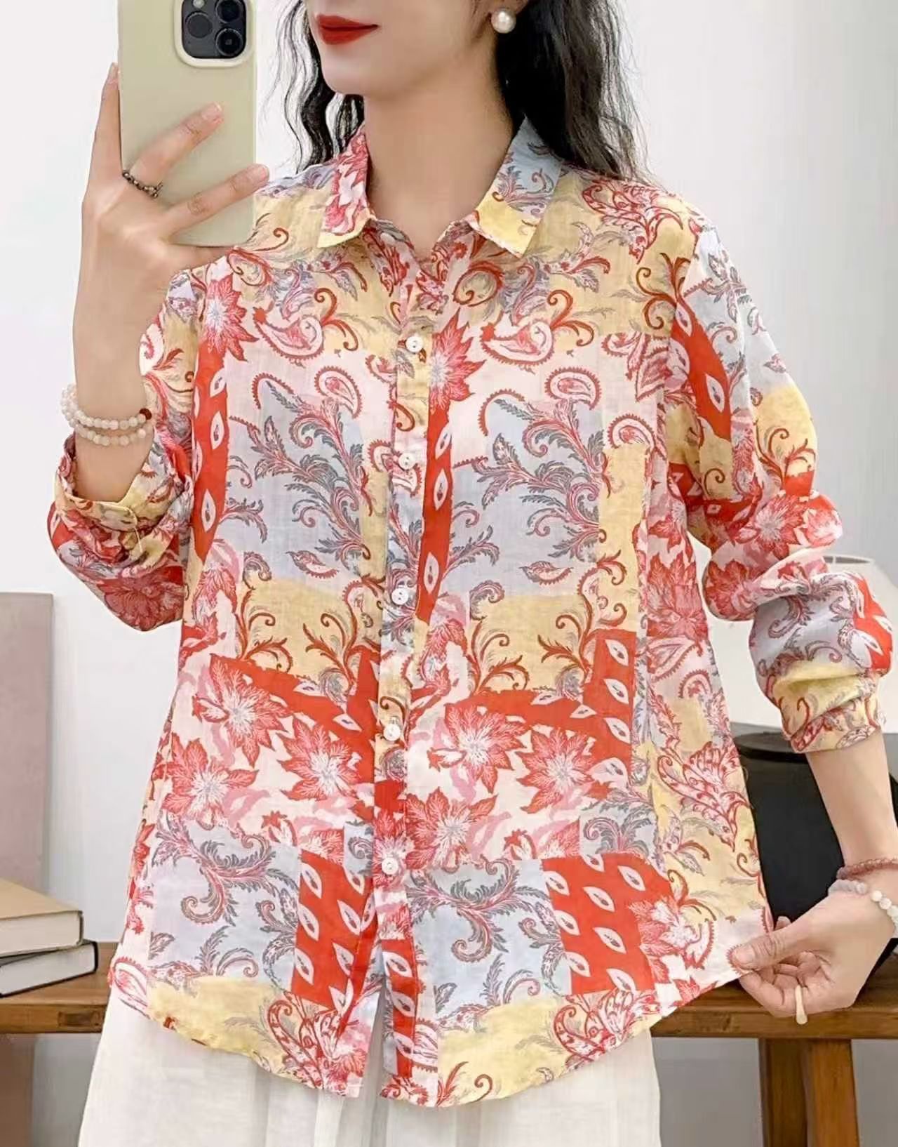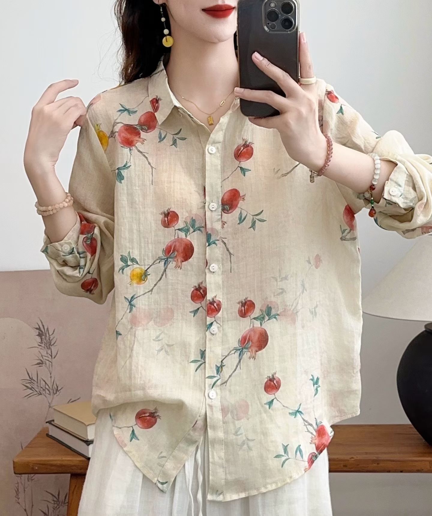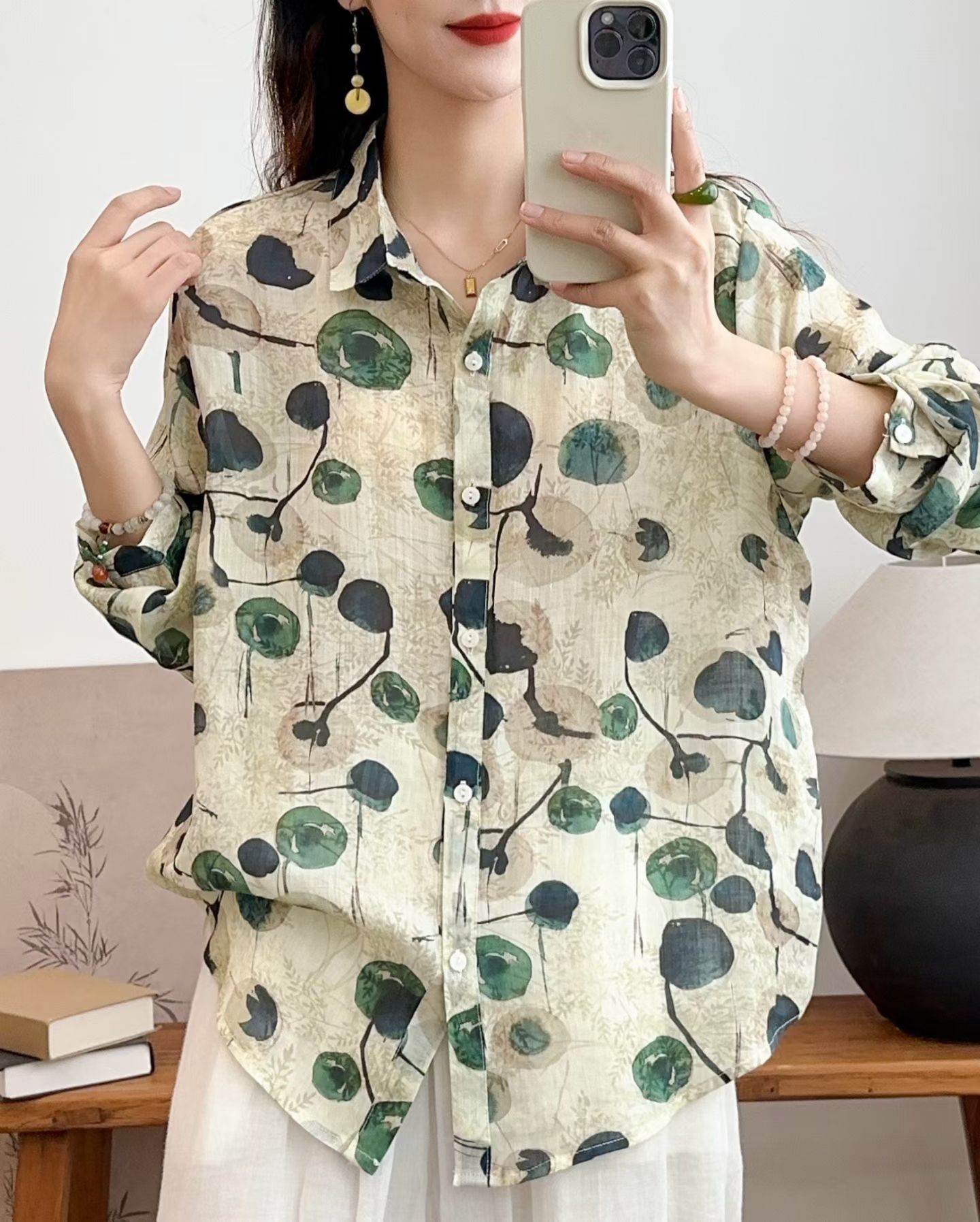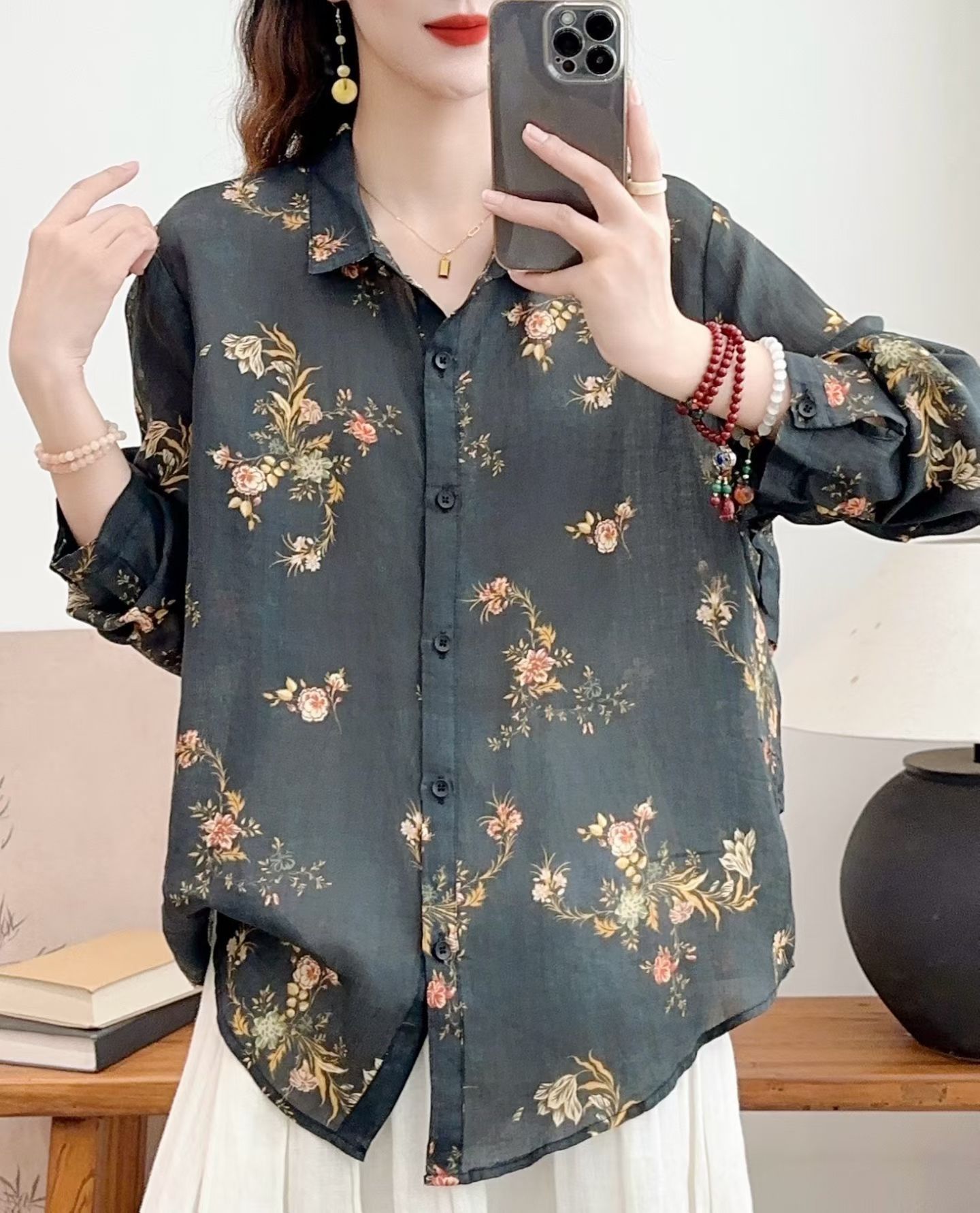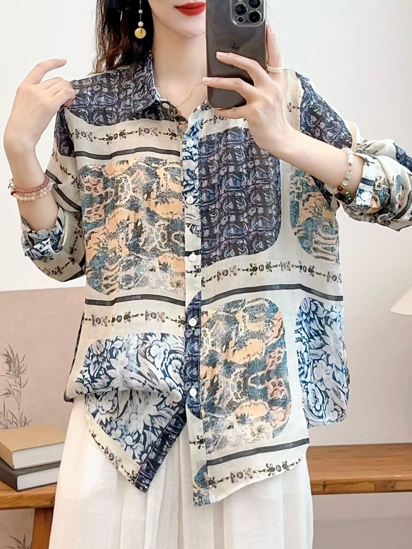 모리 소녀 예술적 라미 인쇄 셔츠 긴팔 여성용 옷깃 꽃 탑베이스 셔츠 라미 셔츠 탑 여성 의류스토어 가기