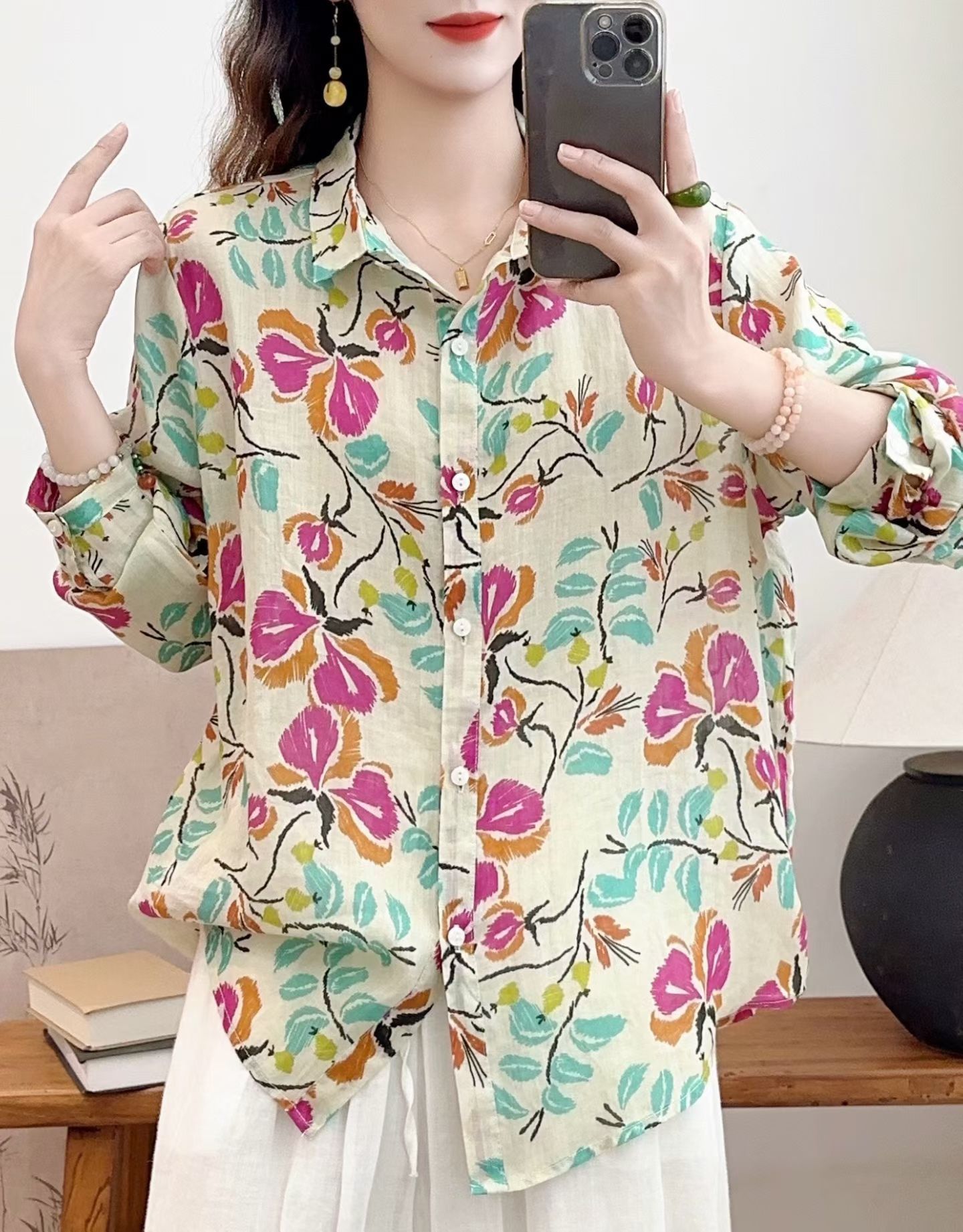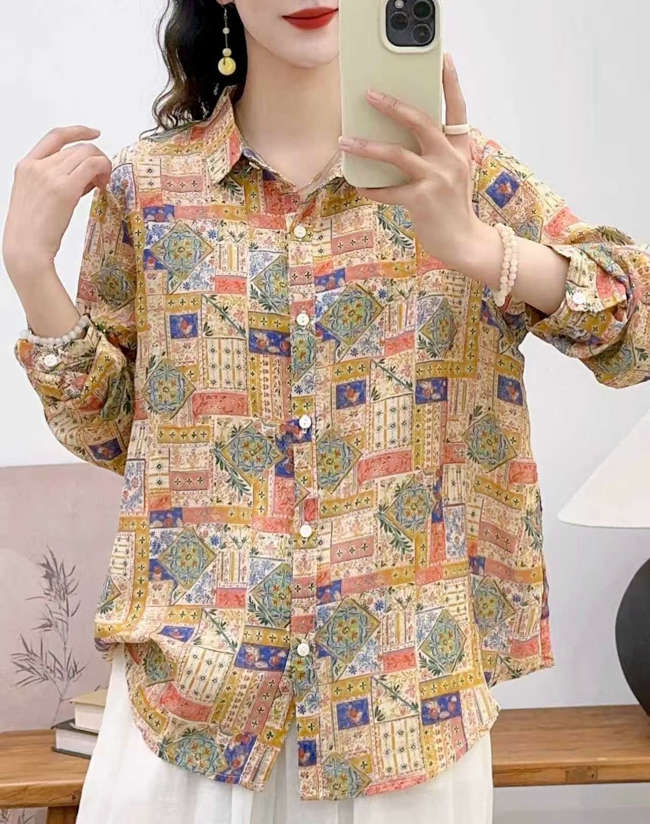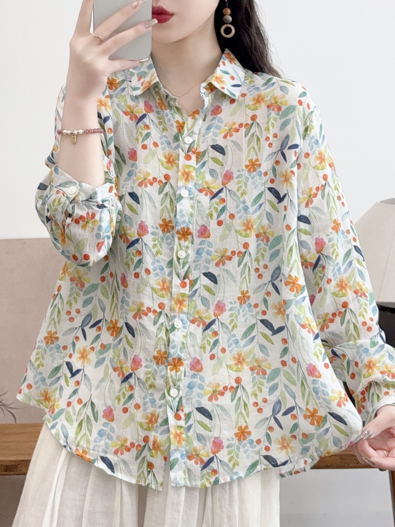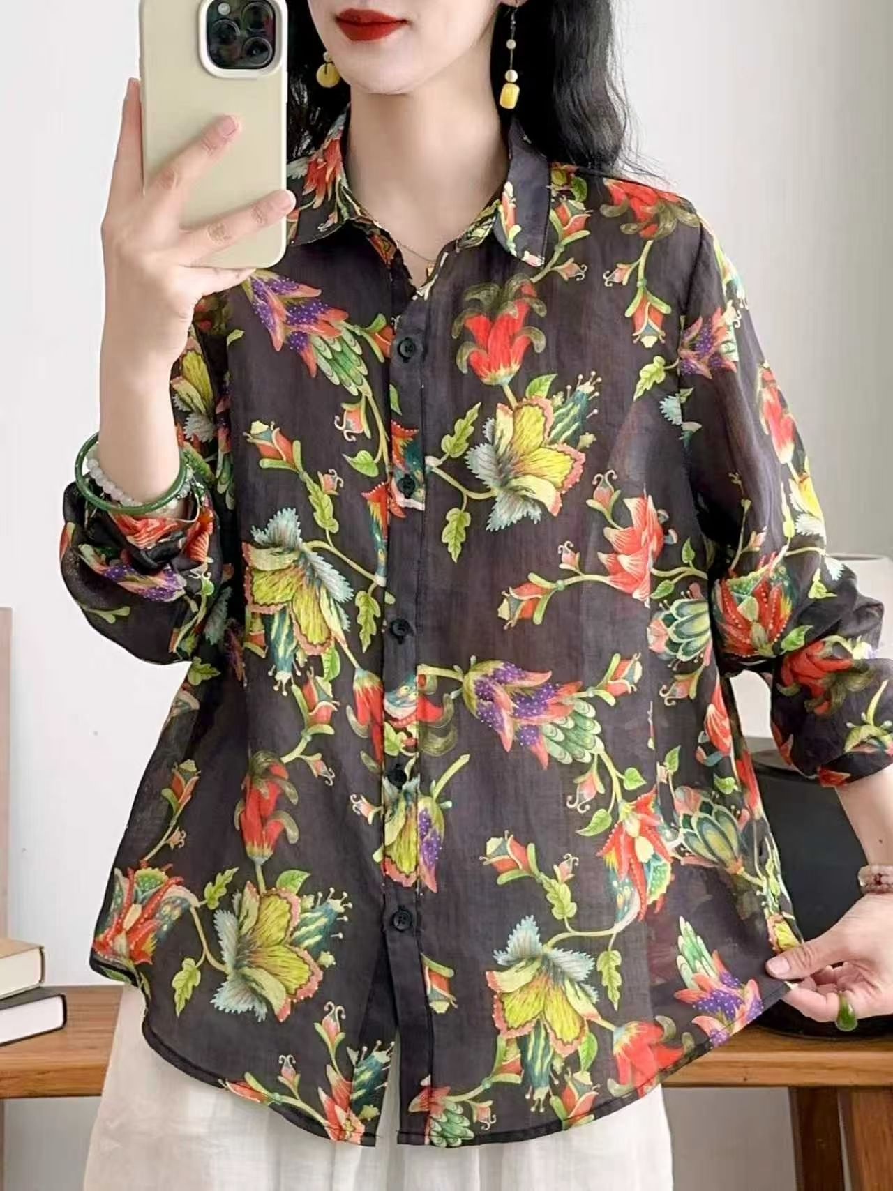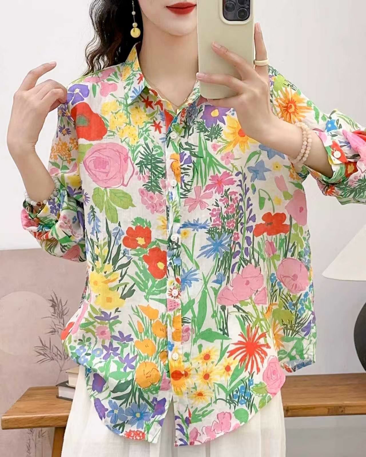 모리 소녀 예술적 라미 인쇄 셔츠 긴팔 여성용 옷깃 꽃 탑베이스 셔츠 라미 셔츠 탑 여성 의류스토어 가기