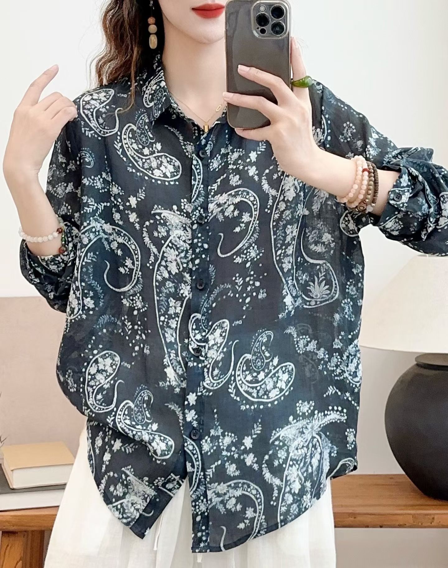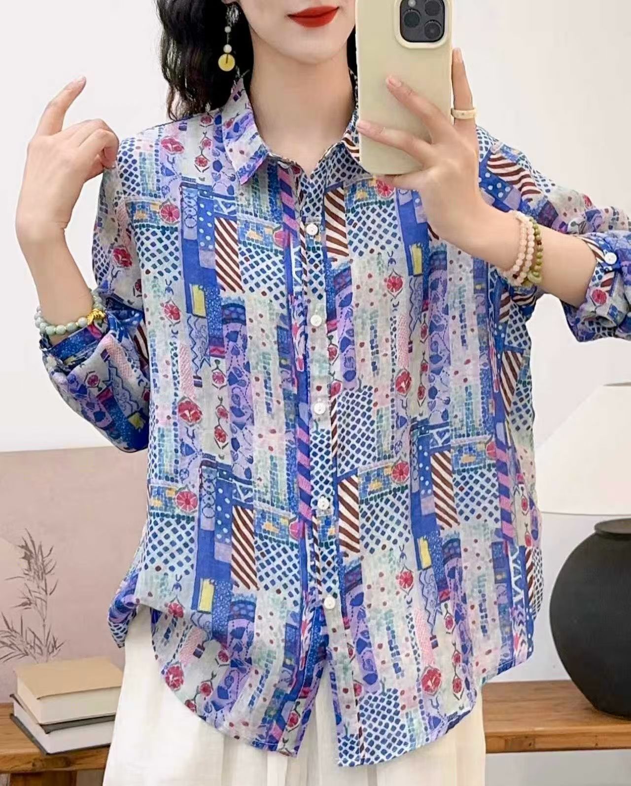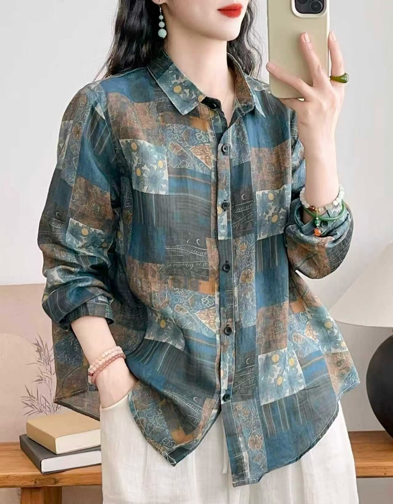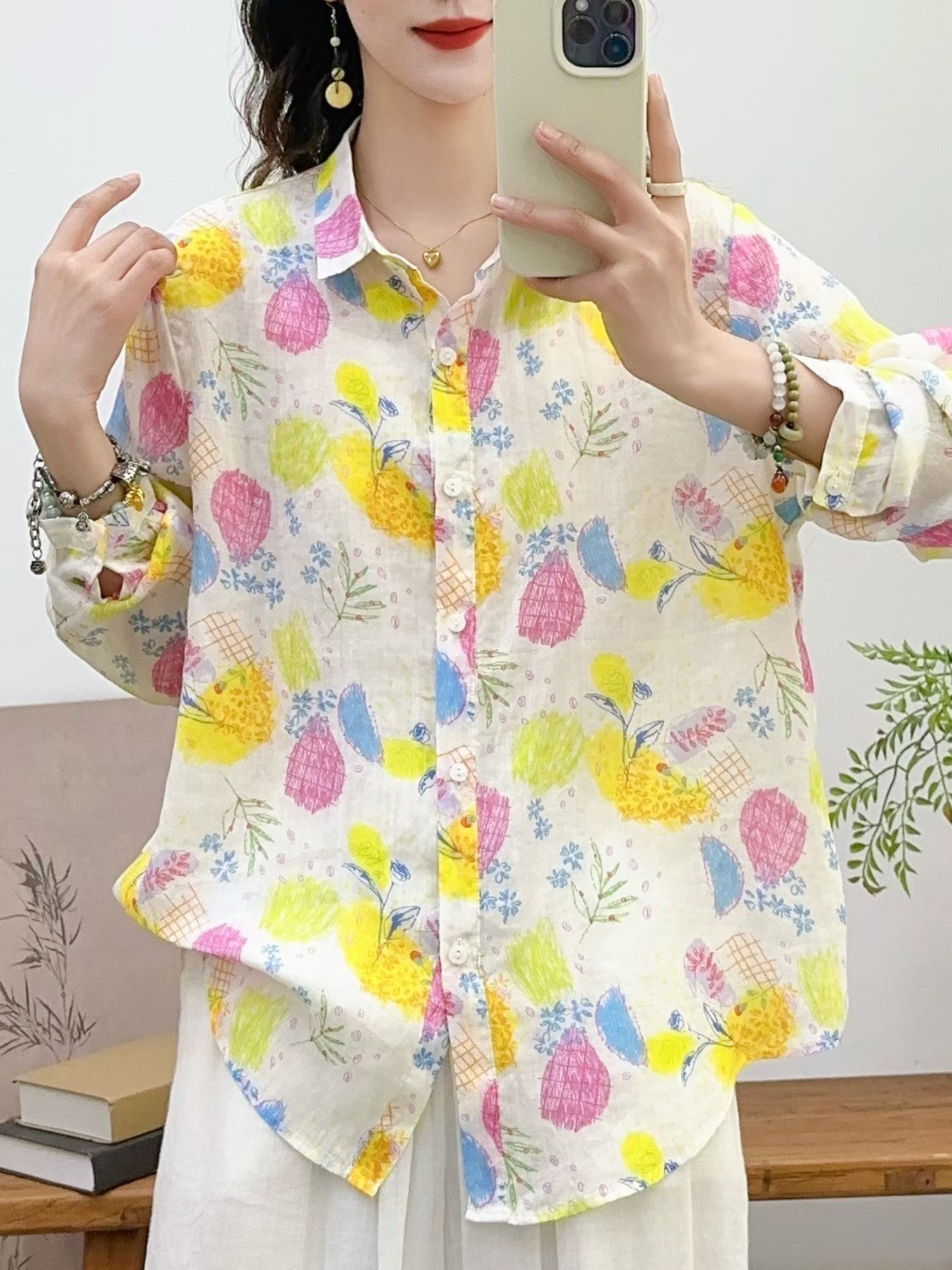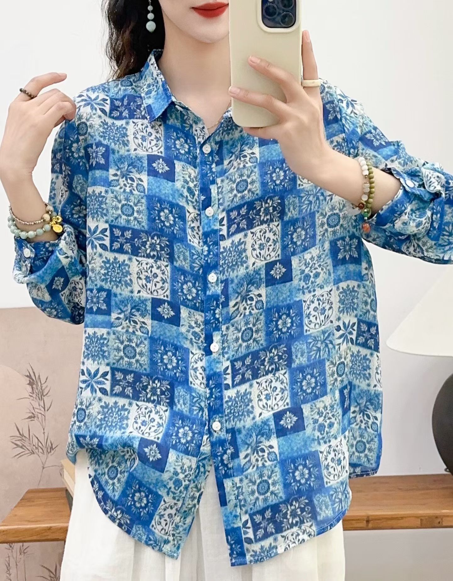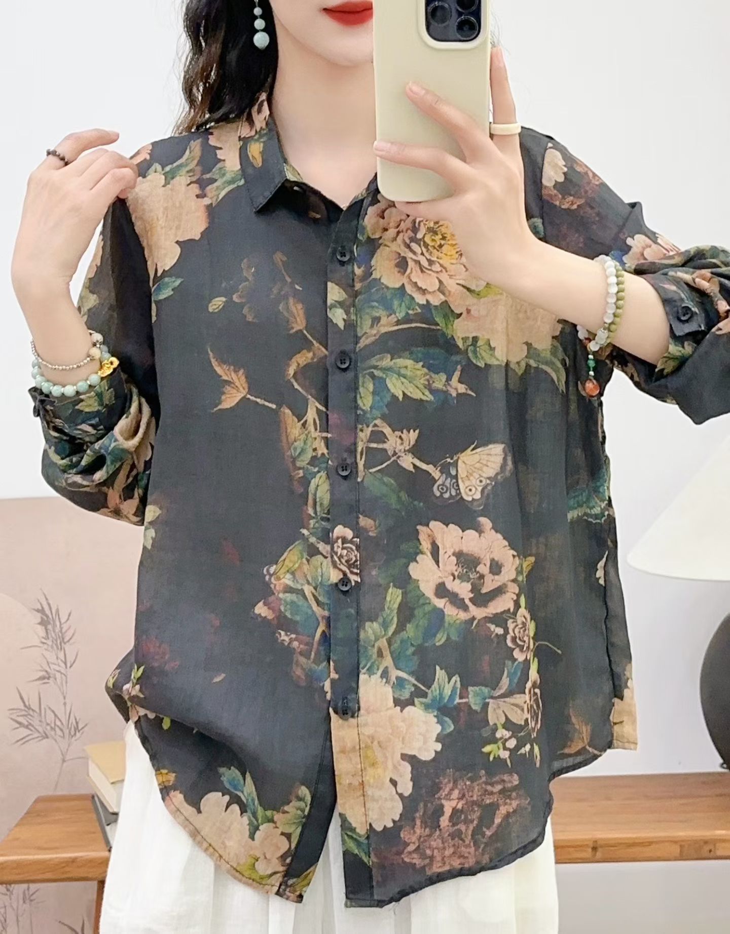 모리 소녀 예술적 라미 인쇄 셔츠 긴팔 여성용 옷깃 꽃 탑베이스 셔츠 라미 셔츠 탑 여성 의류스토어 가기