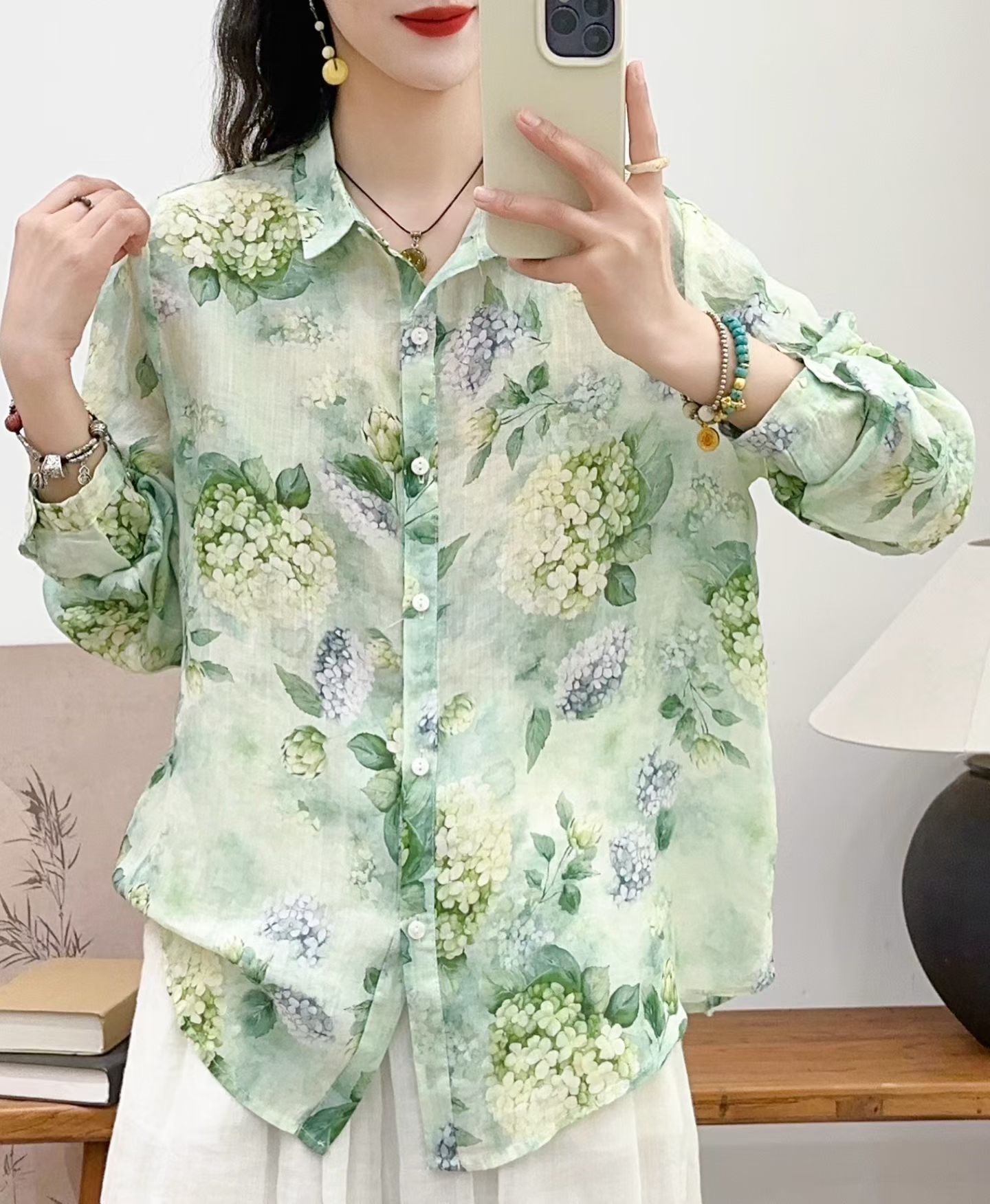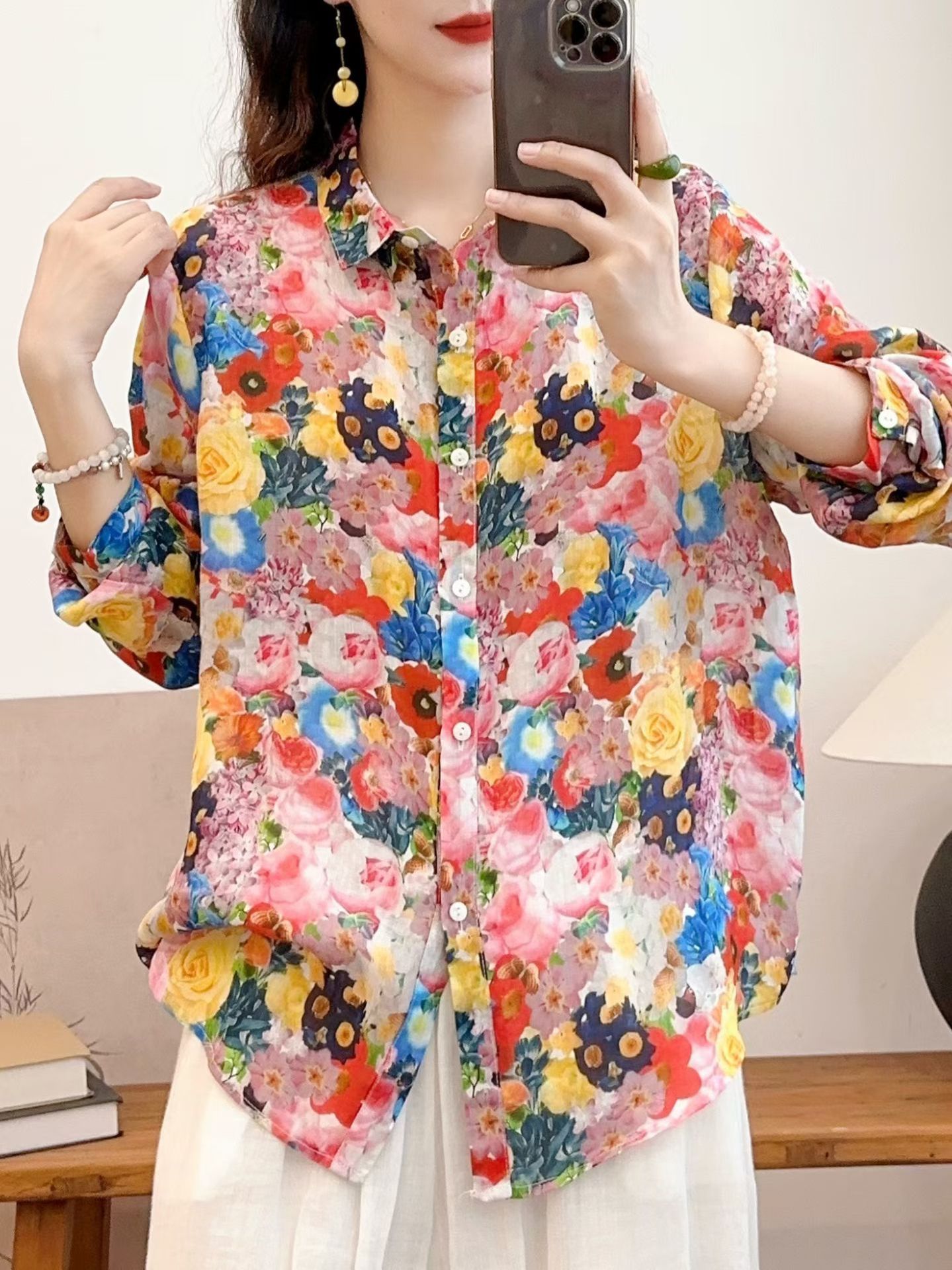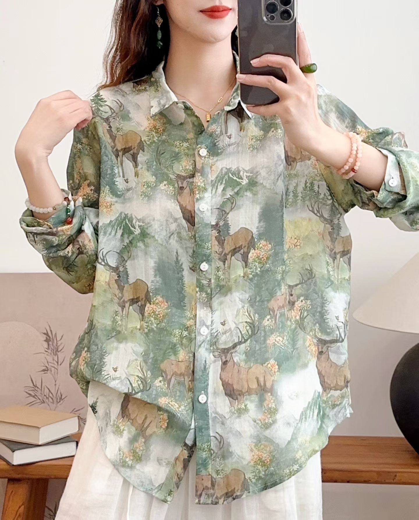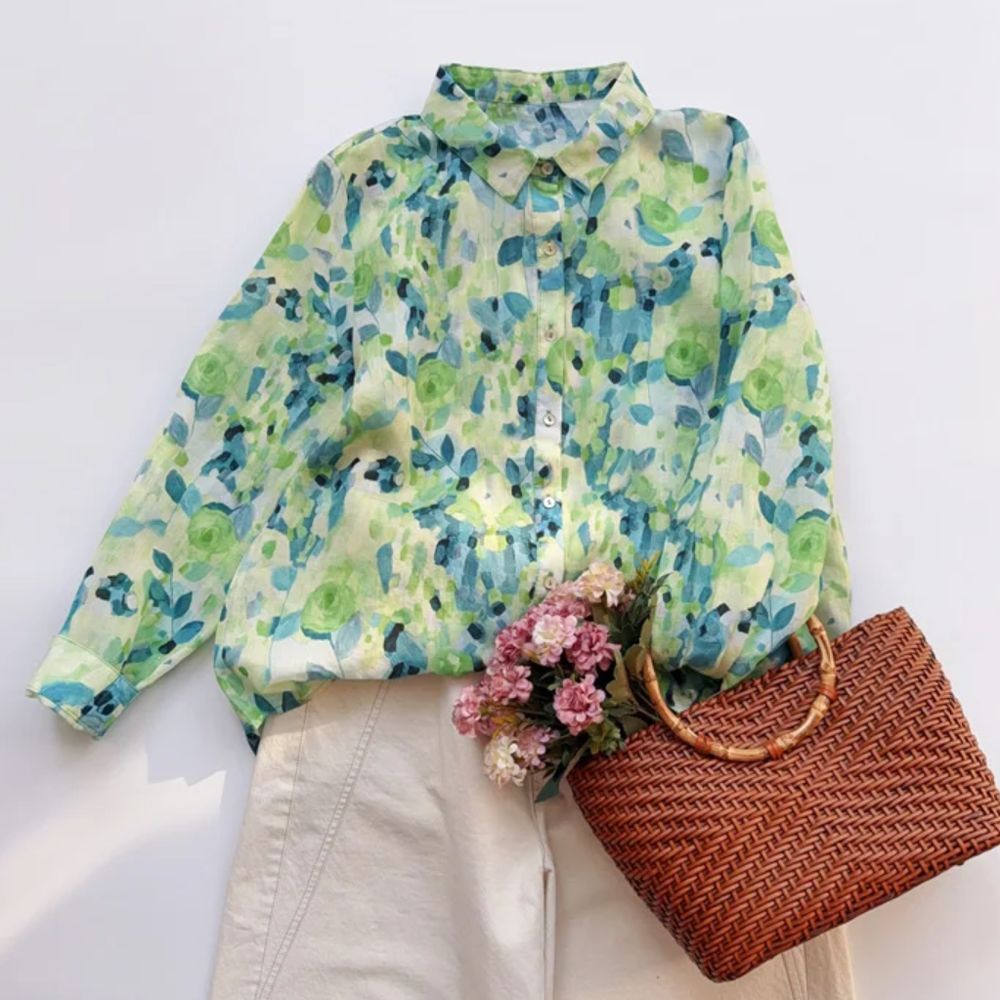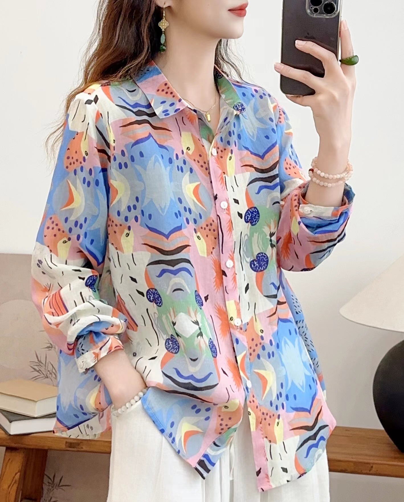 모리 소녀 예술적 라미 인쇄 셔츠 긴팔 여성용 옷깃 꽃 탑베이스 셔츠 라미 셔츠 탑 여성 의류스토어 가기