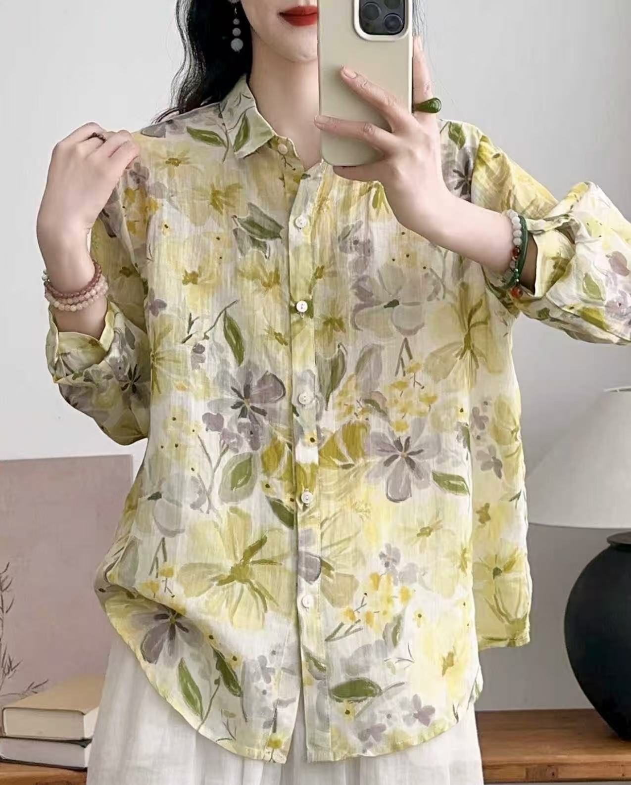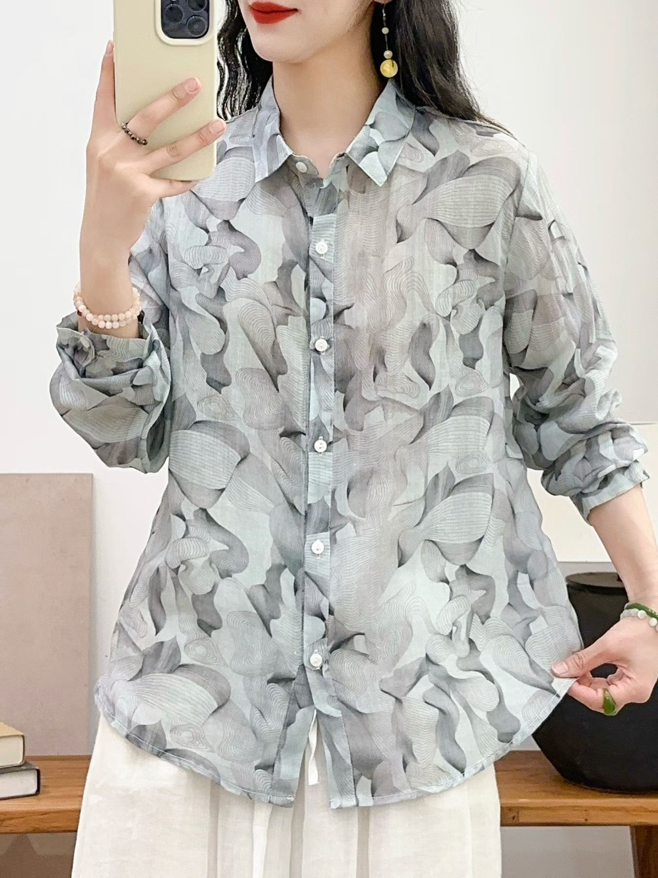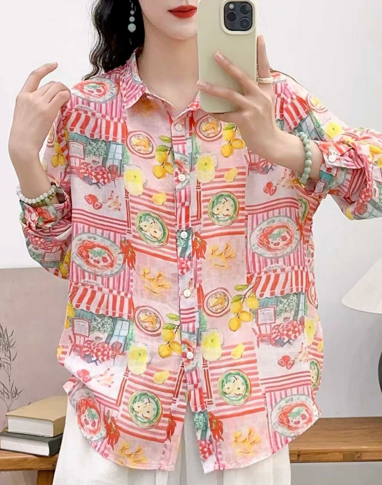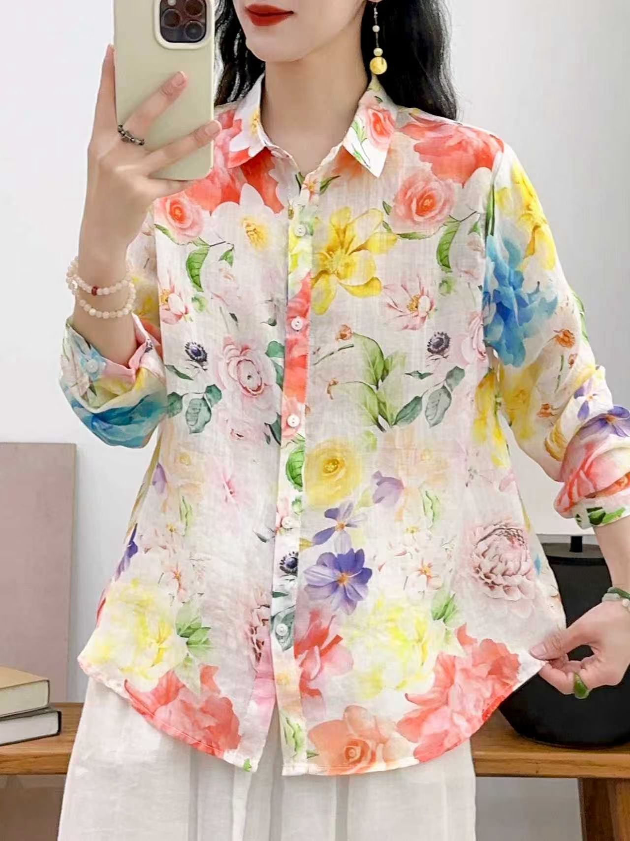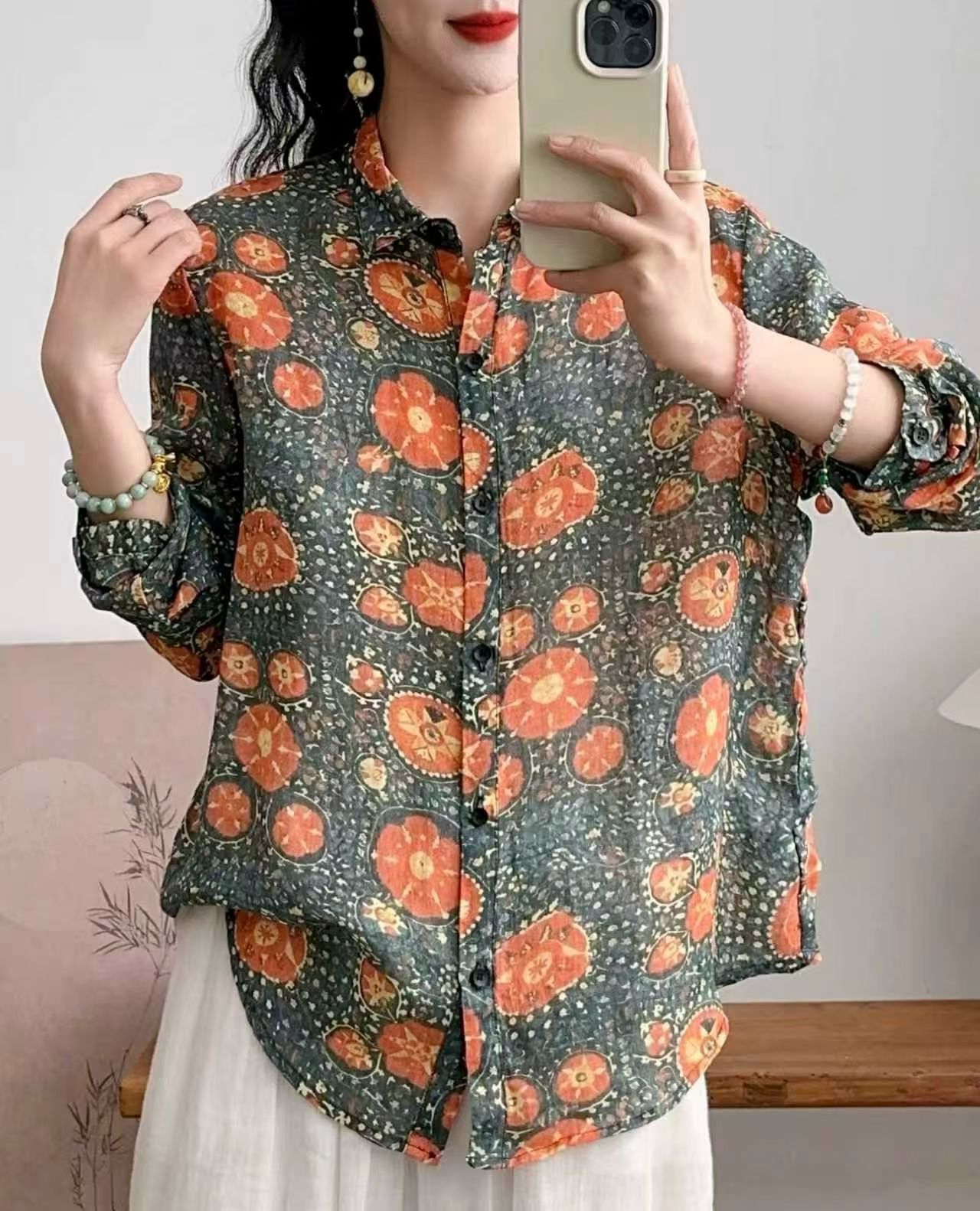 모리 소녀 예술적 라미 인쇄 셔츠 긴팔 여성용 옷깃 꽃 탑베이스 셔츠 라미 셔츠 탑 여성 의류스토어 가기