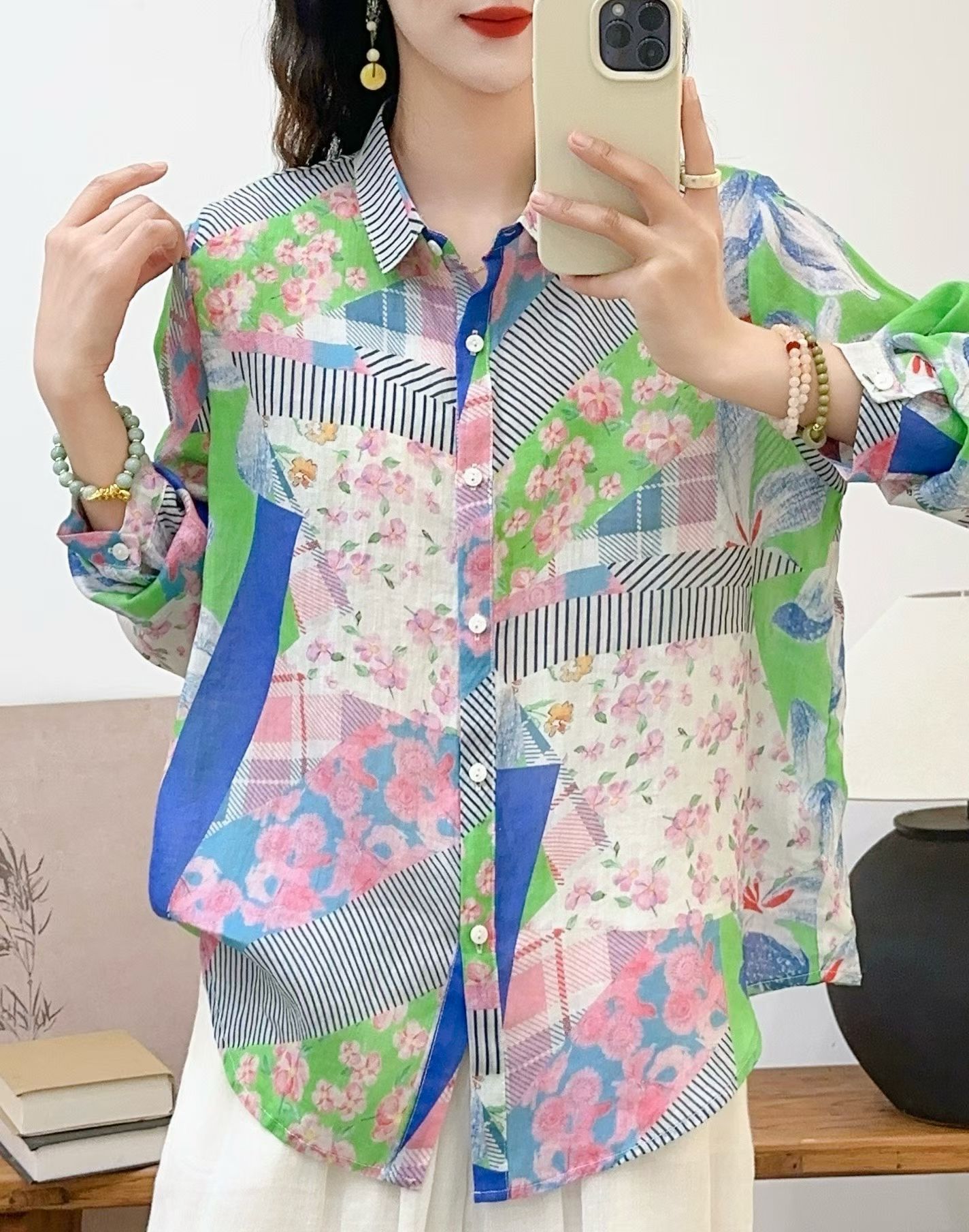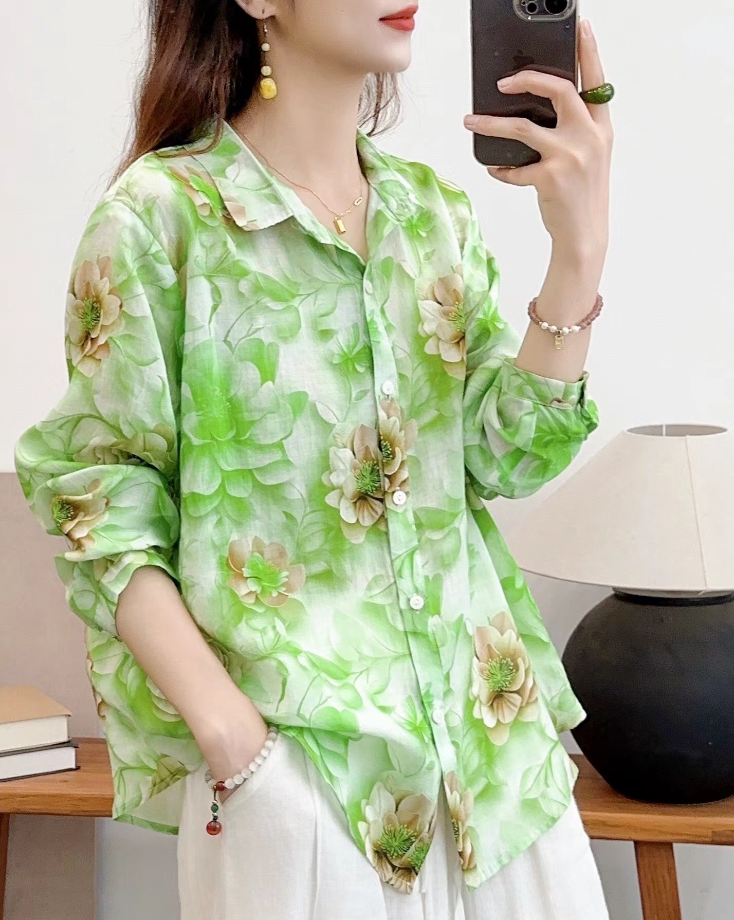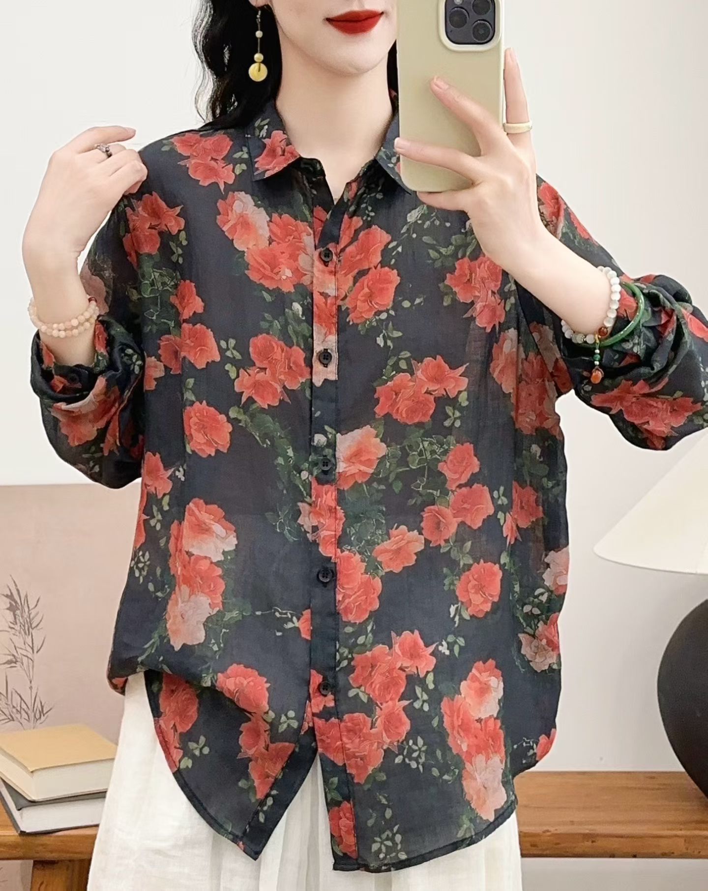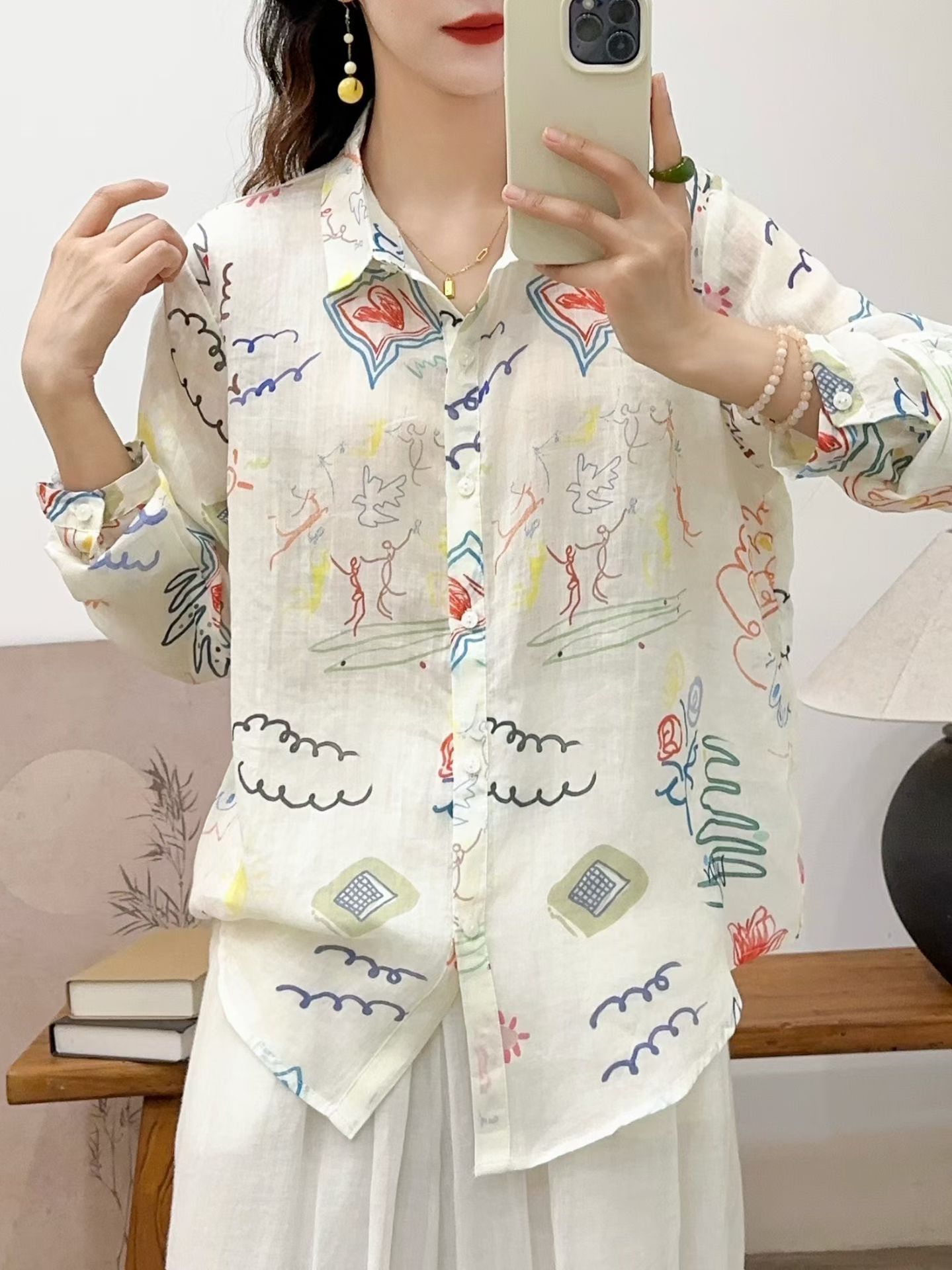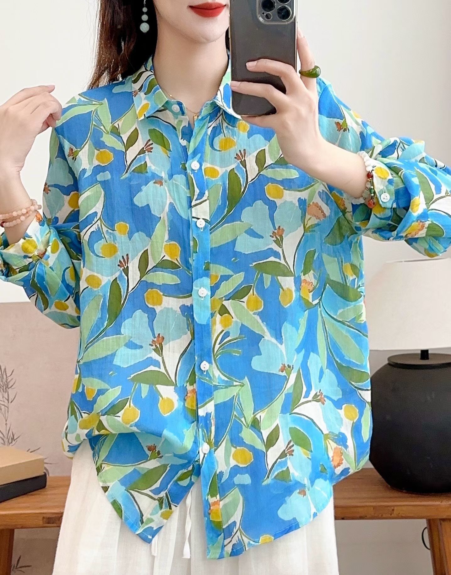 모리 소녀 예술적 라미 인쇄 셔츠 긴팔 여성용 옷깃 꽃 탑베이스 셔츠 라미 셔츠 탑 여성 의류스토어 가기